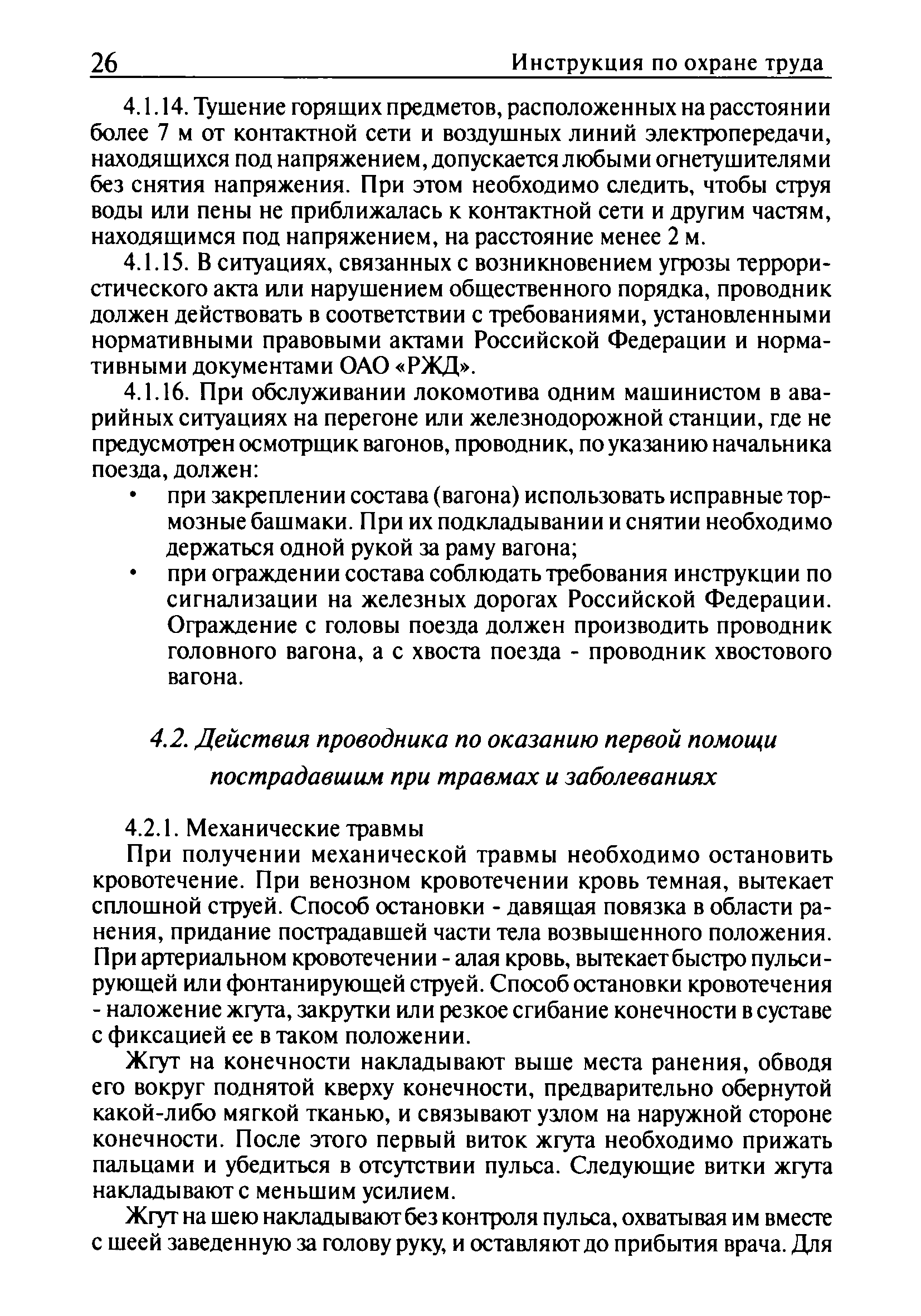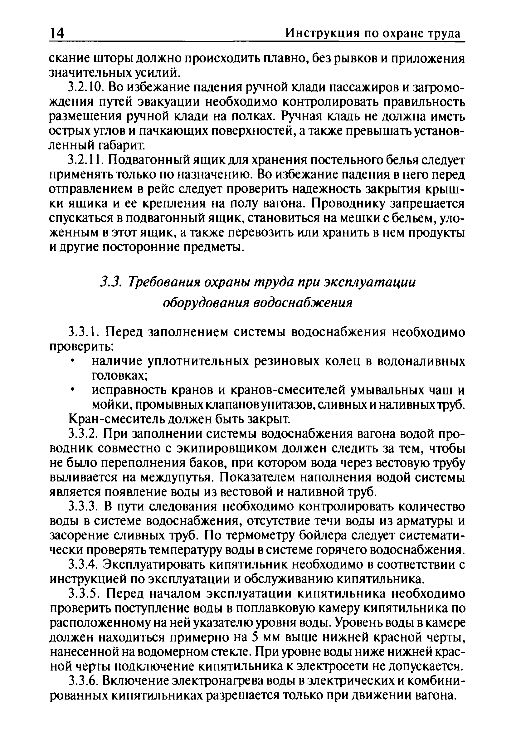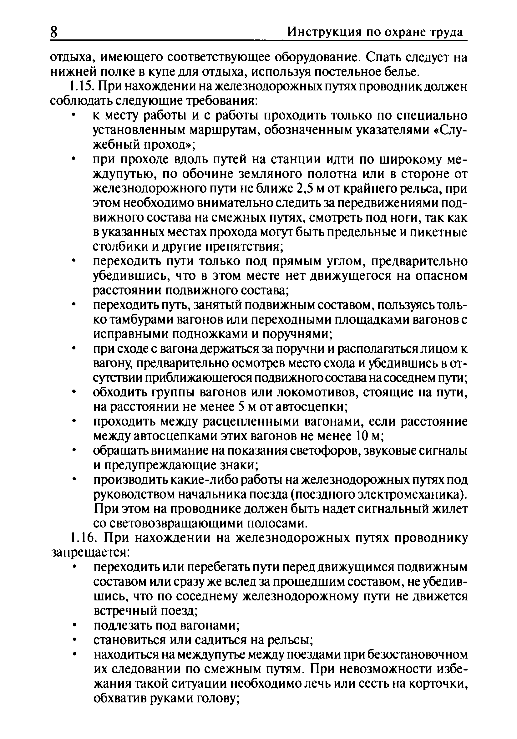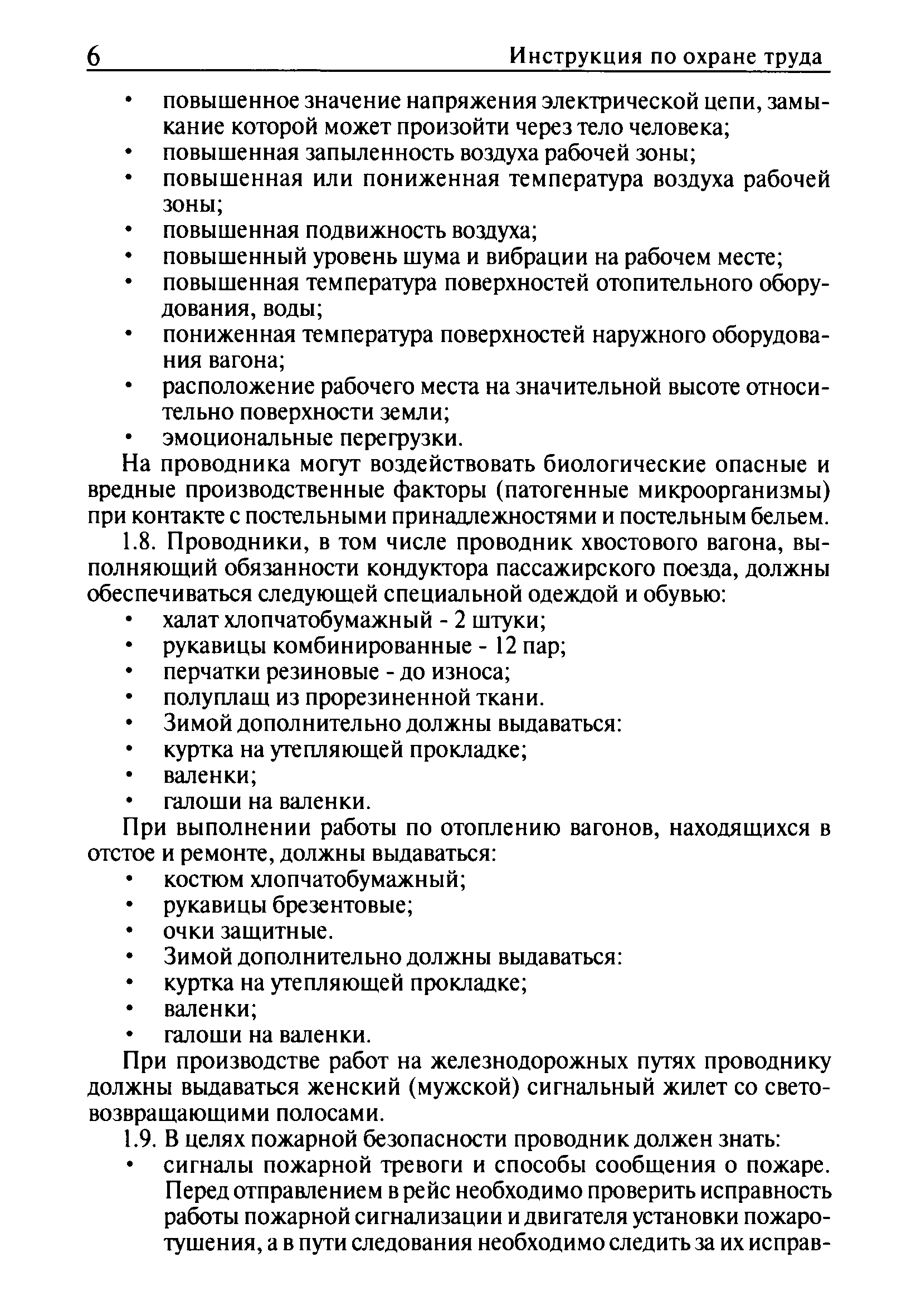 | Оглавление: | 1. Общие требования охраны труда 2. Требования охраны труда перед началом работы 3. Требования охраны труда во время работы 3.1. Требования охраны труда при стоянке поезда на станциях 3.2. Требования охраны труда при эксплуатации внутреннего оборудования, окон и дверей вагона 3.3. Требования охраны труда при эксплуатации оборудования водоснабжения 3.4. Требования охраны труда при эксплуатации системы отопления 3.5. Требования охраны труда при эксплуатации электрооборудования вагона 3.6. Требования охраны труда при эксплуатации подъемника 3.7. Требования охраны труда при эксплуатации бытового оборудования 3.8. Требования охраны труда при эксплуатации санитарно-технического оборудования 3.9. Требования охраны труда при приготовлении и раздаче чайной продукции 3.10. Требования охраны труда при производстве внутренней уборки вагона 4. Требования охраны труда в аварийных ситуациях 4.1. Действия проводника при возникновении аварий и аварийных ситуаций 4.2. Действия проводника по оказанию первой помощи пострадавшим при травмах и заболеваниях 5. Требования охраны труда по окончании работы |