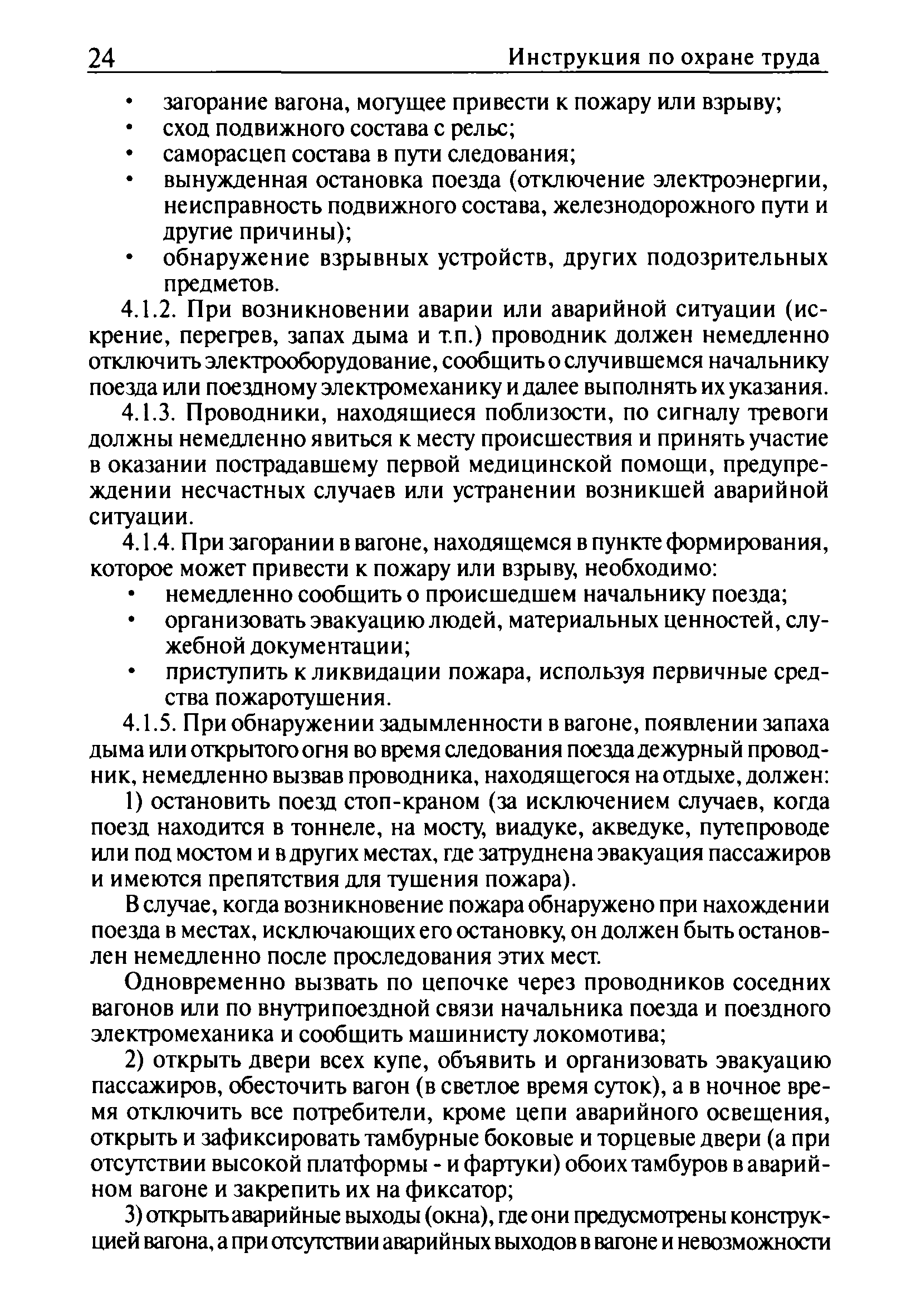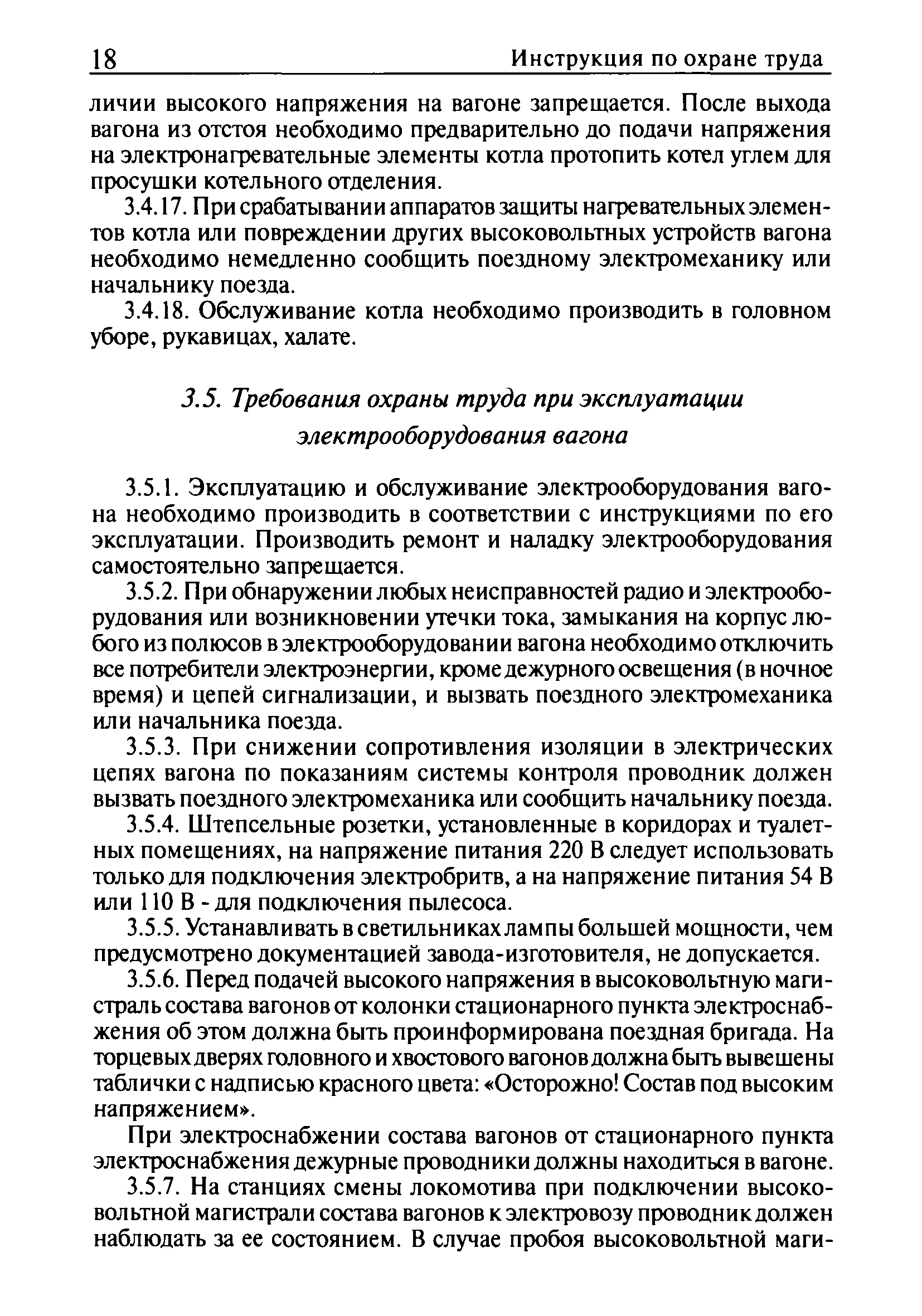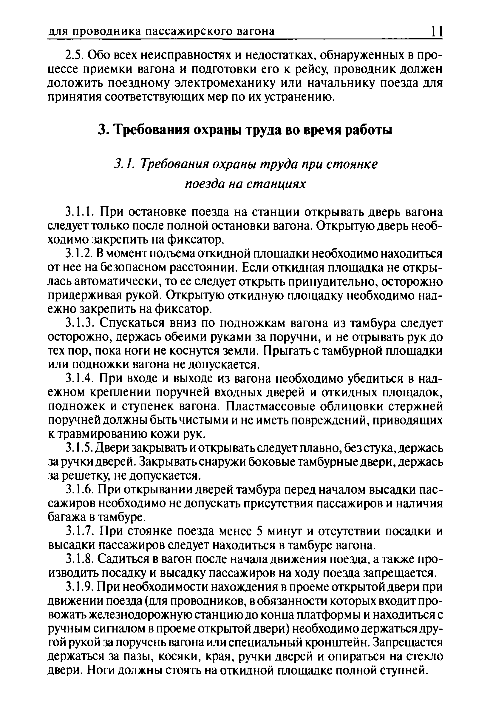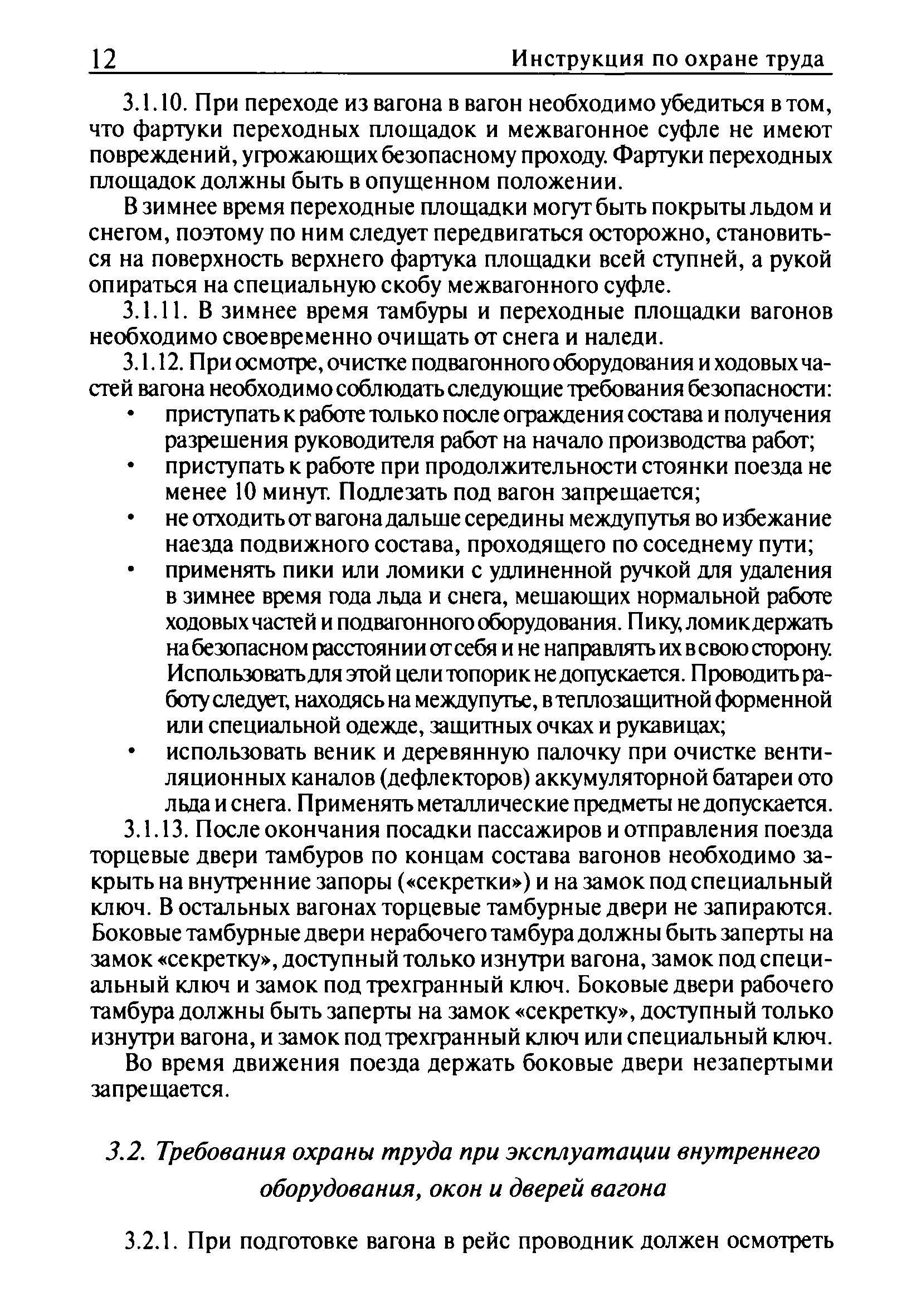 | Оглавление: | 1. Общие требования охраны труда 2. Требования охраны труда перед началом работы 3. Требования охраны труда во время работы 3.1. Требования охраны труда при стоянке поезда на станциях 3.2. Требования охраны труда при эксплуатации внутреннего оборудования, окон и дверей вагона 3.3. Требования охраны труда при эксплуатации оборудования водоснабжения 3.4. Требования охраны труда при эксплуатации системы отопления 3.5. Требования охраны труда при эксплуатации электрооборудования вагона 3.6. Требования охраны труда при эксплуатации подъемника 3.7. Требования охраны труда при эксплуатации бытового оборудования 3.8. Требования охраны труда при эксплуатации санитарно-технического оборудования 3.9. Требования охраны труда при приготовлении и раздаче чайной продукции 3.10. Требования охраны труда при производстве внутренней уборки вагона 4. Требования охраны труда в аварийных ситуациях 4.1. Действия проводника при возникновении аварий и аварийных ситуаций 4.2. Действия проводника по оказанию первой помощи пострадавшим при травмах и заболеваниях 5. Требования охраны труда по окончании работы |