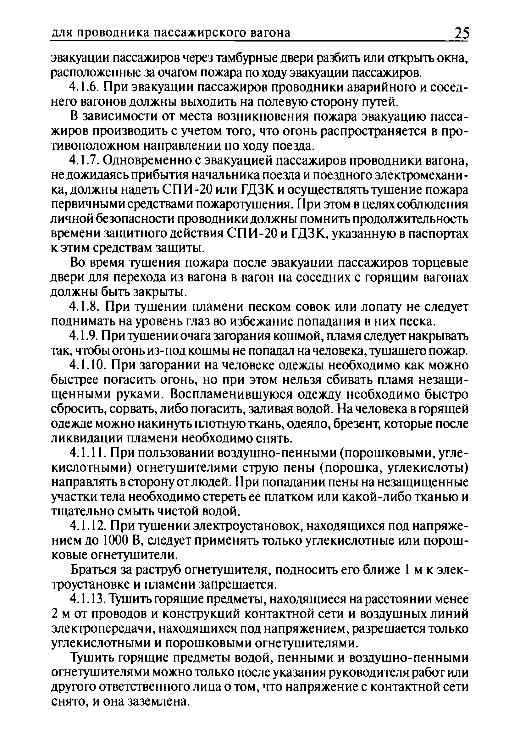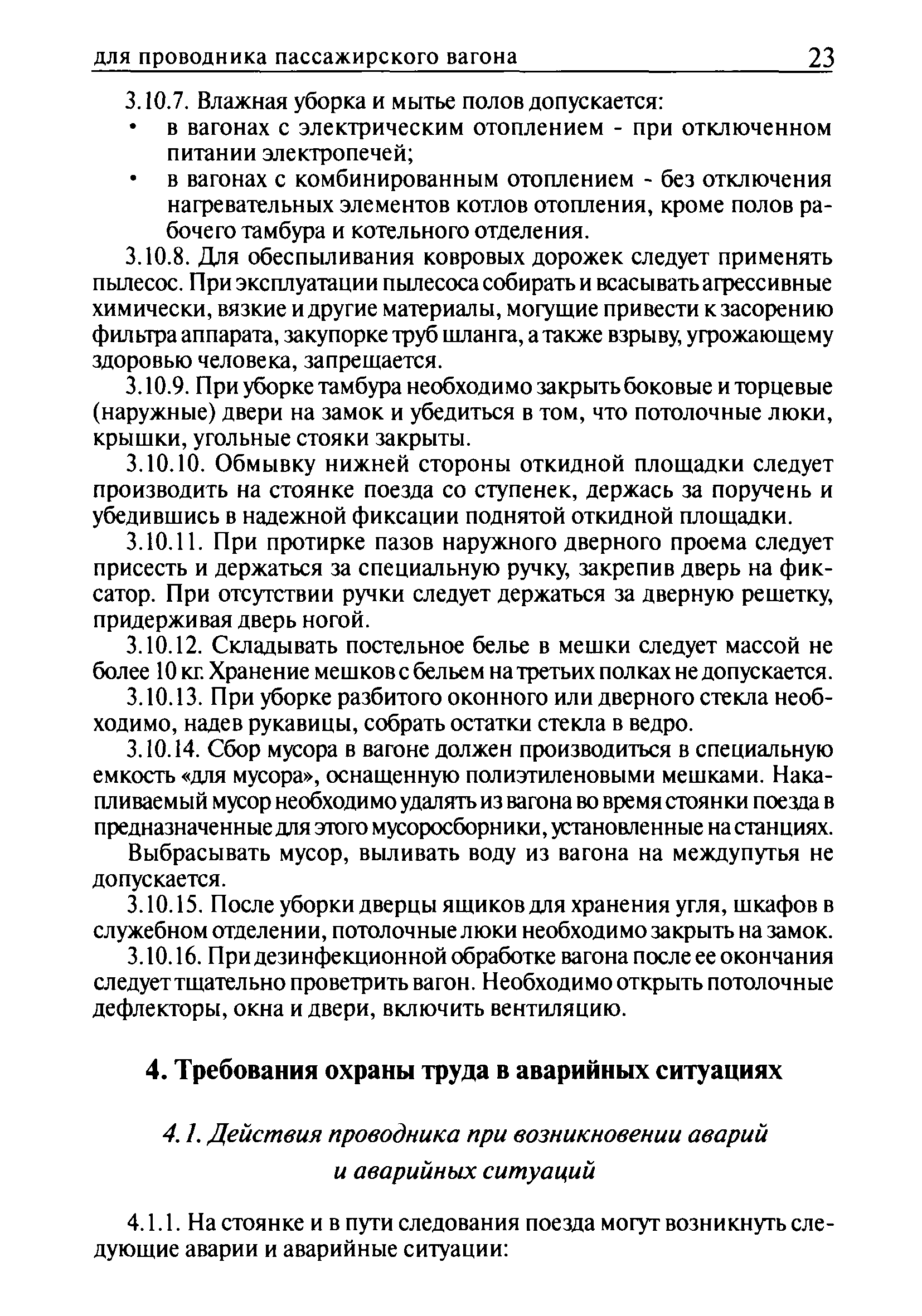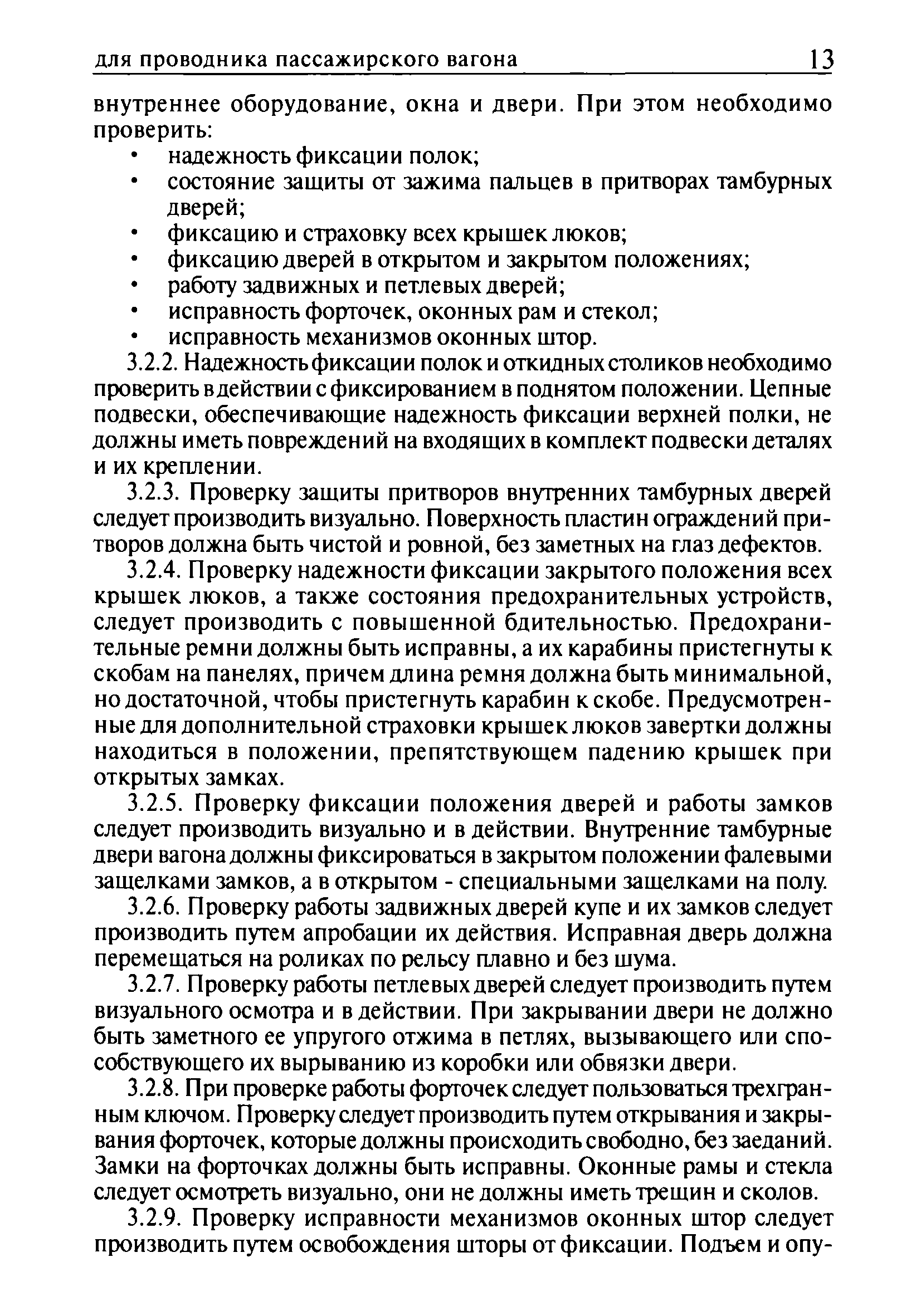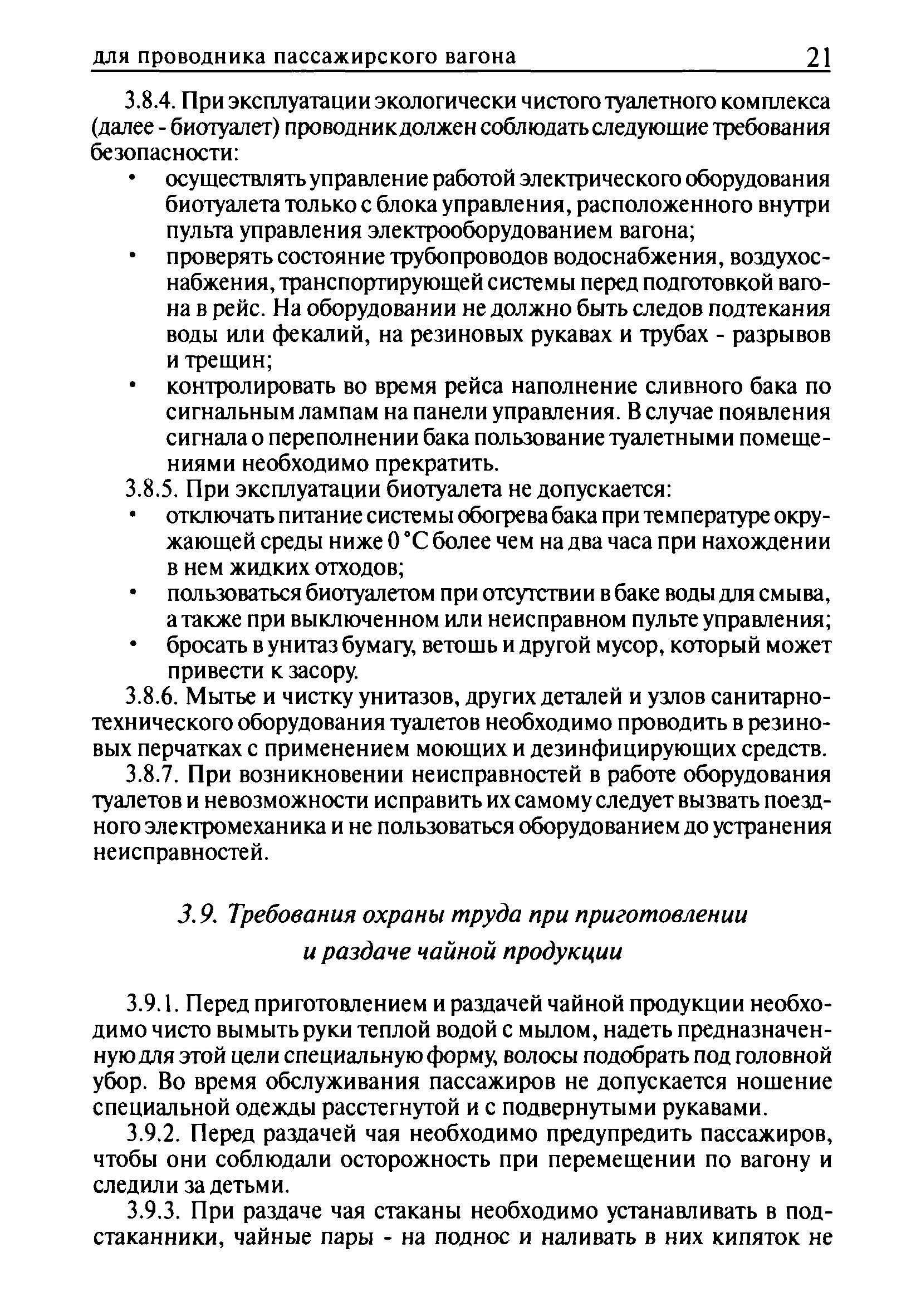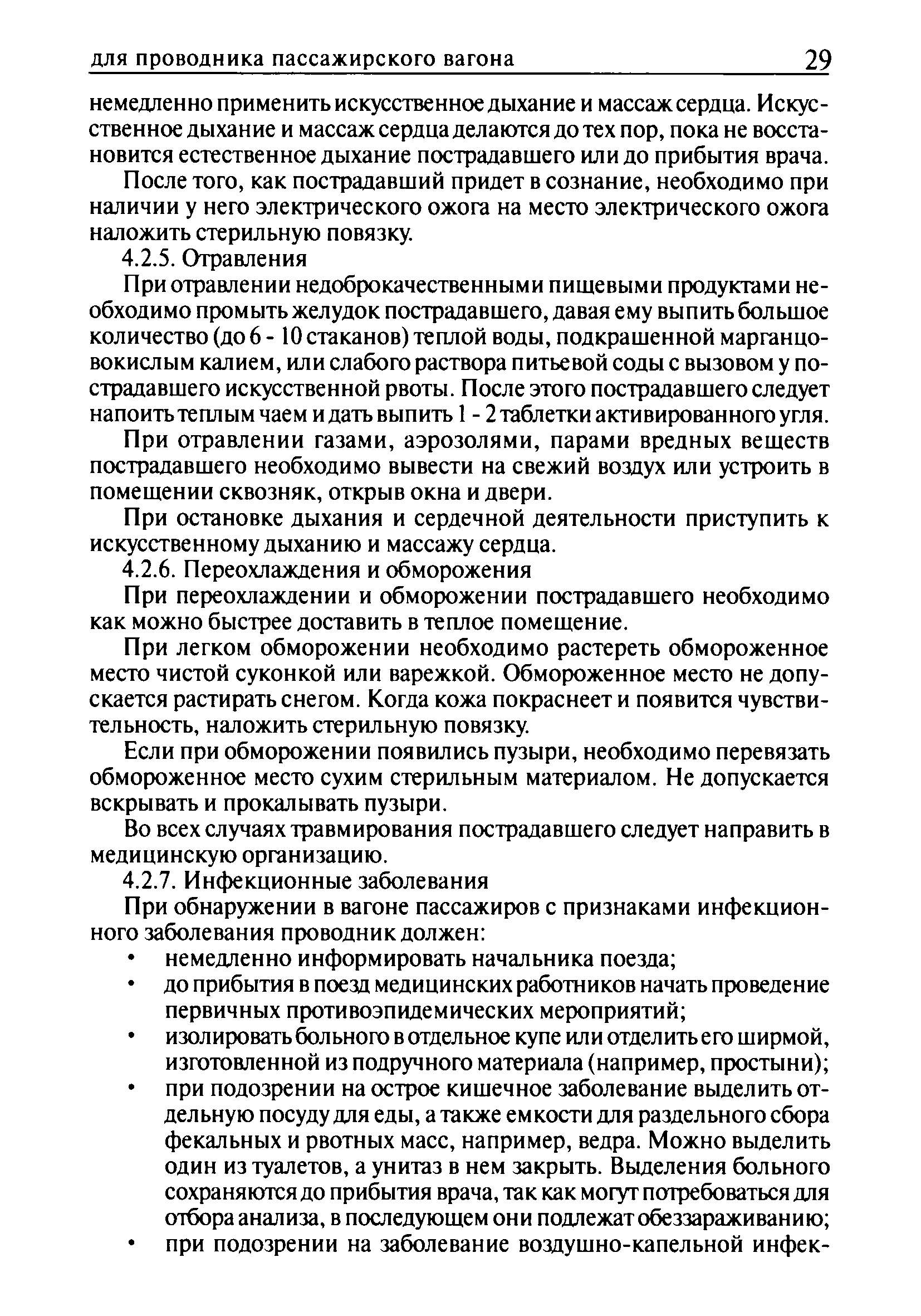 | Оглавление: | 1. Общие требования охраны труда 2. Требования охраны труда перед началом работы 3. Требования охраны труда во время работы 3.1. Требования охраны труда при стоянке поезда на станциях 3.2. Требования охраны труда при эксплуатации внутреннего оборудования, окон и дверей вагона 3.3. Требования охраны труда при эксплуатации оборудования водоснабжения 3.4. Требования охраны труда при эксплуатации системы отопления 3.5. Требования охраны труда при эксплуатации электрооборудования вагона 3.6. Требования охраны труда при эксплуатации подъемника 3.7. Требования охраны труда при эксплуатации бытового оборудования 3.8. Требования охраны труда при эксплуатации санитарно-технического оборудования 3.9. Требования охраны труда при приготовлении и раздаче чайной продукции 3.10. Требования охраны труда при производстве внутренней уборки вагона 4. Требования охраны труда в аварийных ситуациях 4.1. Действия проводника при возникновении аварий и аварийных ситуаций 4.2. Действия проводника по оказанию первой помощи пострадавшим при травмах и заболеваниях 5. Требования охраны труда по окончании работы |