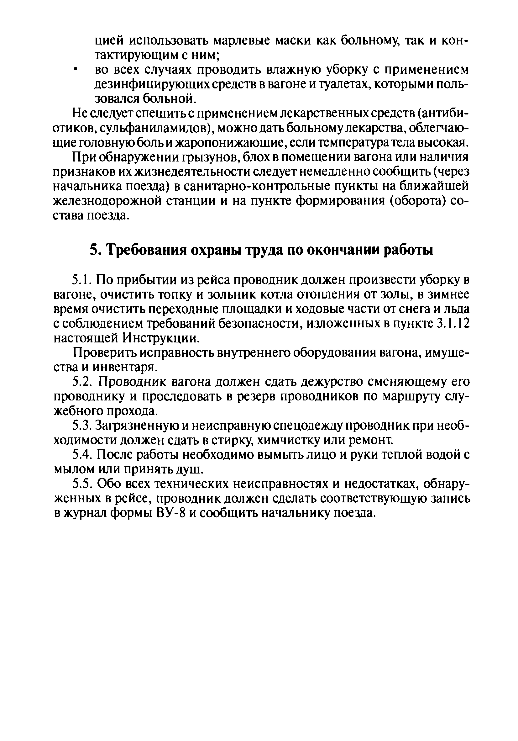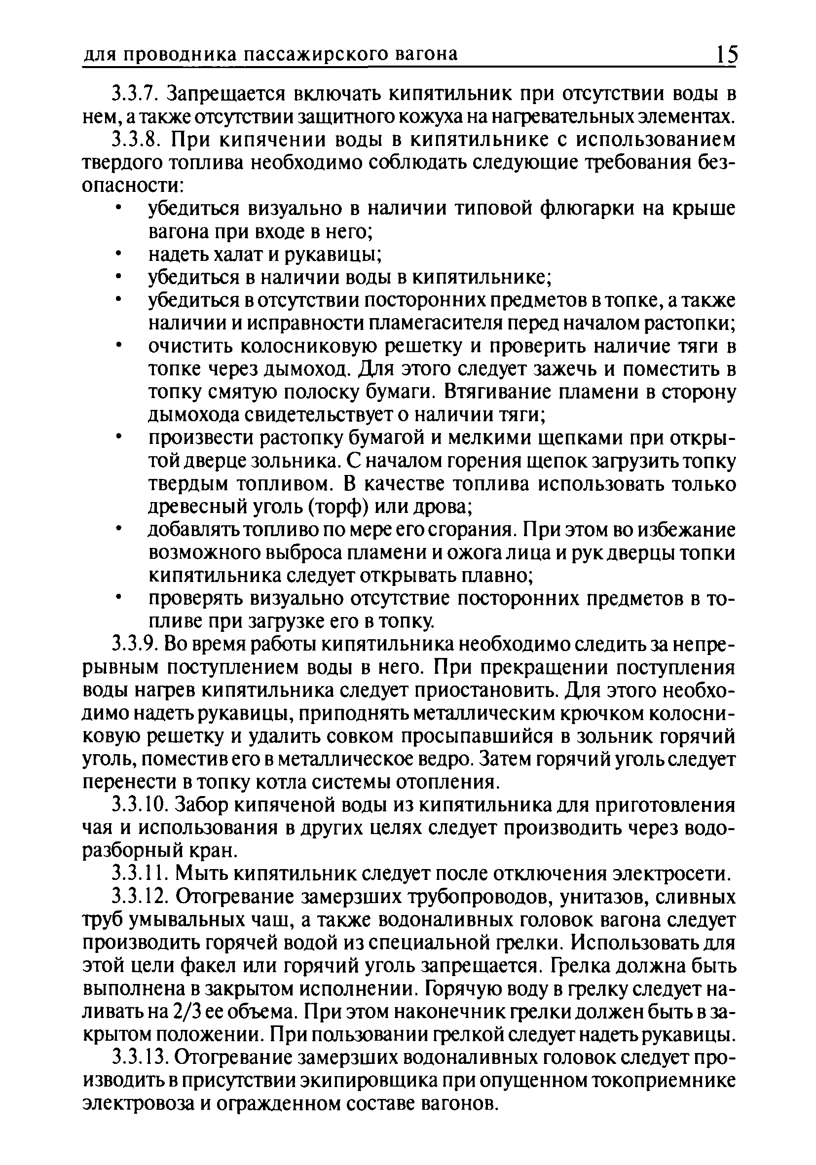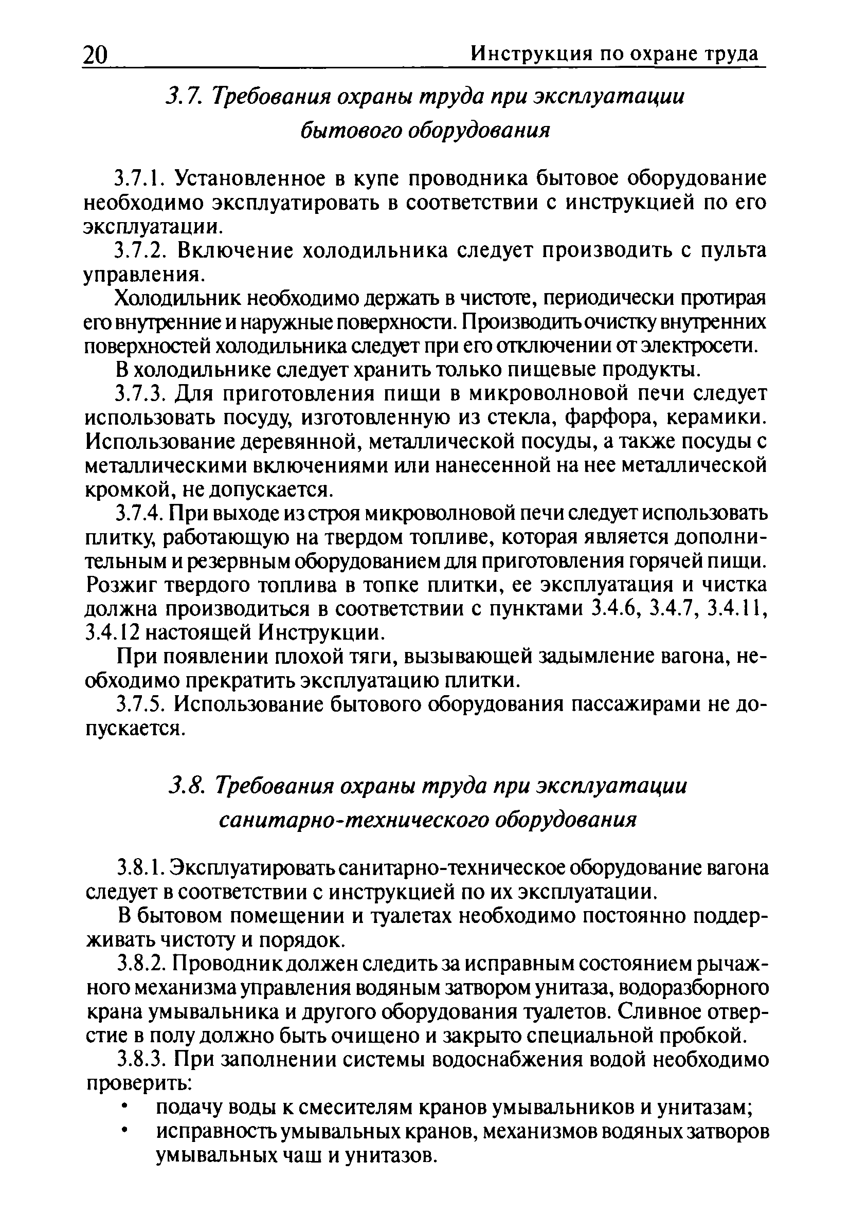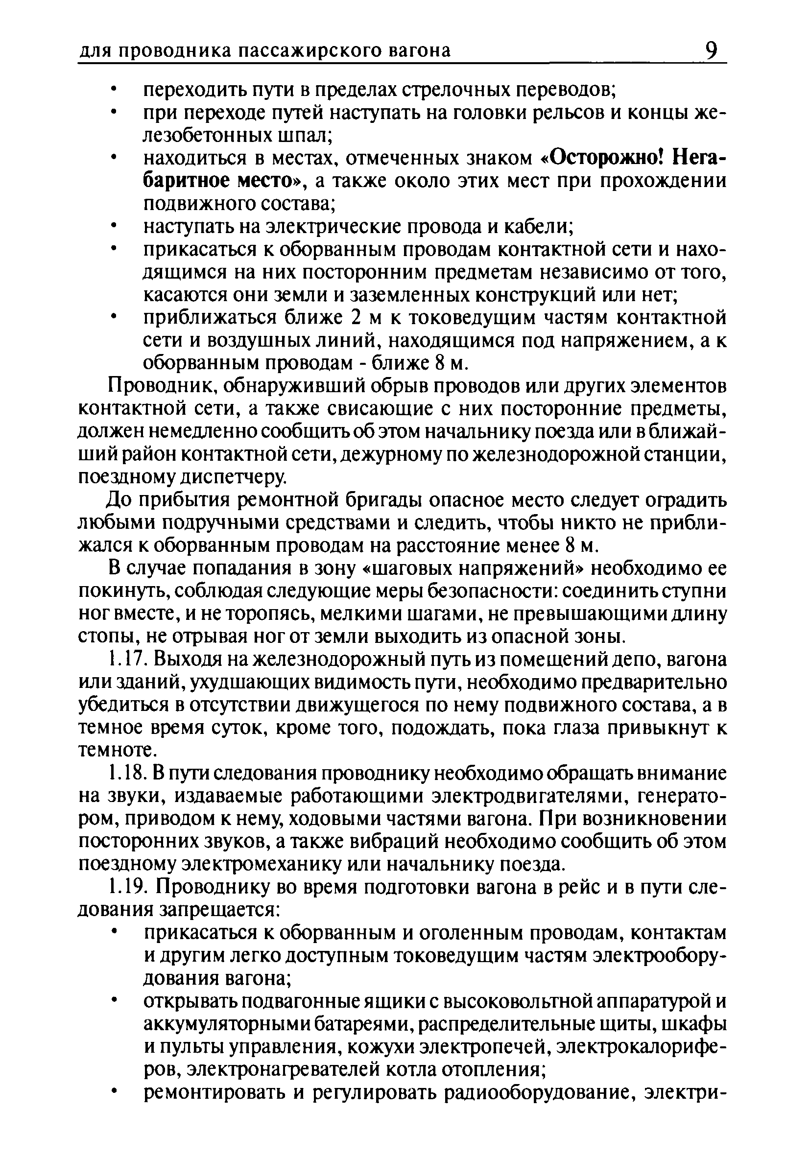 | Оглавление: | 1. Общие требования охраны труда 2. Требования охраны труда перед началом работы 3. Требования охраны труда во время работы 3.1. Требования охраны труда при стоянке поезда на станциях 3.2. Требования охраны труда при эксплуатации внутреннего оборудования, окон и дверей вагона 3.3. Требования охраны труда при эксплуатации оборудования водоснабжения 3.4. Требования охраны труда при эксплуатации системы отопления 3.5. Требования охраны труда при эксплуатации электрооборудования вагона 3.6. Требования охраны труда при эксплуатации подъемника 3.7. Требования охраны труда при эксплуатации бытового оборудования 3.8. Требования охраны труда при эксплуатации санитарно-технического оборудования 3.9. Требования охраны труда при приготовлении и раздаче чайной продукции 3.10. Требования охраны труда при производстве внутренней уборки вагона 4. Требования охраны труда в аварийных ситуациях 4.1. Действия проводника при возникновении аварий и аварийных ситуаций 4.2. Действия проводника по оказанию первой помощи пострадавшим при травмах и заболеваниях 5. Требования охраны труда по окончании работы |