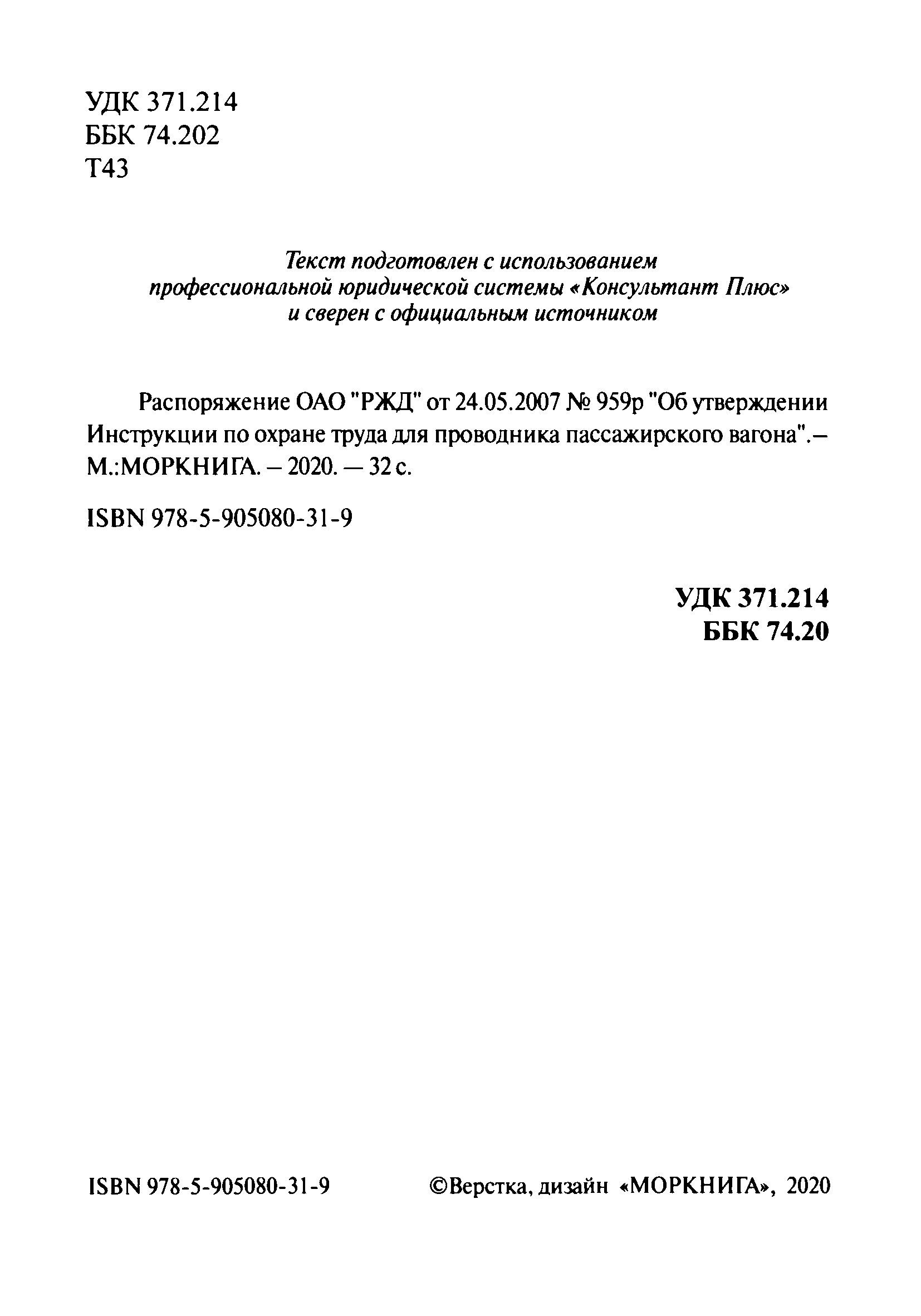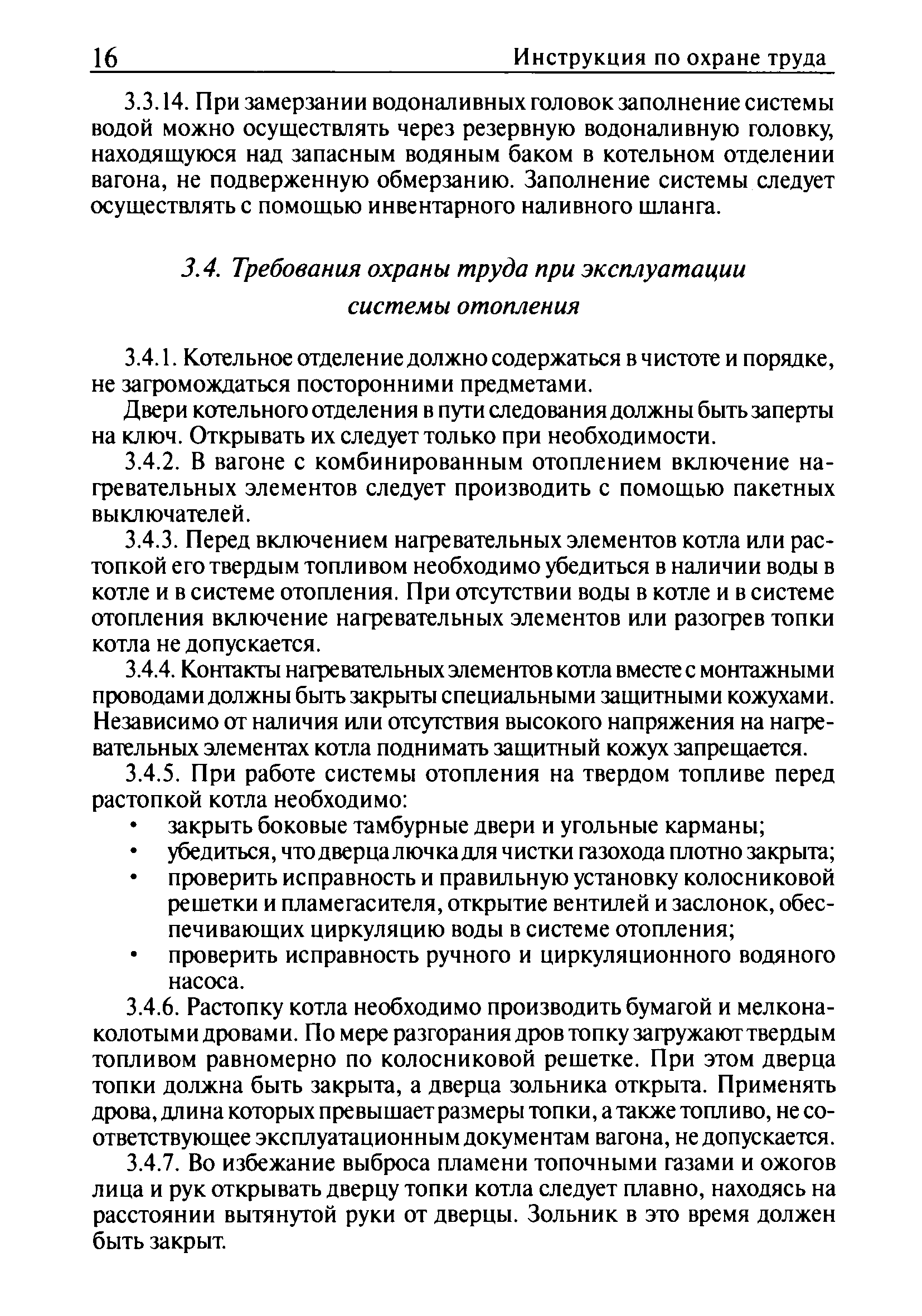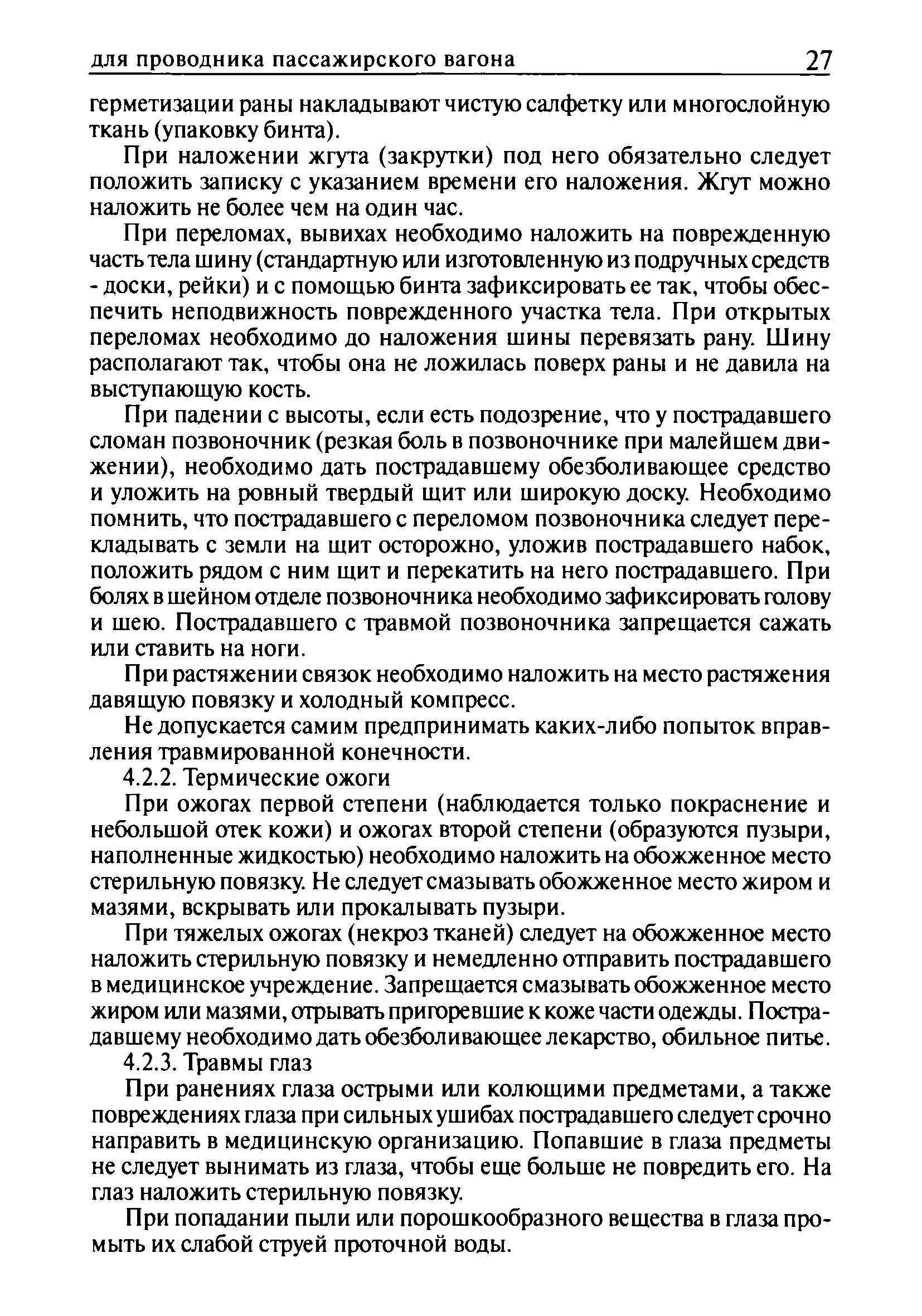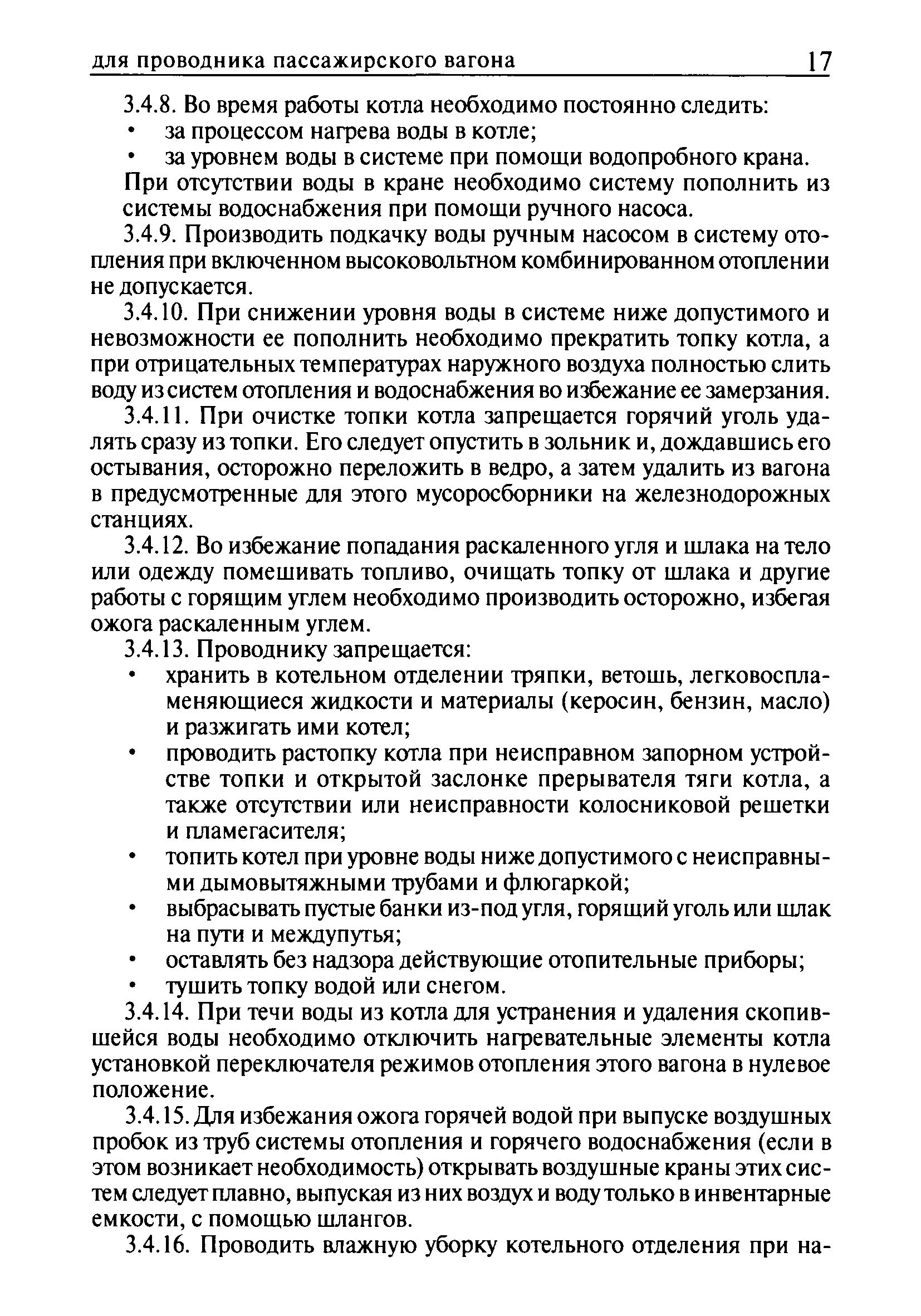 | Оглавление: | 1. Общие требования охраны труда 2. Требования охраны труда перед началом работы 3. Требования охраны труда во время работы 3.1. Требования охраны труда при стоянке поезда на станциях 3.2. Требования охраны труда при эксплуатации внутреннего оборудования, окон и дверей вагона 3.3. Требования охраны труда при эксплуатации оборудования водоснабжения 3.4. Требования охраны труда при эксплуатации системы отопления 3.5. Требования охраны труда при эксплуатации электрооборудования вагона 3.6. Требования охраны труда при эксплуатации подъемника 3.7. Требования охраны труда при эксплуатации бытового оборудования 3.8. Требования охраны труда при эксплуатации санитарно-технического оборудования 3.9. Требования охраны труда при приготовлении и раздаче чайной продукции 3.10. Требования охраны труда при производстве внутренней уборки вагона 4. Требования охраны труда в аварийных ситуациях 4.1. Действия проводника при возникновении аварий и аварийных ситуаций 4.2. Действия проводника по оказанию первой помощи пострадавшим при травмах и заболеваниях 5. Требования охраны труда по окончании работы |