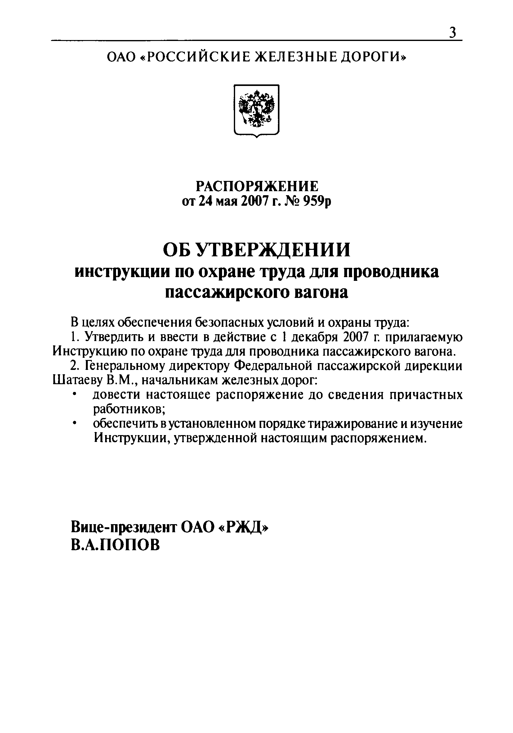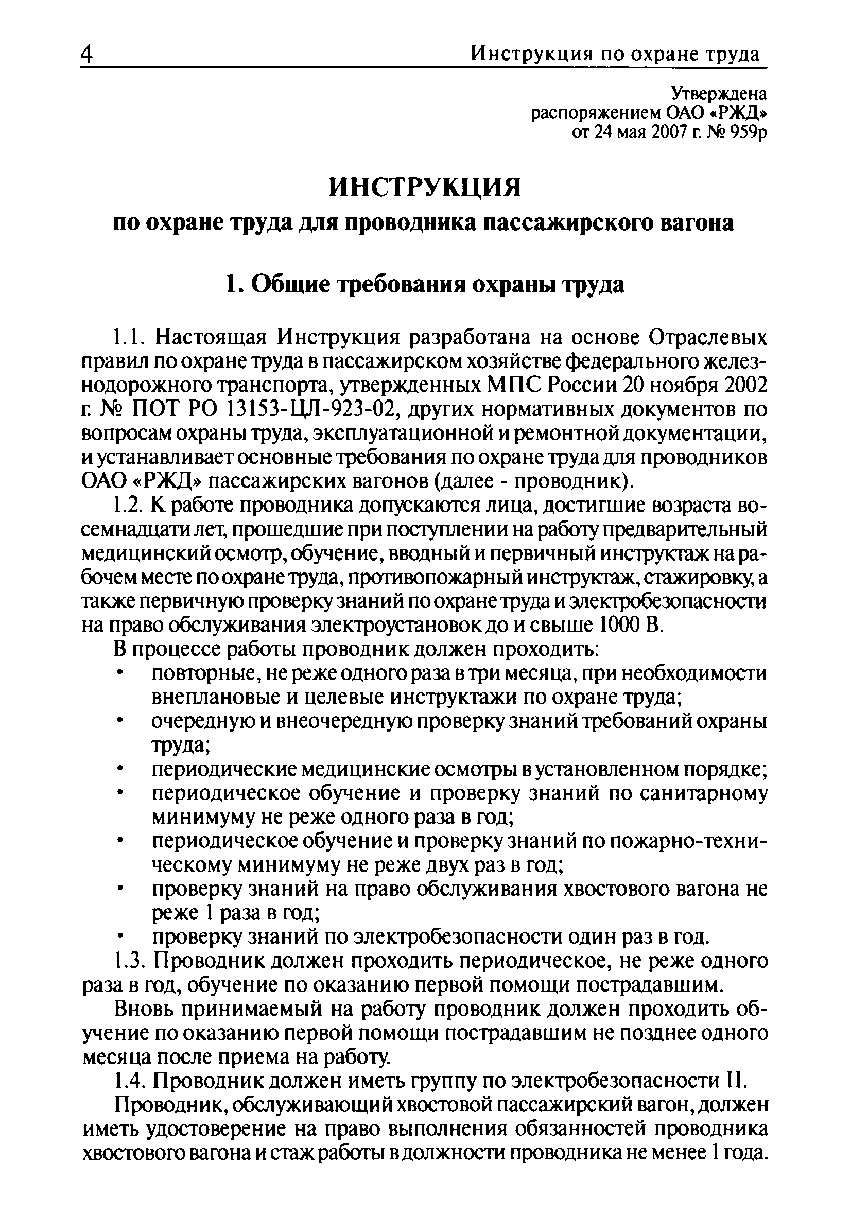 | Утверждён: | 24.05.2007 ОАО РЖД (959р)