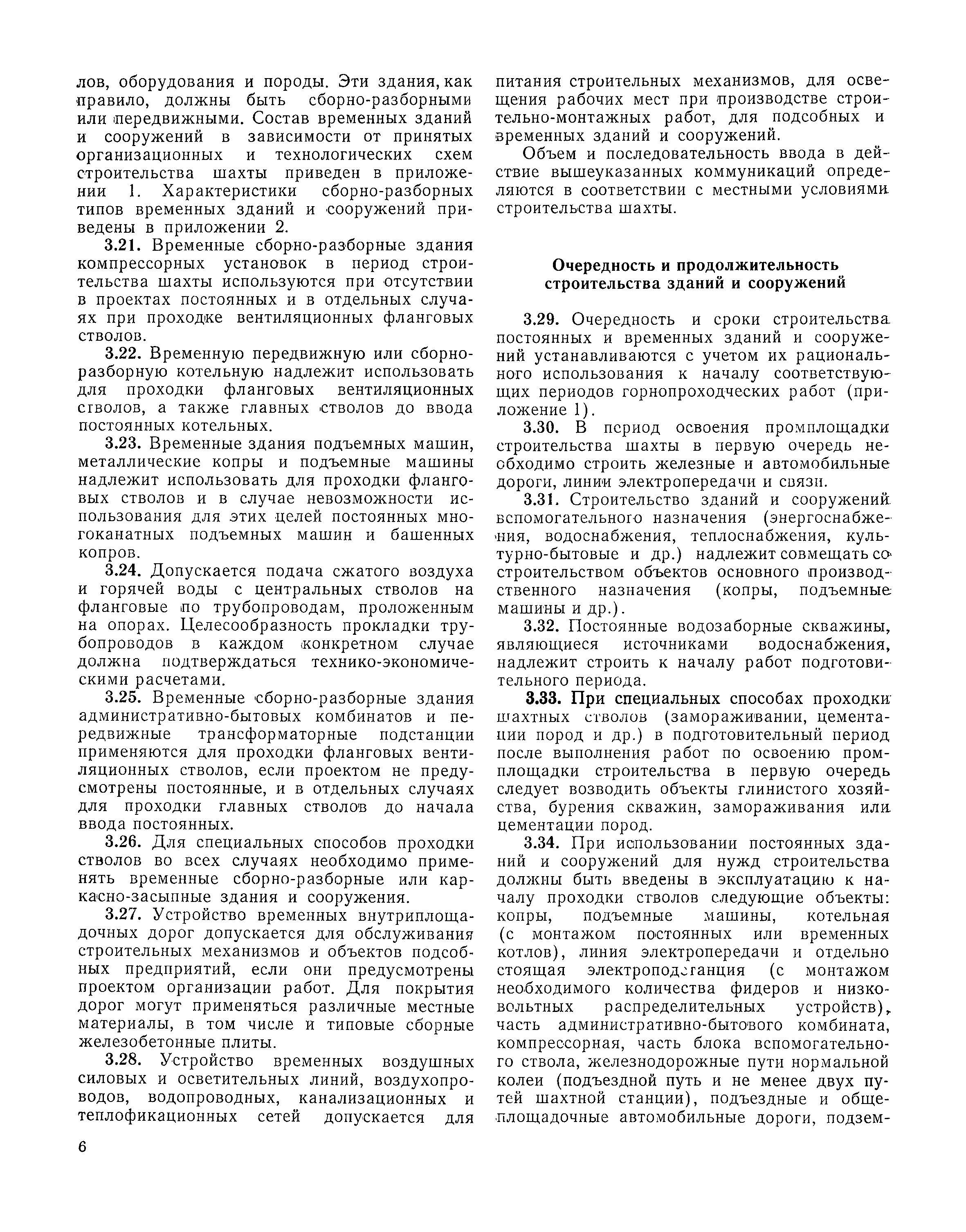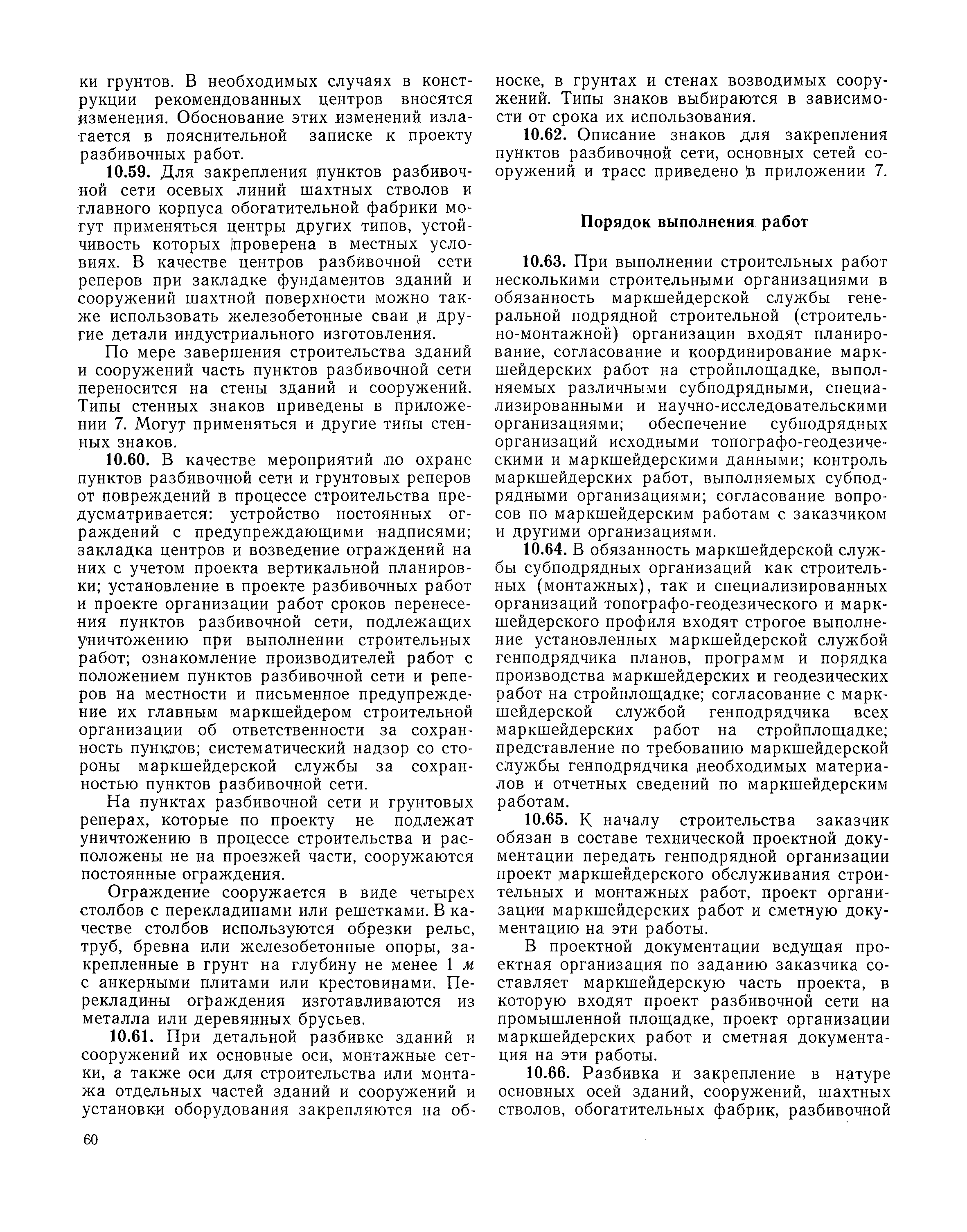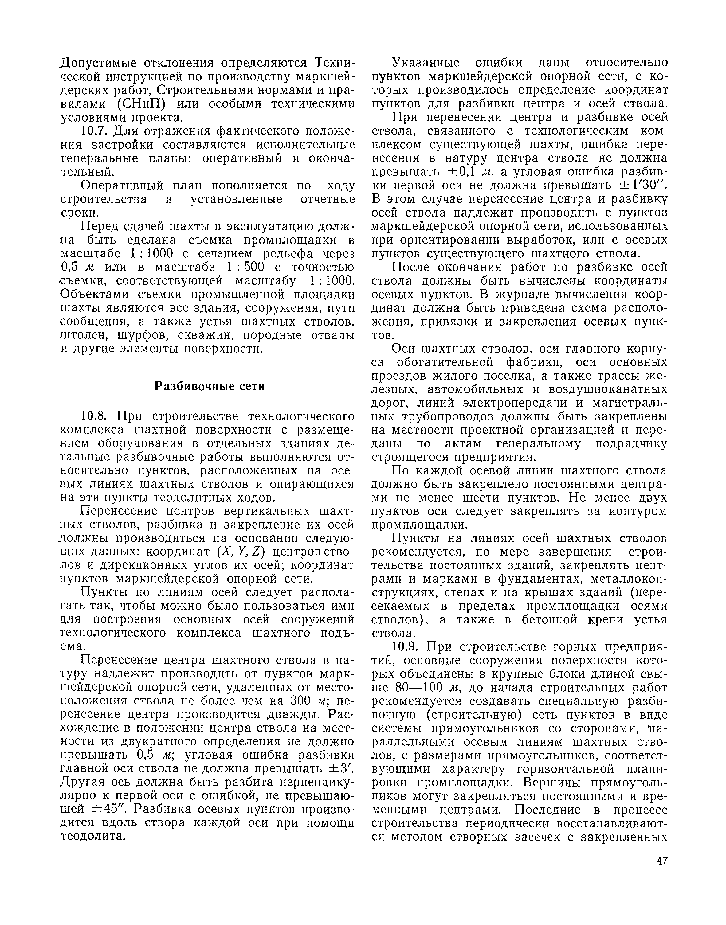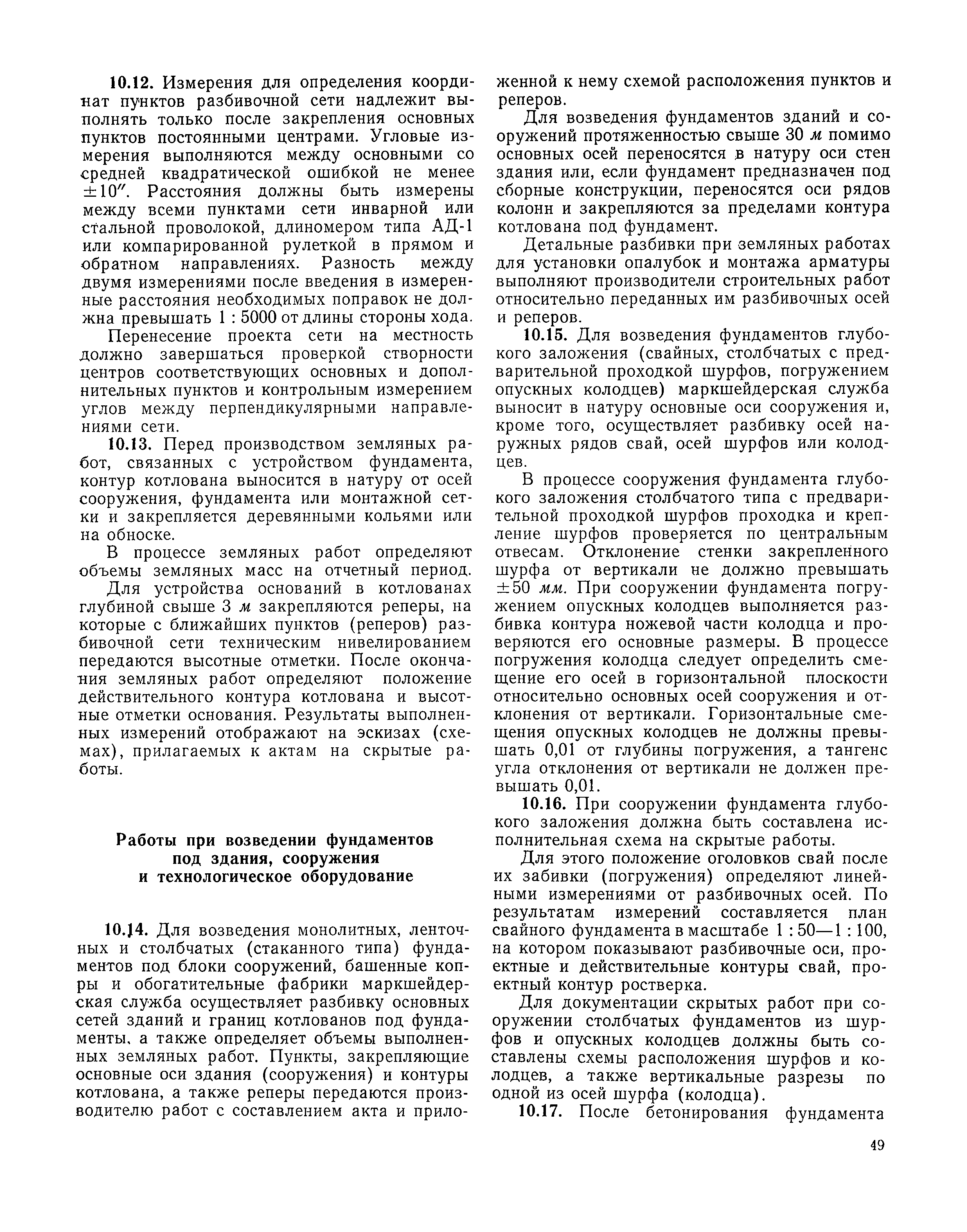 | Оглавление: | I Организация строительства 1 Общие положения 2 Подготовительный период 3 Использование постоянных и временных зданий и сооружений для нужд строительства, очередность и продолжительность их возведения 4 Проектирование организации поточного строительства и управление им по комплексному сетевому графику II Правила производства и приемки работ 5 Общие положения 6 Земляные работы 7 Бетонные и железобетонные работы 8 Монтаж сборных железобетонных конструкций 9 Монтаж металлических конструкций III Маркшейдерские работы 10 Производство маркшейдерских работ Приложение 1. Перечень зданий и сооружений, рекомендуемый к использованию на период строительства шахт Приложение 2. Характеристики сборно-разборных типов временных зданий и сооружений Приложение 3. Продолжительность строительства зданий и сооружений шахтной поверхности и углеобогатительных фабрик Приложение 4. Карточка-определитель работ в составе сетевого графика Приложение 5. Состав комплектов машин и механизмов для некоторых видов работ Приложение 6. Технические характеристики сваебойного оборудования Приложение 7. Описание знаков для закрепления пунктов разбивочной сети, основных сетей сооружений и трасс |