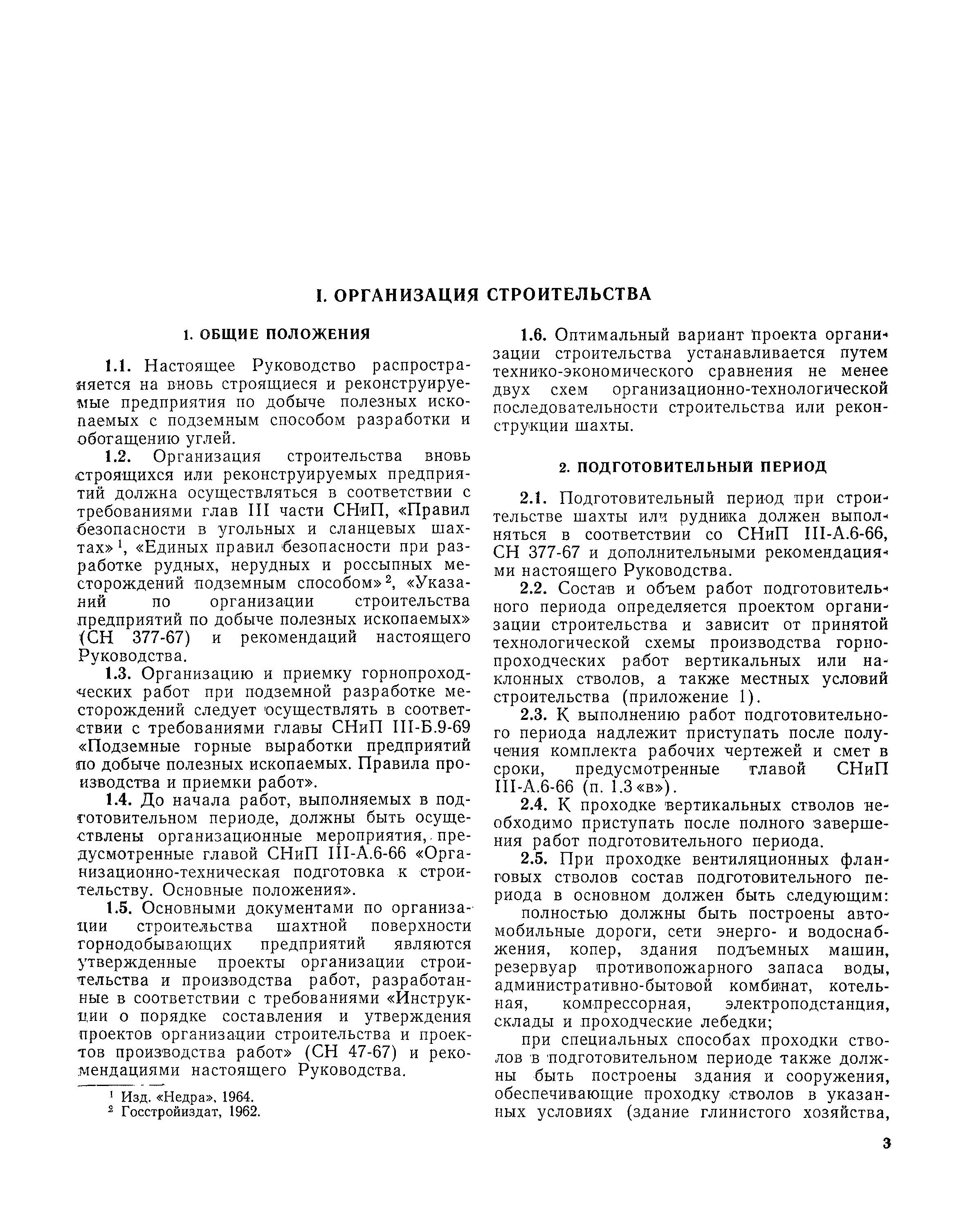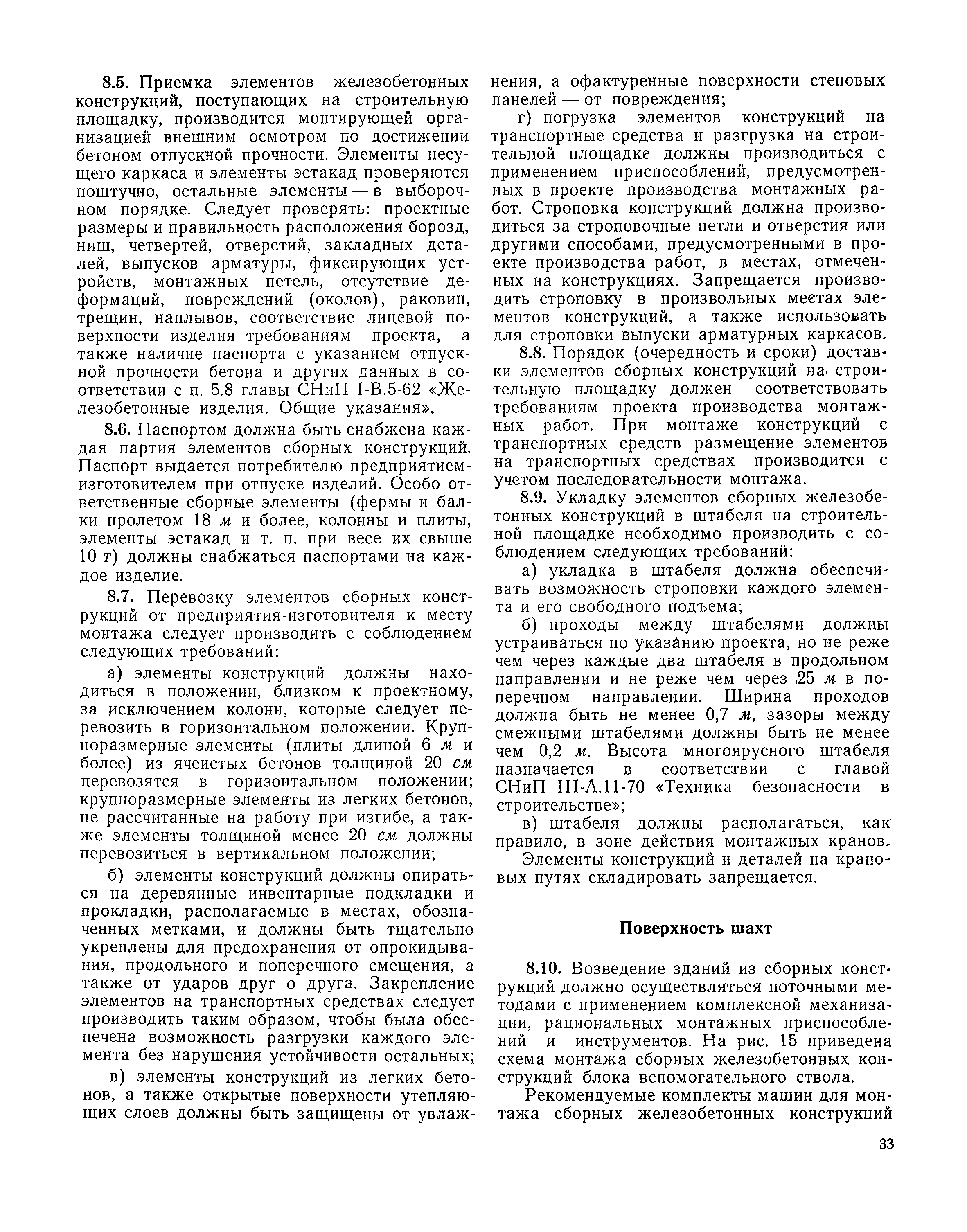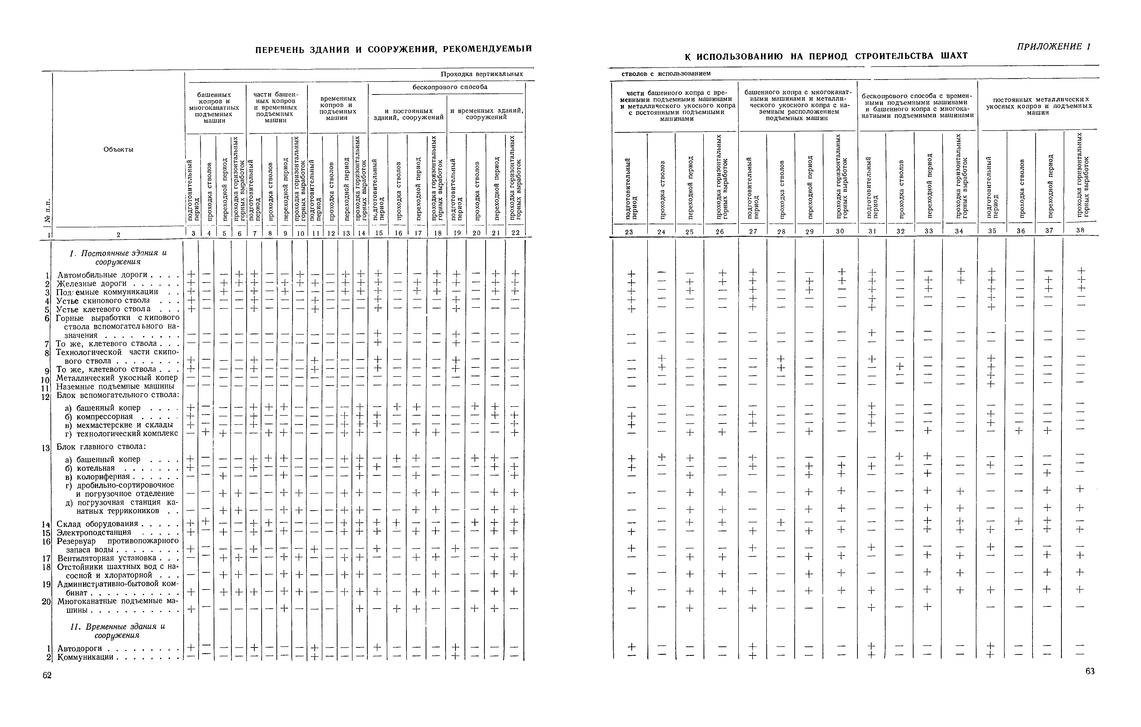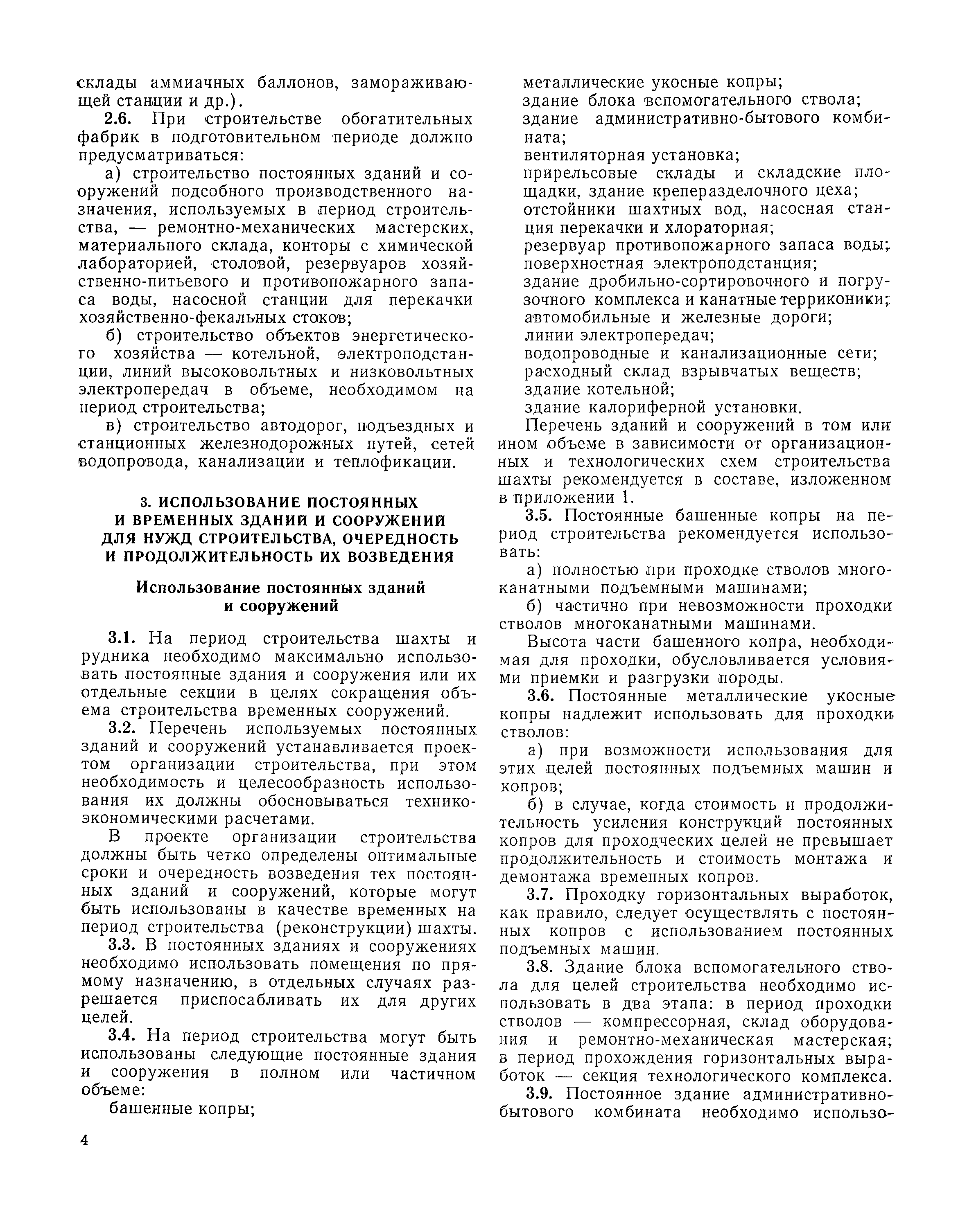 | Оглавление: | I Организация строительства 1 Общие положения 2 Подготовительный период 3 Использование постоянных и временных зданий и сооружений для нужд строительства, очередность и продолжительность их возведения 4 Проектирование организации поточного строительства и управление им по комплексному сетевому графику II Правила производства и приемки работ 5 Общие положения 6 Земляные работы 7 Бетонные и железобетонные работы 8 Монтаж сборных железобетонных конструкций 9 Монтаж металлических конструкций III Маркшейдерские работы 10 Производство маркшейдерских работ Приложение 1. Перечень зданий и сооружений, рекомендуемый к использованию на период строительства шахт Приложение 2. Характеристики сборно-разборных типов временных зданий и сооружений Приложение 3. Продолжительность строительства зданий и сооружений шахтной поверхности и углеобогатительных фабрик Приложение 4. Карточка-определитель работ в составе сетевого графика Приложение 5. Состав комплектов машин и механизмов для некоторых видов работ Приложение 6. Технические характеристики сваебойного оборудования Приложение 7. Описание знаков для закрепления пунктов разбивочной сети, основных сетей сооружений и трасс |