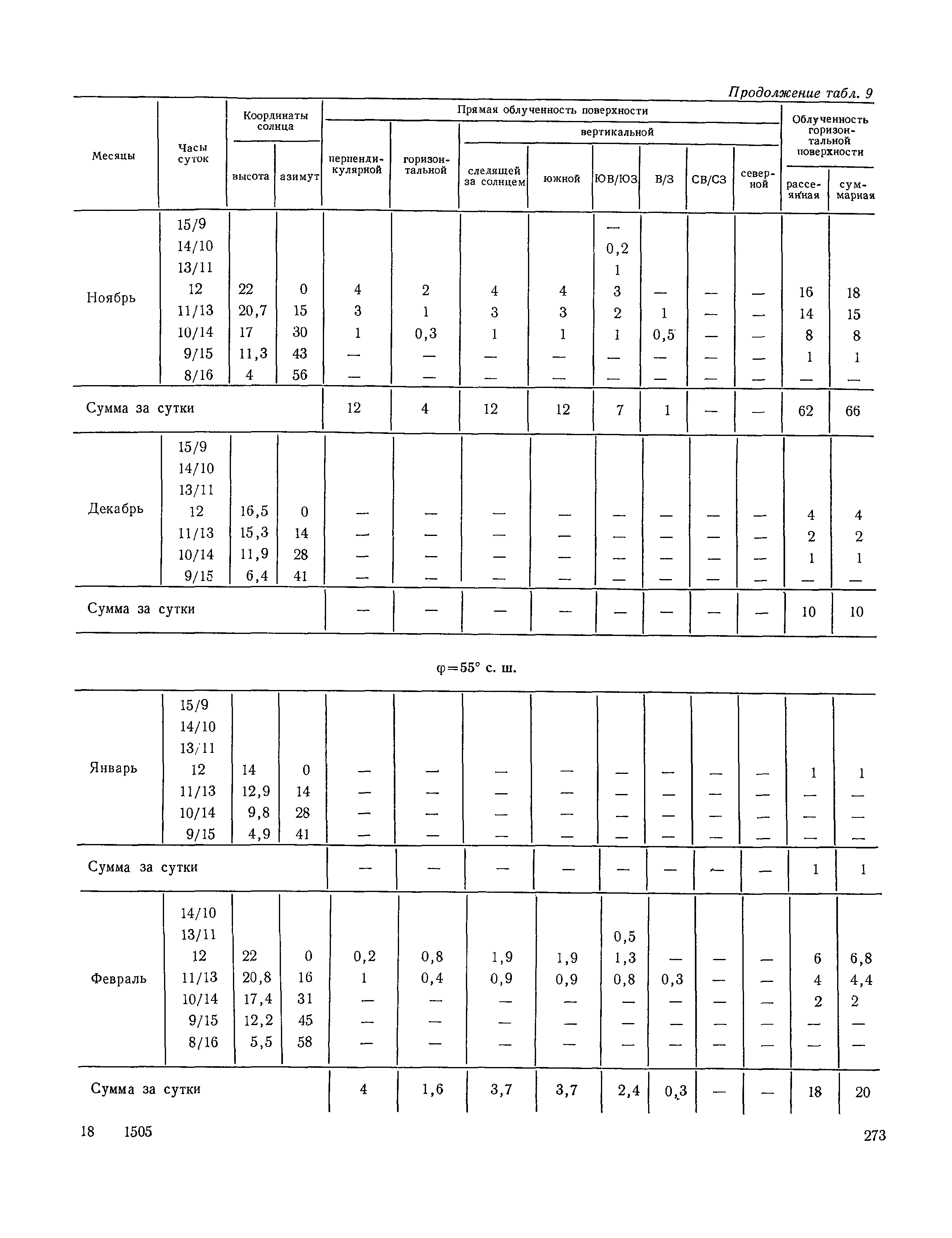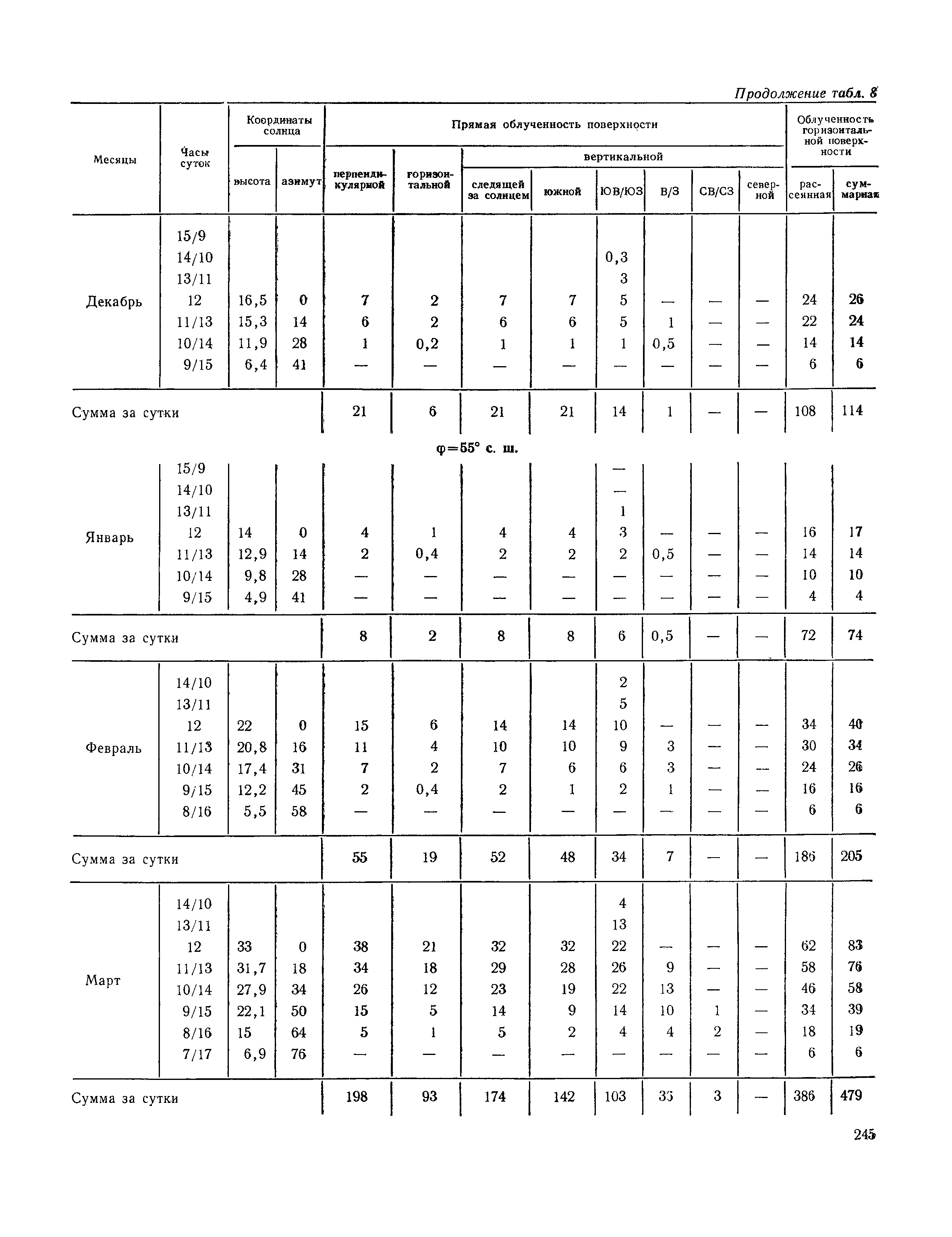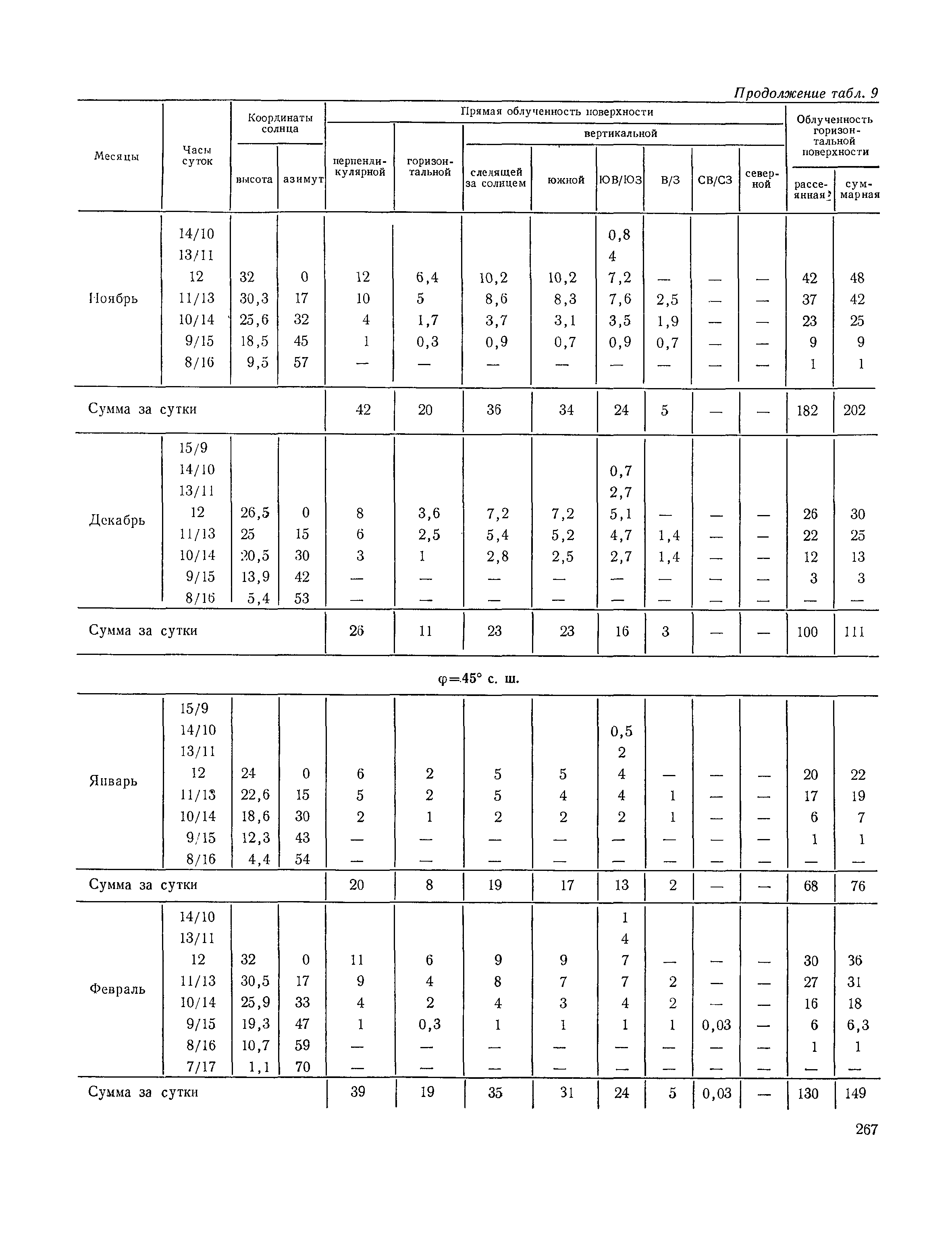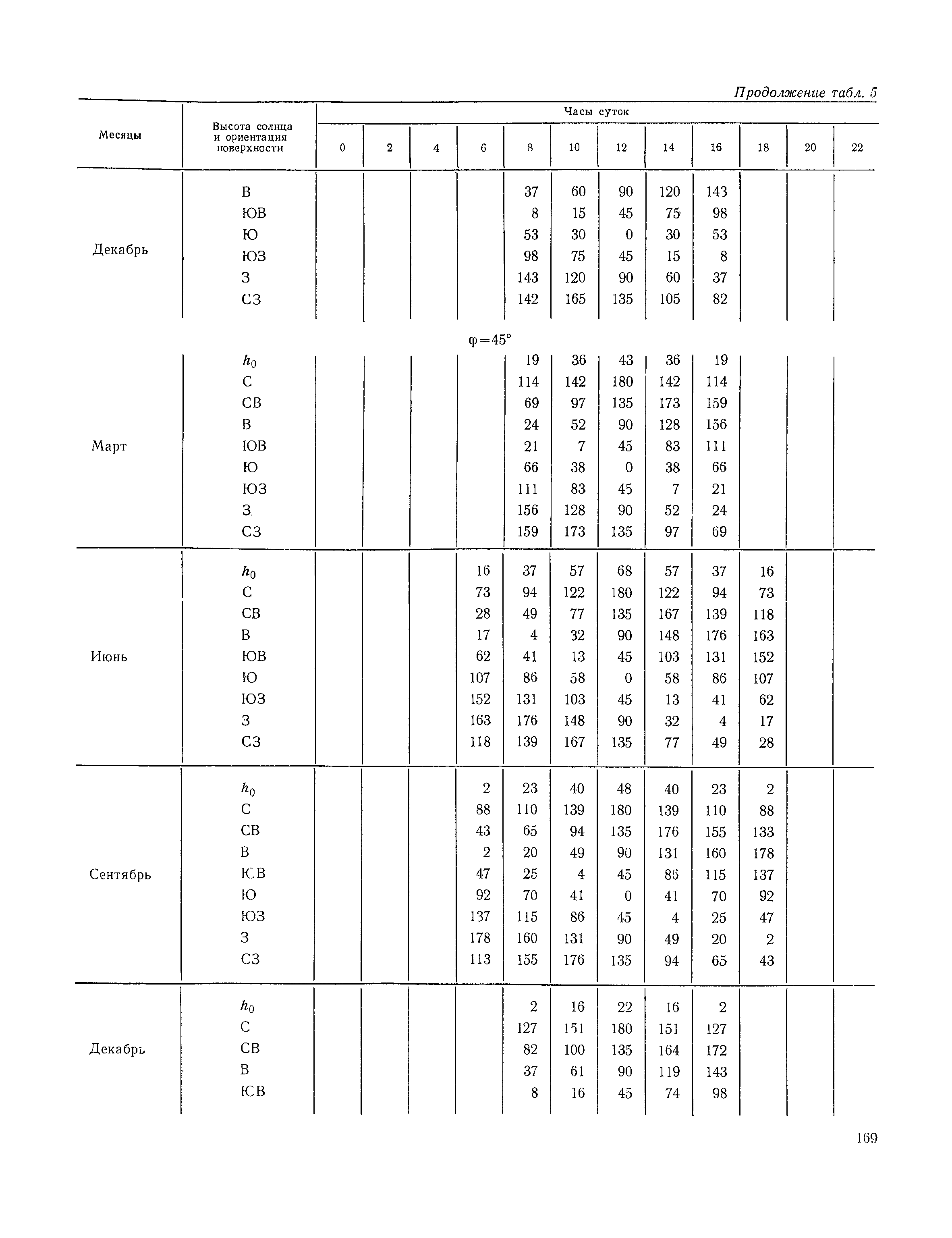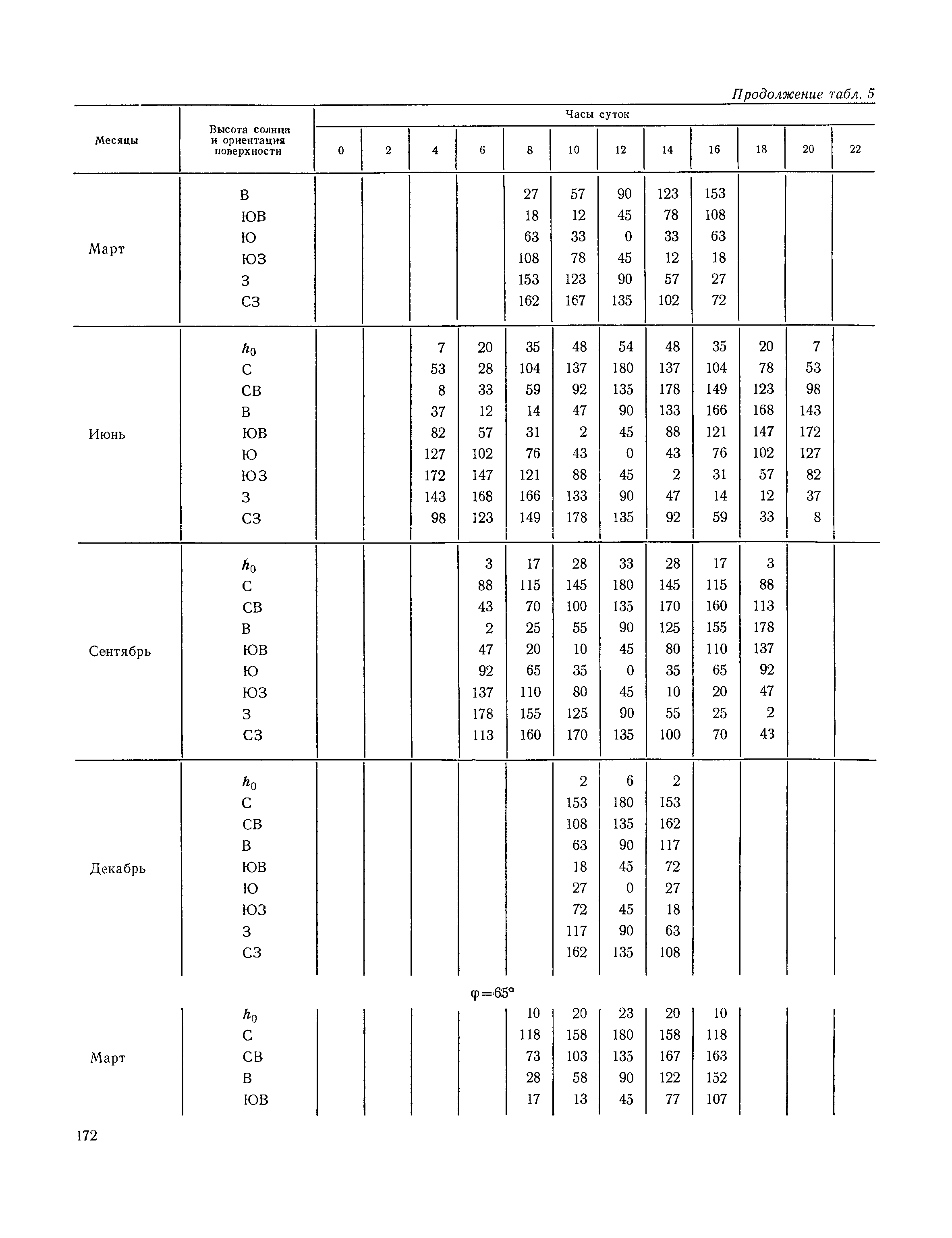 Руководство по строительной климатологии (пособие по проектированию)| Статус: | привязан к недействующему документу | | Название рус.: | Руководство по строительной климатологии (пособие по проектированию) | | Дата добавления в базу: | 01.01.2021 | | Дата актуализации: | 01.01.2021 | | Область применения: | Руководство по строительной климатологии содержит основные климатические показатели, которые могут быть использованы при разработке проектов планировки и застройки населенных мест, проектировании генеральных планов промышленных предприятий, составлении климатического паспорта городов и строительных площадок, при проектировании новых и реконструкции действующих предприятий, зданий и сооружений различного типа. Материалы Руководства используются при расчетах строительных конструкций зданий и сооружений различного назначения, при расчетах теплопотерь и теплопоступлений, a также отопления и вентиляции, при оценке режима увлажнения зданий и определении условий инсоляции и светового режима в различных климатических условиях Советского Союза. Руководство предназначено для архитекторов, инженеров строительных специальностей и научных работников | | Оглавление: | 1. Общие положения 2. Солнечная радиация А. Тепловая радиация Б. Видимая радиация В. Ультрафиолетовая радиация 3. Температура наружного воздуха 4. Атмосферные осадки, выпадающие на вертикальные поверхности ограждений 5. Скорость ветра 6. Оценка планировочных решений с учетом ветрового режима Таблица 1. Суммарная (прямая/рассеянная) радиация, поступающая на вертикальные поверхности различной ориентации при безоблачном небе в зависимости от широты и времени суток Таблица 2. Суммарная (прямая/рассеянная) радиация, поступающая на горизонтальную поверхность при безоблачном небе в зависимости от широты и времени суток Таблица 3. Суммарная солнечная радиация, поступающая на вертикальные поверхности различной ориентации при действительных условиях облачности и прозрачности атмосферы Таблица 4. Прямая, рассеянная и суммарная освещенность горизонтальных и вертикальных поверхностей в зависимости от широты и времени суток Таблица 5. Высота солнца и азимут нормали к вертикальной поверхности, отсчитанной от вертикали солнца для различных широт Таблица 6. Ультрафиолетовая (области А + В) облученность Таблица 7. Ультрафиолетовая (области В) облученность Таблица 8. Эритемная (области А + В) облученность Таблица 9. Эритемная (области В) облученность Таблица 10. Бактерицидная облученность Таблица 11. Средняя за январь температура воздуха, повторяемость, и скорость ветров различных направлений по отдельным пунктам СССР Таблица 12. Количество осадков, выпадающих под действием ветра на вертикальную поверхность наветренной ориентации по отдельным пунктам СССР Таблица 13. Средняя скорость ветра на высоте 10 м при низких температурах наружного воздуха Таблица 14. Планировочные схемы первой группы Таблица 15. Планировочные схемы второй группы | | Разработан: | НИИСФ