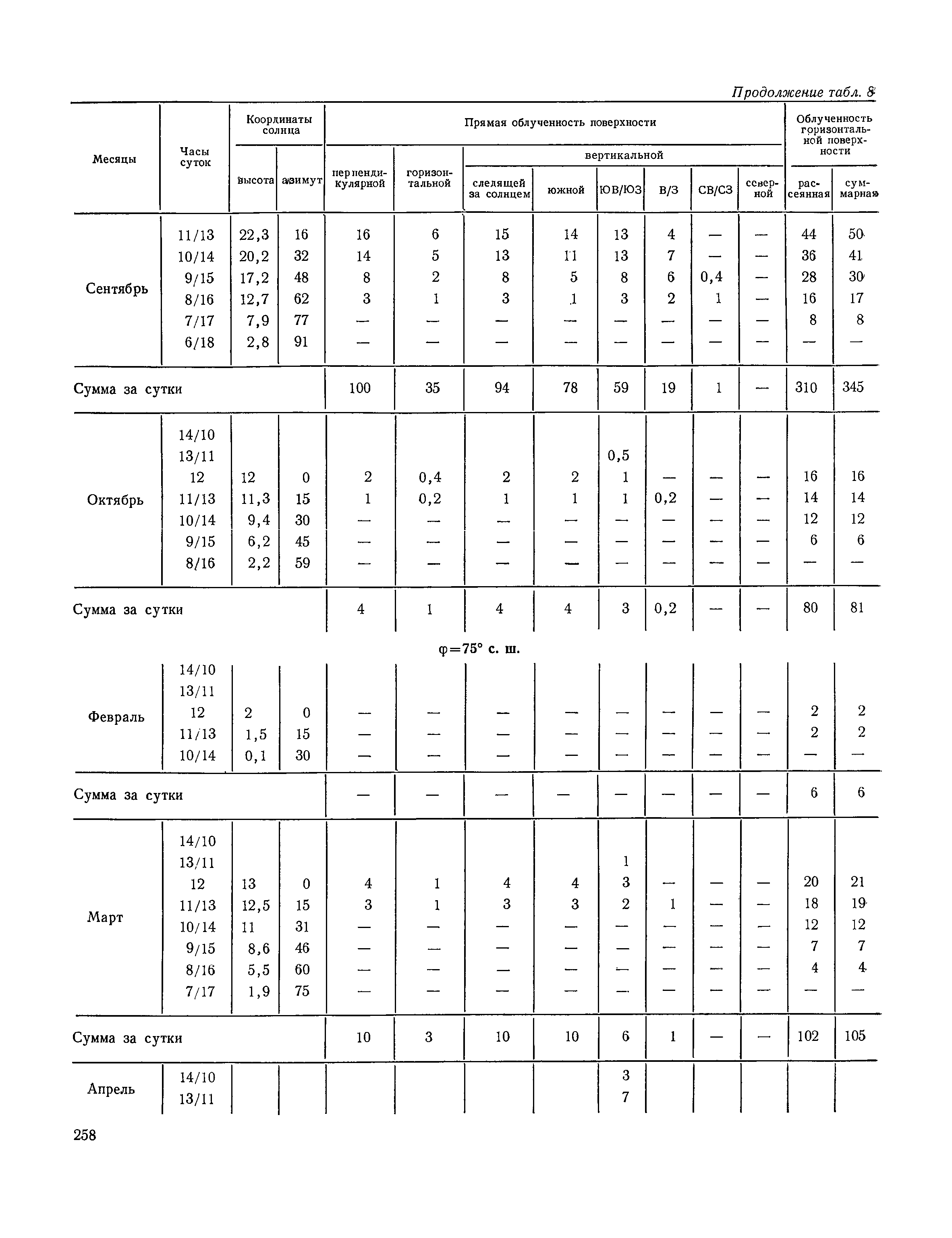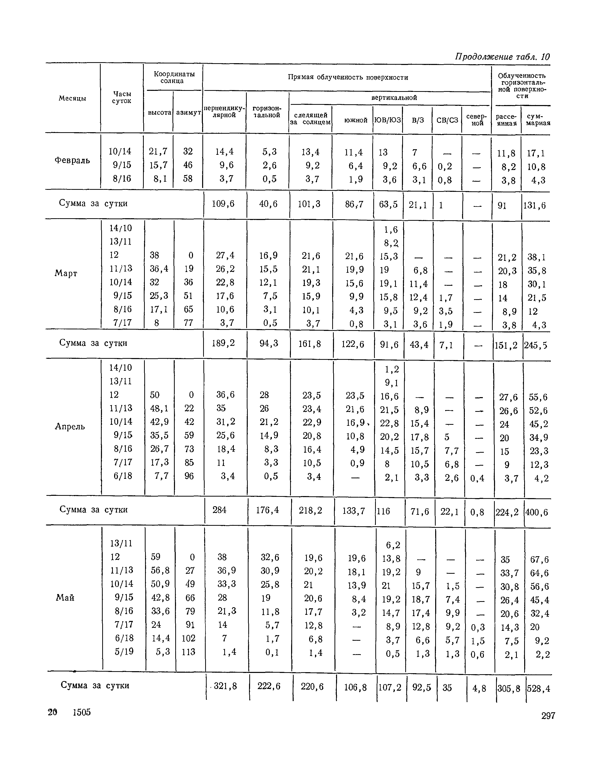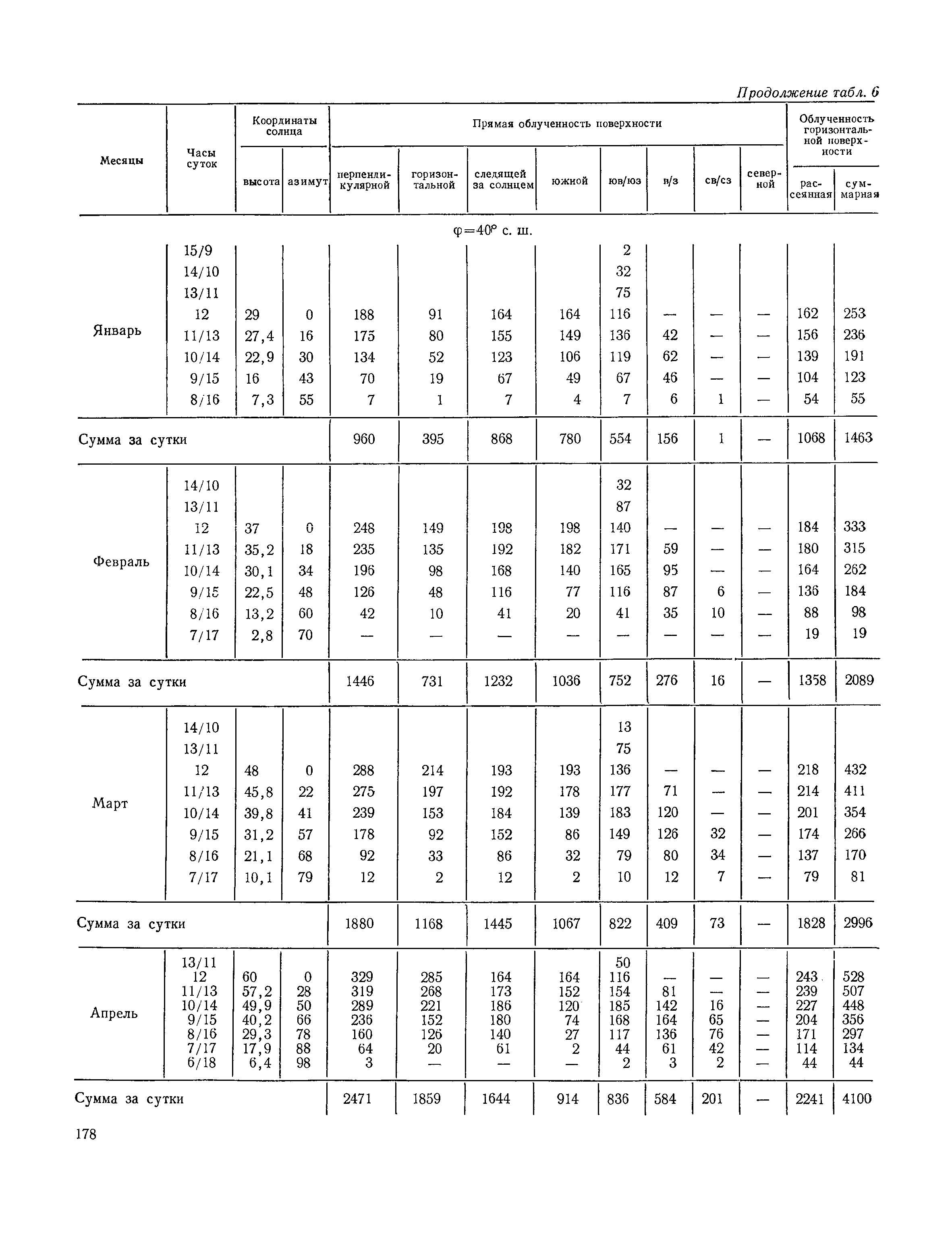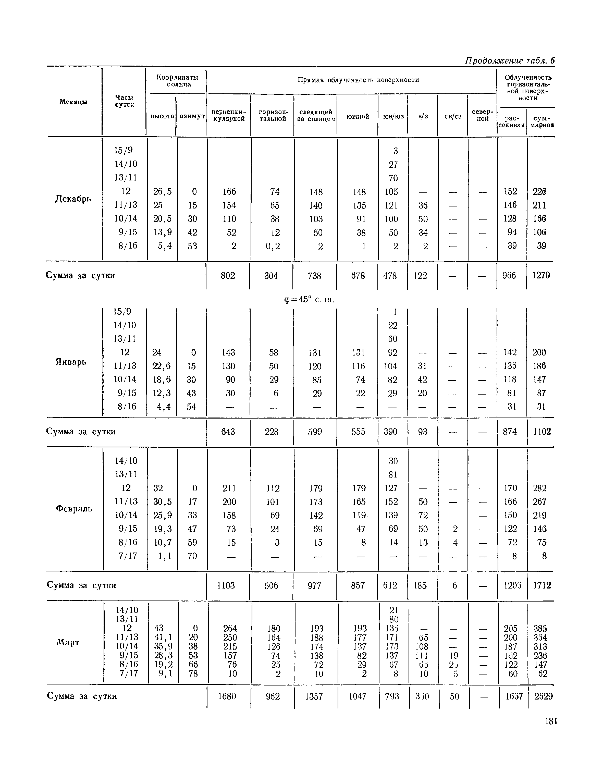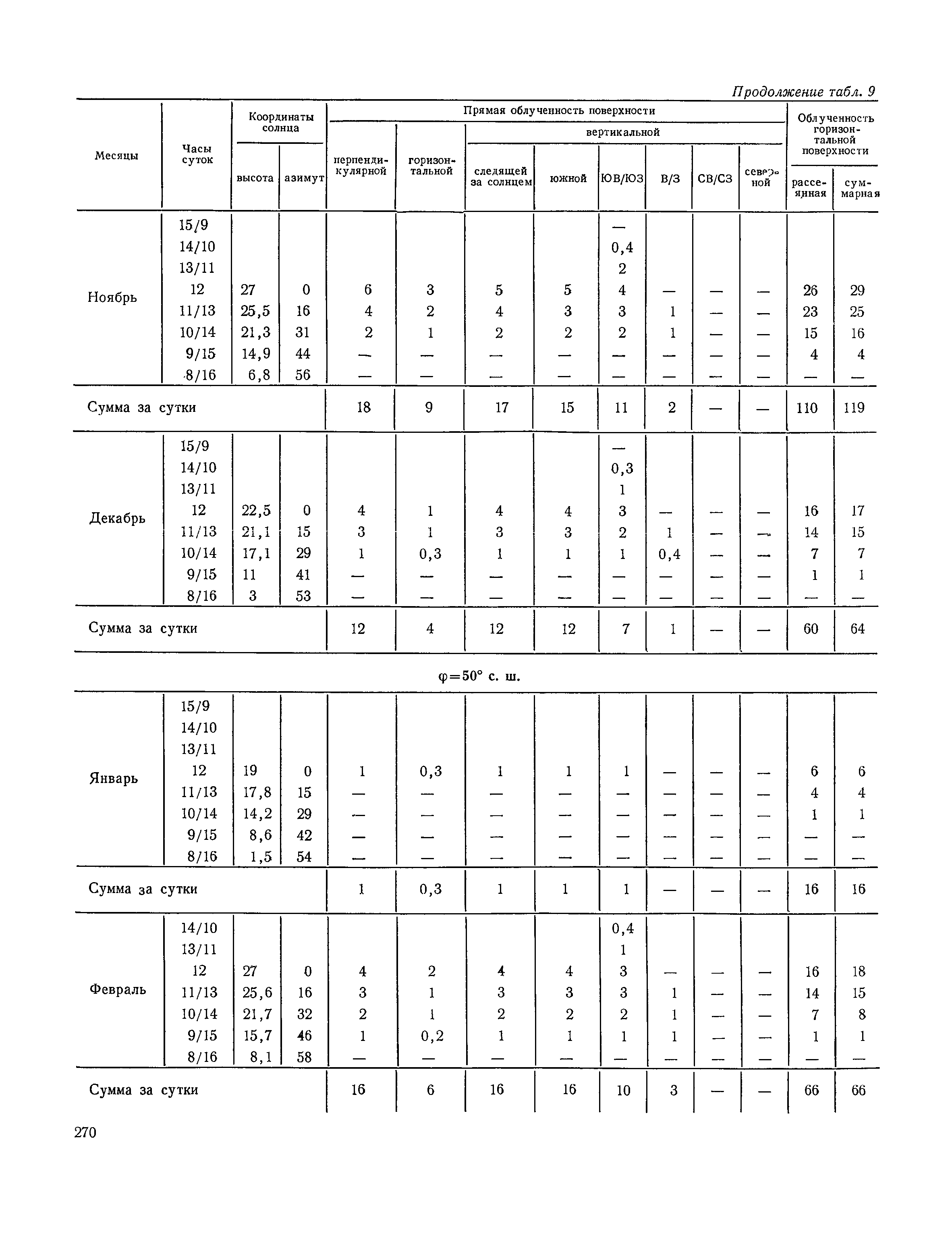 Руководство по строительной климатологии (пособие по проектированию)| Статус: | привязан к недействующему документу | | Название рус.: | Руководство по строительной климатологии (пособие по проектированию) | | Дата добавления в базу: | 01.01.2021 | | Дата актуализации: | 01.01.2021 | | Область применения: | Руководство по строительной климатологии содержит основные климатические показатели, которые могут быть использованы при разработке проектов планировки и застройки населенных мест, проектировании генеральных планов промышленных предприятий, составлении климатического паспорта городов и строительных площадок, при проектировании новых и реконструкции действующих предприятий, зданий и сооружений различного типа. Материалы Руководства используются при расчетах строительных конструкций зданий и сооружений различного назначения, при расчетах теплопотерь и теплопоступлений, a также отопления и вентиляции, при оценке режима увлажнения зданий и определении условий инсоляции и светового режима в различных климатических условиях Советского Союза. Руководство предназначено для архитекторов, инженеров строительных специальностей и научных работников | | Оглавление: | 1. Общие положения 2. Солнечная радиация А. Тепловая радиация Б. Видимая радиация В. Ультрафиолетовая радиация 3. Температура наружного воздуха 4. Атмосферные осадки, выпадающие на вертикальные поверхности ограждений 5. Скорость ветра 6. Оценка планировочных решений с учетом ветрового режима Таблица 1. Суммарная (прямая/рассеянная) радиация, поступающая на вертикальные поверхности различной ориентации при безоблачном небе в зависимости от широты и времени суток Таблица 2. Суммарная (прямая/рассеянная) радиация, поступающая на горизонтальную поверхность при безоблачном небе в зависимости от широты и времени суток Таблица 3. Суммарная солнечная радиация, поступающая на вертикальные поверхности различной ориентации при действительных условиях облачности и прозрачности атмосферы Таблица 4. Прямая, рассеянная и суммарная освещенность горизонтальных и вертикальных поверхностей в зависимости от широты и времени суток Таблица 5. Высота солнца и азимут нормали к вертикальной поверхности, отсчитанной от вертикали солнца для различных широт Таблица 6. Ультрафиолетовая (области А + В) облученность Таблица 7. Ультрафиолетовая (области В) облученность Таблица 8. Эритемная (области А + В) облученность Таблица 9. Эритемная (области В) облученность Таблица 10. Бактерицидная облученность Таблица 11. Средняя за январь температура воздуха, повторяемость, и скорость ветров различных направлений по отдельным пунктам СССР Таблица 12. Количество осадков, выпадающих под действием ветра на вертикальную поверхность наветренной ориентации по отдельным пунктам СССР Таблица 13. Средняя скорость ветра на высоте 10 м при низких температурах наружного воздуха Таблица 14. Планировочные схемы первой группы Таблица 15. Планировочные схемы второй группы | | Разработан: | НИИСФ