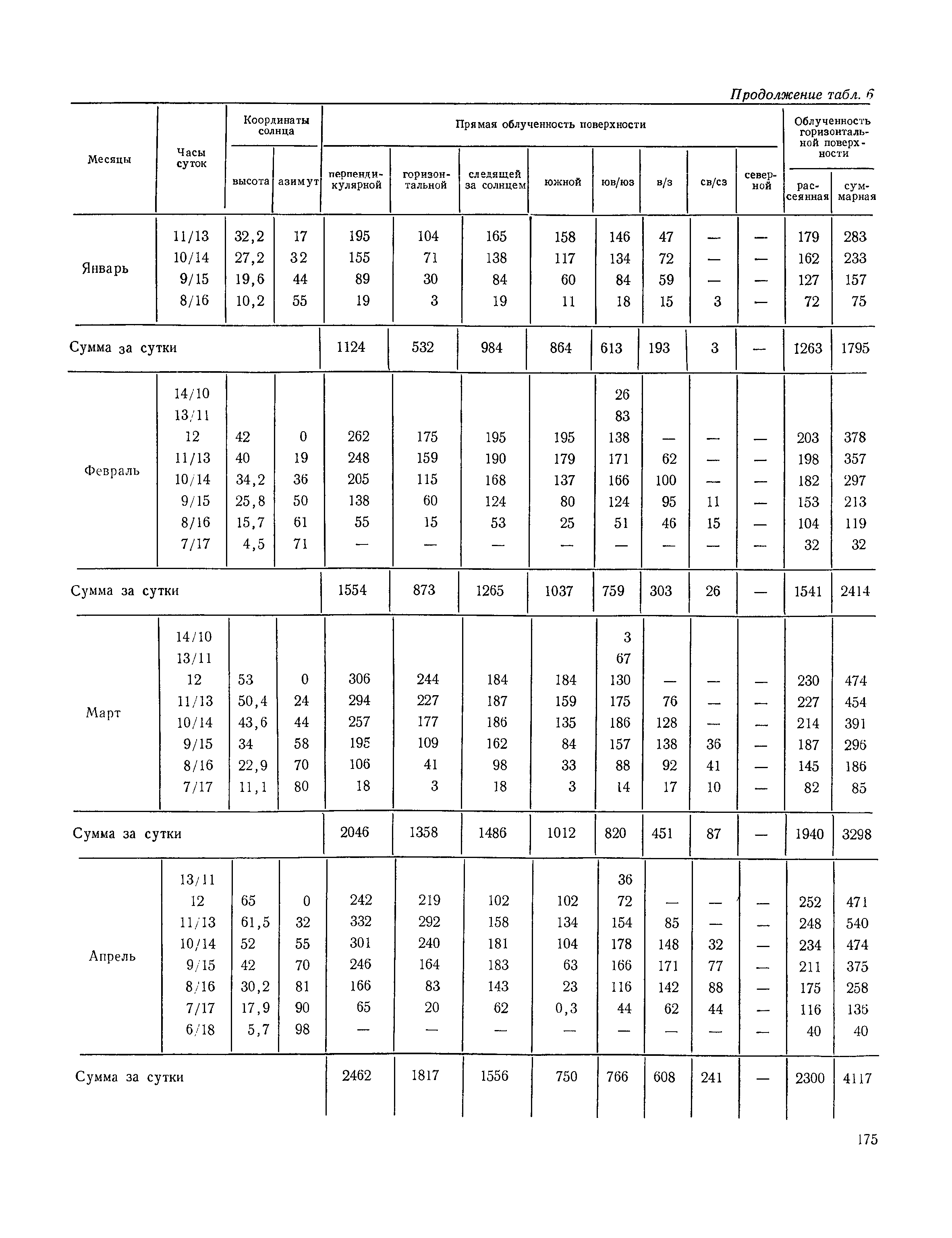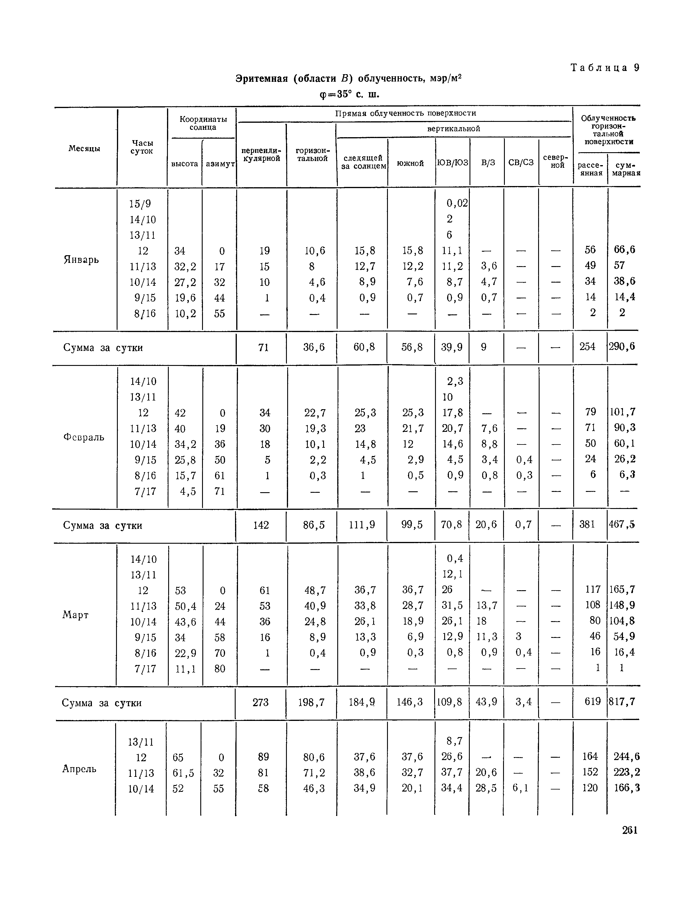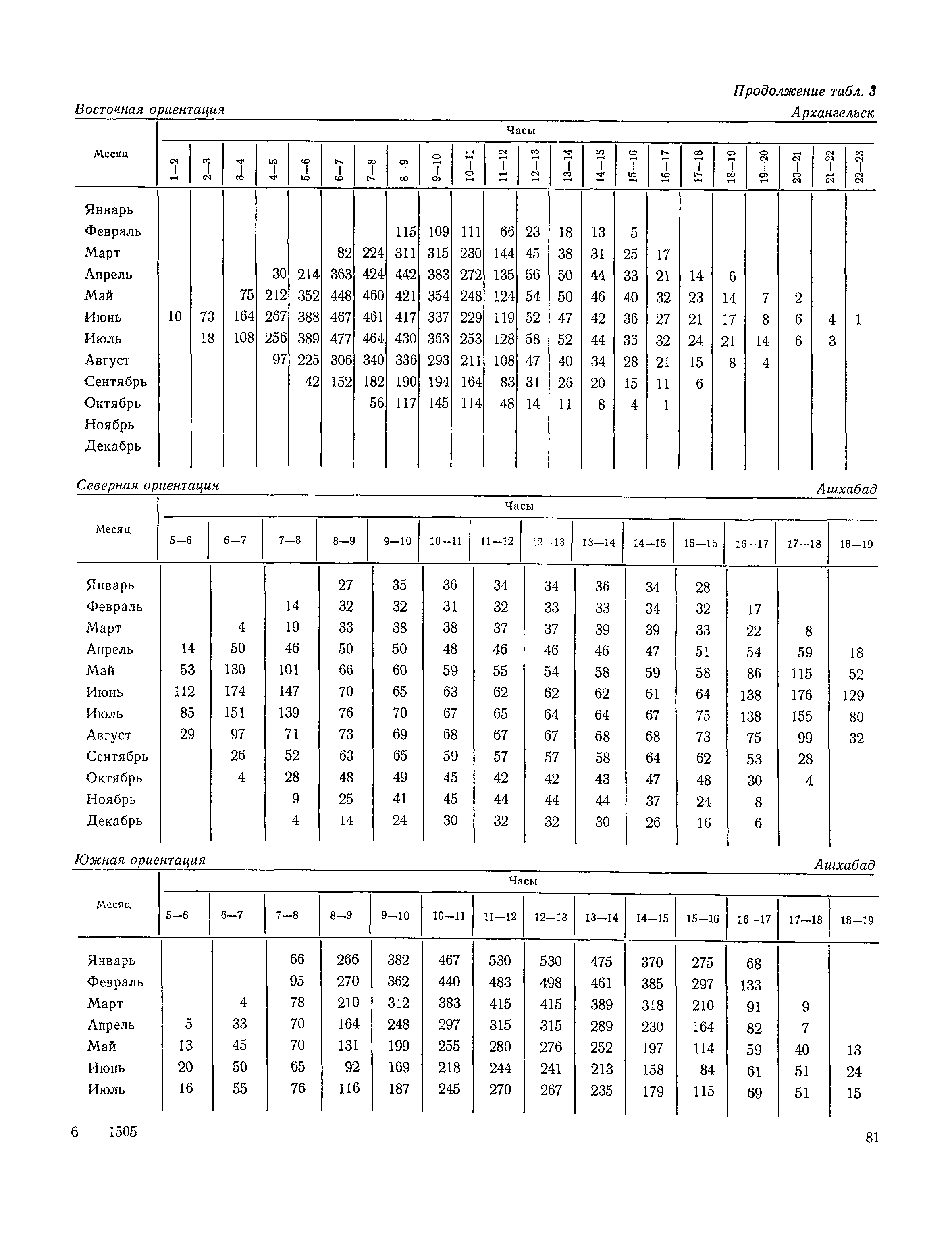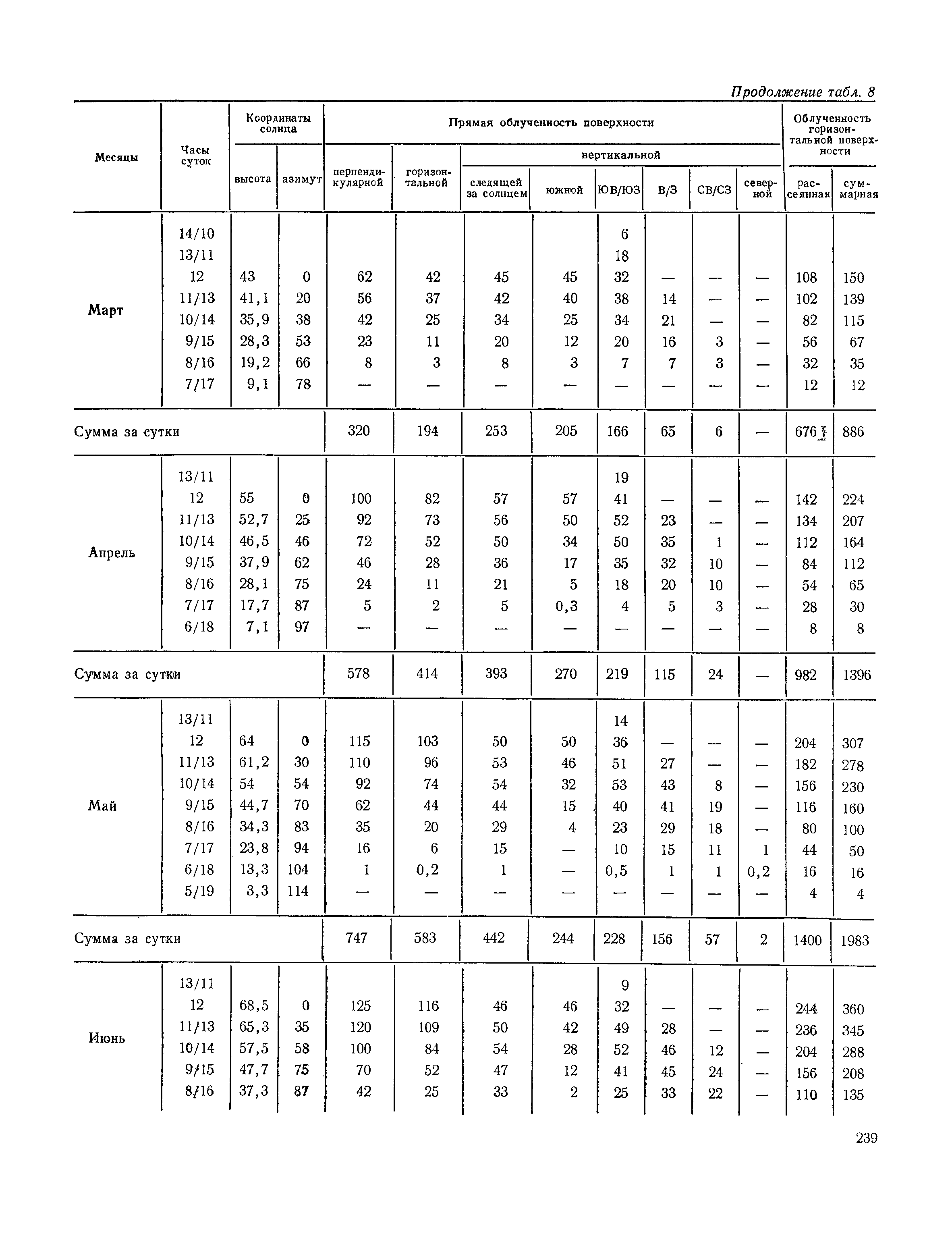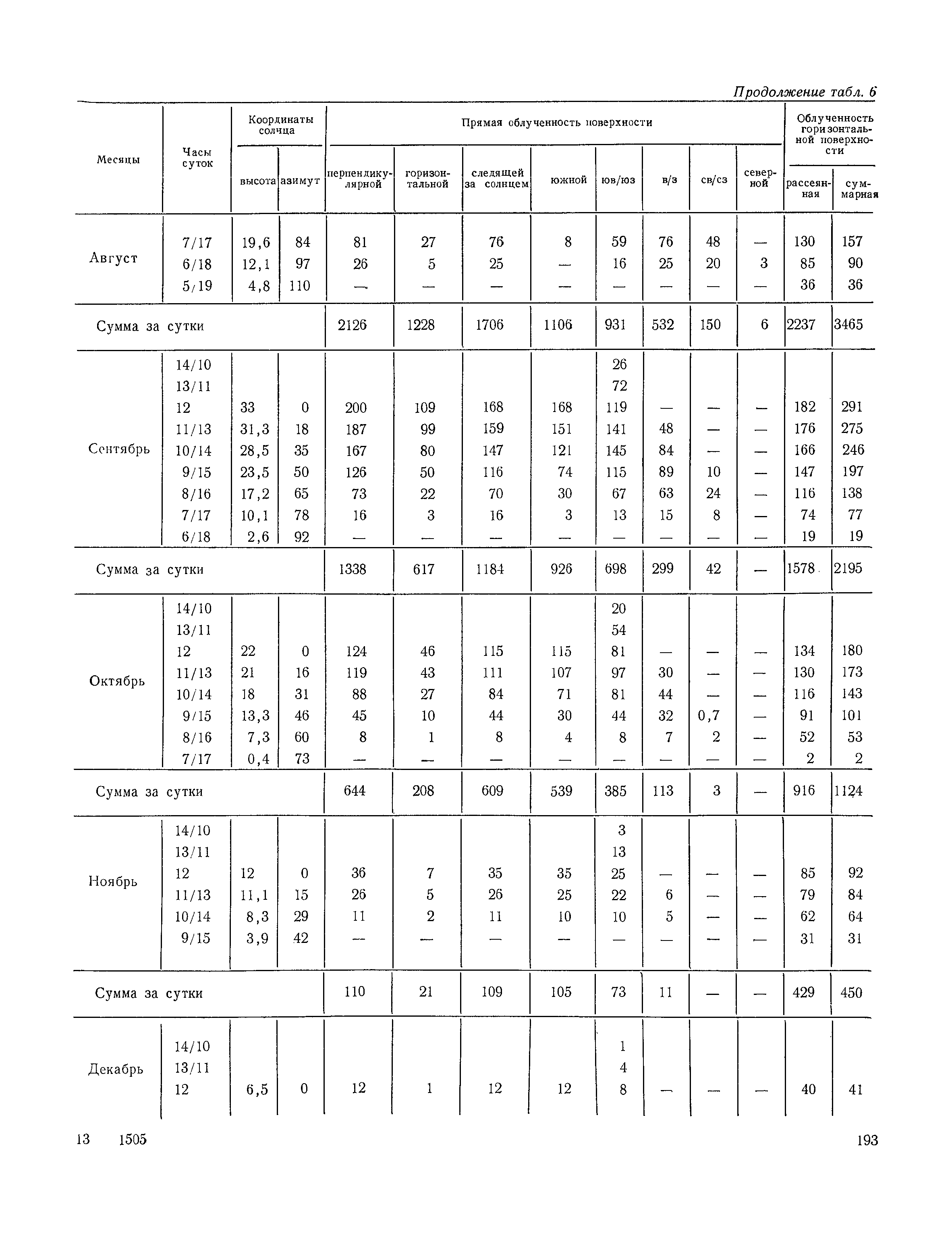 Руководство по строительной климатологии (пособие по проектированию)| Статус: | привязан к недействующему документу | | Название рус.: | Руководство по строительной климатологии (пособие по проектированию) | | Дата добавления в базу: | 01.01.2021 | | Дата актуализации: | 01.01.2021 | | Область применения: | Руководство по строительной климатологии содержит основные климатические показатели, которые могут быть использованы при разработке проектов планировки и застройки населенных мест, проектировании генеральных планов промышленных предприятий, составлении климатического паспорта городов и строительных площадок, при проектировании новых и реконструкции действующих предприятий, зданий и сооружений различного типа. Материалы Руководства используются при расчетах строительных конструкций зданий и сооружений различного назначения, при расчетах теплопотерь и теплопоступлений, a также отопления и вентиляции, при оценке режима увлажнения зданий и определении условий инсоляции и светового режима в различных климатических условиях Советского Союза. Руководство предназначено для архитекторов, инженеров строительных специальностей и научных работников | | Оглавление: | 1. Общие положения 2. Солнечная радиация А. Тепловая радиация Б. Видимая радиация В. Ультрафиолетовая радиация 3. Температура наружного воздуха 4. Атмосферные осадки, выпадающие на вертикальные поверхности ограждений 5. Скорость ветра 6. Оценка планировочных решений с учетом ветрового режима Таблица 1. Суммарная (прямая/рассеянная) радиация, поступающая на вертикальные поверхности различной ориентации при безоблачном небе в зависимости от широты и времени суток Таблица 2. Суммарная (прямая/рассеянная) радиация, поступающая на горизонтальную поверхность при безоблачном небе в зависимости от широты и времени суток Таблица 3. Суммарная солнечная радиация, поступающая на вертикальные поверхности различной ориентации при действительных условиях облачности и прозрачности атмосферы Таблица 4. Прямая, рассеянная и суммарная освещенность горизонтальных и вертикальных поверхностей в зависимости от широты и времени суток Таблица 5. Высота солнца и азимут нормали к вертикальной поверхности, отсчитанной от вертикали солнца для различных широт Таблица 6. Ультрафиолетовая (области А + В) облученность Таблица 7. Ультрафиолетовая (области В) облученность Таблица 8. Эритемная (области А + В) облученность Таблица 9. Эритемная (области В) облученность Таблица 10. Бактерицидная облученность Таблица 11. Средняя за январь температура воздуха, повторяемость, и скорость ветров различных направлений по отдельным пунктам СССР Таблица 12. Количество осадков, выпадающих под действием ветра на вертикальную поверхность наветренной ориентации по отдельным пунктам СССР Таблица 13. Средняя скорость ветра на высоте 10 м при низких температурах наружного воздуха Таблица 14. Планировочные схемы первой группы Таблица 15. Планировочные схемы второй группы | | Разработан: | НИИСФ