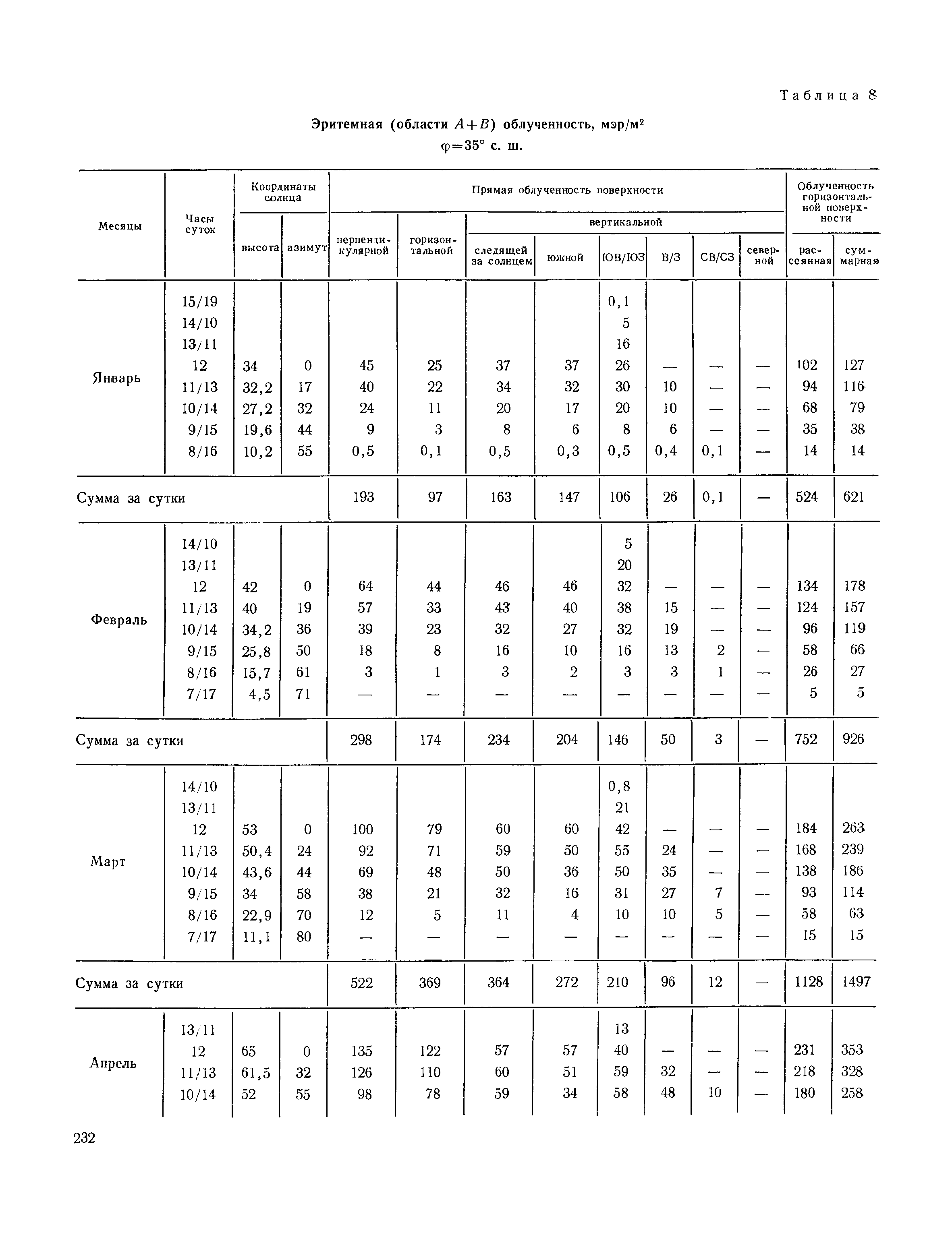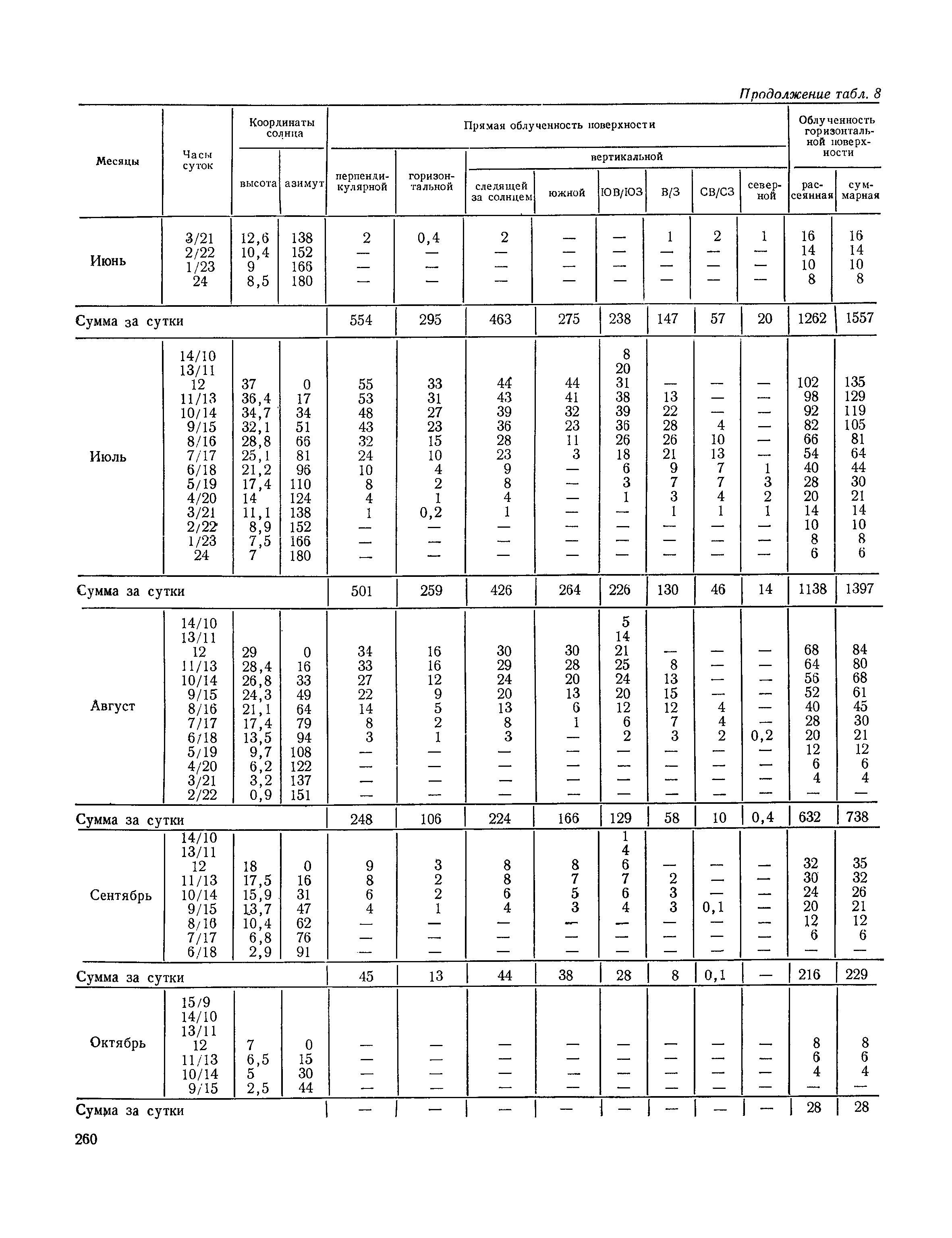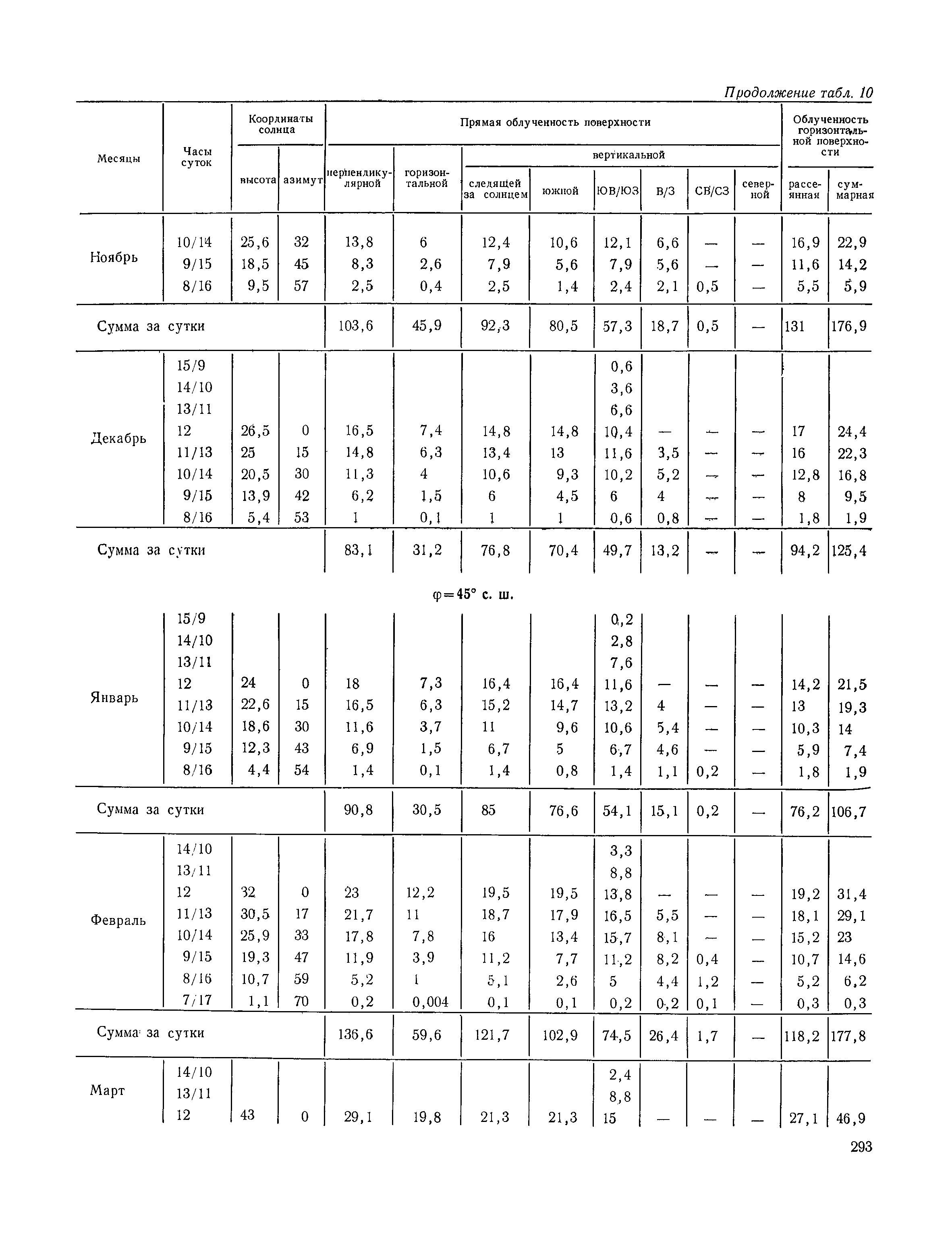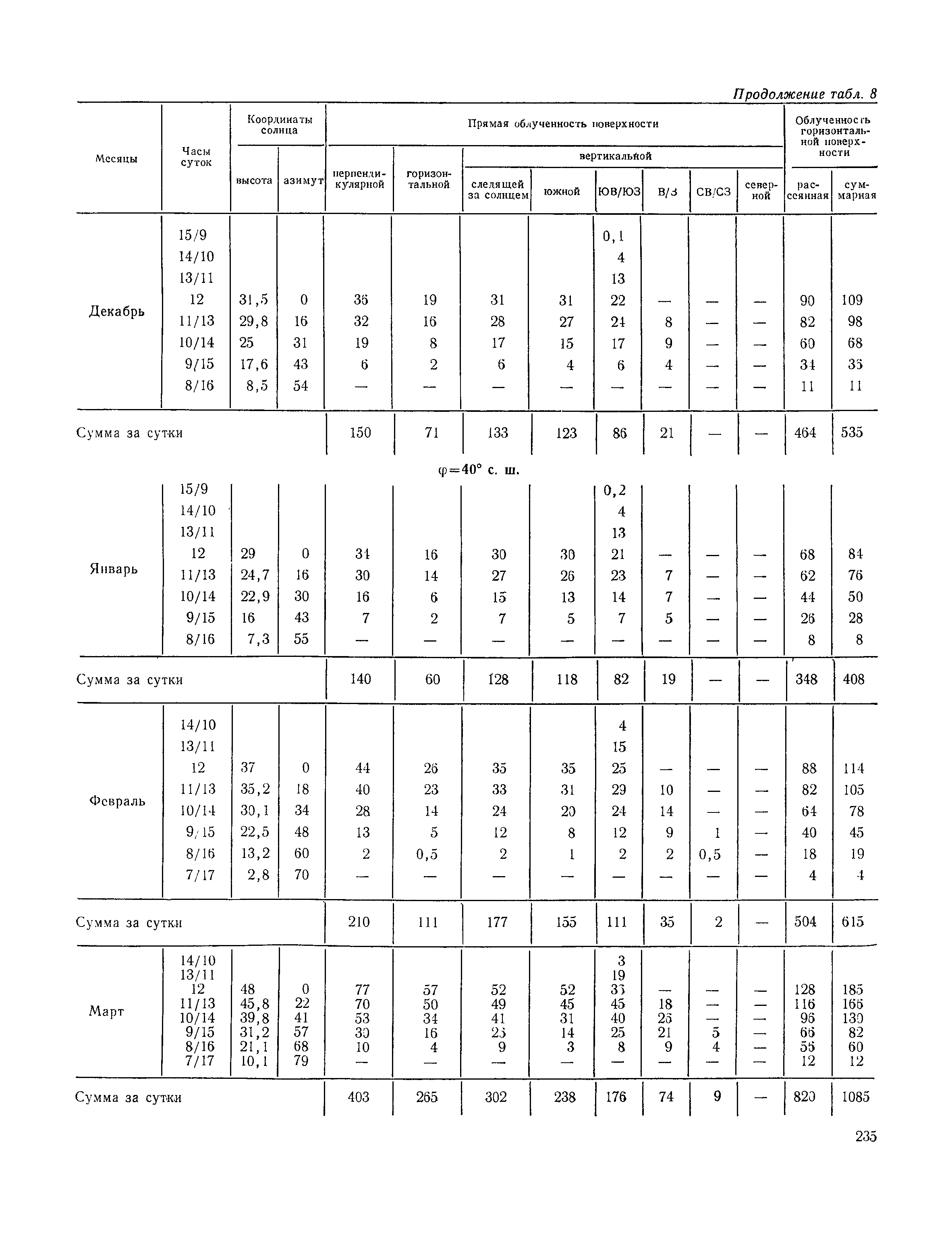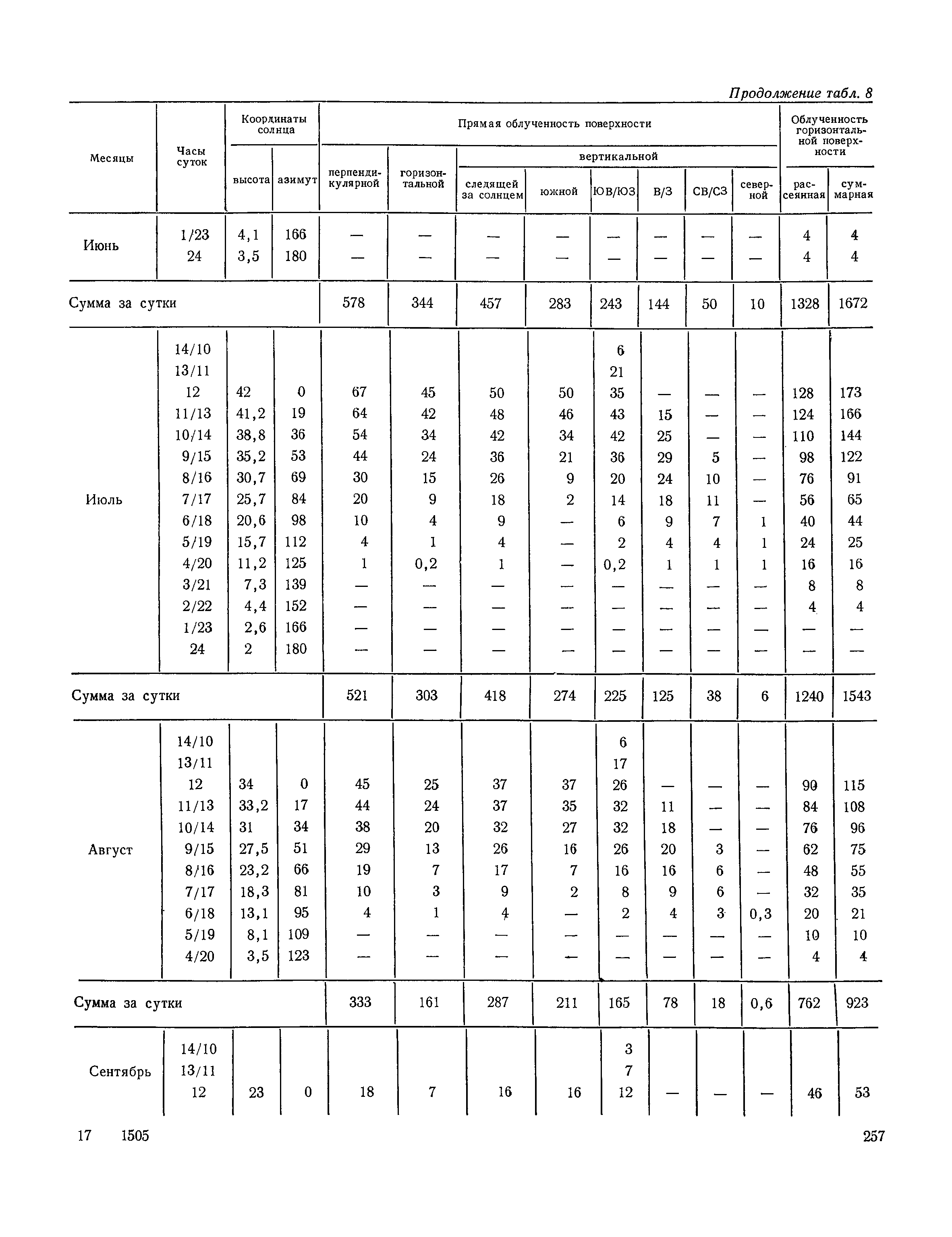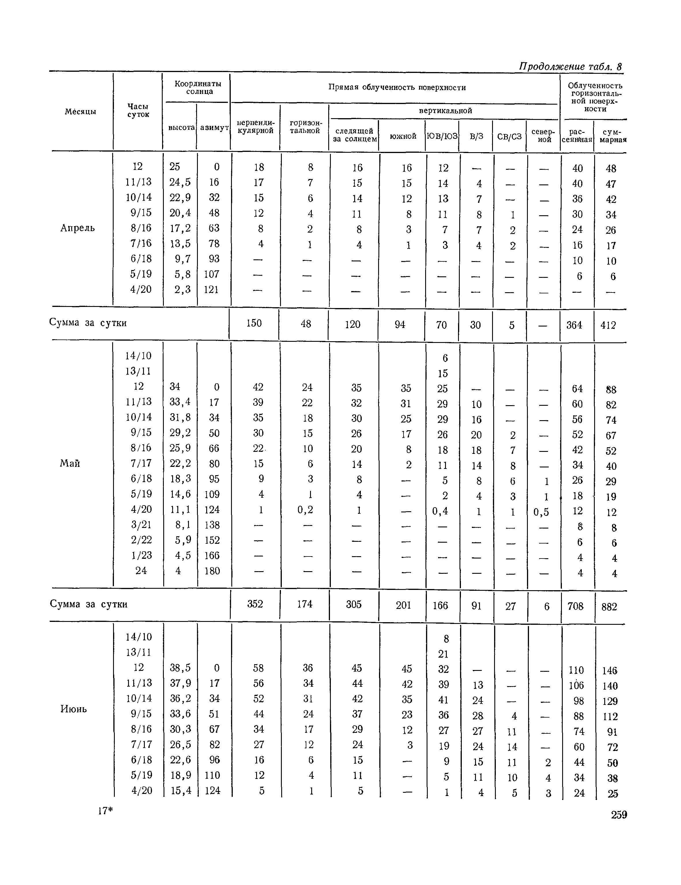 Руководство по строительной климатологии (пособие по проектированию)| Статус: | привязан к недействующему документу | | Название рус.: | Руководство по строительной климатологии (пособие по проектированию) | | Дата добавления в базу: | 01.01.2021 | | Дата актуализации: | 01.01.2021 | | Область применения: | Руководство по строительной климатологии содержит основные климатические показатели, которые могут быть использованы при разработке проектов планировки и застройки населенных мест, проектировании генеральных планов промышленных предприятий, составлении климатического паспорта городов и строительных площадок, при проектировании новых и реконструкции действующих предприятий, зданий и сооружений различного типа. Материалы Руководства используются при расчетах строительных конструкций зданий и сооружений различного назначения, при расчетах теплопотерь и теплопоступлений, a также отопления и вентиляции, при оценке режима увлажнения зданий и определении условий инсоляции и светового режима в различных климатических условиях Советского Союза. Руководство предназначено для архитекторов, инженеров строительных специальностей и научных работников | | Оглавление: | 1. Общие положения 2. Солнечная радиация А. Тепловая радиация Б. Видимая радиация В. Ультрафиолетовая радиация 3. Температура наружного воздуха 4. Атмосферные осадки, выпадающие на вертикальные поверхности ограждений 5. Скорость ветра 6. Оценка планировочных решений с учетом ветрового режима Таблица 1. Суммарная (прямая/рассеянная) радиация, поступающая на вертикальные поверхности различной ориентации при безоблачном небе в зависимости от широты и времени суток Таблица 2. Суммарная (прямая/рассеянная) радиация, поступающая на горизонтальную поверхность при безоблачном небе в зависимости от широты и времени суток Таблица 3. Суммарная солнечная радиация, поступающая на вертикальные поверхности различной ориентации при действительных условиях облачности и прозрачности атмосферы Таблица 4. Прямая, рассеянная и суммарная освещенность горизонтальных и вертикальных поверхностей в зависимости от широты и времени суток Таблица 5. Высота солнца и азимут нормали к вертикальной поверхности, отсчитанной от вертикали солнца для различных широт Таблица 6. Ультрафиолетовая (области А + В) облученность Таблица 7. Ультрафиолетовая (области В) облученность Таблица 8. Эритемная (области А + В) облученность Таблица 9. Эритемная (области В) облученность Таблица 10. Бактерицидная облученность Таблица 11. Средняя за январь температура воздуха, повторяемость, и скорость ветров различных направлений по отдельным пунктам СССР Таблица 12. Количество осадков, выпадающих под действием ветра на вертикальную поверхность наветренной ориентации по отдельным пунктам СССР Таблица 13. Средняя скорость ветра на высоте 10 м при низких температурах наружного воздуха Таблица 14. Планировочные схемы первой группы Таблица 15. Планировочные схемы второй группы | | Разработан: | НИИСФ