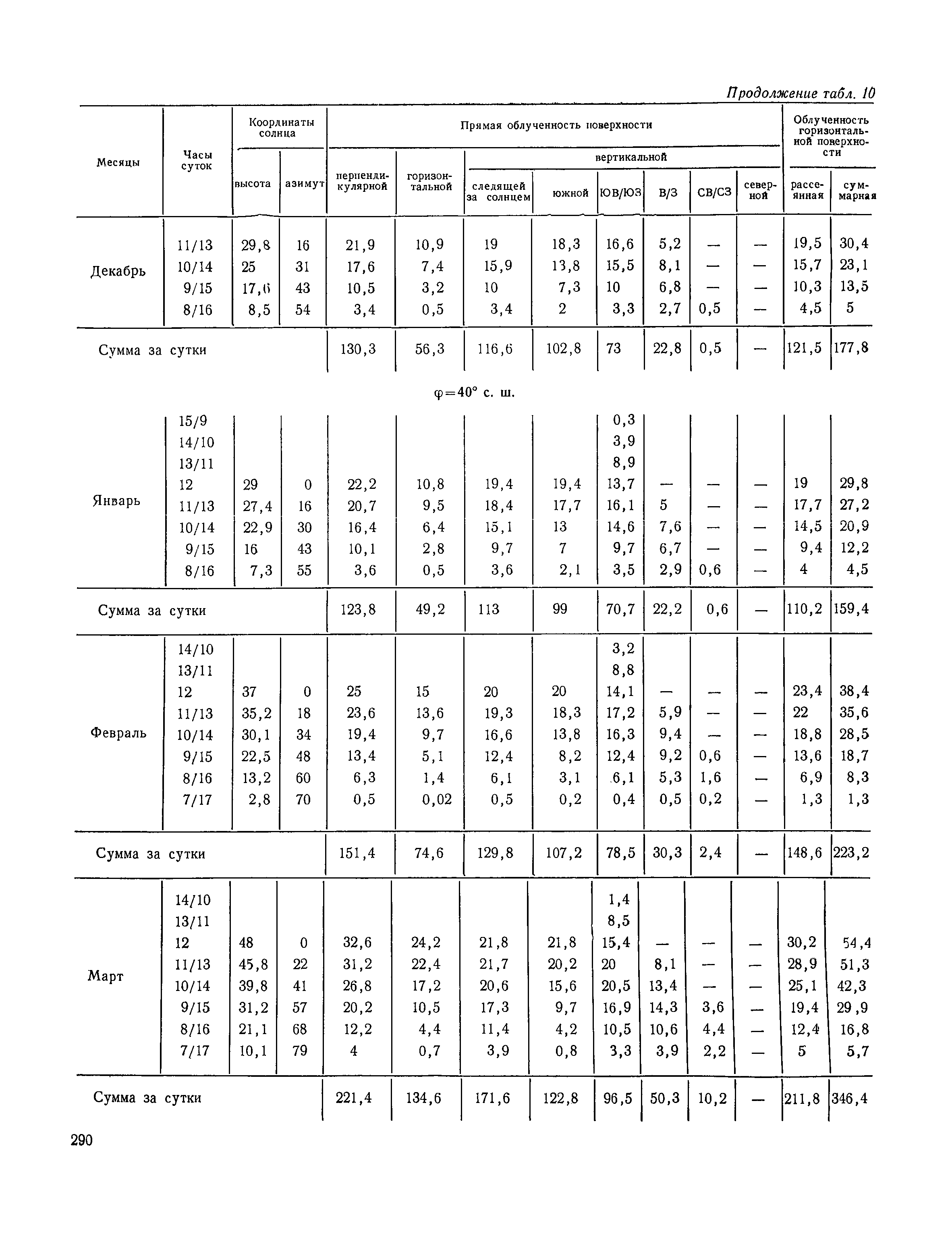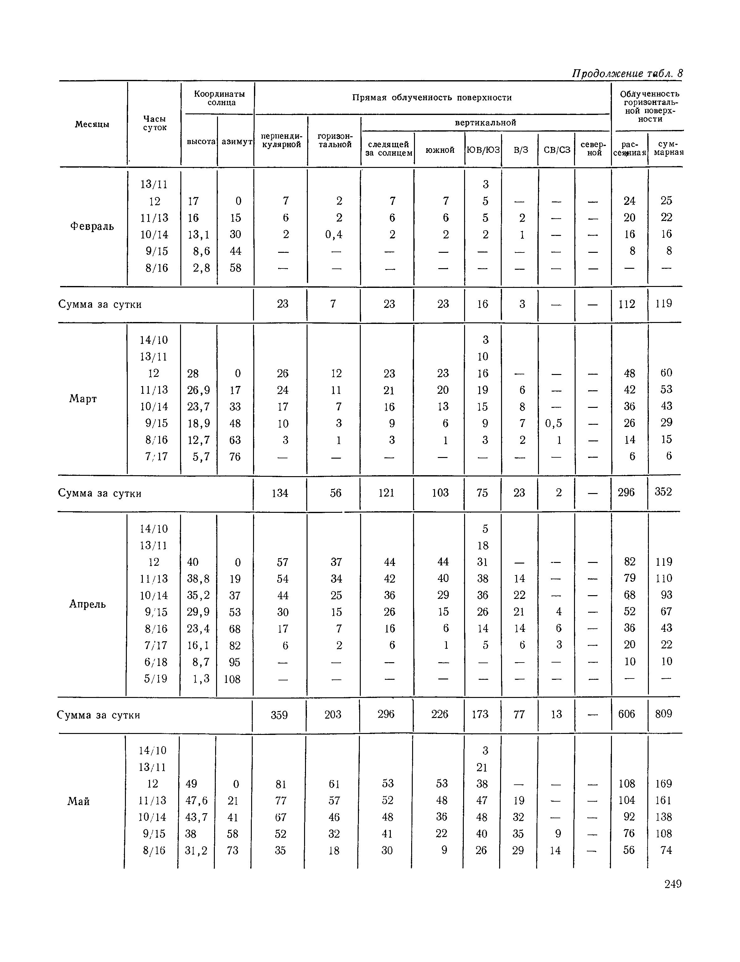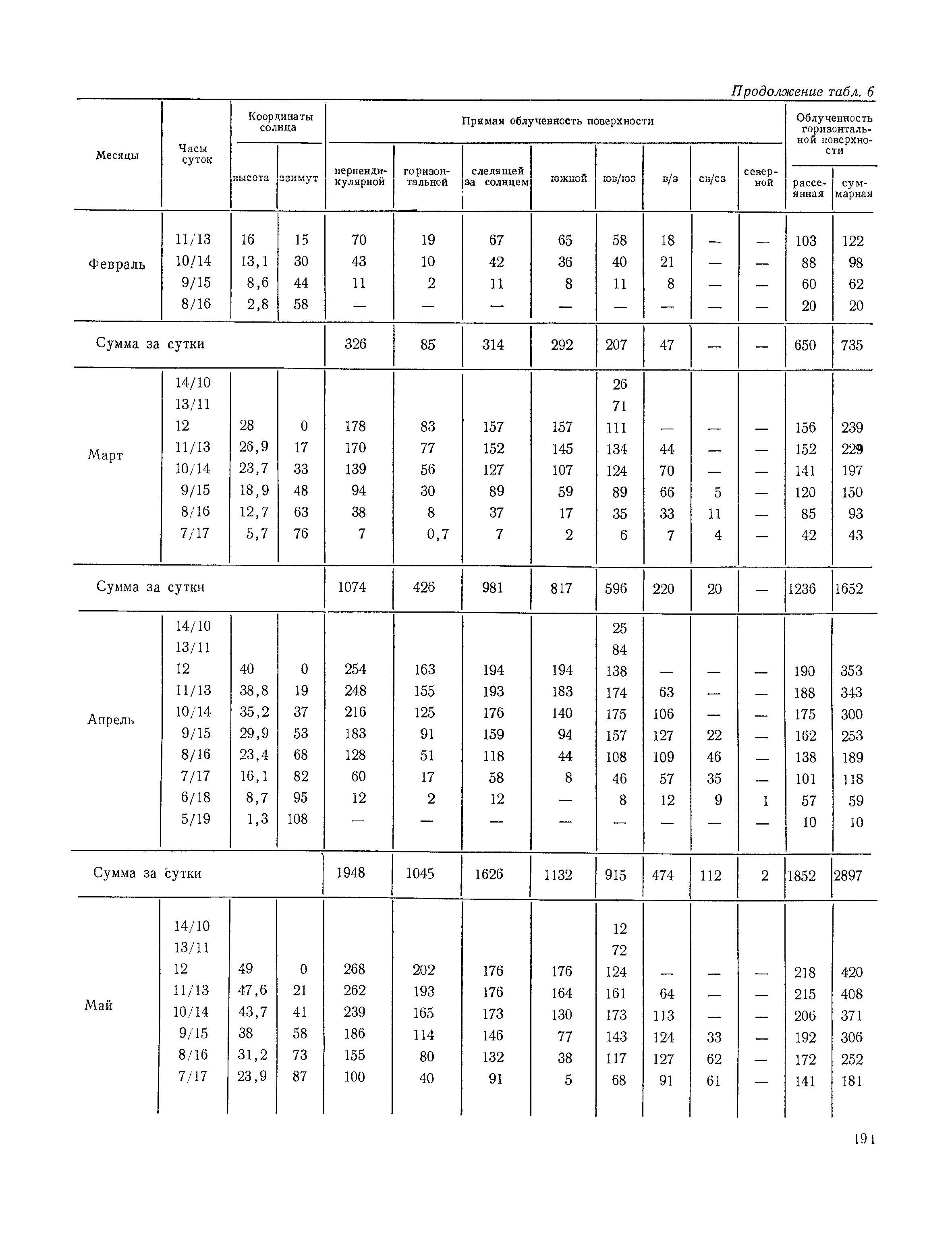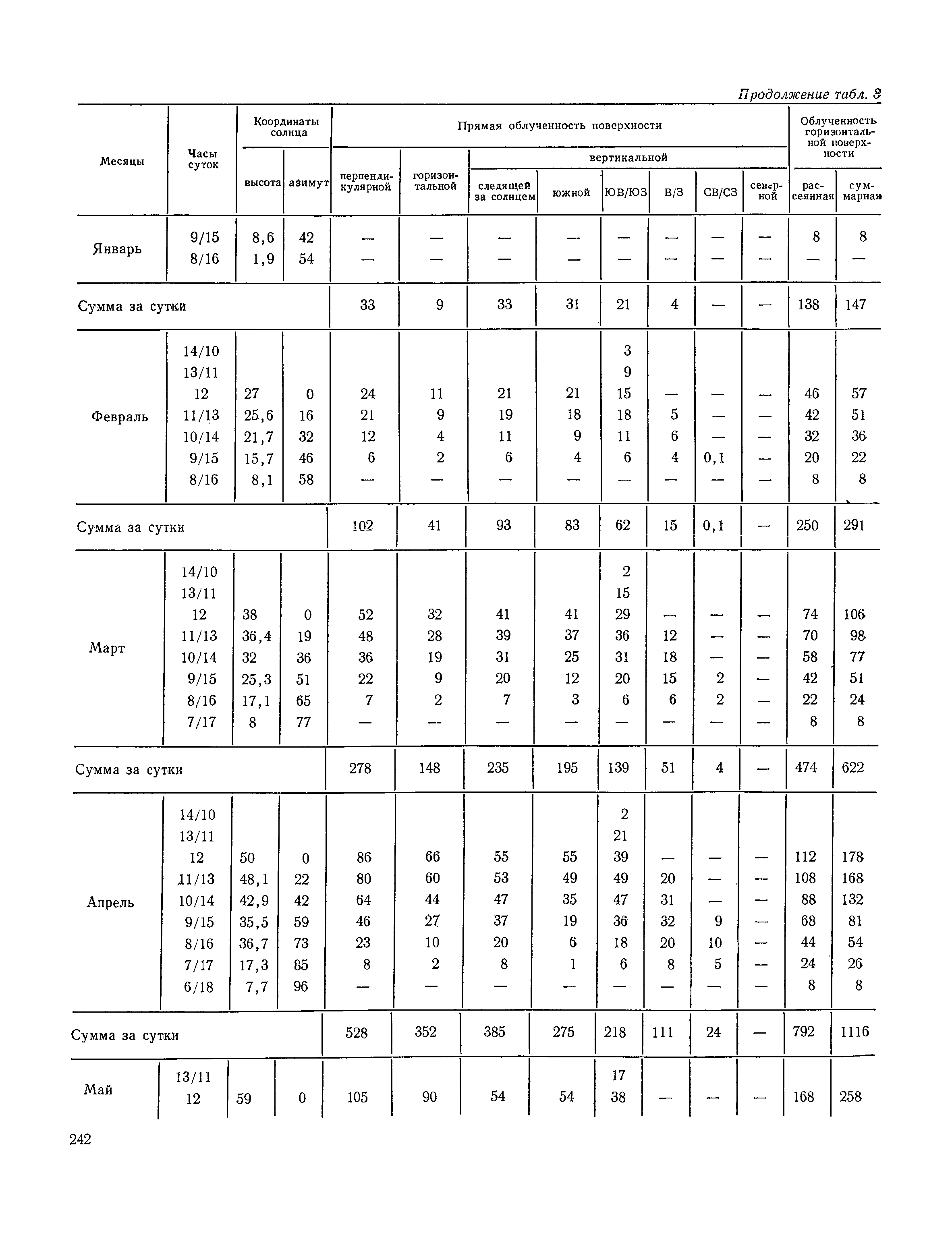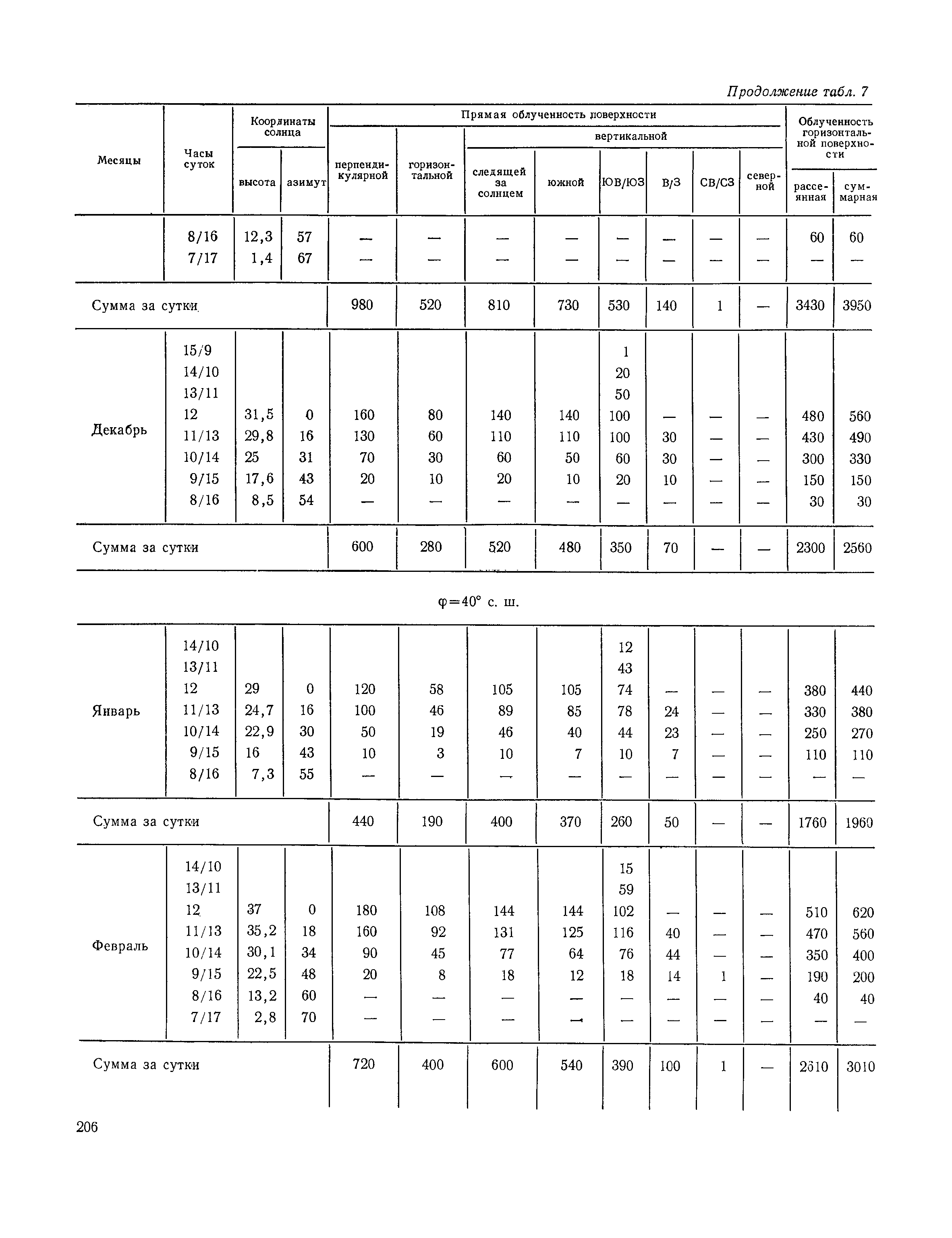 Руководство по строительной климатологии (пособие по проектированию)| Статус: | привязан к недействующему документу | | Название рус.: | Руководство по строительной климатологии (пособие по проектированию) | | Дата добавления в базу: | 01.01.2021 | | Дата актуализации: | 01.01.2021 | | Область применения: | Руководство по строительной климатологии содержит основные климатические показатели, которые могут быть использованы при разработке проектов планировки и застройки населенных мест, проектировании генеральных планов промышленных предприятий, составлении климатического паспорта городов и строительных площадок, при проектировании новых и реконструкции действующих предприятий, зданий и сооружений различного типа. Материалы Руководства используются при расчетах строительных конструкций зданий и сооружений различного назначения, при расчетах теплопотерь и теплопоступлений, a также отопления и вентиляции, при оценке режима увлажнения зданий и определении условий инсоляции и светового режима в различных климатических условиях Советского Союза. Руководство предназначено для архитекторов, инженеров строительных специальностей и научных работников | | Оглавление: | 1. Общие положения 2. Солнечная радиация А. Тепловая радиация Б. Видимая радиация В. Ультрафиолетовая радиация 3. Температура наружного воздуха 4. Атмосферные осадки, выпадающие на вертикальные поверхности ограждений 5. Скорость ветра 6. Оценка планировочных решений с учетом ветрового режима Таблица 1. Суммарная (прямая/рассеянная) радиация, поступающая на вертикальные поверхности различной ориентации при безоблачном небе в зависимости от широты и времени суток Таблица 2. Суммарная (прямая/рассеянная) радиация, поступающая на горизонтальную поверхность при безоблачном небе в зависимости от широты и времени суток Таблица 3. Суммарная солнечная радиация, поступающая на вертикальные поверхности различной ориентации при действительных условиях облачности и прозрачности атмосферы Таблица 4. Прямая, рассеянная и суммарная освещенность горизонтальных и вертикальных поверхностей в зависимости от широты и времени суток Таблица 5. Высота солнца и азимут нормали к вертикальной поверхности, отсчитанной от вертикали солнца для различных широт Таблица 6. Ультрафиолетовая (области А + В) облученность Таблица 7. Ультрафиолетовая (области В) облученность Таблица 8. Эритемная (области А + В) облученность Таблица 9. Эритемная (области В) облученность Таблица 10. Бактерицидная облученность Таблица 11. Средняя за январь температура воздуха, повторяемость, и скорость ветров различных направлений по отдельным пунктам СССР Таблица 12. Количество осадков, выпадающих под действием ветра на вертикальную поверхность наветренной ориентации по отдельным пунктам СССР Таблица 13. Средняя скорость ветра на высоте 10 м при низких температурах наружного воздуха Таблица 14. Планировочные схемы первой группы Таблица 15. Планировочные схемы второй группы | | Разработан: | НИИСФ