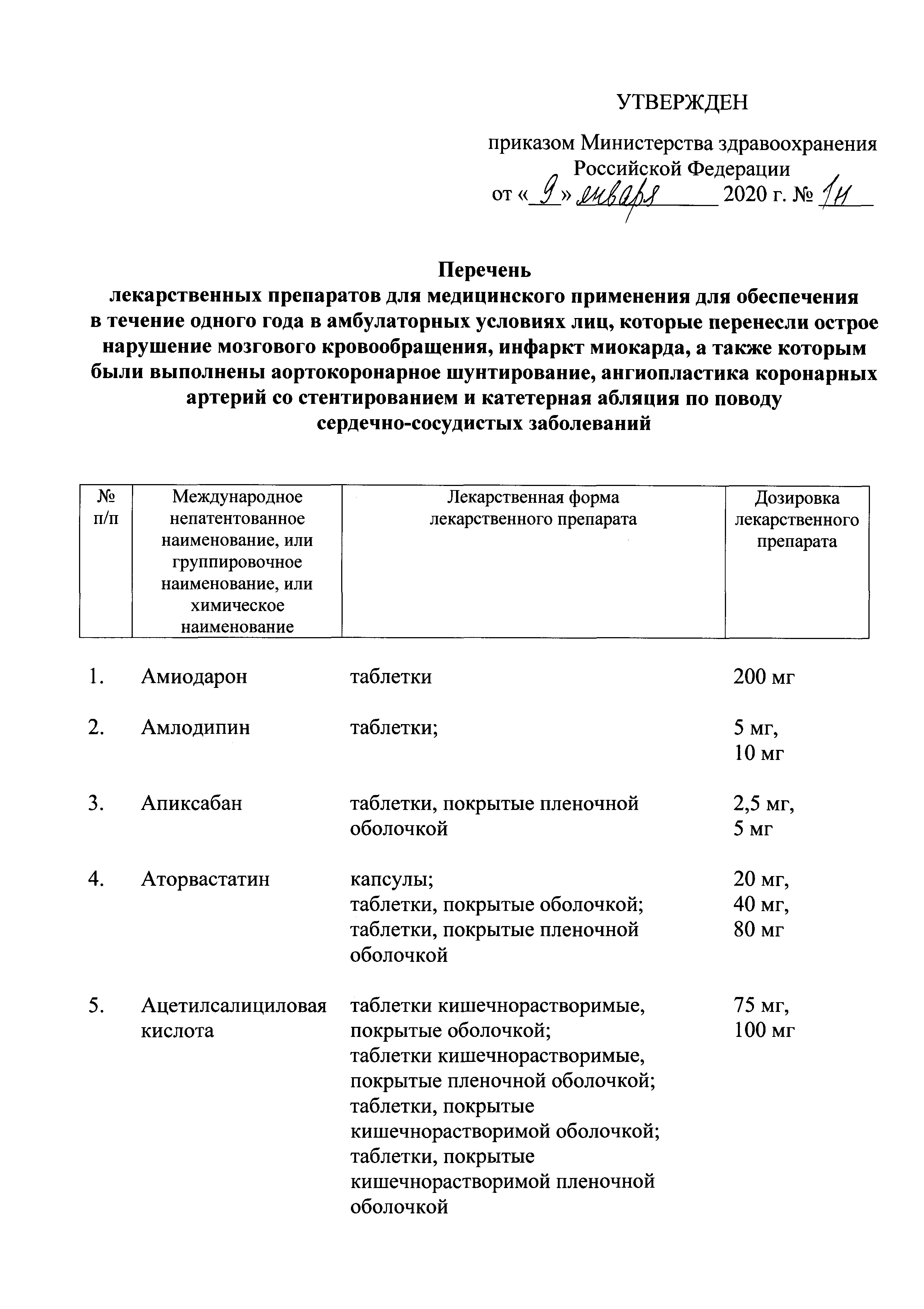 Перечень лекарственных препаратов для медицинского применения для обеспечения в течение одного года в амбулаторных условиях лиц, которые перенесли острое нарушение мозгового кровообращения, инфаркт миокарда, а также которым были выполнены аортокоронарное шунтирование, ангиопластика коронарных артерий со стентированием и катетерная абляция по поводу сердечно-сосудистых заболеваний| Статус: | действует | | Название рус.: | Перечень лекарственных препаратов для медицинского применения для обеспечения в течение одного года в амбулаторных условиях лиц, которые перенесли острое нарушение мозгового кровообращения, инфаркт миокарда, а также которым были выполнены аортокоронарное шунтирование, ангиопластика коронарных артерий со стентированием и катетерная абляция по поводу сердечно-сосудистых заболеваний | | Дата добавления в базу: | 01.01.2021 | | Дата актуализации: | 01.01.2021 | | Дата введения: | 07.02.2020 | | Утверждён: | 09.01.2020 Министерство здравоохранения Российской Федерации (1н)