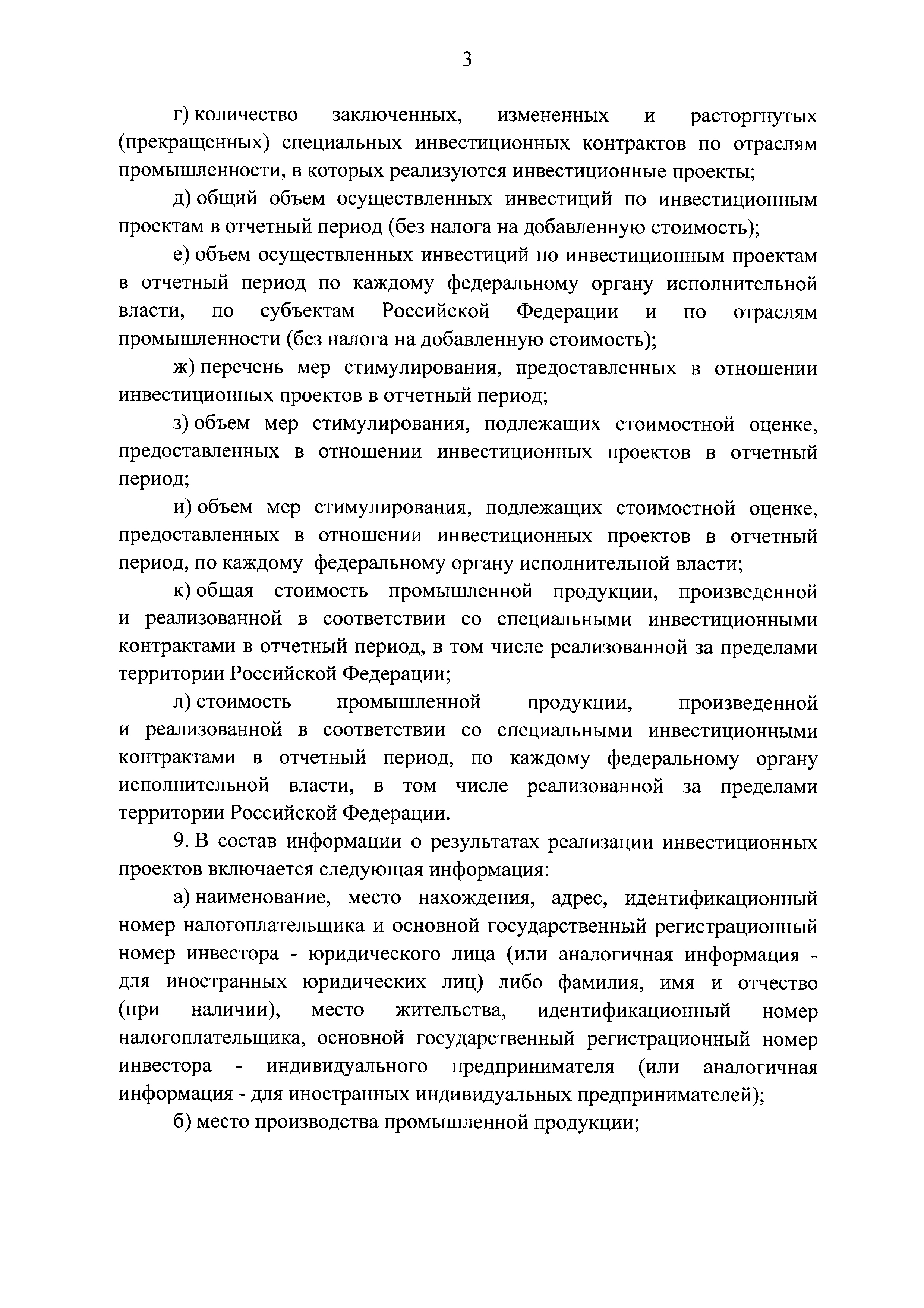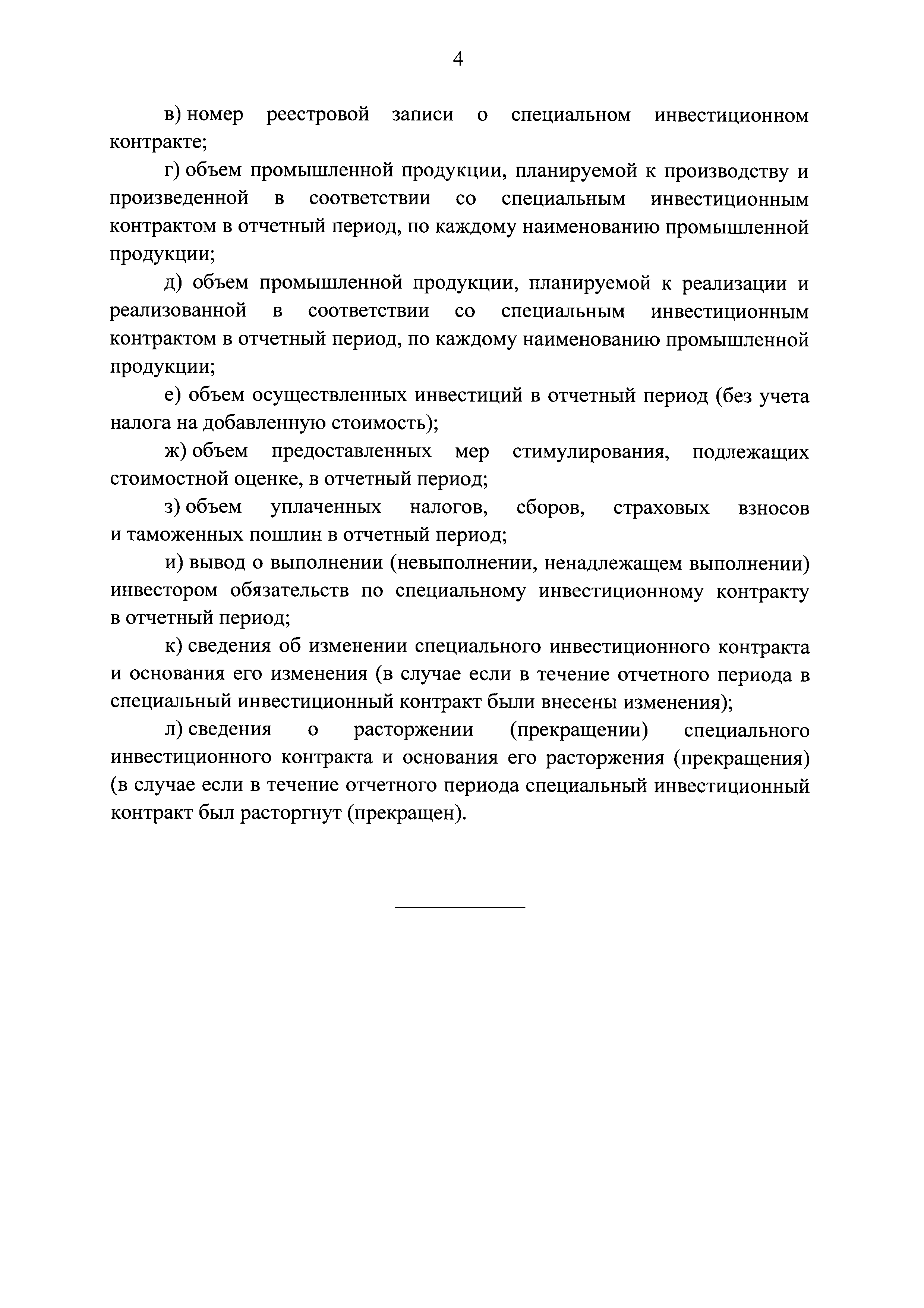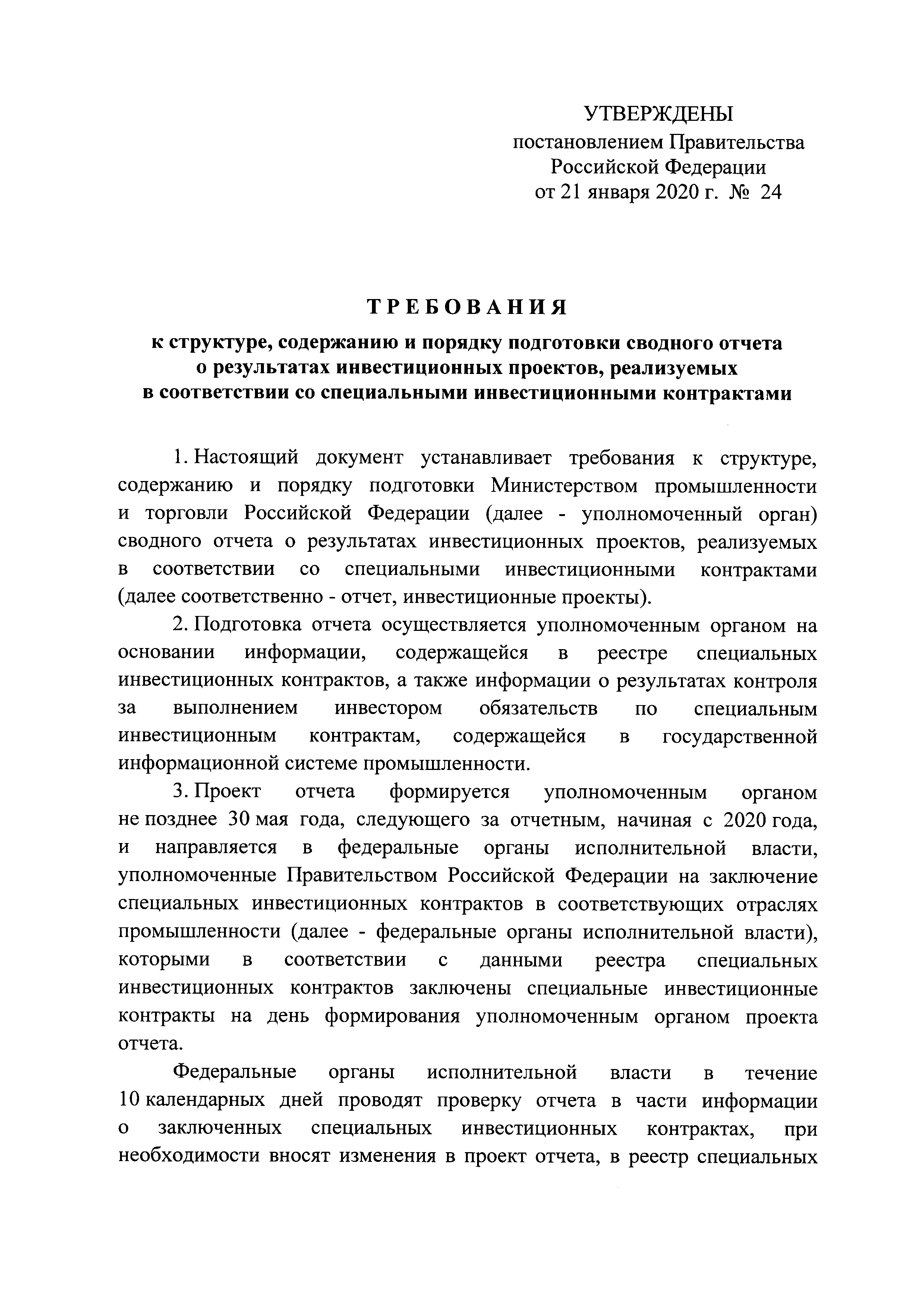 Требования к структуре, содержанию и порядку подготовки сводного отчета о результатах инвестиционных проектов, реализуемых в соответствии со специальными инвестиционными контрактами| Статус: | действует | | Название рус.: | Требования к структуре, содержанию и порядку подготовки сводного отчета о результатах инвестиционных проектов, реализуемых в соответствии со специальными инвестиционными контрактами | | Дата добавления в базу: | 01.01.2021 | | Дата актуализации: | 01.01.2021 | | Дата введения: | 01.02.2020 | | Область применения: | Документ устанавливает требования к структуре, содержанию и порядку подготовки Министерством промышленности и торговли Российской Федерации сводного отчета о результатах инвестиционных проектов, реализуемых в соответствии со специальными инвестиционными контрактами | | Утверждён: | 21.01.2020 Правительство Российской Федерации (24)