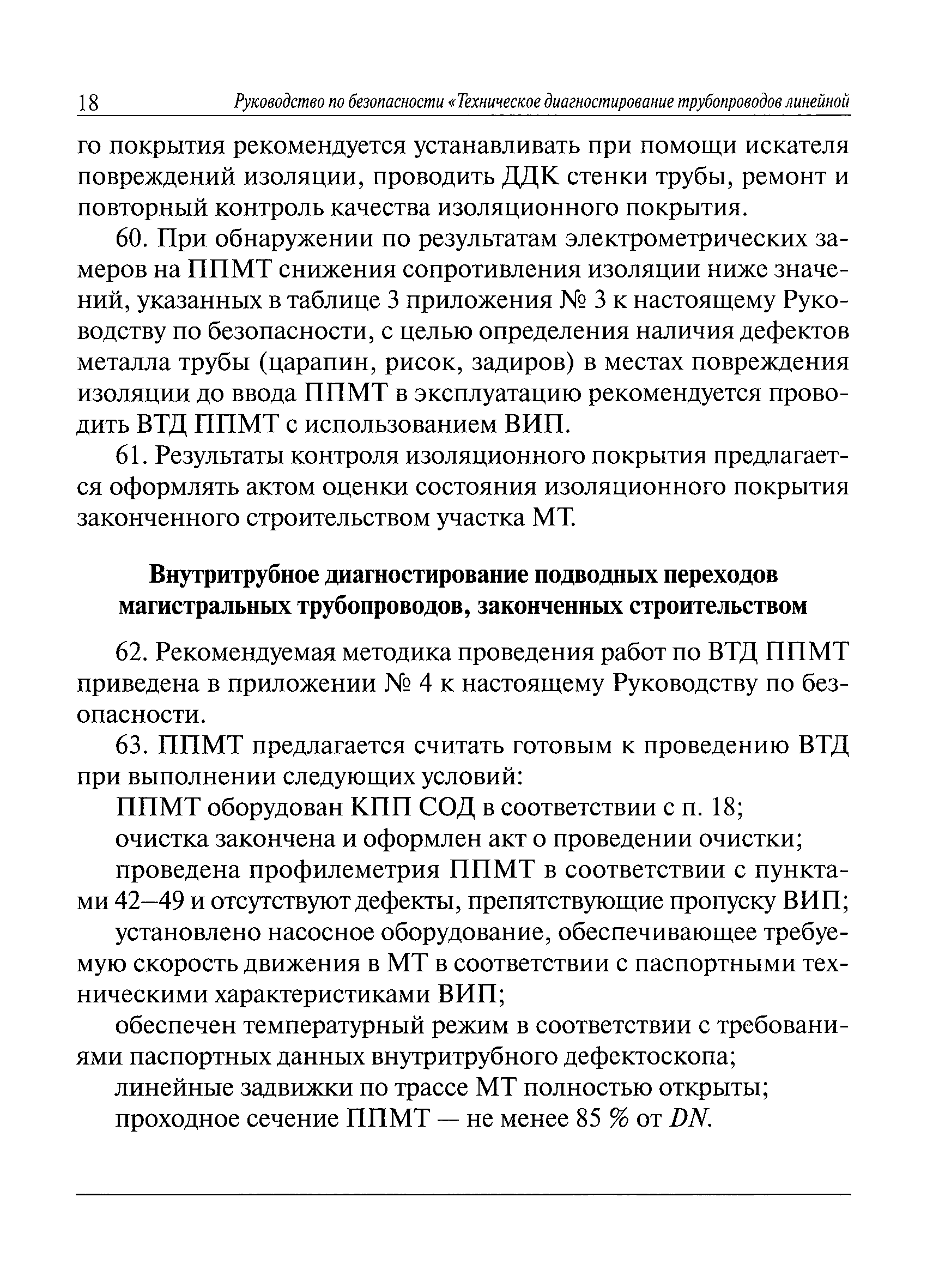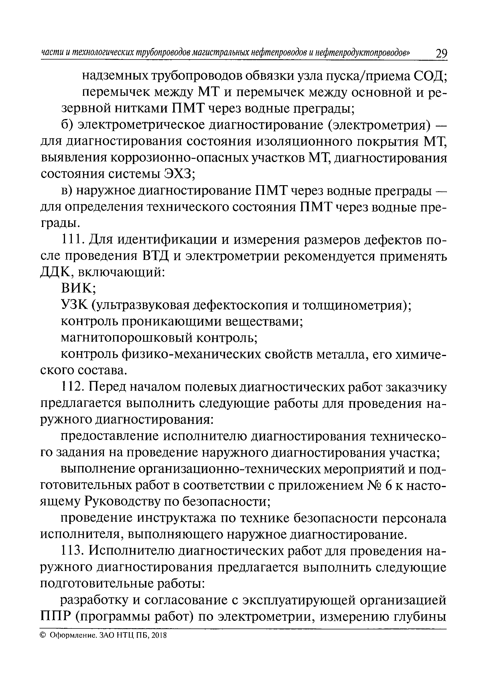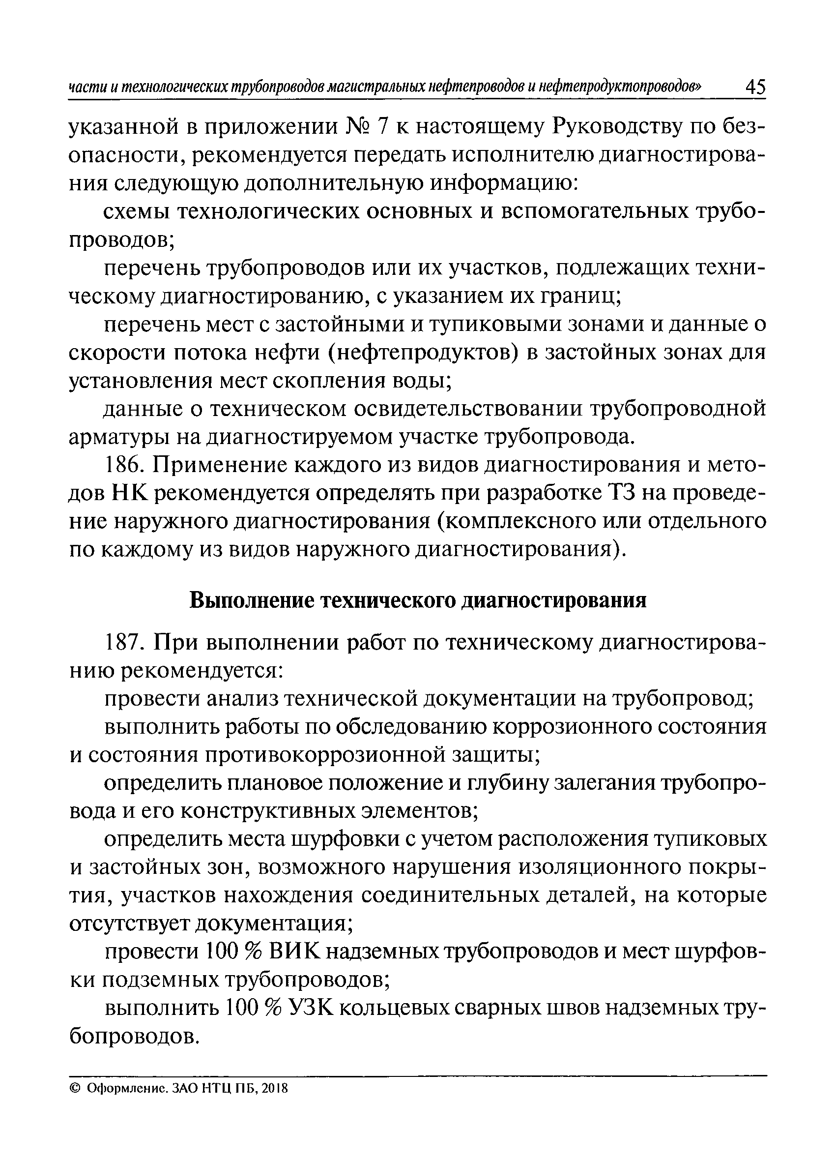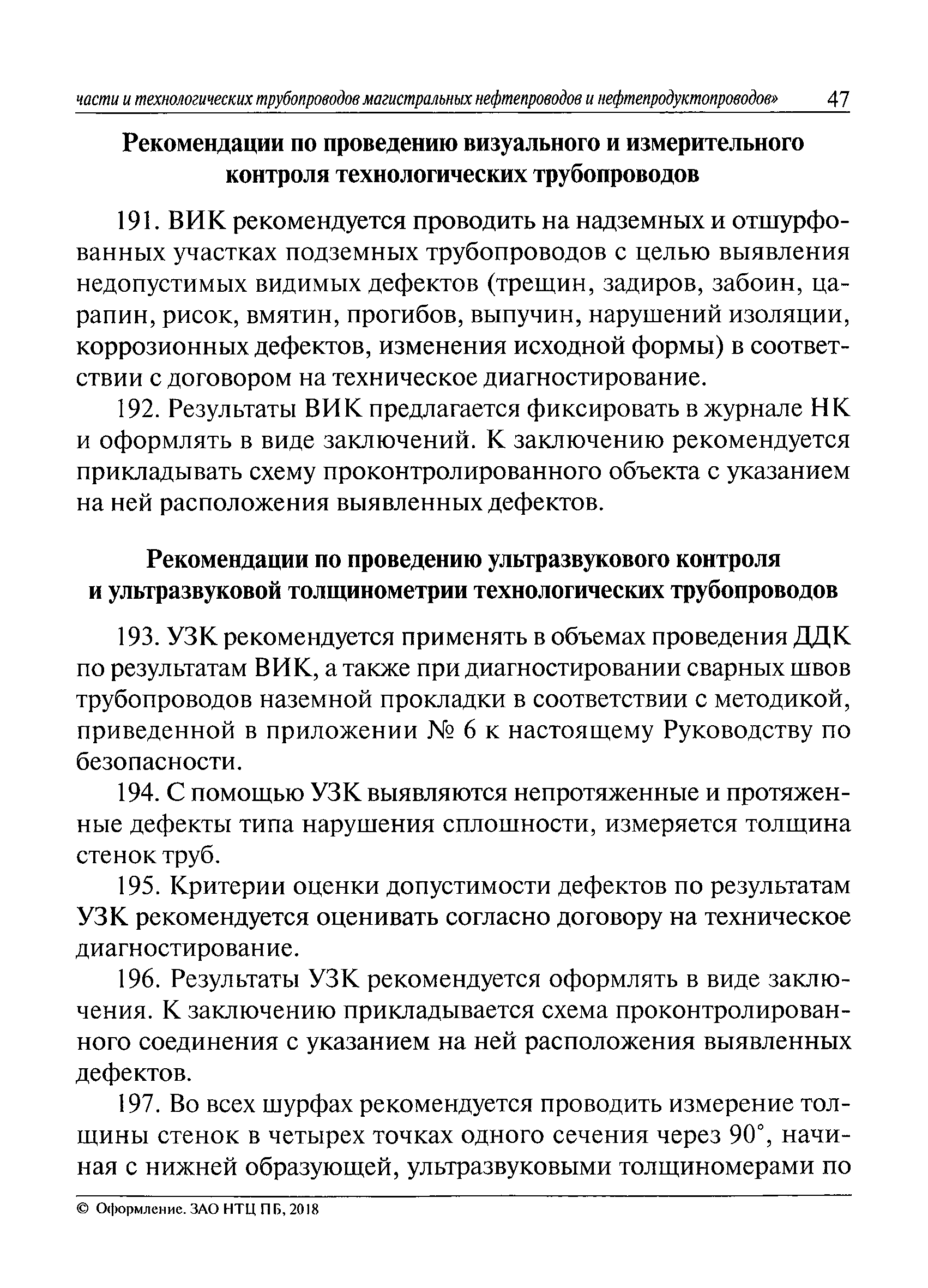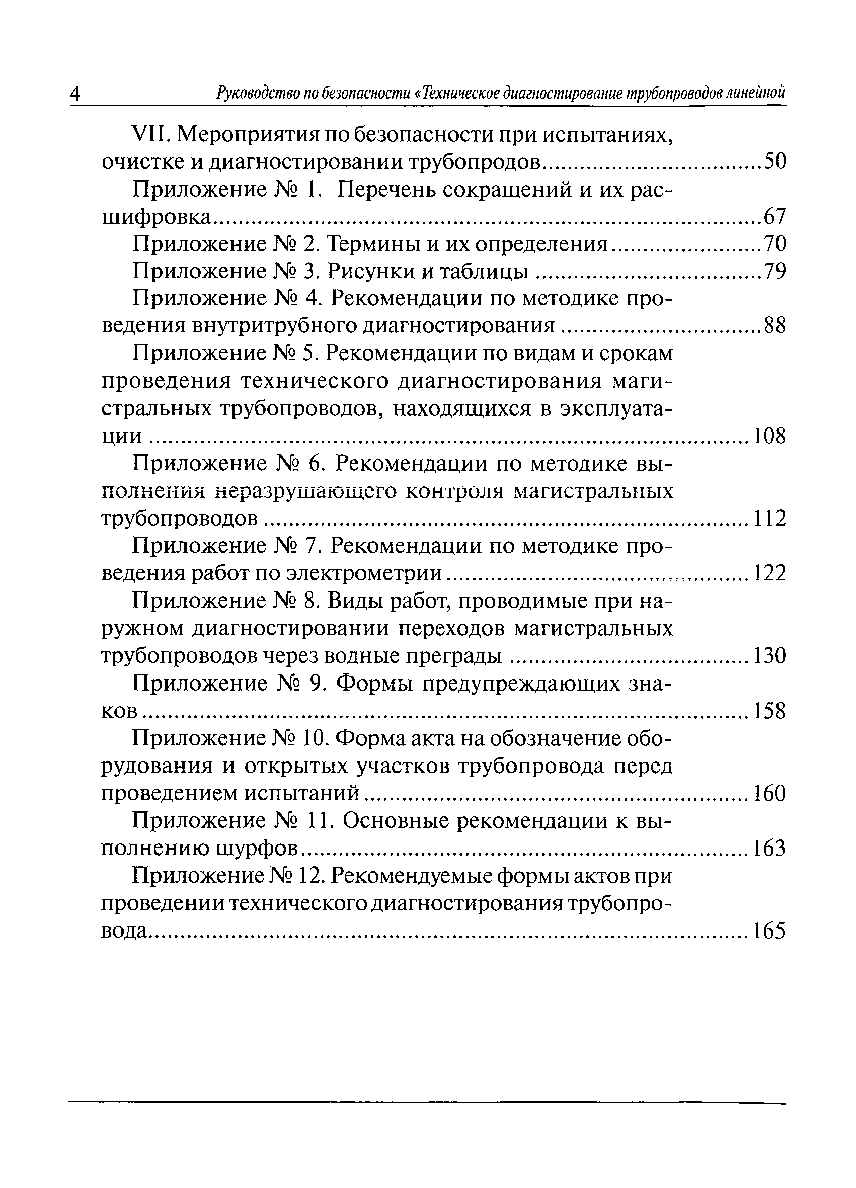 | Оглавление: | I Общие положения II Виды технического диагностирования III Техническое диагностирование линейной части магистральных трубопроводов, законченных строительством. Виды технического диагностирования, выполняемые на трубопроводах, законченных строительством IV Техническое диагностирование линейной части магистральных трубопроводов, находящихся в эксплуатации. Виды технического диагностирования, выполняемые на магистральных трубопроводах, находящихся в эксплуатации V Техническое диагностирование трубопроводов, находящихся в консервации. Виды технического диагностирования, применяемые на трубопроводах, находящихся в консервации, и сроки их проведения VI Техническое диагностирование технологических трубопроводов. Классификация технологических трубопроводов VII Мероприятия по безопасности при испытаниях, очистке и диагностировании трубопровод Приложение 1. Перечень сокращений и их расшифровка Приложение 2. Термины и их определения Приложение 3. Рисунки и таблицы Приложение 4. Рекомендации по методике проведения внутритрубного диагностирования Приложение 5. Рекомендации по видам и срокам проведения технического диагностирования магистральных трубопроводов, находящихся в эксплуатации Приложение 6. Рекомендации по методике выполнения неразрушающего контроля магистральных трубопроводов Приложение 7. Рекомендации по методике проведения работ по электрометрии Приложение 8. Виды работ, проводимые при наружном диагностировании переходов магистральных трубопроводов через водные преграды Приложение 9. Формы предупреждающих знаков Приложение 10. Форма акта на обозначение оборудования и открытых участков трубопровода перед проведением испытаний Приложение 11. Основные рекомендации к выполнению шурфов Приложение 12. Рекомендуемые формы актов при проведении технического диагностирования трубопровода |