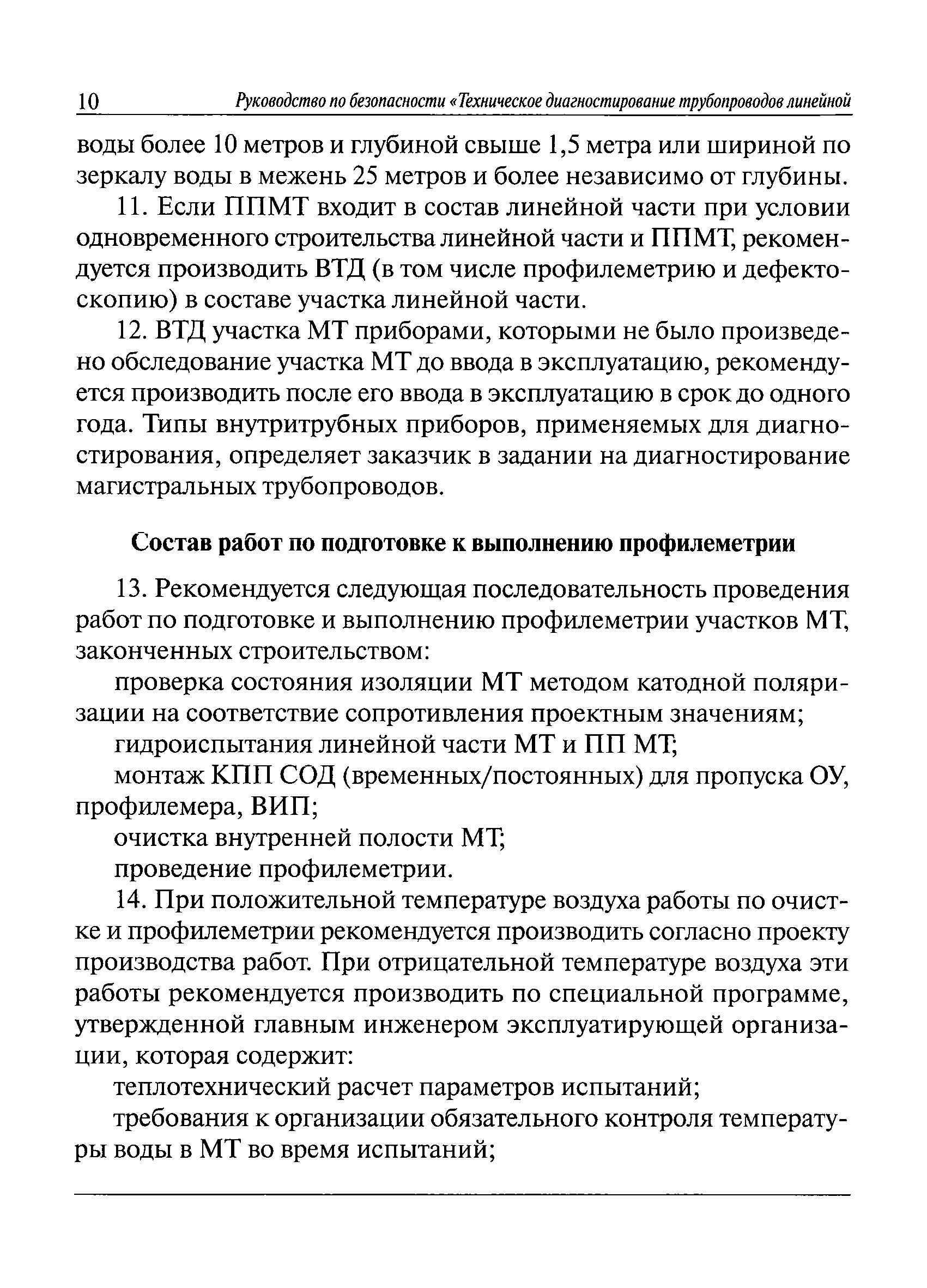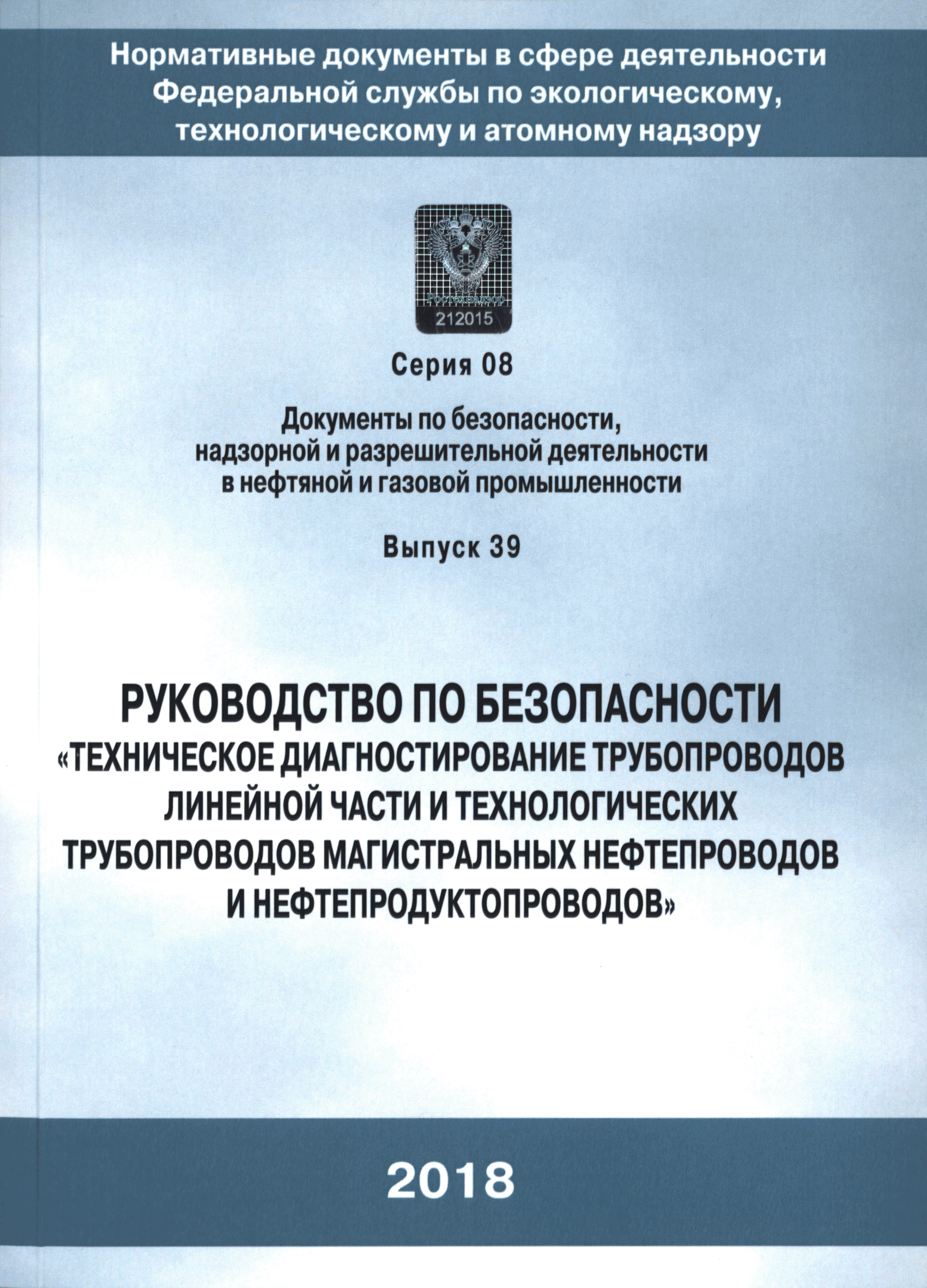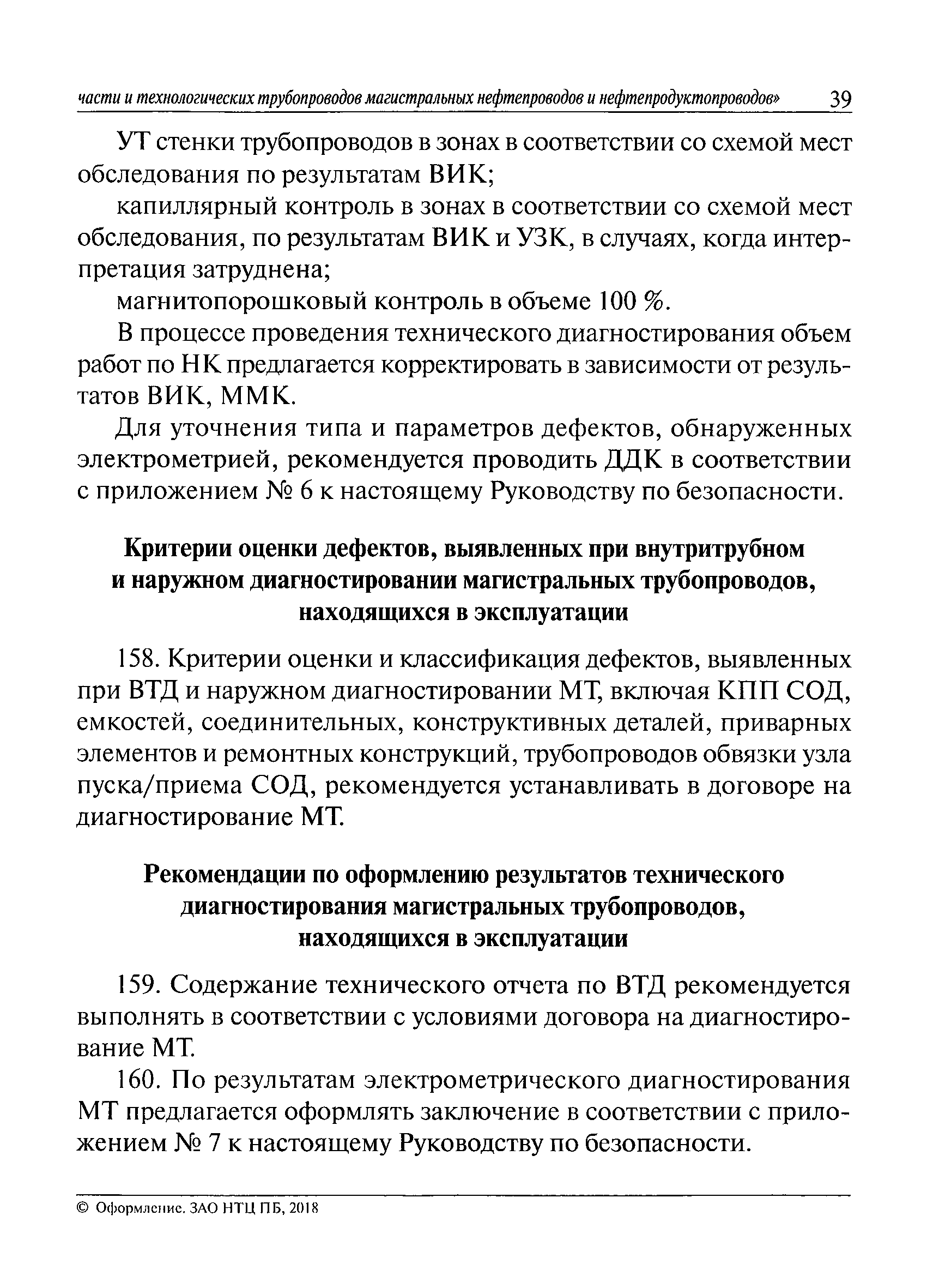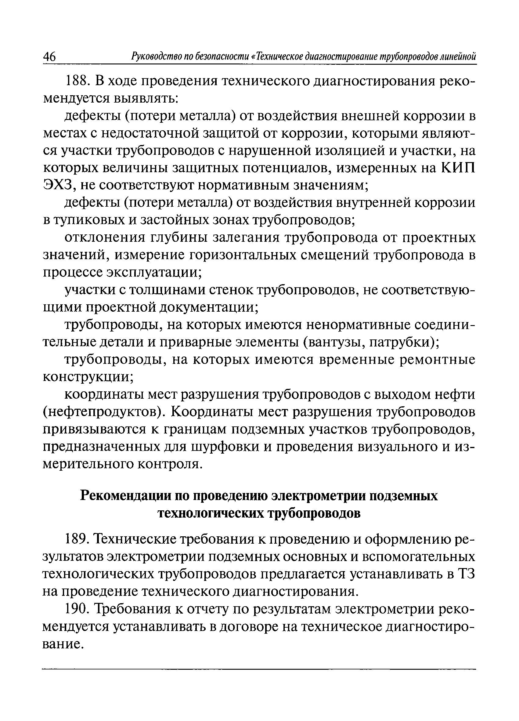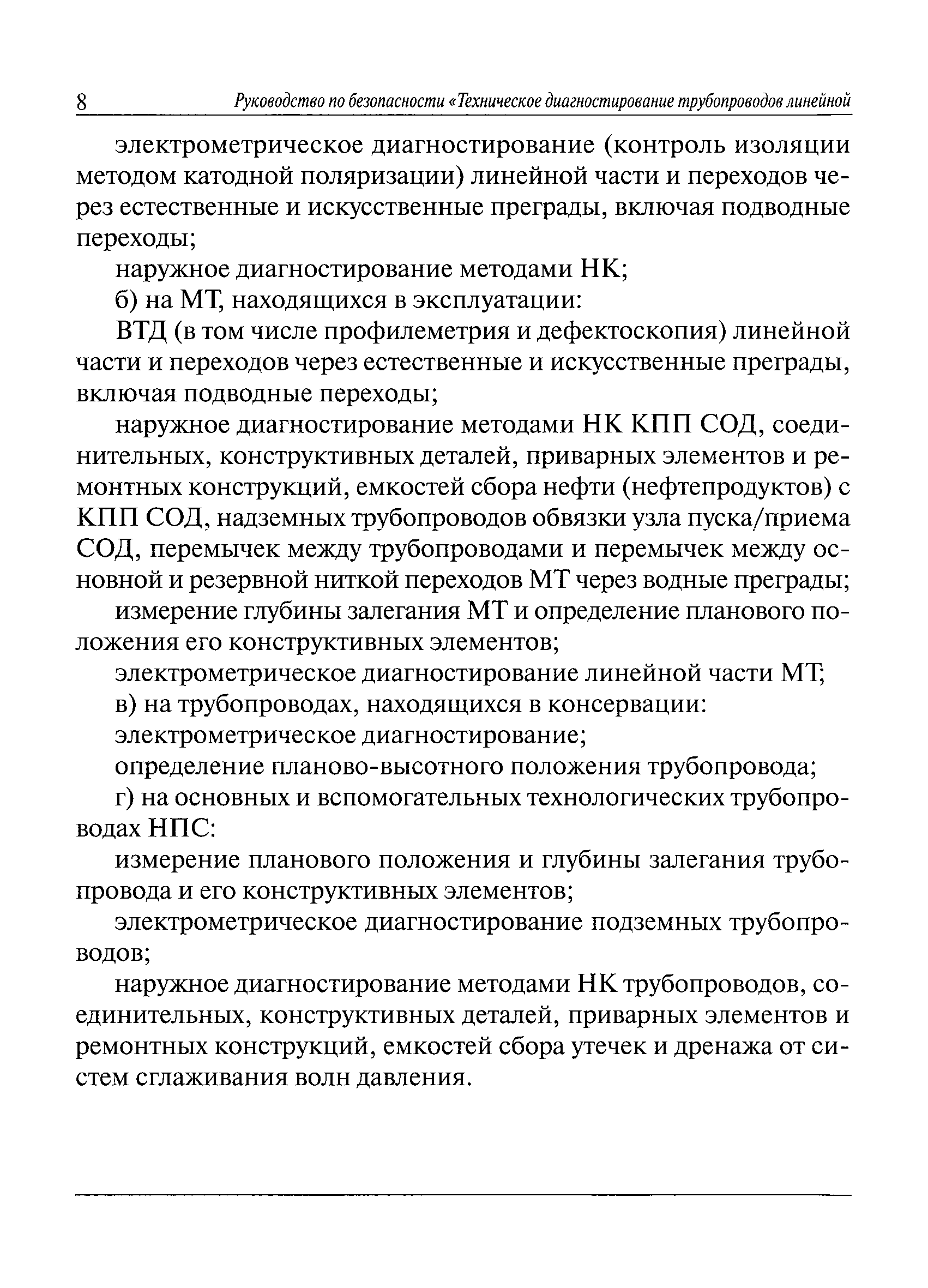 | Оглавление: | I Общие положения II Виды технического диагностирования III Техническое диагностирование линейной части магистральных трубопроводов, законченных строительством. Виды технического диагностирования, выполняемые на трубопроводах, законченных строительством IV Техническое диагностирование линейной части магистральных трубопроводов, находящихся в эксплуатации. Виды технического диагностирования, выполняемые на магистральных трубопроводах, находящихся в эксплуатации V Техническое диагностирование трубопроводов, находящихся в консервации. Виды технического диагностирования, применяемые на трубопроводах, находящихся в консервации, и сроки их проведения VI Техническое диагностирование технологических трубопроводов. Классификация технологических трубопроводов VII Мероприятия по безопасности при испытаниях, очистке и диагностировании трубопровод Приложение 1. Перечень сокращений и их расшифровка Приложение 2. Термины и их определения Приложение 3. Рисунки и таблицы Приложение 4. Рекомендации по методике проведения внутритрубного диагностирования Приложение 5. Рекомендации по видам и срокам проведения технического диагностирования магистральных трубопроводов, находящихся в эксплуатации Приложение 6. Рекомендации по методике выполнения неразрушающего контроля магистральных трубопроводов Приложение 7. Рекомендации по методике проведения работ по электрометрии Приложение 8. Виды работ, проводимые при наружном диагностировании переходов магистральных трубопроводов через водные преграды Приложение 9. Формы предупреждающих знаков Приложение 10. Форма акта на обозначение оборудования и открытых участков трубопровода перед проведением испытаний Приложение 11. Основные рекомендации к выполнению шурфов Приложение 12. Рекомендуемые формы актов при проведении технического диагностирования трубопровода |