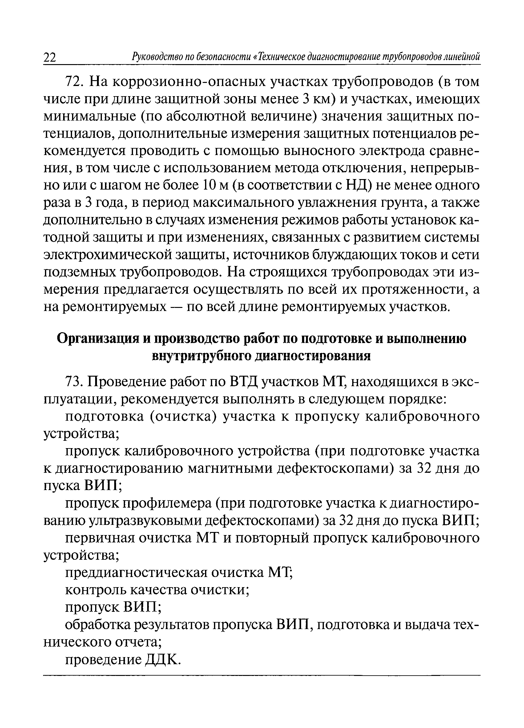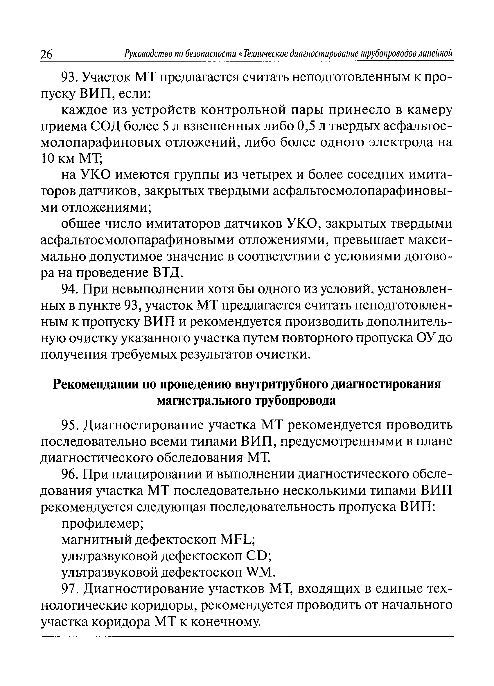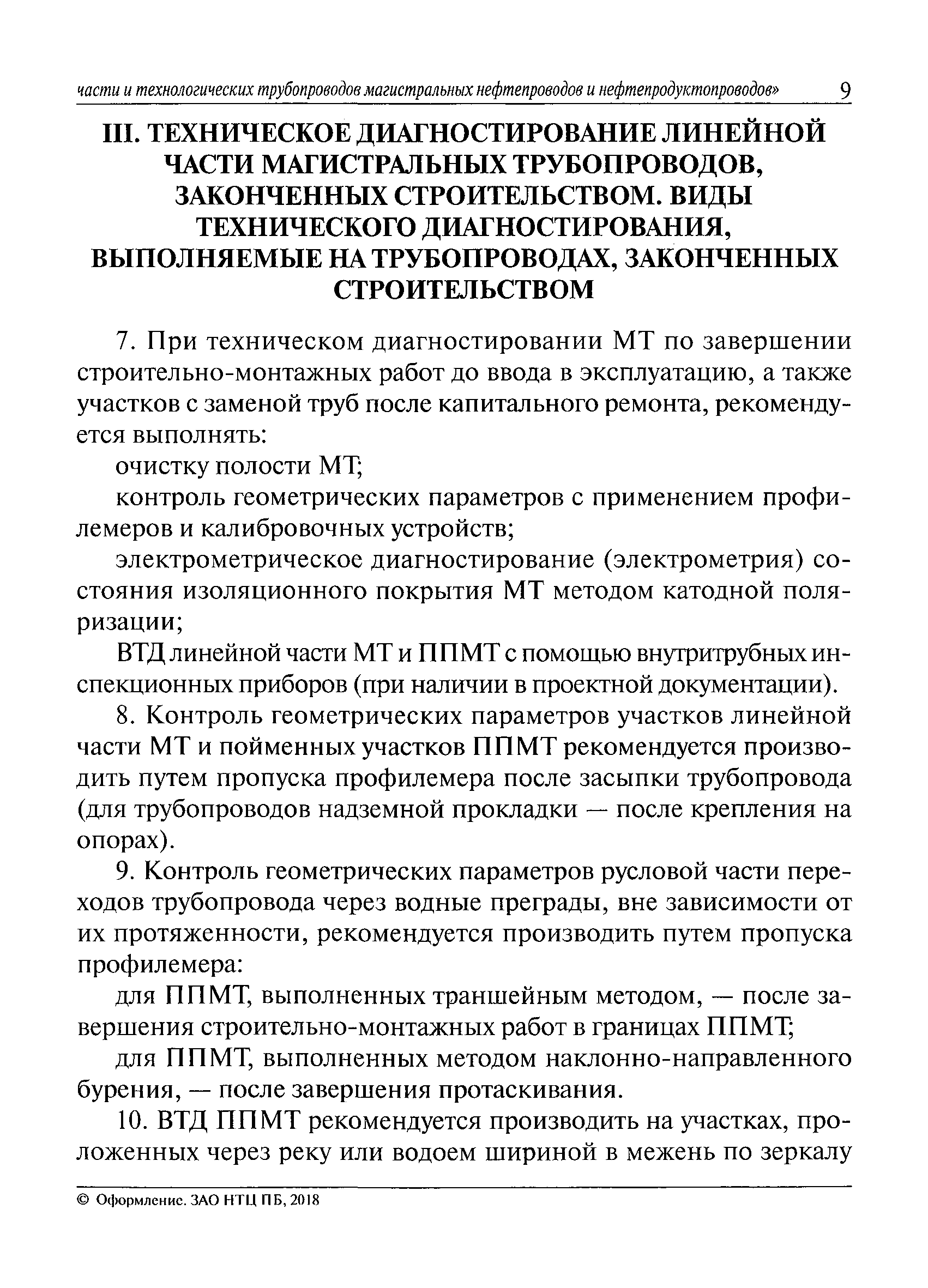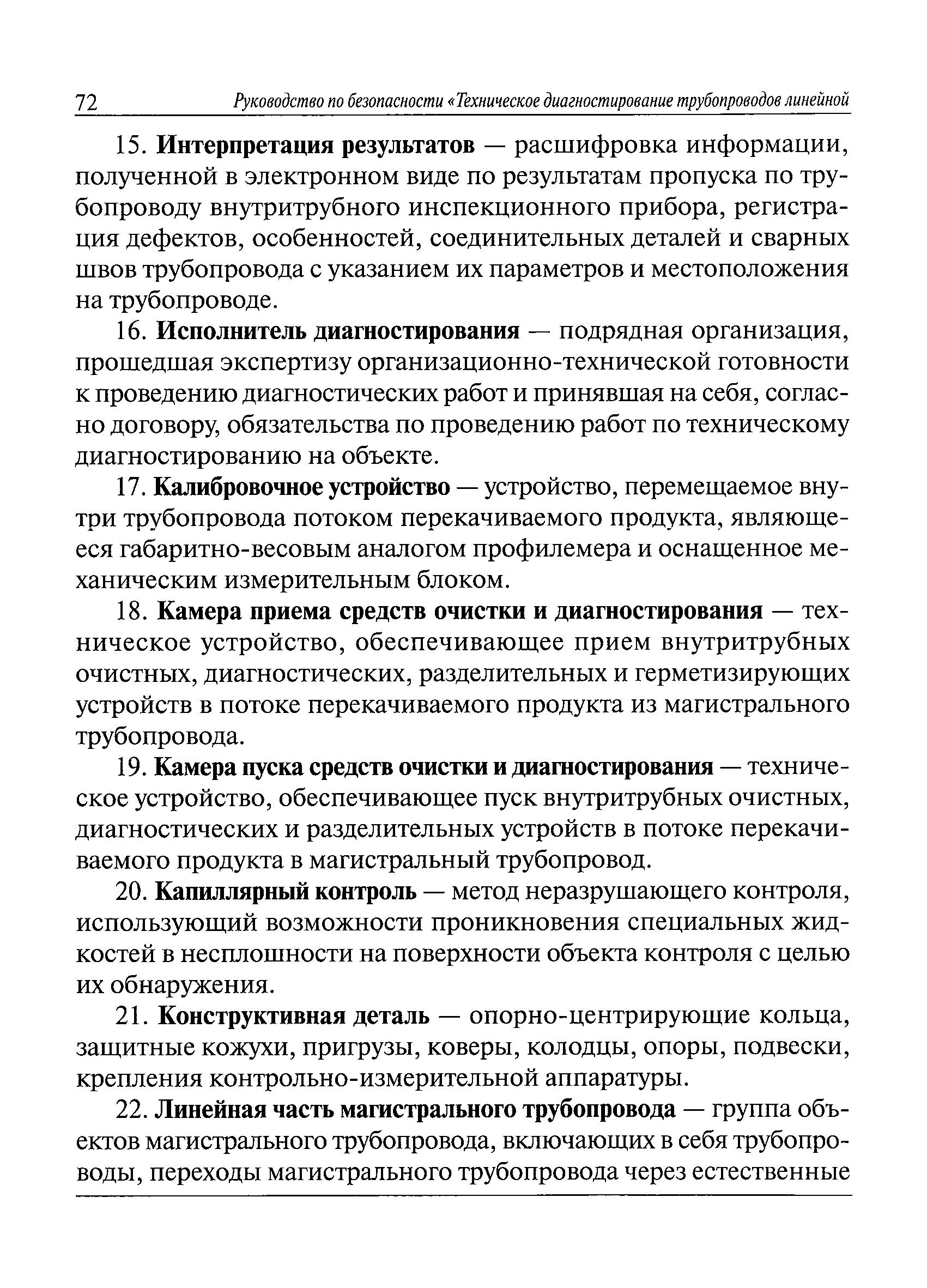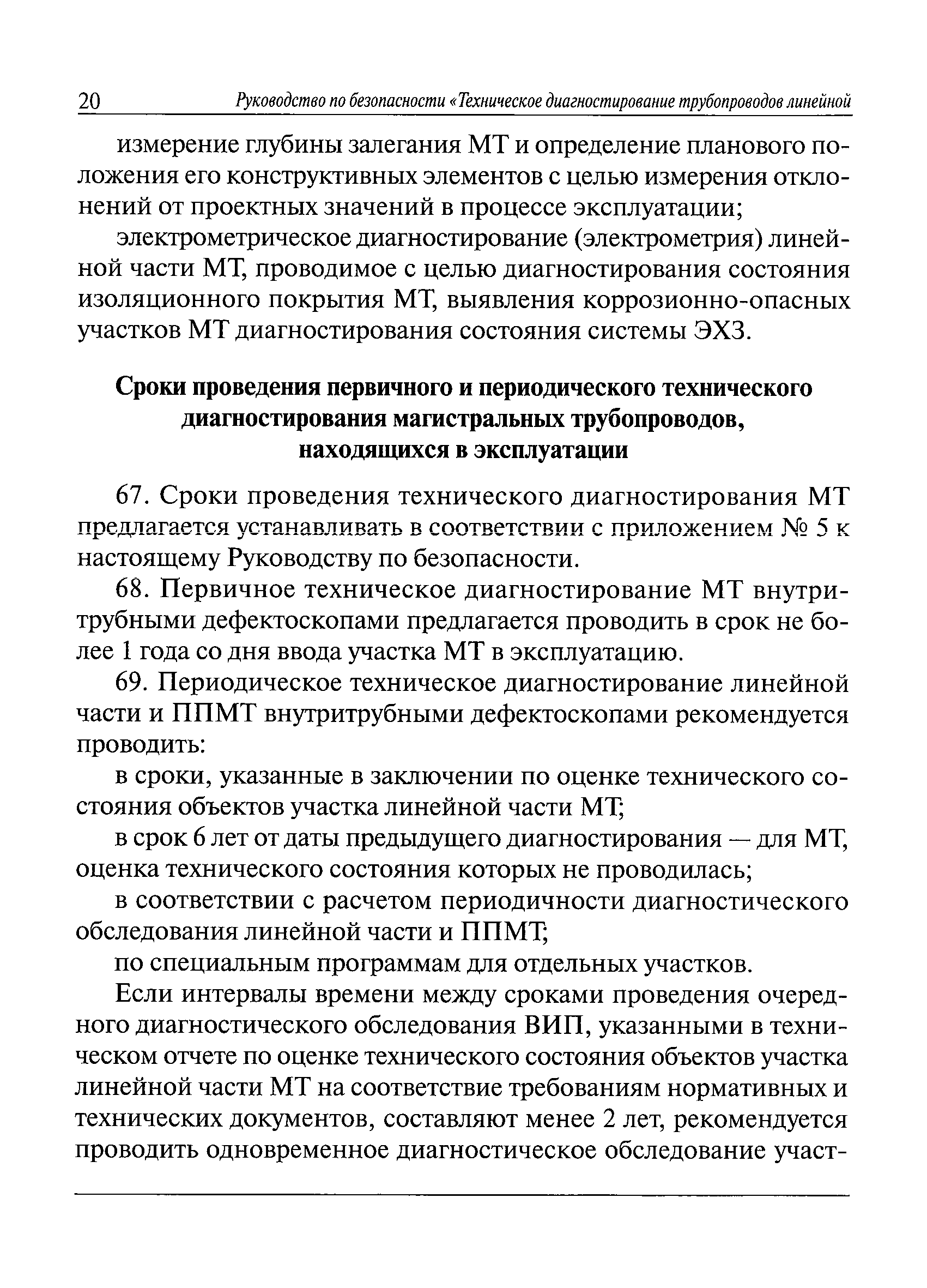 | Оглавление: | I Общие положения II Виды технического диагностирования III Техническое диагностирование линейной части магистральных трубопроводов, законченных строительством. Виды технического диагностирования, выполняемые на трубопроводах, законченных строительством IV Техническое диагностирование линейной части магистральных трубопроводов, находящихся в эксплуатации. Виды технического диагностирования, выполняемые на магистральных трубопроводах, находящихся в эксплуатации V Техническое диагностирование трубопроводов, находящихся в консервации. Виды технического диагностирования, применяемые на трубопроводах, находящихся в консервации, и сроки их проведения VI Техническое диагностирование технологических трубопроводов. Классификация технологических трубопроводов VII Мероприятия по безопасности при испытаниях, очистке и диагностировании трубопровод Приложение 1. Перечень сокращений и их расшифровка Приложение 2. Термины и их определения Приложение 3. Рисунки и таблицы Приложение 4. Рекомендации по методике проведения внутритрубного диагностирования Приложение 5. Рекомендации по видам и срокам проведения технического диагностирования магистральных трубопроводов, находящихся в эксплуатации Приложение 6. Рекомендации по методике выполнения неразрушающего контроля магистральных трубопроводов Приложение 7. Рекомендации по методике проведения работ по электрометрии Приложение 8. Виды работ, проводимые при наружном диагностировании переходов магистральных трубопроводов через водные преграды Приложение 9. Формы предупреждающих знаков Приложение 10. Форма акта на обозначение оборудования и открытых участков трубопровода перед проведением испытаний Приложение 11. Основные рекомендации к выполнению шурфов Приложение 12. Рекомендуемые формы актов при проведении технического диагностирования трубопровода |