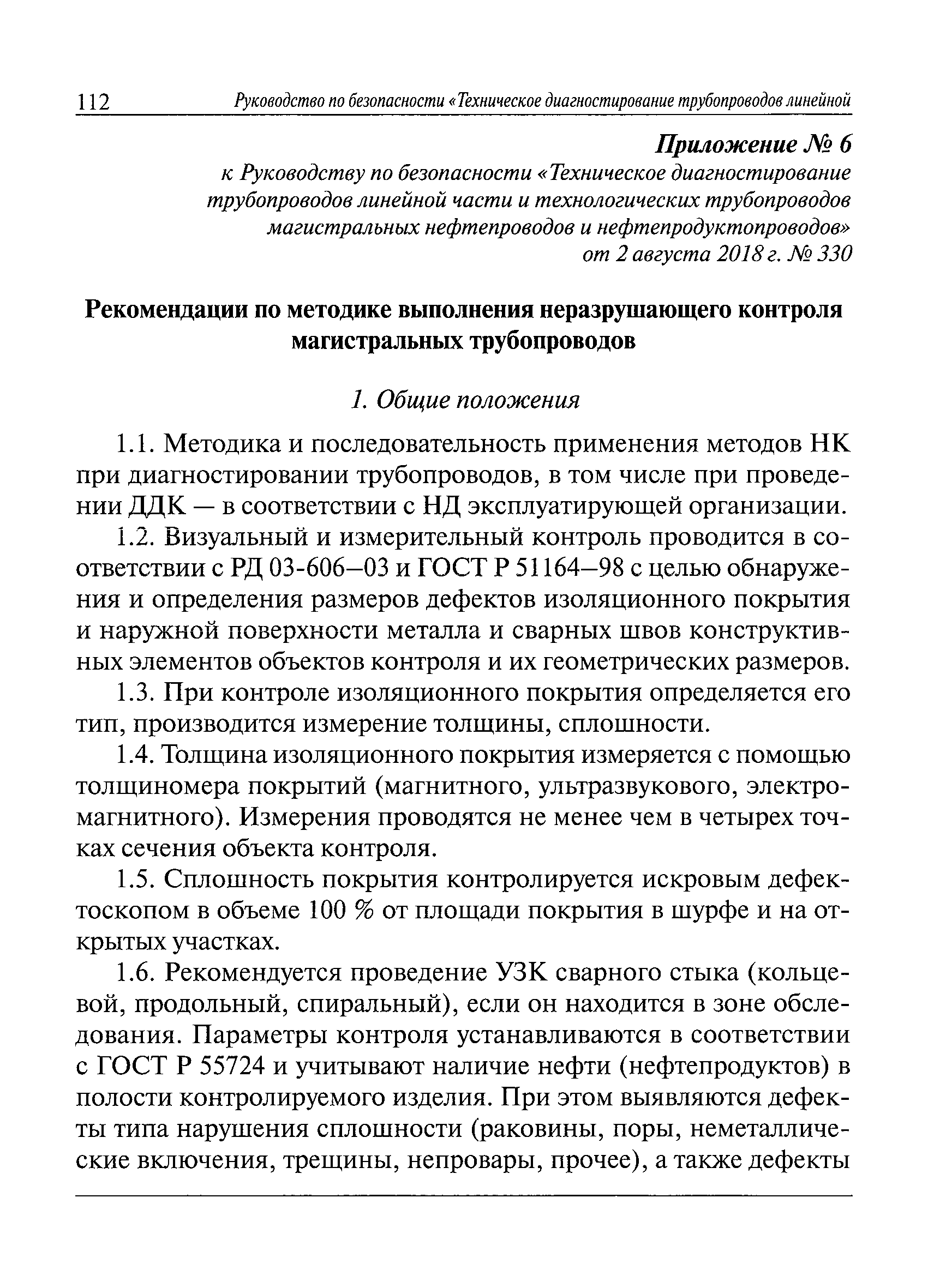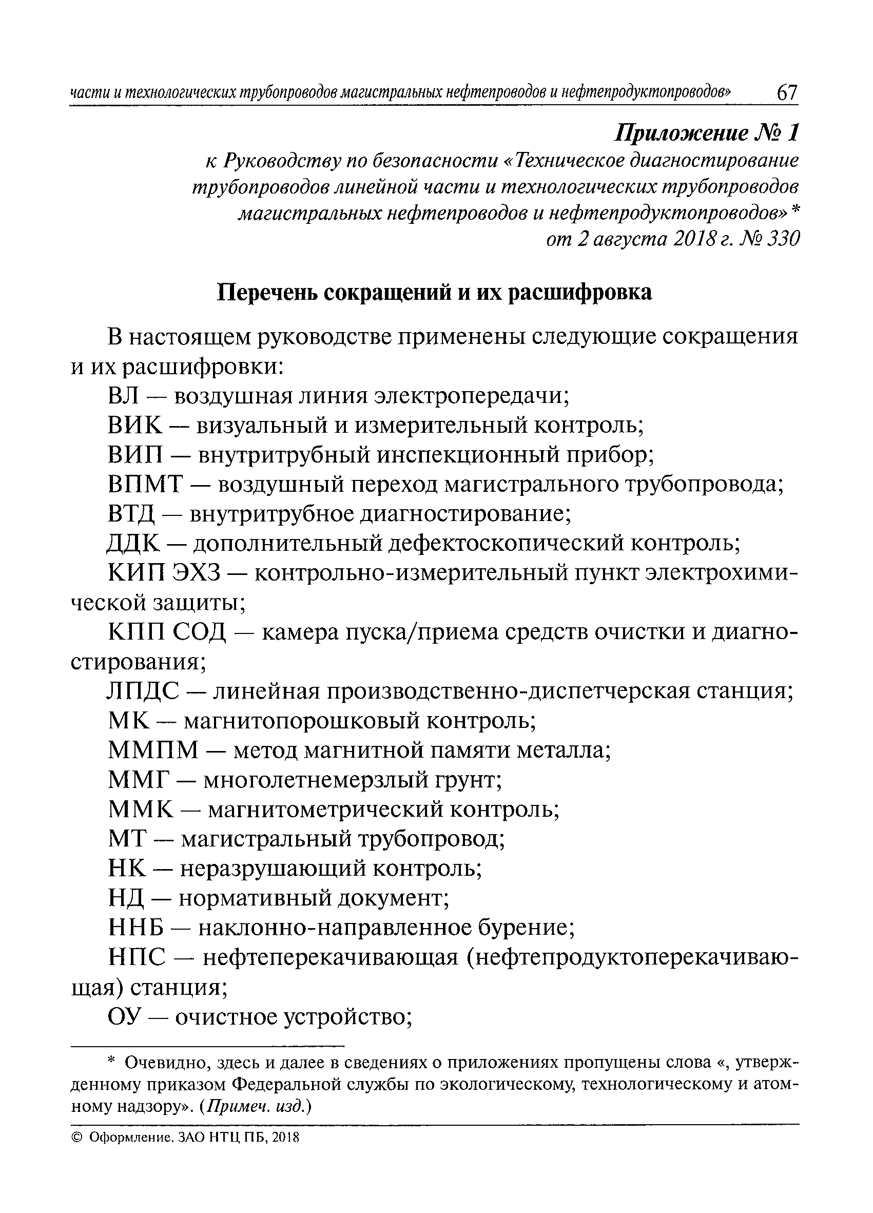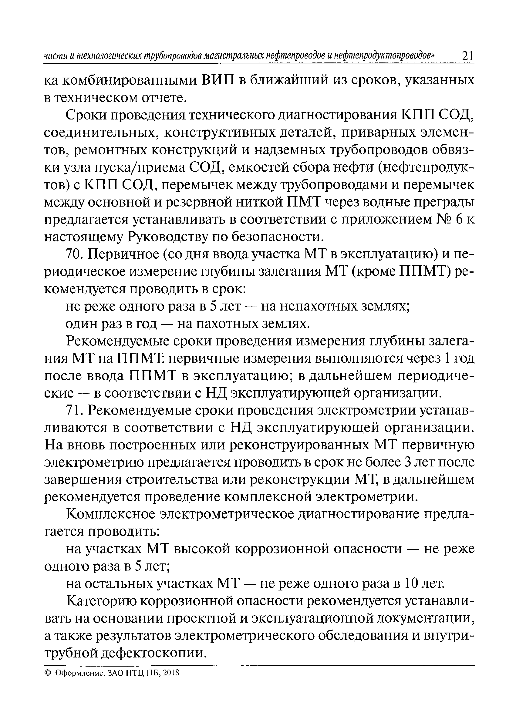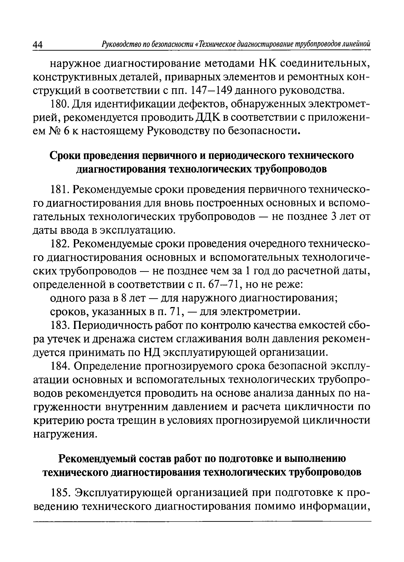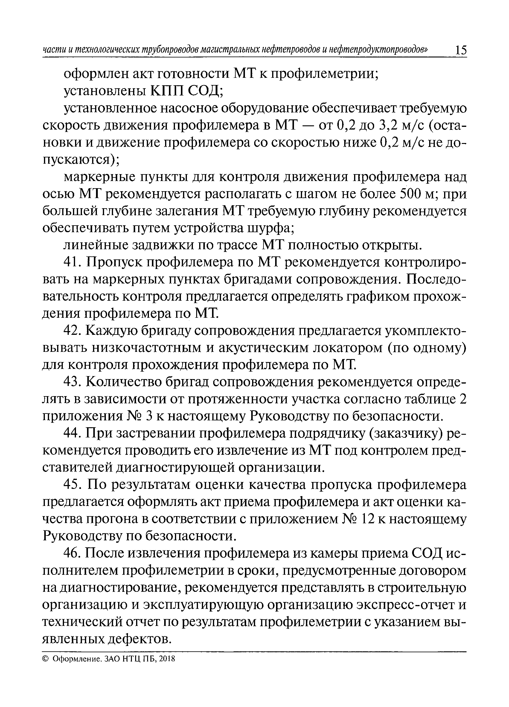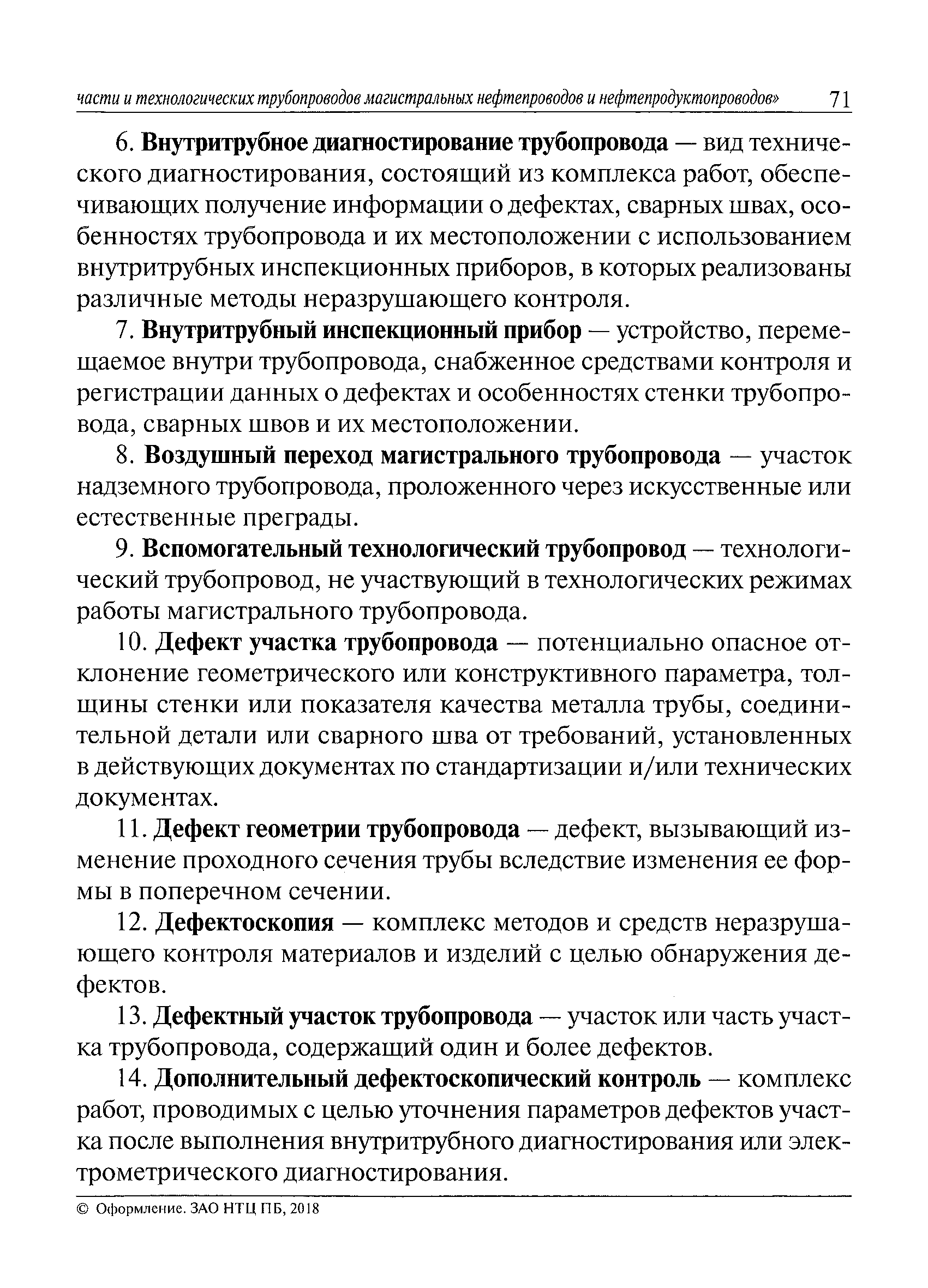 | Оглавление: | I Общие положения II Виды технического диагностирования III Техническое диагностирование линейной части магистральных трубопроводов, законченных строительством. Виды технического диагностирования, выполняемые на трубопроводах, законченных строительством IV Техническое диагностирование линейной части магистральных трубопроводов, находящихся в эксплуатации. Виды технического диагностирования, выполняемые на магистральных трубопроводах, находящихся в эксплуатации V Техническое диагностирование трубопроводов, находящихся в консервации. Виды технического диагностирования, применяемые на трубопроводах, находящихся в консервации, и сроки их проведения VI Техническое диагностирование технологических трубопроводов. Классификация технологических трубопроводов VII Мероприятия по безопасности при испытаниях, очистке и диагностировании трубопровод Приложение 1. Перечень сокращений и их расшифровка Приложение 2. Термины и их определения Приложение 3. Рисунки и таблицы Приложение 4. Рекомендации по методике проведения внутритрубного диагностирования Приложение 5. Рекомендации по видам и срокам проведения технического диагностирования магистральных трубопроводов, находящихся в эксплуатации Приложение 6. Рекомендации по методике выполнения неразрушающего контроля магистральных трубопроводов Приложение 7. Рекомендации по методике проведения работ по электрометрии Приложение 8. Виды работ, проводимые при наружном диагностировании переходов магистральных трубопроводов через водные преграды Приложение 9. Формы предупреждающих знаков Приложение 10. Форма акта на обозначение оборудования и открытых участков трубопровода перед проведением испытаний Приложение 11. Основные рекомендации к выполнению шурфов Приложение 12. Рекомендуемые формы актов при проведении технического диагностирования трубопровода |