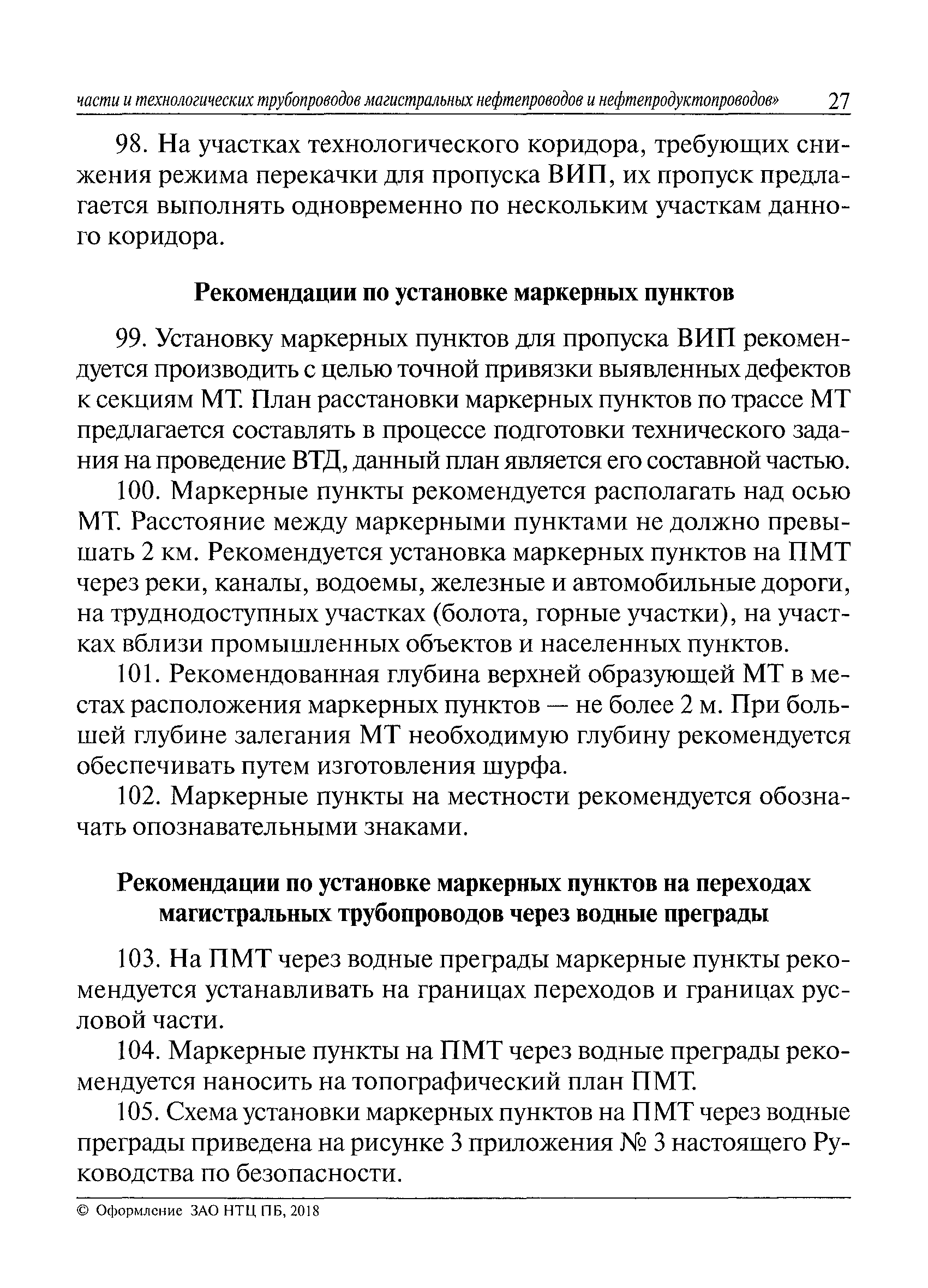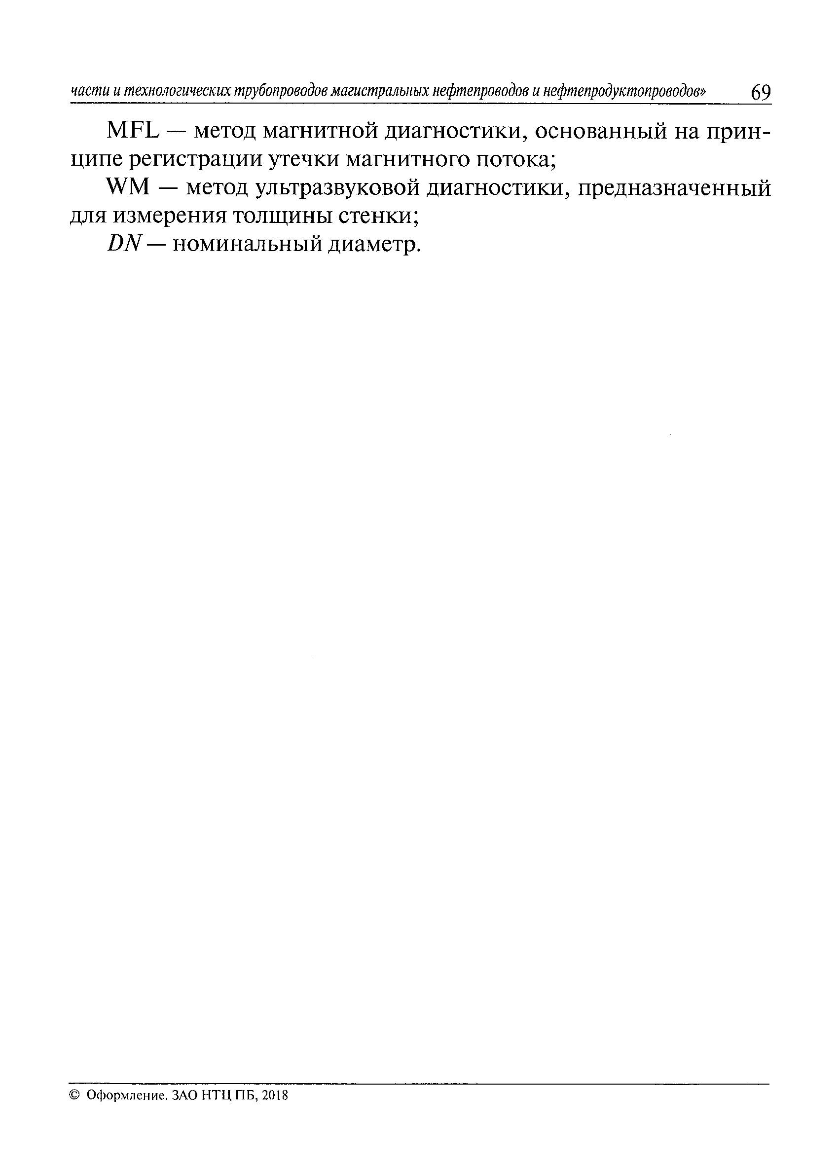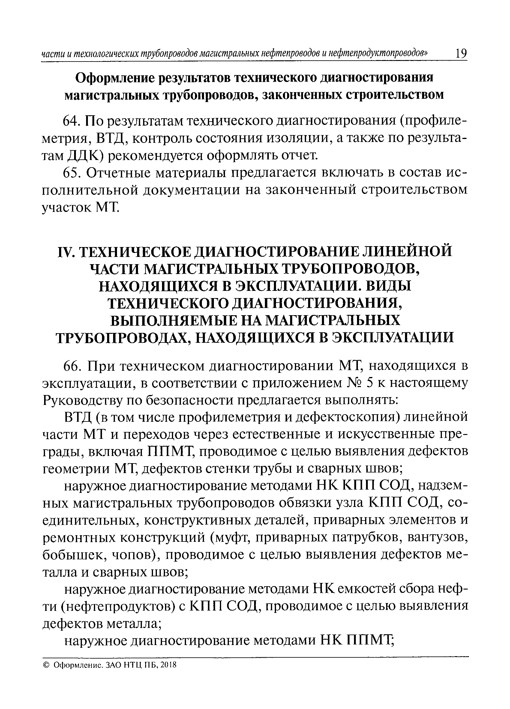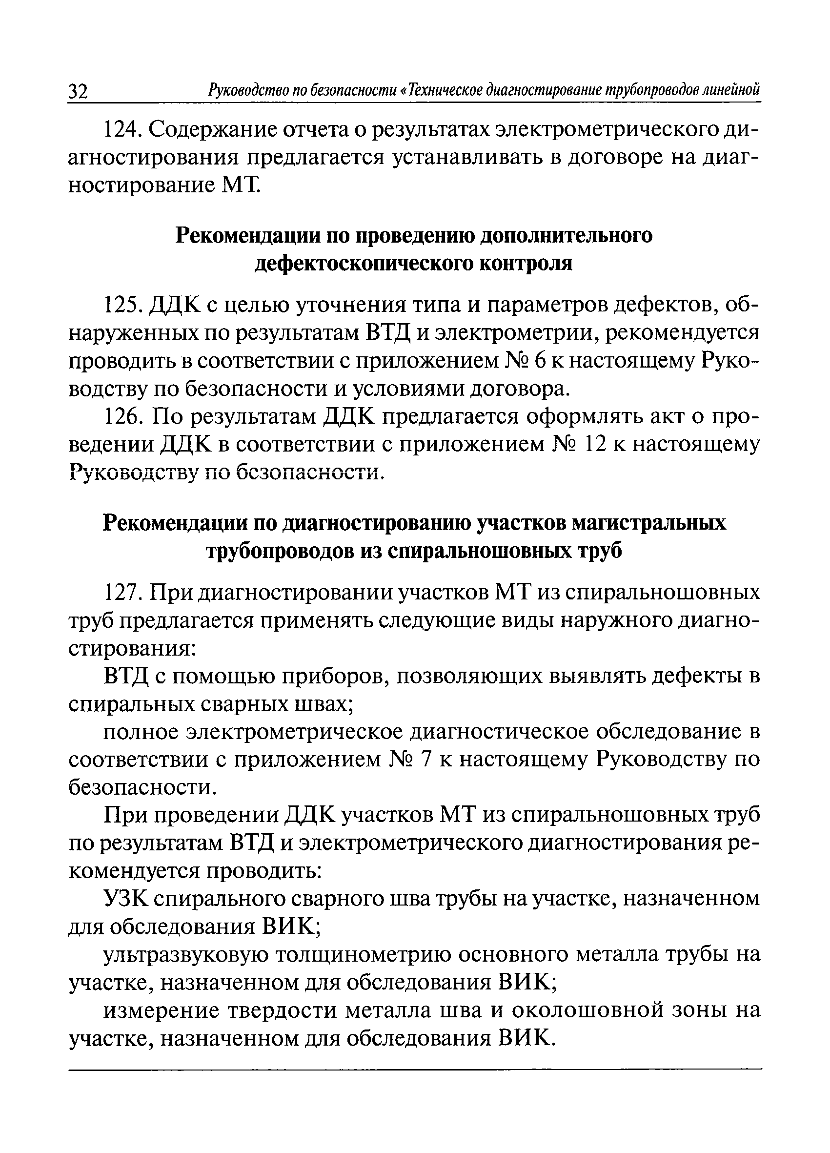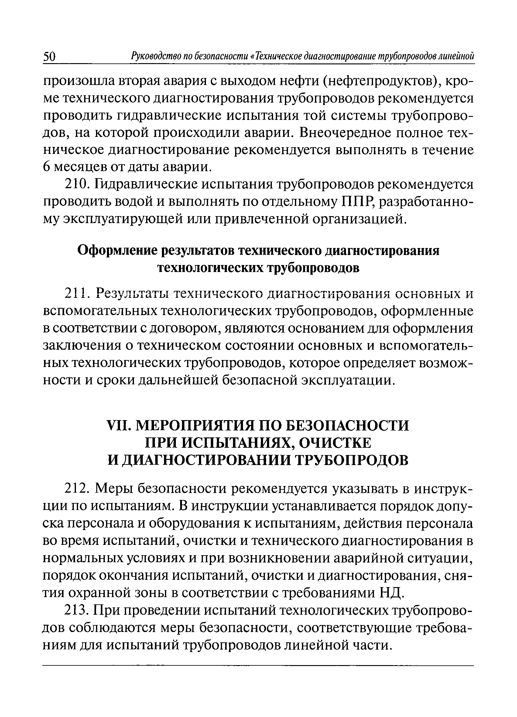 | Оглавление: | I Общие положения II Виды технического диагностирования III Техническое диагностирование линейной части магистральных трубопроводов, законченных строительством. Виды технического диагностирования, выполняемые на трубопроводах, законченных строительством IV Техническое диагностирование линейной части магистральных трубопроводов, находящихся в эксплуатации. Виды технического диагностирования, выполняемые на магистральных трубопроводах, находящихся в эксплуатации V Техническое диагностирование трубопроводов, находящихся в консервации. Виды технического диагностирования, применяемые на трубопроводах, находящихся в консервации, и сроки их проведения VI Техническое диагностирование технологических трубопроводов. Классификация технологических трубопроводов VII Мероприятия по безопасности при испытаниях, очистке и диагностировании трубопровод Приложение 1. Перечень сокращений и их расшифровка Приложение 2. Термины и их определения Приложение 3. Рисунки и таблицы Приложение 4. Рекомендации по методике проведения внутритрубного диагностирования Приложение 5. Рекомендации по видам и срокам проведения технического диагностирования магистральных трубопроводов, находящихся в эксплуатации Приложение 6. Рекомендации по методике выполнения неразрушающего контроля магистральных трубопроводов Приложение 7. Рекомендации по методике проведения работ по электрометрии Приложение 8. Виды работ, проводимые при наружном диагностировании переходов магистральных трубопроводов через водные преграды Приложение 9. Формы предупреждающих знаков Приложение 10. Форма акта на обозначение оборудования и открытых участков трубопровода перед проведением испытаний Приложение 11. Основные рекомендации к выполнению шурфов Приложение 12. Рекомендуемые формы актов при проведении технического диагностирования трубопровода |