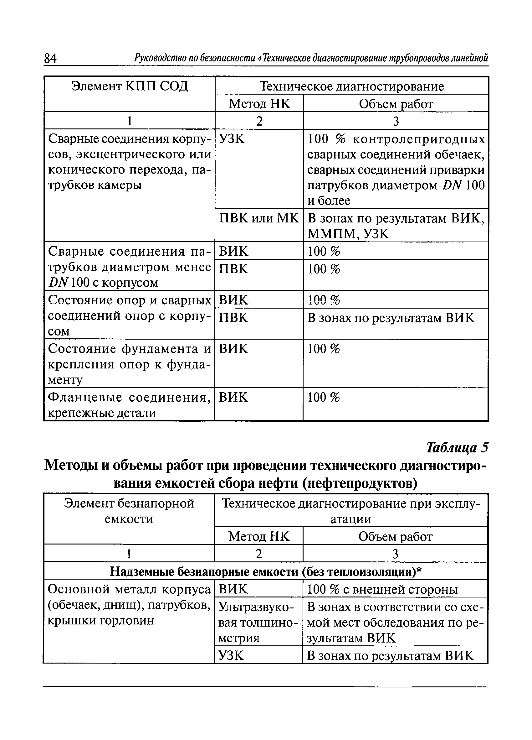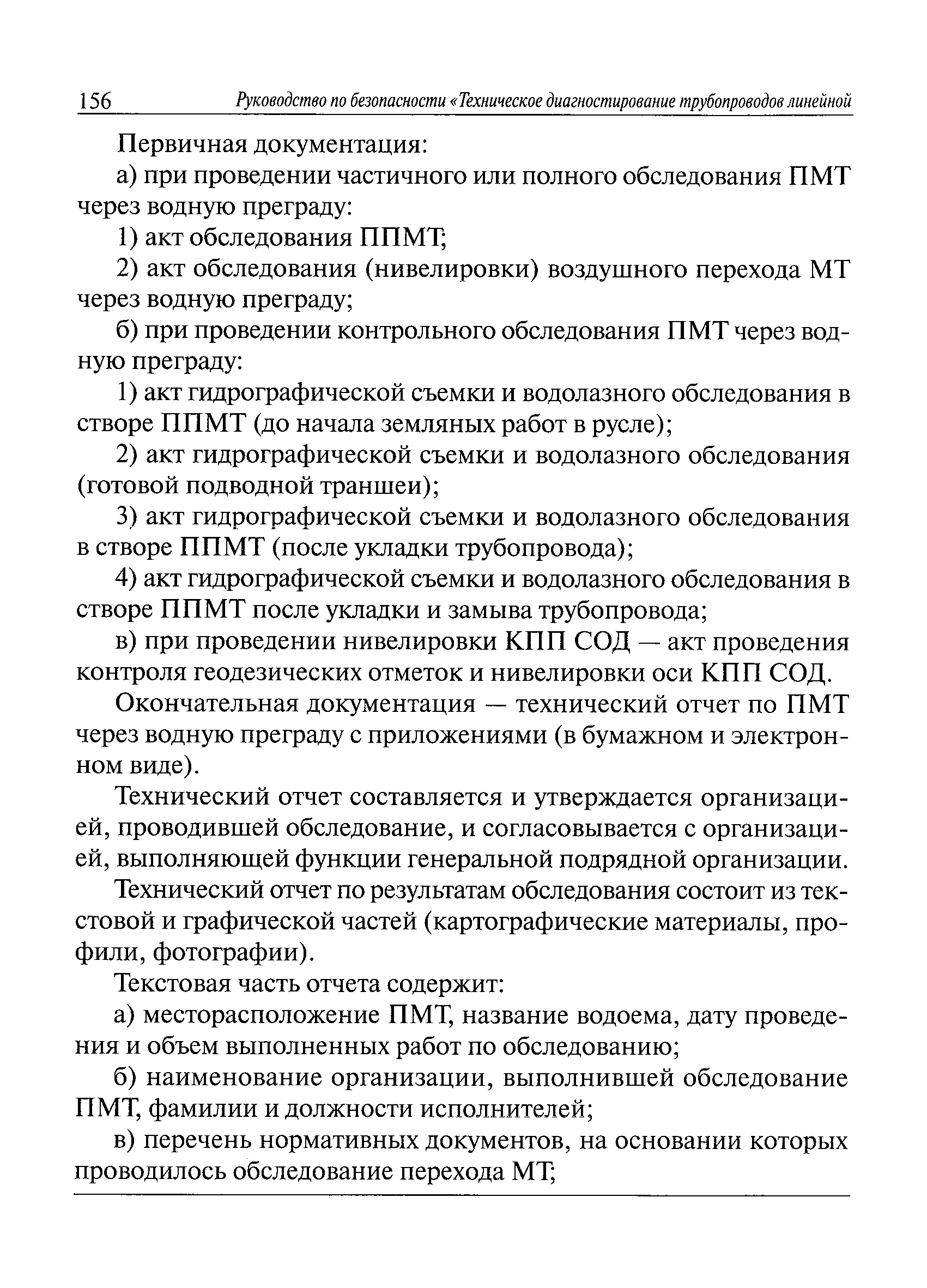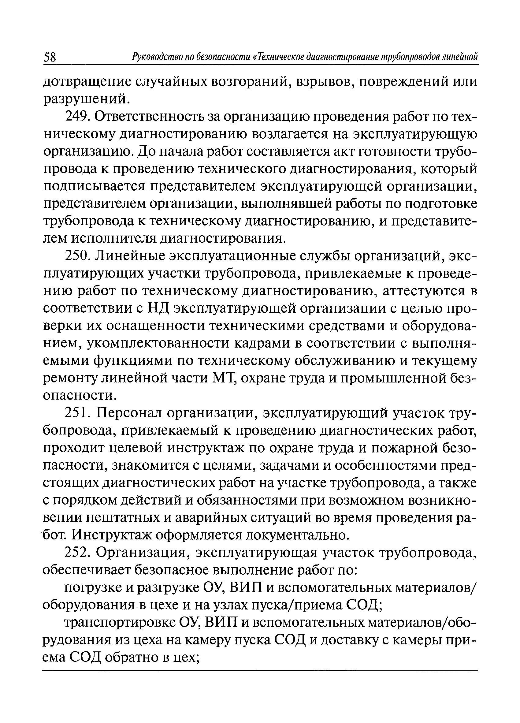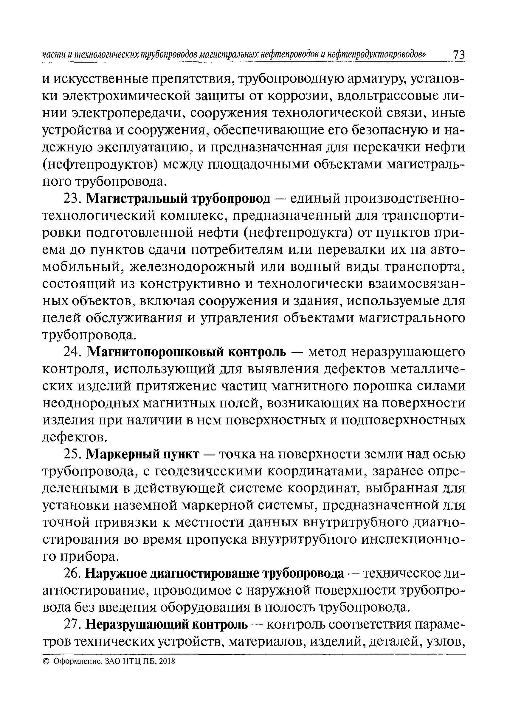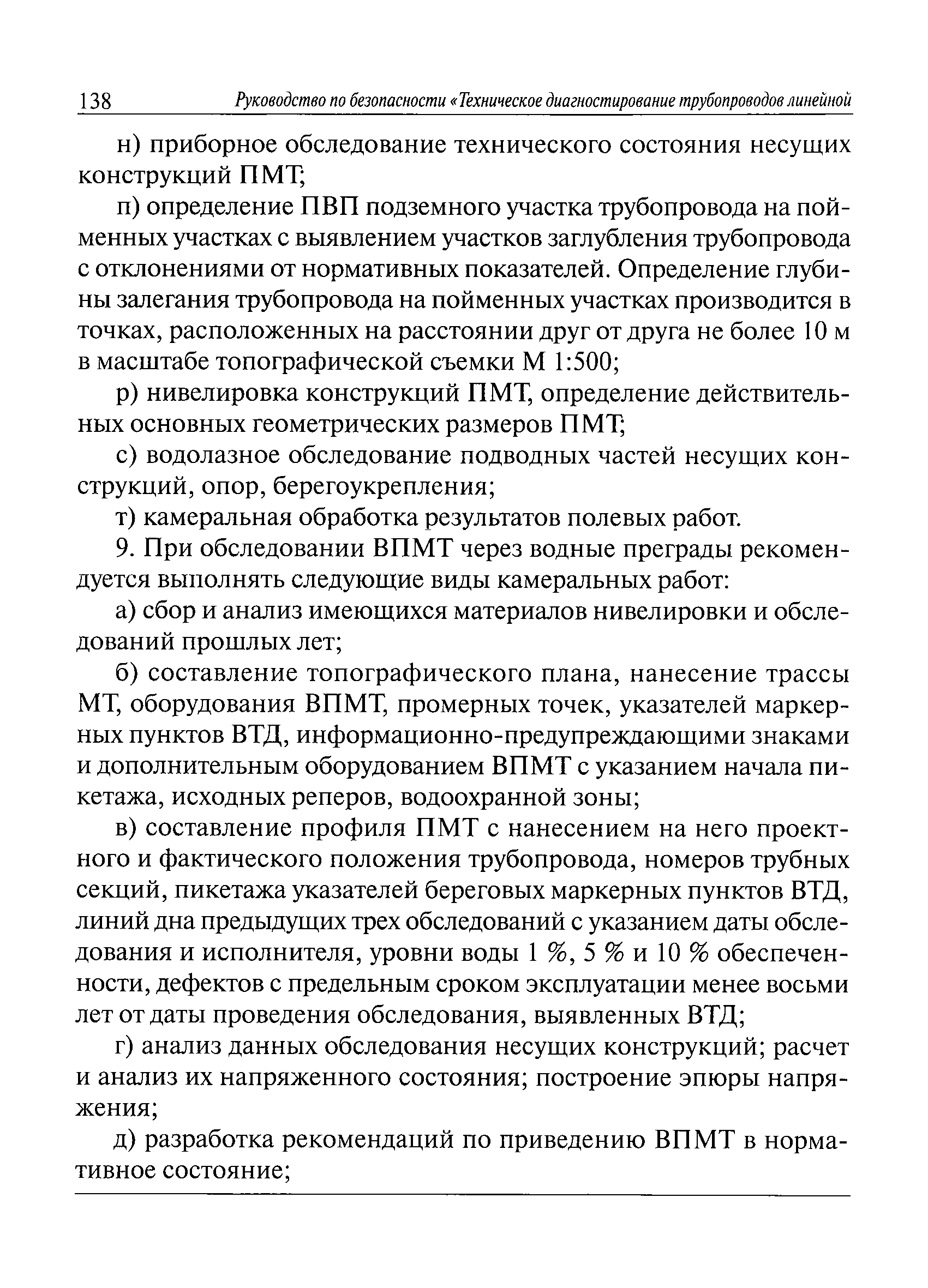 | Оглавление: | I Общие положения II Виды технического диагностирования III Техническое диагностирование линейной части магистральных трубопроводов, законченных строительством. Виды технического диагностирования, выполняемые на трубопроводах, законченных строительством IV Техническое диагностирование линейной части магистральных трубопроводов, находящихся в эксплуатации. Виды технического диагностирования, выполняемые на магистральных трубопроводах, находящихся в эксплуатации V Техническое диагностирование трубопроводов, находящихся в консервации. Виды технического диагностирования, применяемые на трубопроводах, находящихся в консервации, и сроки их проведения VI Техническое диагностирование технологических трубопроводов. Классификация технологических трубопроводов VII Мероприятия по безопасности при испытаниях, очистке и диагностировании трубопровод Приложение 1. Перечень сокращений и их расшифровка Приложение 2. Термины и их определения Приложение 3. Рисунки и таблицы Приложение 4. Рекомендации по методике проведения внутритрубного диагностирования Приложение 5. Рекомендации по видам и срокам проведения технического диагностирования магистральных трубопроводов, находящихся в эксплуатации Приложение 6. Рекомендации по методике выполнения неразрушающего контроля магистральных трубопроводов Приложение 7. Рекомендации по методике проведения работ по электрометрии Приложение 8. Виды работ, проводимые при наружном диагностировании переходов магистральных трубопроводов через водные преграды Приложение 9. Формы предупреждающих знаков Приложение 10. Форма акта на обозначение оборудования и открытых участков трубопровода перед проведением испытаний Приложение 11. Основные рекомендации к выполнению шурфов Приложение 12. Рекомендуемые формы актов при проведении технического диагностирования трубопровода |