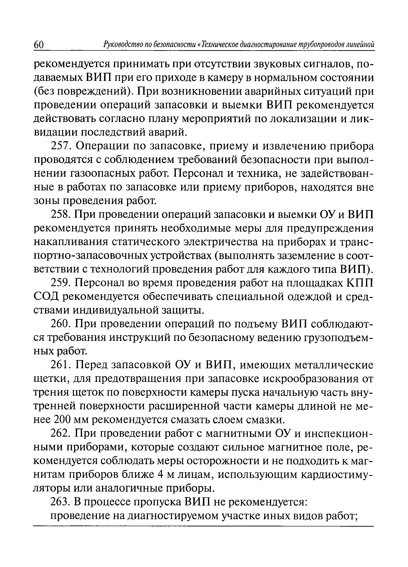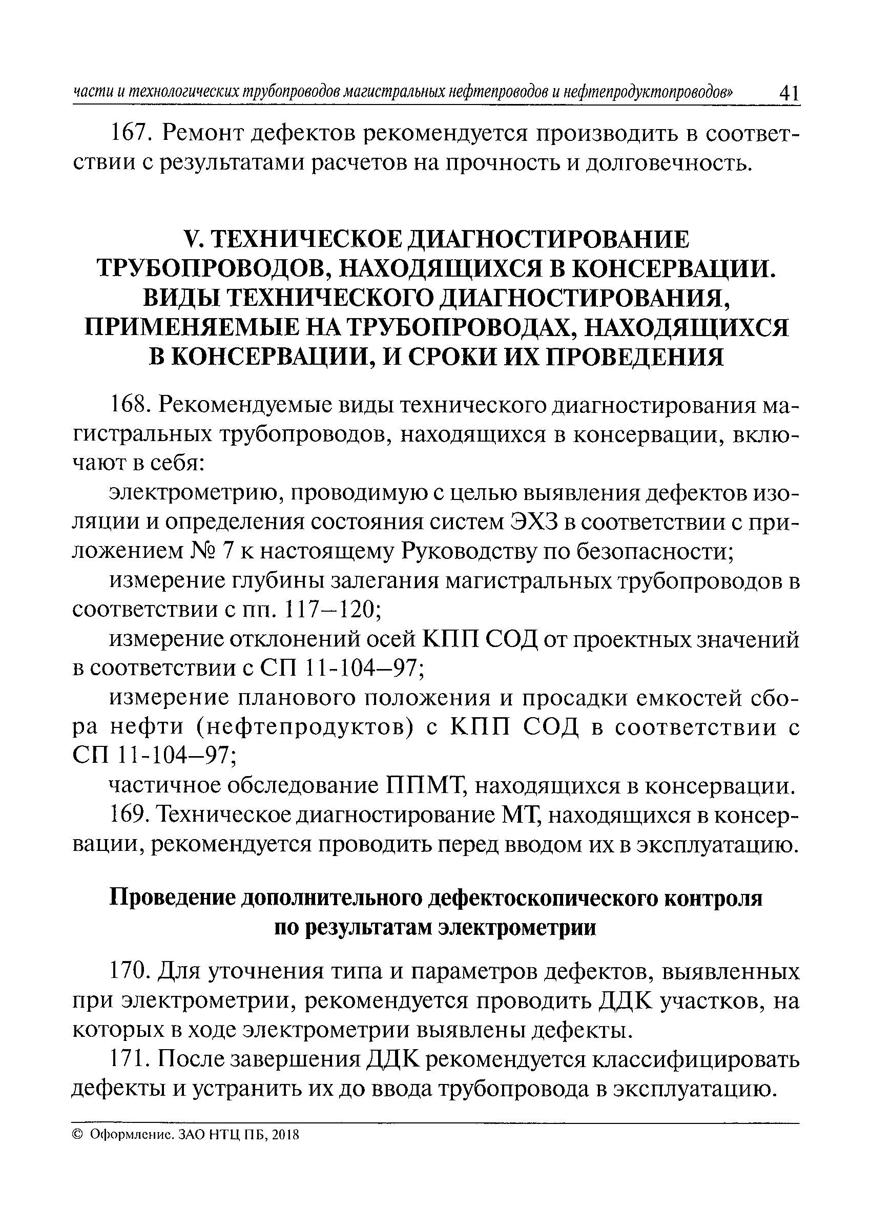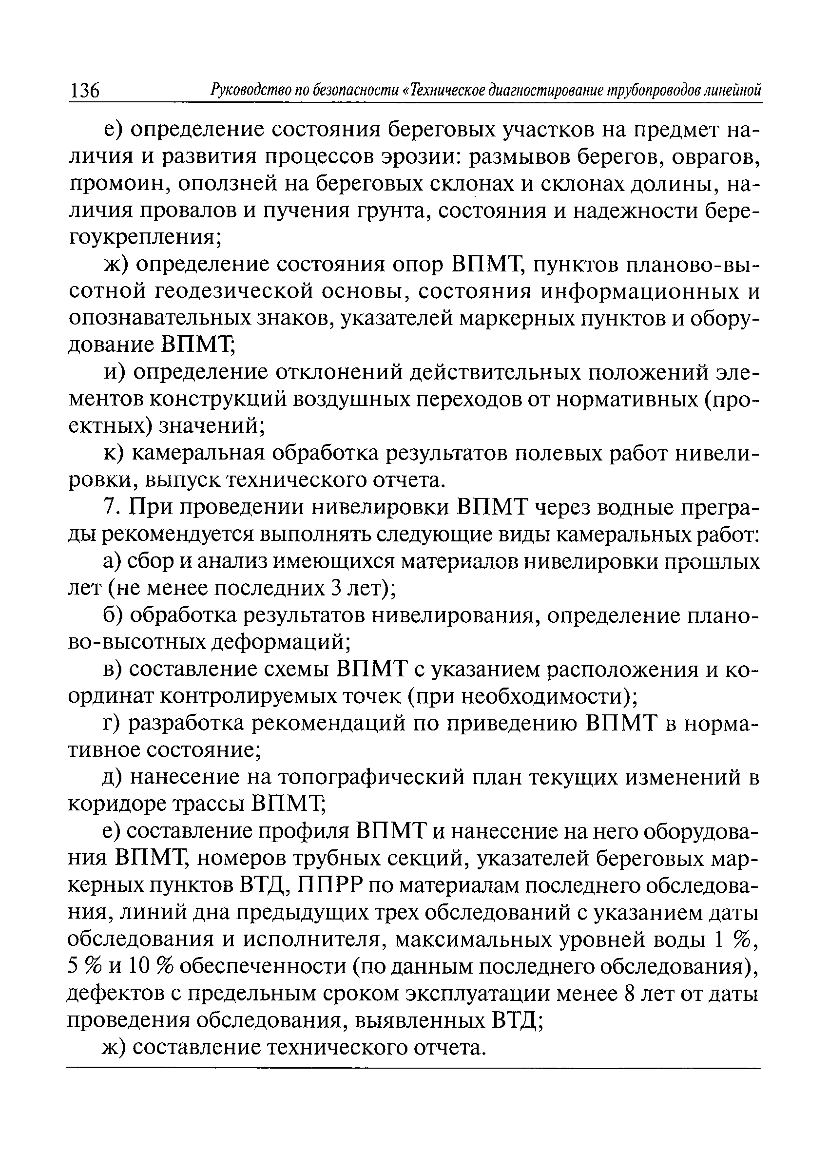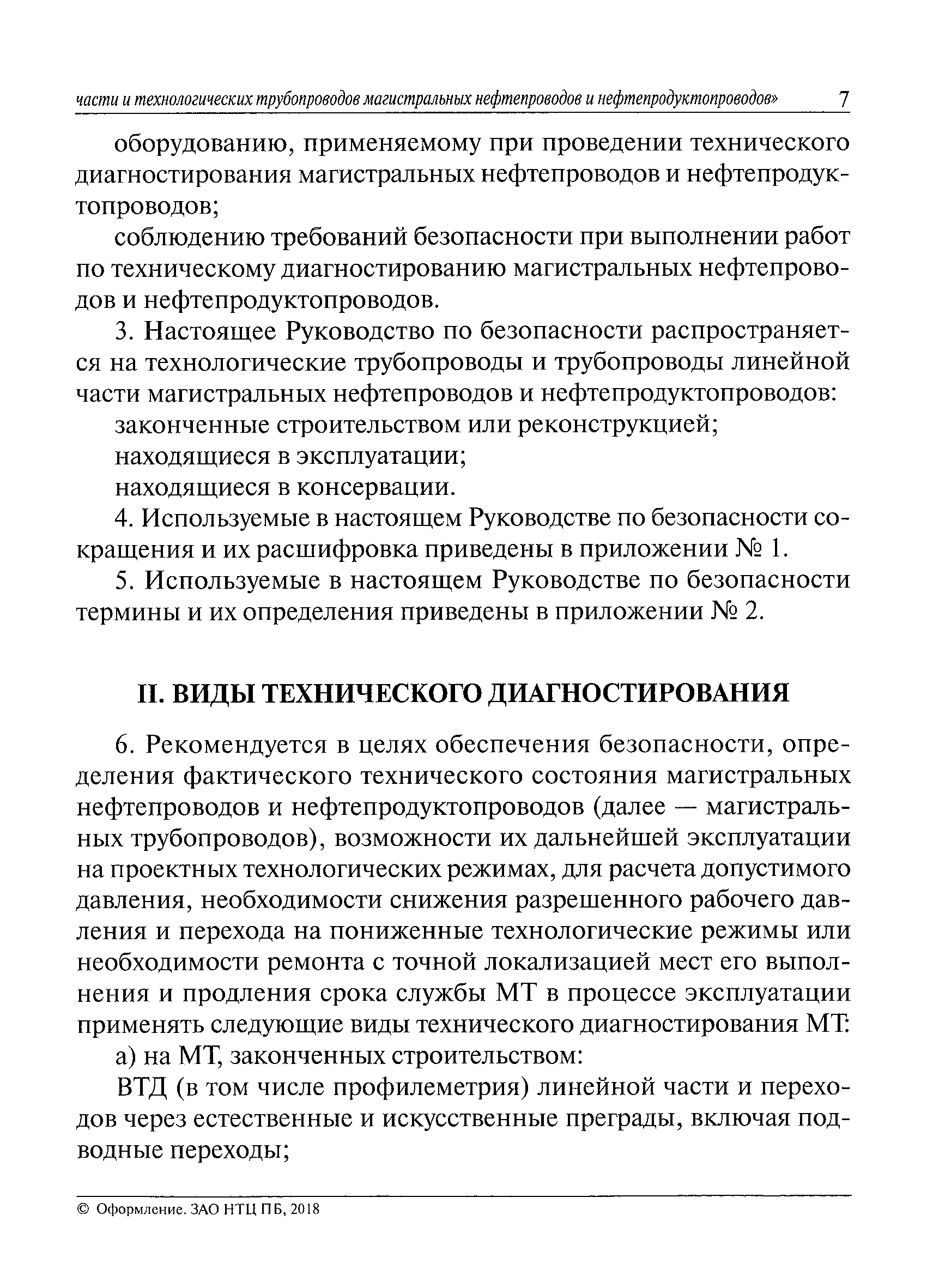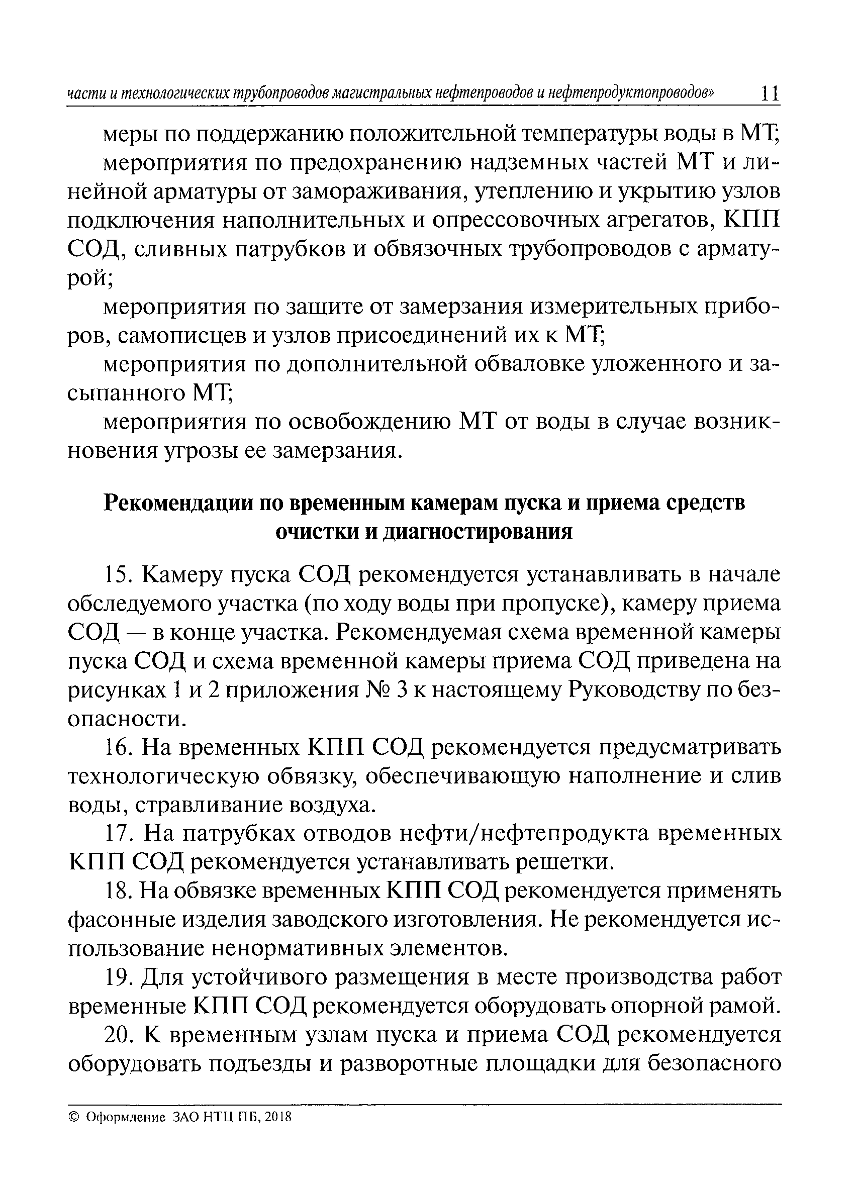 | Оглавление: | I Общие положения II Виды технического диагностирования III Техническое диагностирование линейной части магистральных трубопроводов, законченных строительством. Виды технического диагностирования, выполняемые на трубопроводах, законченных строительством IV Техническое диагностирование линейной части магистральных трубопроводов, находящихся в эксплуатации. Виды технического диагностирования, выполняемые на магистральных трубопроводах, находящихся в эксплуатации V Техническое диагностирование трубопроводов, находящихся в консервации. Виды технического диагностирования, применяемые на трубопроводах, находящихся в консервации, и сроки их проведения VI Техническое диагностирование технологических трубопроводов. Классификация технологических трубопроводов VII Мероприятия по безопасности при испытаниях, очистке и диагностировании трубопровод Приложение 1. Перечень сокращений и их расшифровка Приложение 2. Термины и их определения Приложение 3. Рисунки и таблицы Приложение 4. Рекомендации по методике проведения внутритрубного диагностирования Приложение 5. Рекомендации по видам и срокам проведения технического диагностирования магистральных трубопроводов, находящихся в эксплуатации Приложение 6. Рекомендации по методике выполнения неразрушающего контроля магистральных трубопроводов Приложение 7. Рекомендации по методике проведения работ по электрометрии Приложение 8. Виды работ, проводимые при наружном диагностировании переходов магистральных трубопроводов через водные преграды Приложение 9. Формы предупреждающих знаков Приложение 10. Форма акта на обозначение оборудования и открытых участков трубопровода перед проведением испытаний Приложение 11. Основные рекомендации к выполнению шурфов Приложение 12. Рекомендуемые формы актов при проведении технического диагностирования трубопровода |