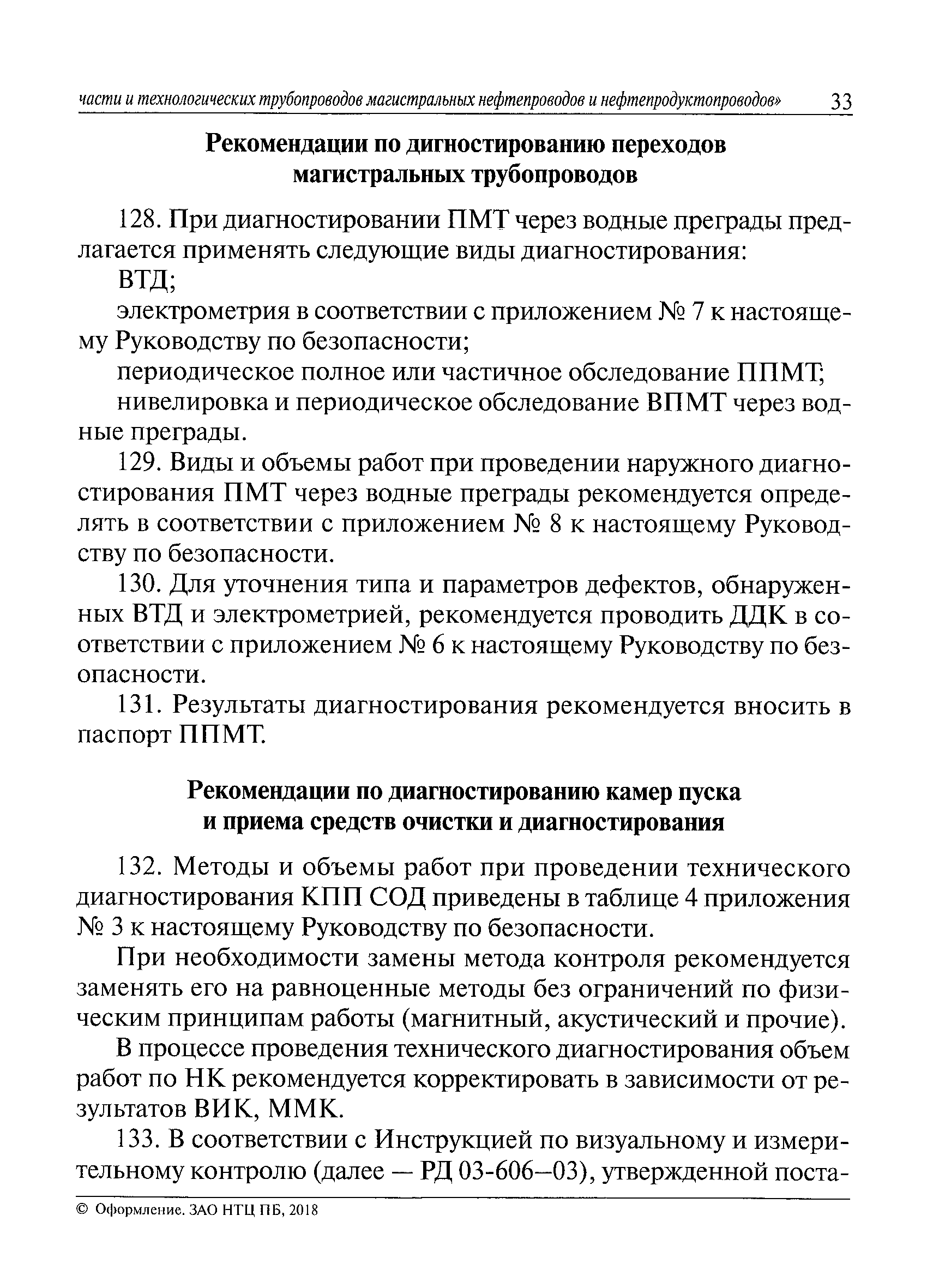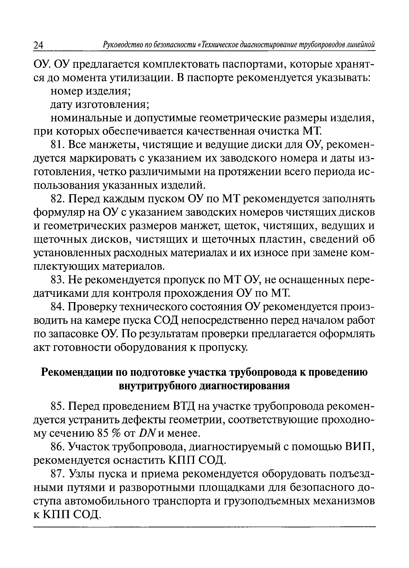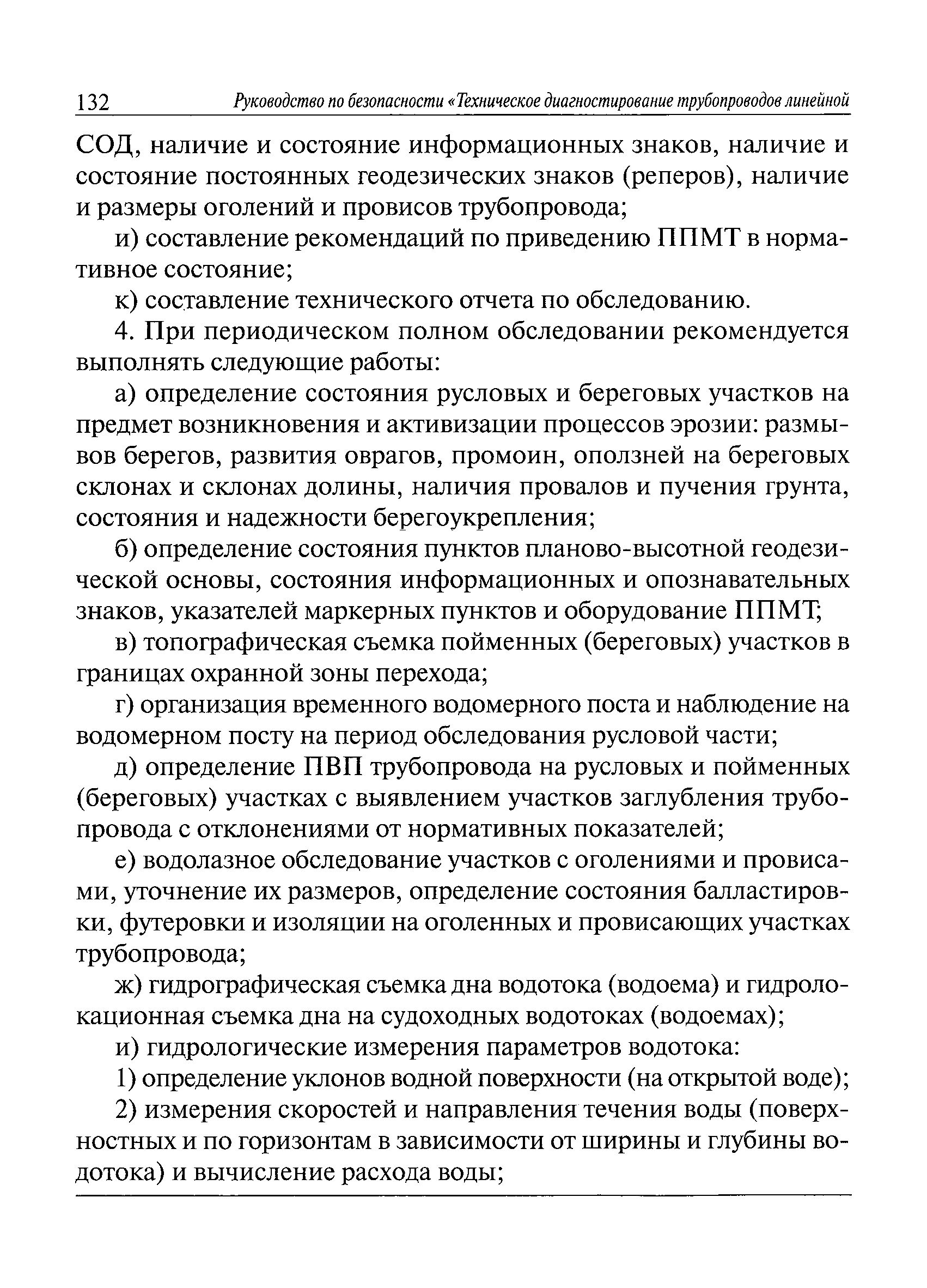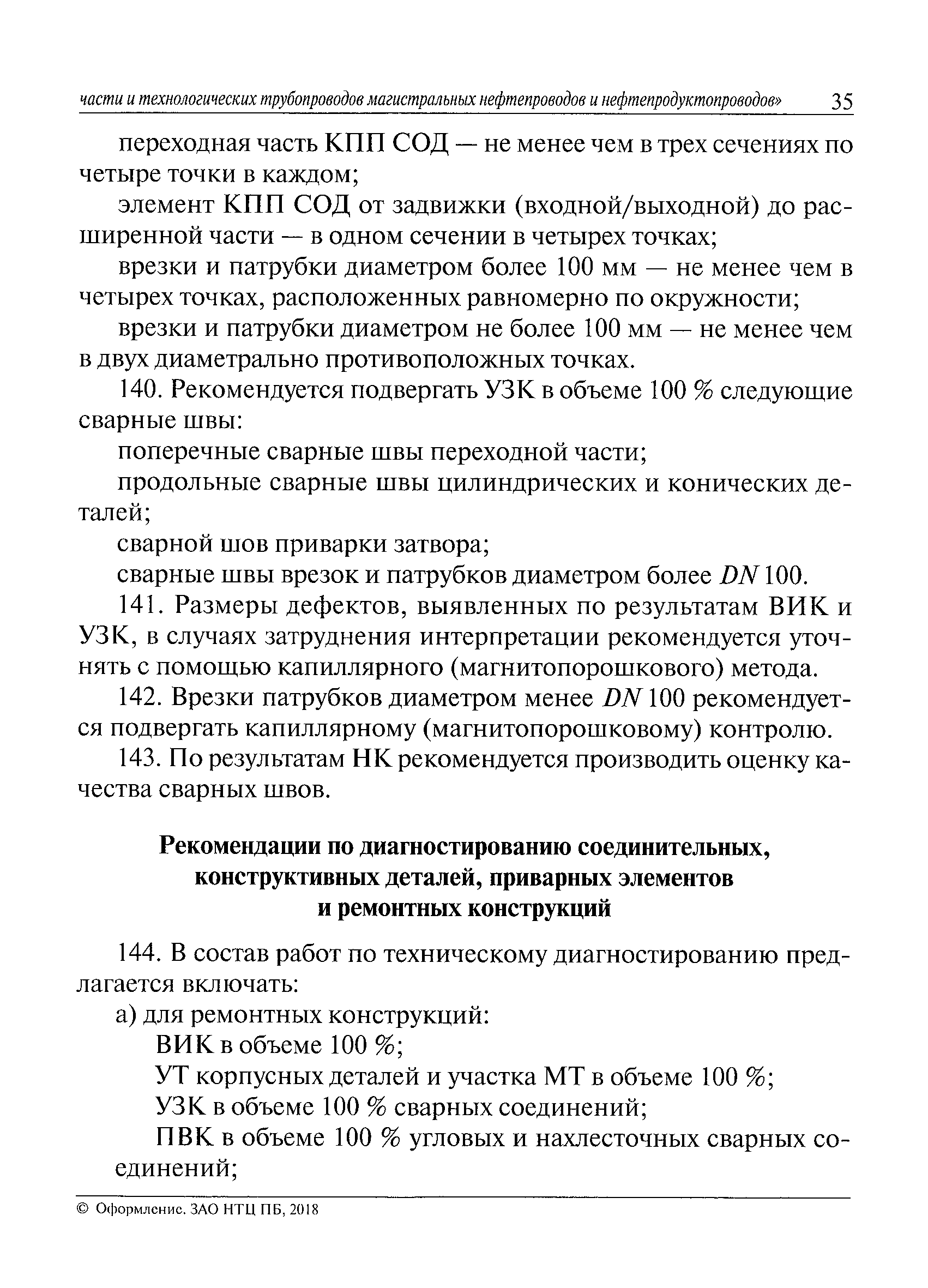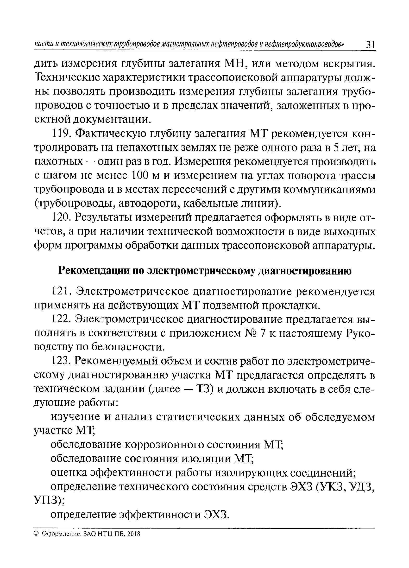 | Оглавление: | I Общие положения II Виды технического диагностирования III Техническое диагностирование линейной части магистральных трубопроводов, законченных строительством. Виды технического диагностирования, выполняемые на трубопроводах, законченных строительством IV Техническое диагностирование линейной части магистральных трубопроводов, находящихся в эксплуатации. Виды технического диагностирования, выполняемые на магистральных трубопроводах, находящихся в эксплуатации V Техническое диагностирование трубопроводов, находящихся в консервации. Виды технического диагностирования, применяемые на трубопроводах, находящихся в консервации, и сроки их проведения VI Техническое диагностирование технологических трубопроводов. Классификация технологических трубопроводов VII Мероприятия по безопасности при испытаниях, очистке и диагностировании трубопровод Приложение 1. Перечень сокращений и их расшифровка Приложение 2. Термины и их определения Приложение 3. Рисунки и таблицы Приложение 4. Рекомендации по методике проведения внутритрубного диагностирования Приложение 5. Рекомендации по видам и срокам проведения технического диагностирования магистральных трубопроводов, находящихся в эксплуатации Приложение 6. Рекомендации по методике выполнения неразрушающего контроля магистральных трубопроводов Приложение 7. Рекомендации по методике проведения работ по электрометрии Приложение 8. Виды работ, проводимые при наружном диагностировании переходов магистральных трубопроводов через водные преграды Приложение 9. Формы предупреждающих знаков Приложение 10. Форма акта на обозначение оборудования и открытых участков трубопровода перед проведением испытаний Приложение 11. Основные рекомендации к выполнению шурфов Приложение 12. Рекомендуемые формы актов при проведении технического диагностирования трубопровода |