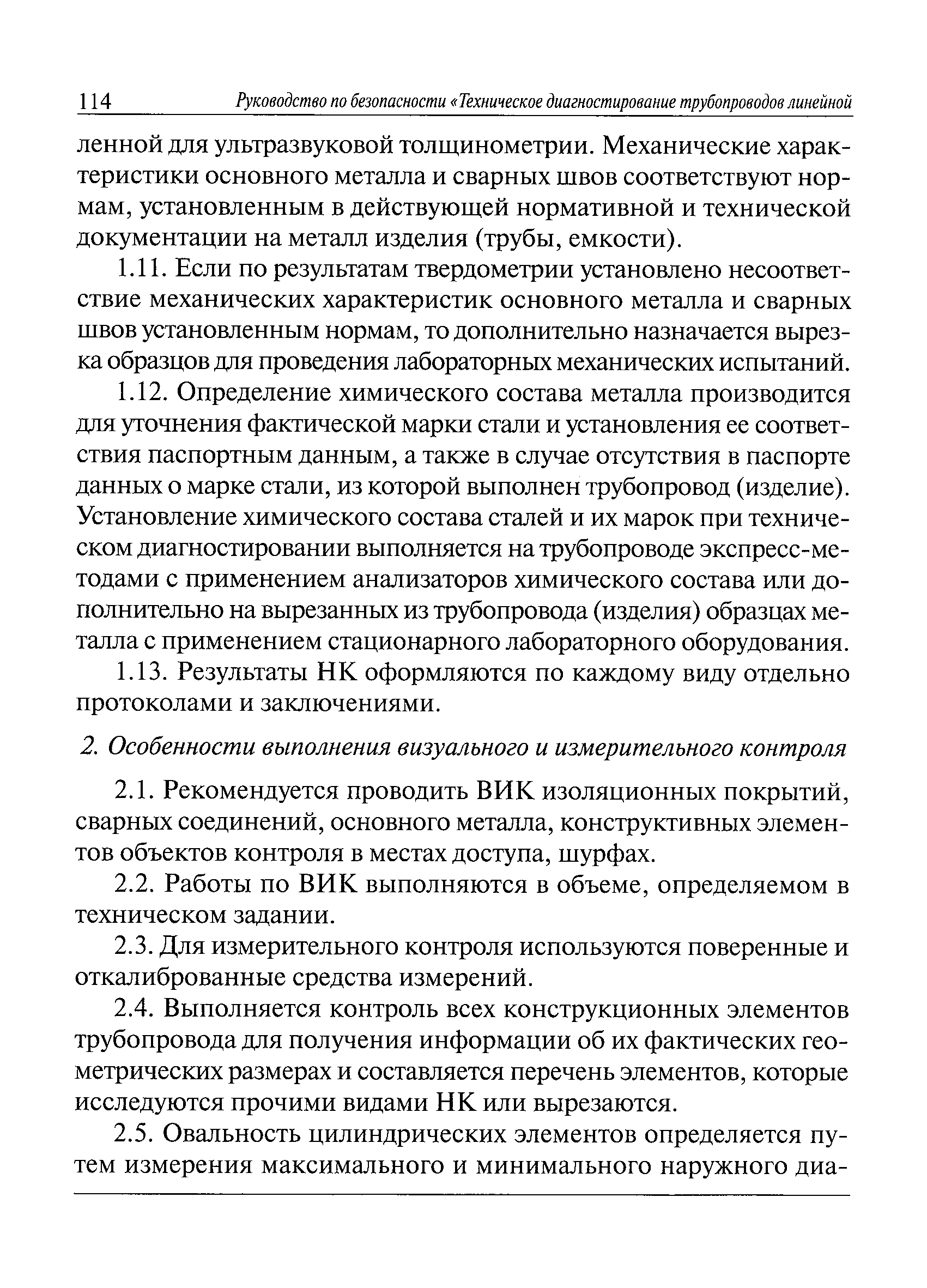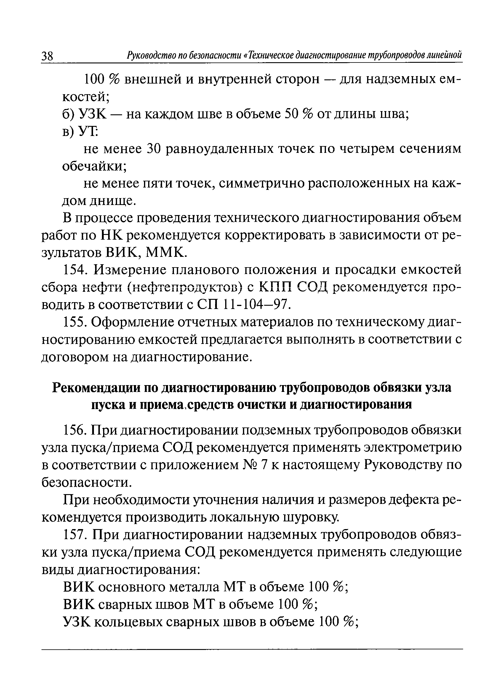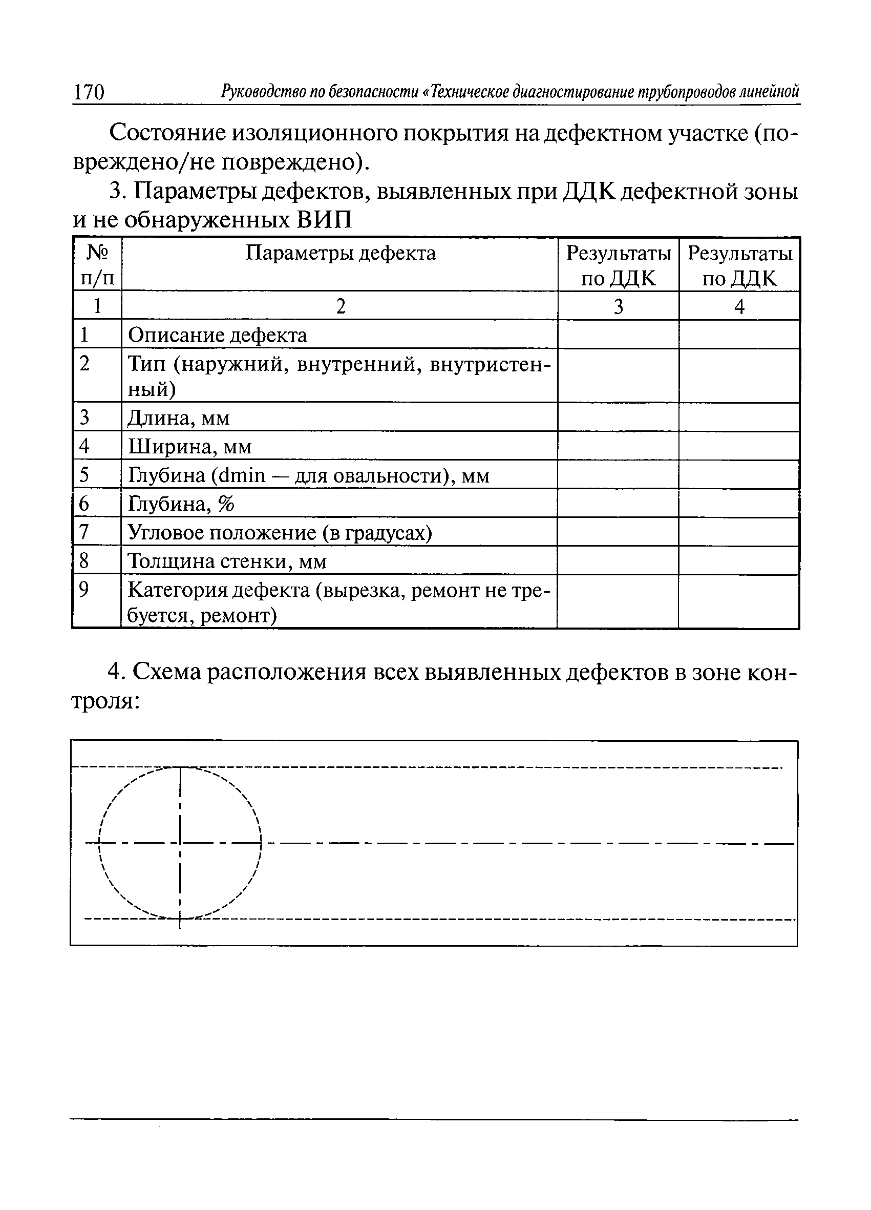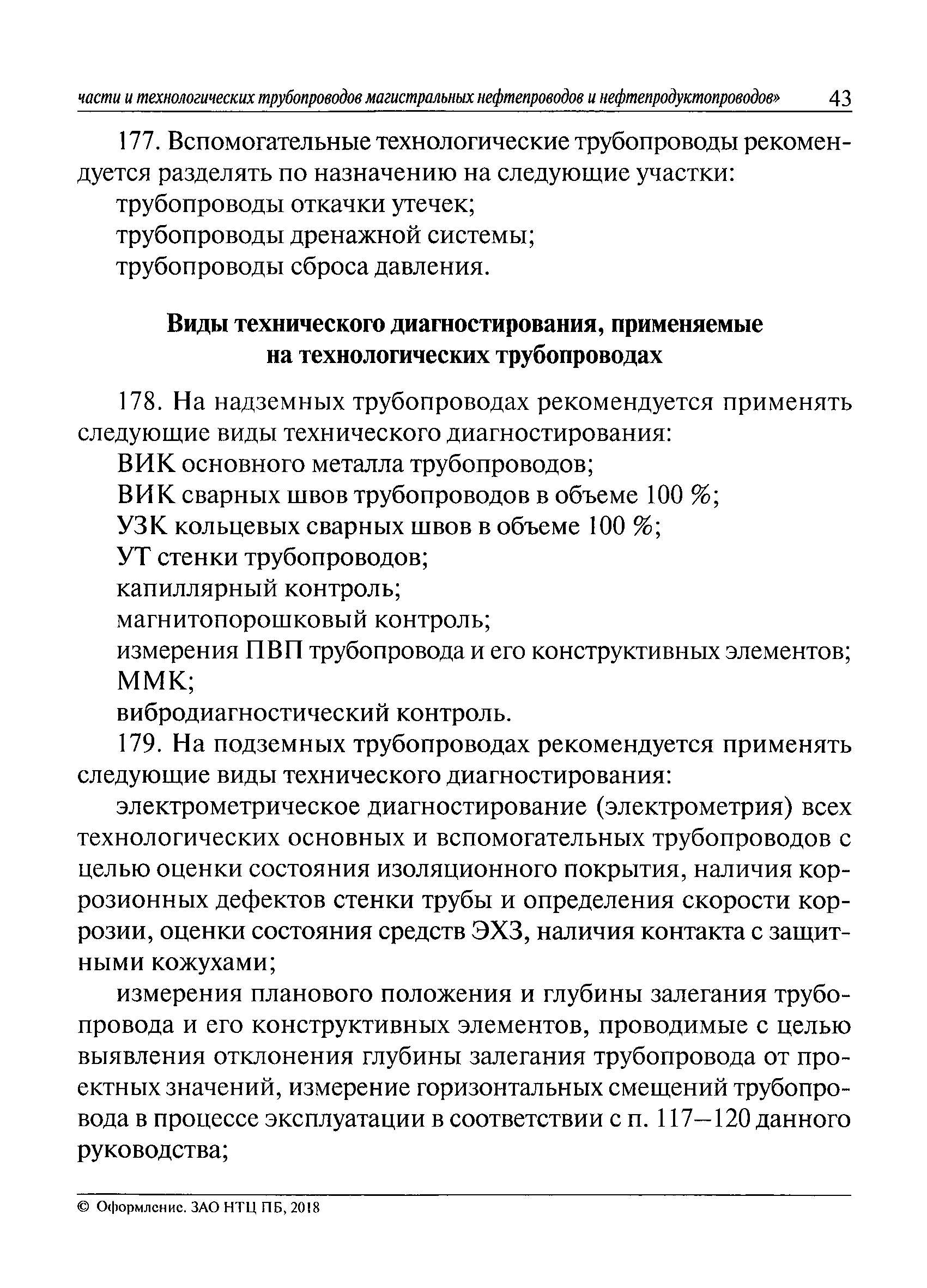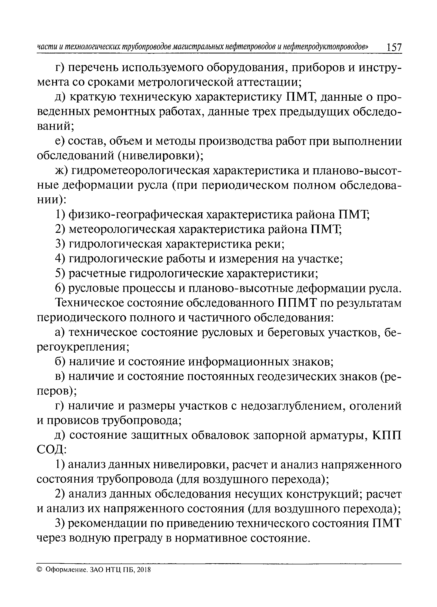 | Оглавление: | I Общие положения II Виды технического диагностирования III Техническое диагностирование линейной части магистральных трубопроводов, законченных строительством. Виды технического диагностирования, выполняемые на трубопроводах, законченных строительством IV Техническое диагностирование линейной части магистральных трубопроводов, находящихся в эксплуатации. Виды технического диагностирования, выполняемые на магистральных трубопроводах, находящихся в эксплуатации V Техническое диагностирование трубопроводов, находящихся в консервации. Виды технического диагностирования, применяемые на трубопроводах, находящихся в консервации, и сроки их проведения VI Техническое диагностирование технологических трубопроводов. Классификация технологических трубопроводов VII Мероприятия по безопасности при испытаниях, очистке и диагностировании трубопровод Приложение 1. Перечень сокращений и их расшифровка Приложение 2. Термины и их определения Приложение 3. Рисунки и таблицы Приложение 4. Рекомендации по методике проведения внутритрубного диагностирования Приложение 5. Рекомендации по видам и срокам проведения технического диагностирования магистральных трубопроводов, находящихся в эксплуатации Приложение 6. Рекомендации по методике выполнения неразрушающего контроля магистральных трубопроводов Приложение 7. Рекомендации по методике проведения работ по электрометрии Приложение 8. Виды работ, проводимые при наружном диагностировании переходов магистральных трубопроводов через водные преграды Приложение 9. Формы предупреждающих знаков Приложение 10. Форма акта на обозначение оборудования и открытых участков трубопровода перед проведением испытаний Приложение 11. Основные рекомендации к выполнению шурфов Приложение 12. Рекомендуемые формы актов при проведении технического диагностирования трубопровода |