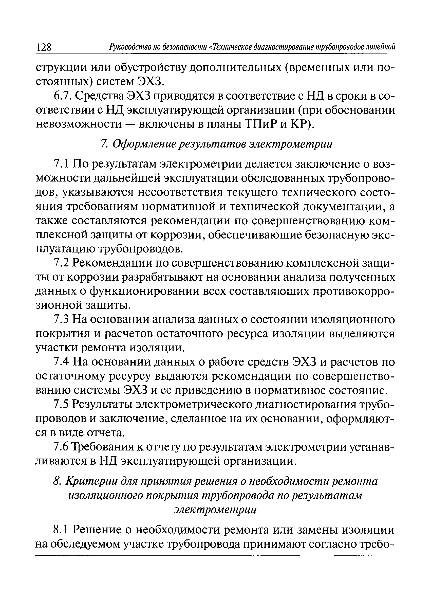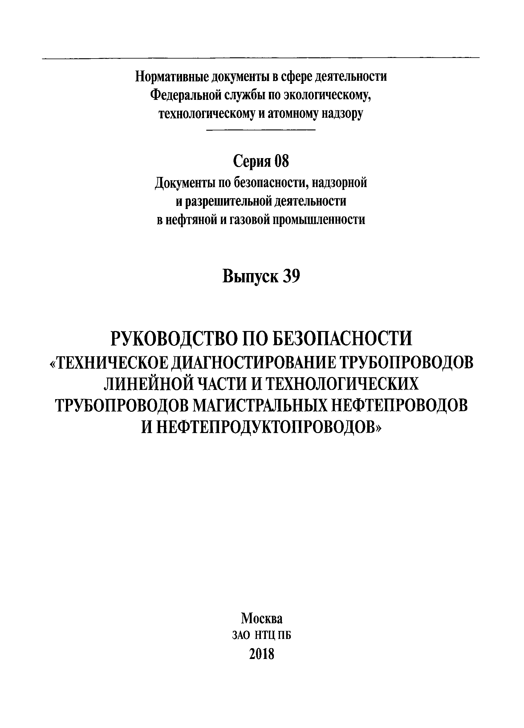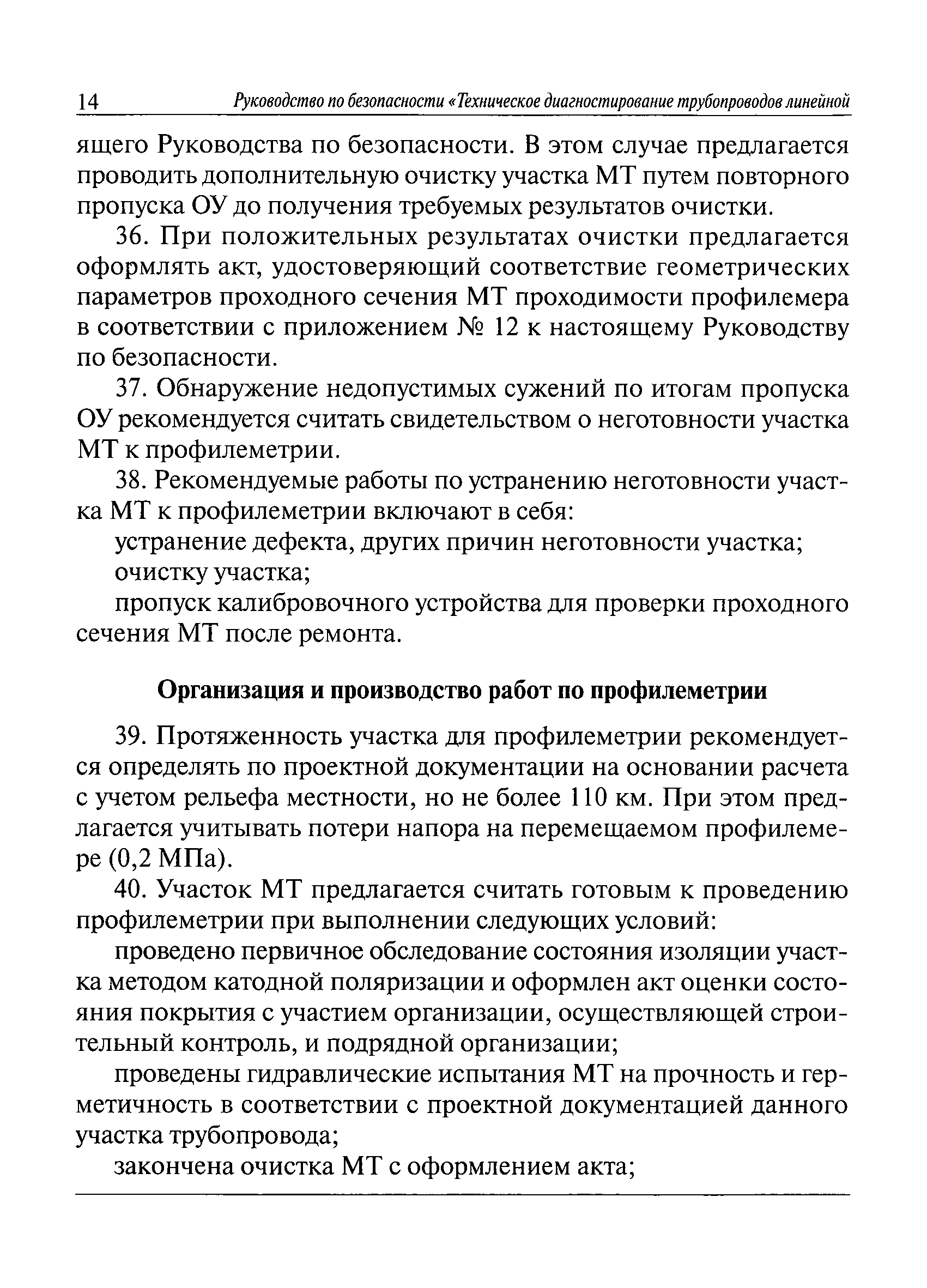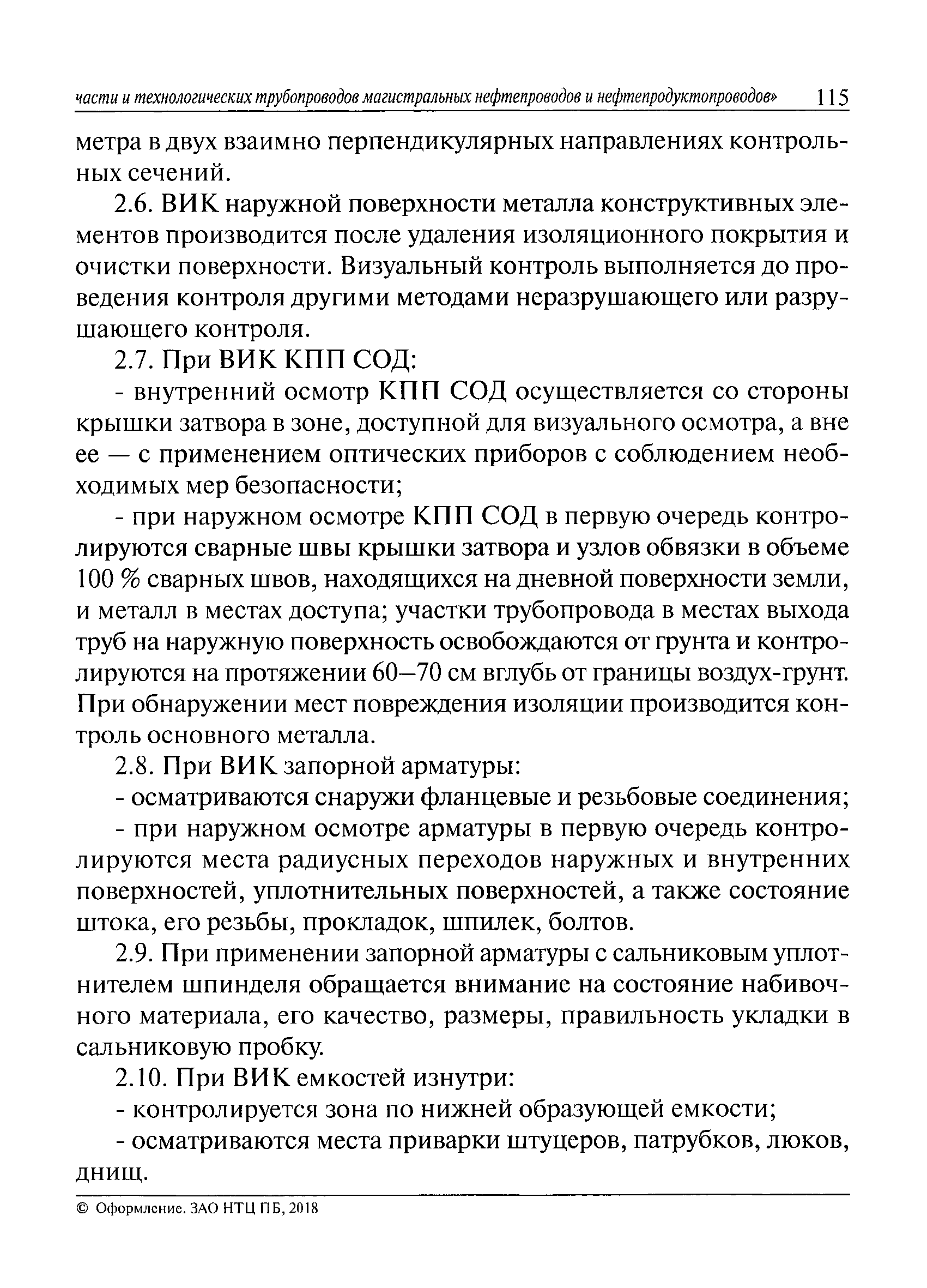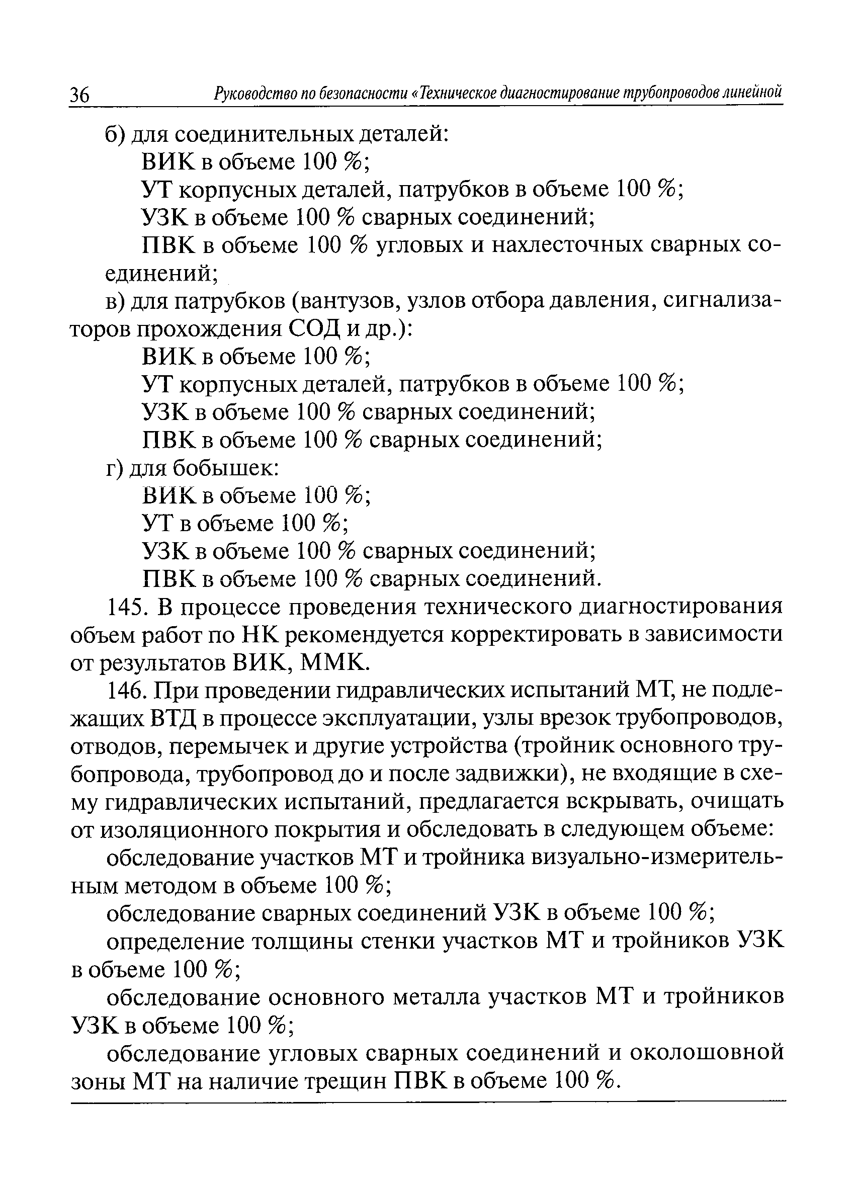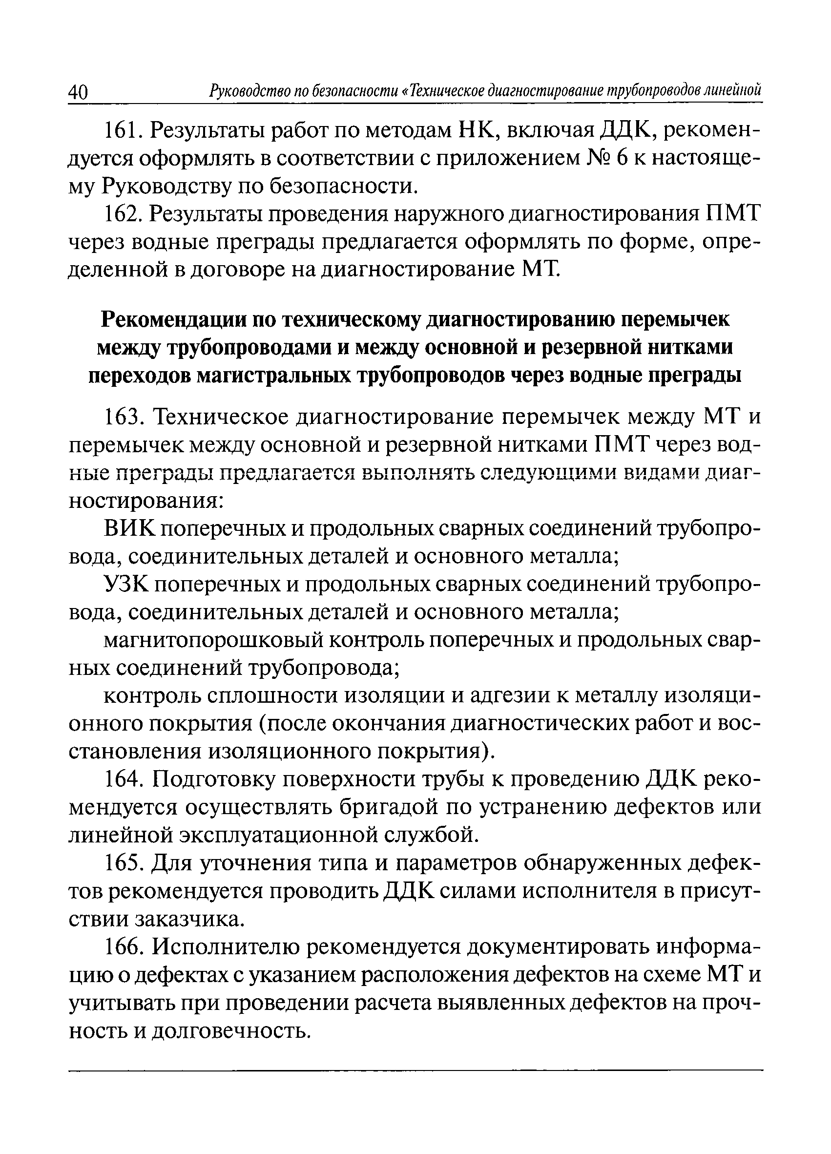 | Оглавление: | I Общие положения II Виды технического диагностирования III Техническое диагностирование линейной части магистральных трубопроводов, законченных строительством. Виды технического диагностирования, выполняемые на трубопроводах, законченных строительством IV Техническое диагностирование линейной части магистральных трубопроводов, находящихся в эксплуатации. Виды технического диагностирования, выполняемые на магистральных трубопроводах, находящихся в эксплуатации V Техническое диагностирование трубопроводов, находящихся в консервации. Виды технического диагностирования, применяемые на трубопроводах, находящихся в консервации, и сроки их проведения VI Техническое диагностирование технологических трубопроводов. Классификация технологических трубопроводов VII Мероприятия по безопасности при испытаниях, очистке и диагностировании трубопровод Приложение 1. Перечень сокращений и их расшифровка Приложение 2. Термины и их определения Приложение 3. Рисунки и таблицы Приложение 4. Рекомендации по методике проведения внутритрубного диагностирования Приложение 5. Рекомендации по видам и срокам проведения технического диагностирования магистральных трубопроводов, находящихся в эксплуатации Приложение 6. Рекомендации по методике выполнения неразрушающего контроля магистральных трубопроводов Приложение 7. Рекомендации по методике проведения работ по электрометрии Приложение 8. Виды работ, проводимые при наружном диагностировании переходов магистральных трубопроводов через водные преграды Приложение 9. Формы предупреждающих знаков Приложение 10. Форма акта на обозначение оборудования и открытых участков трубопровода перед проведением испытаний Приложение 11. Основные рекомендации к выполнению шурфов Приложение 12. Рекомендуемые формы актов при проведении технического диагностирования трубопровода |