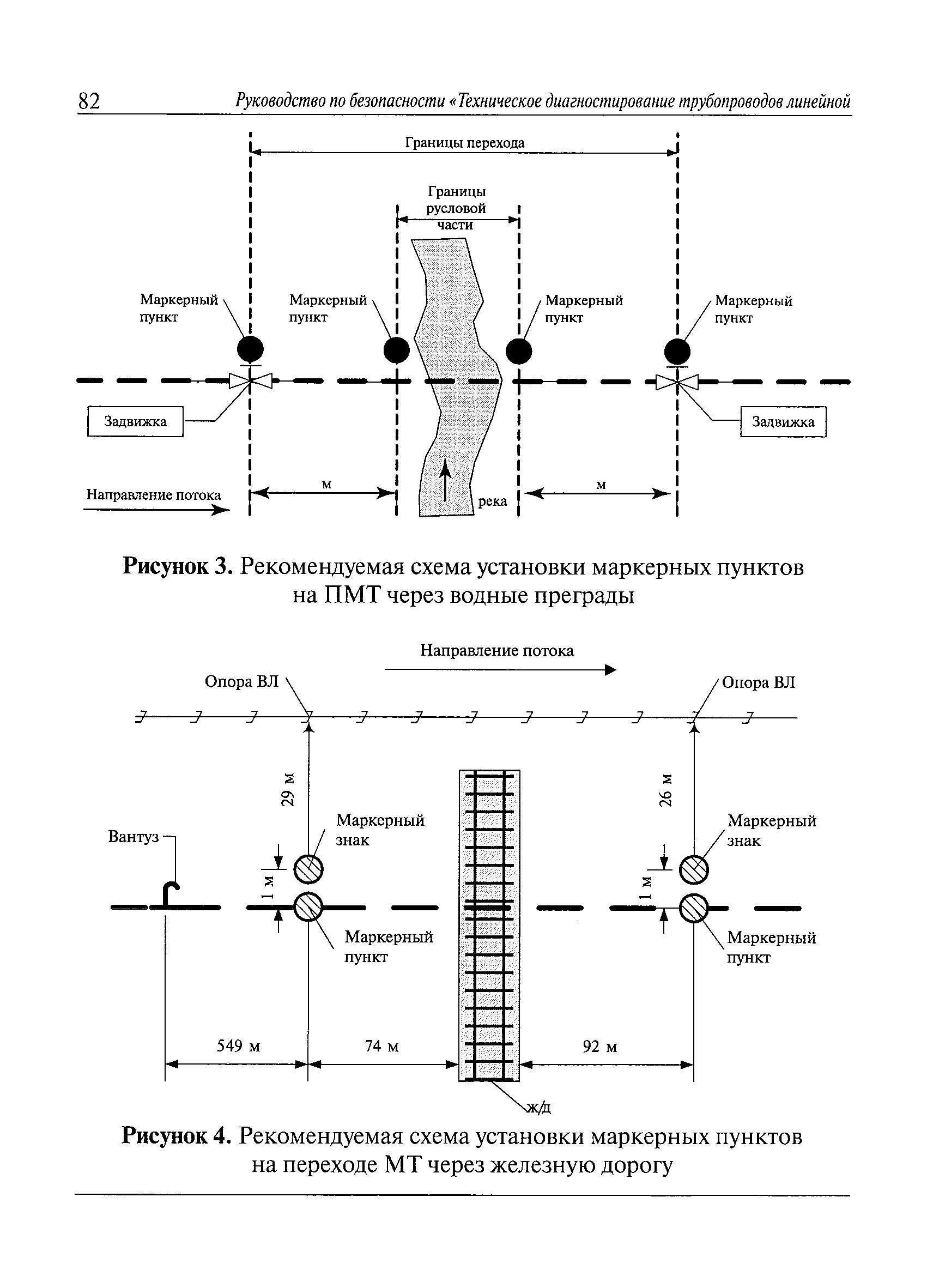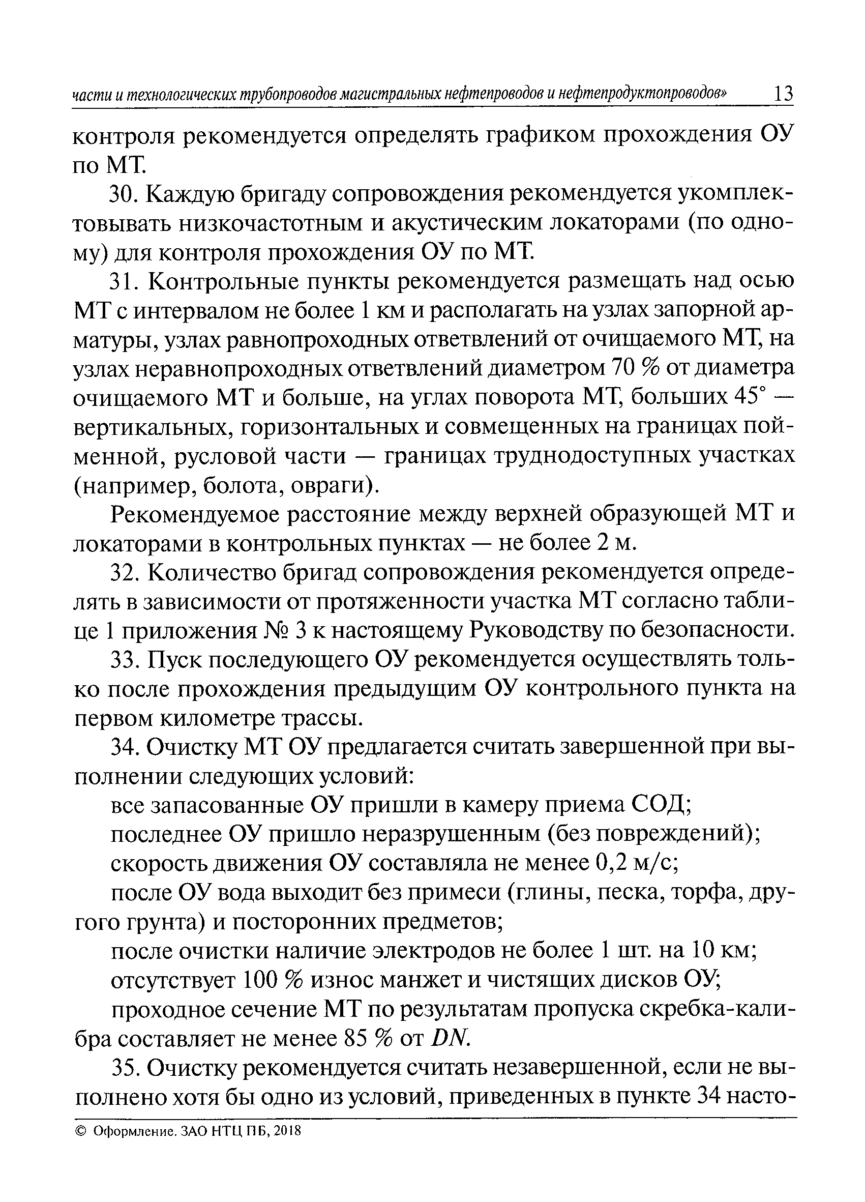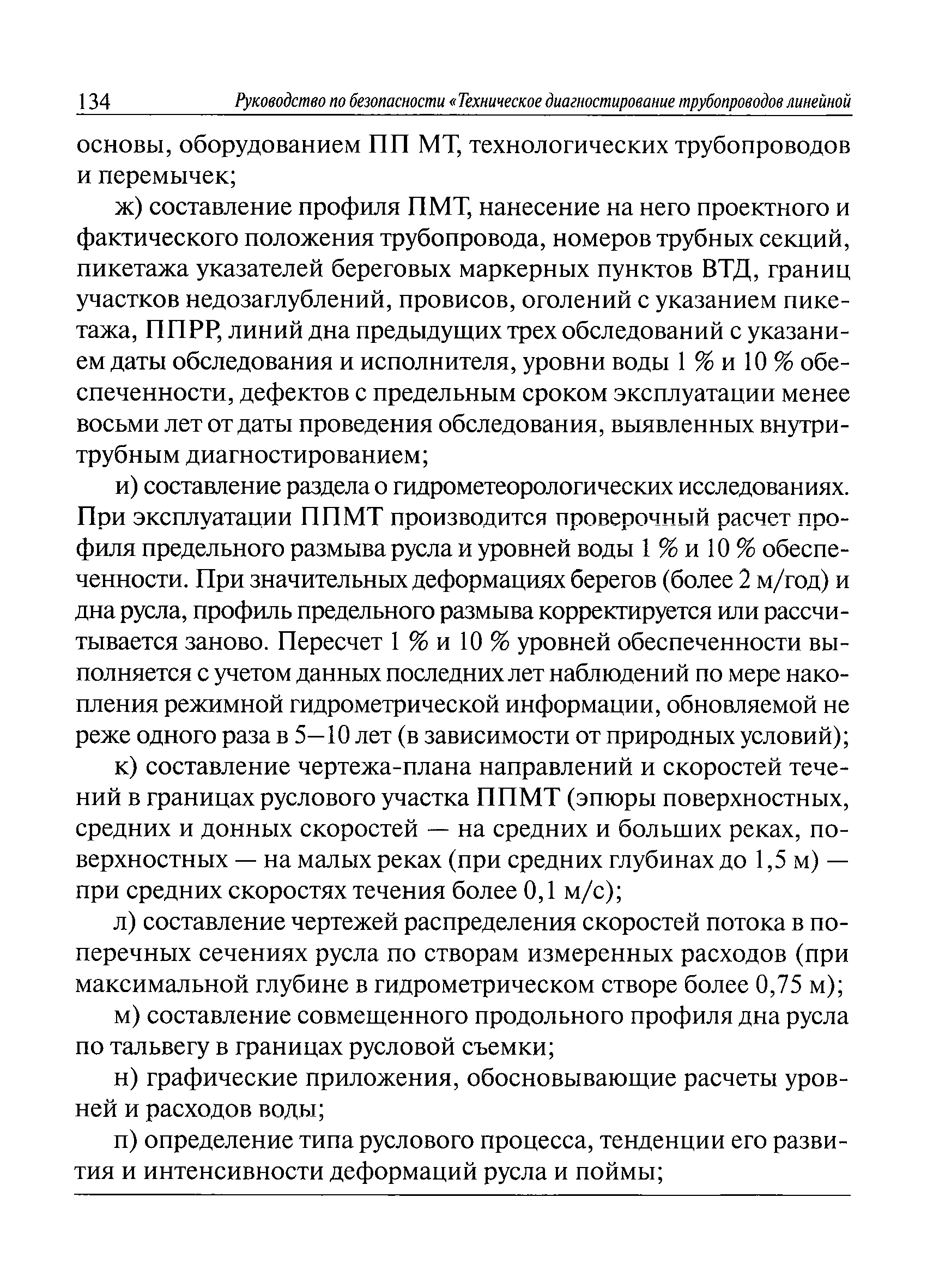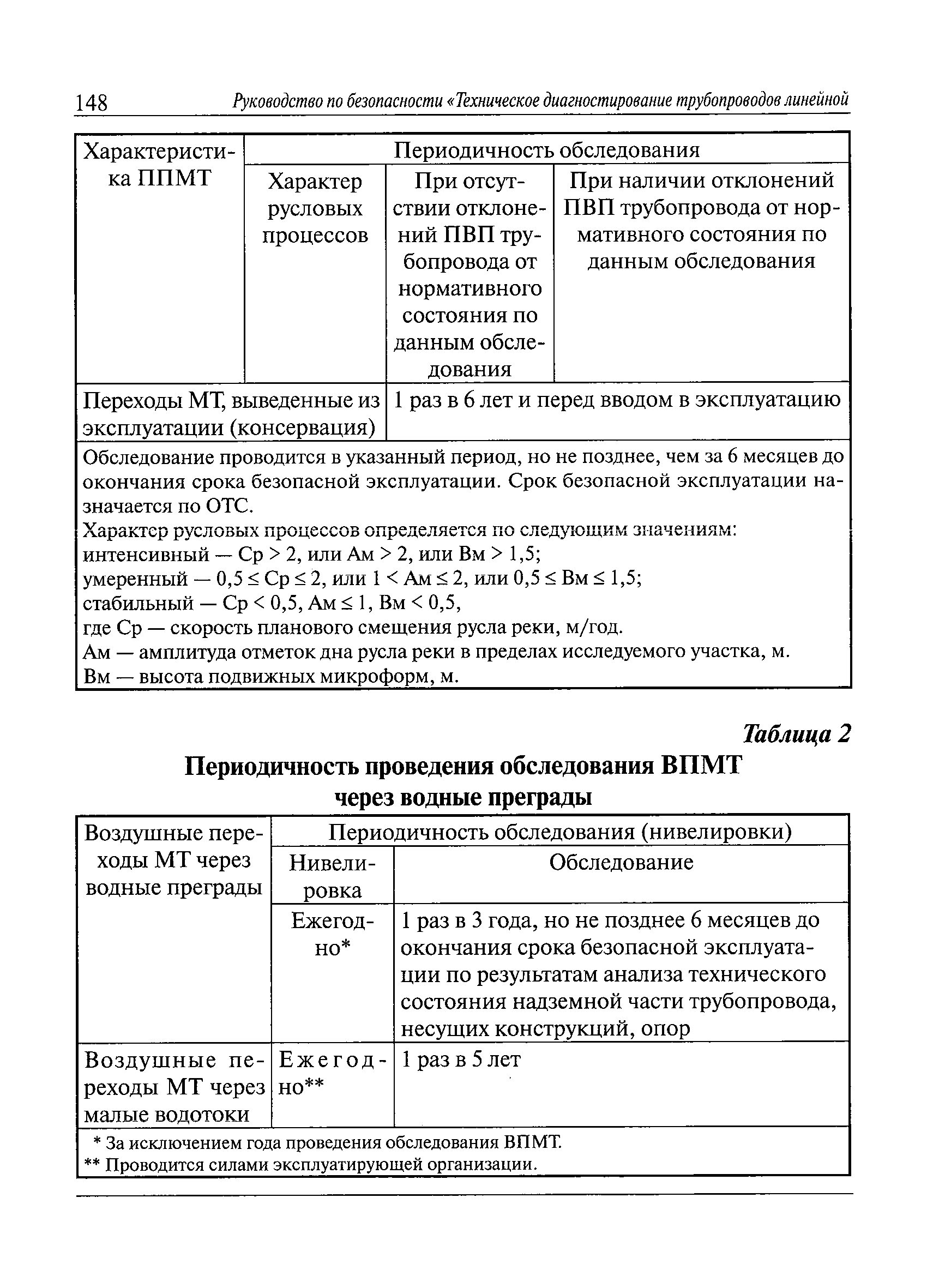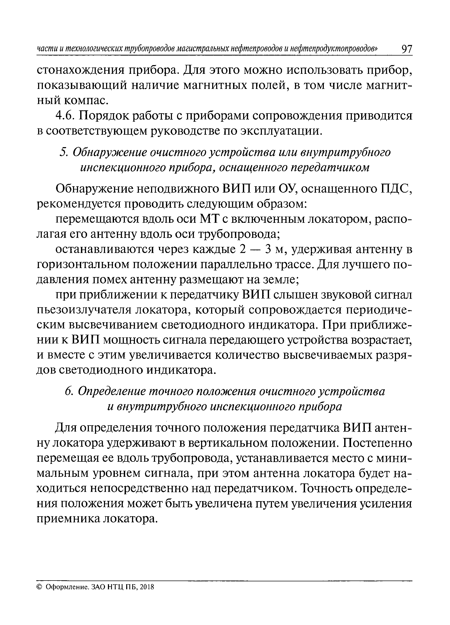 | Оглавление: | I Общие положения II Виды технического диагностирования III Техническое диагностирование линейной части магистральных трубопроводов, законченных строительством. Виды технического диагностирования, выполняемые на трубопроводах, законченных строительством IV Техническое диагностирование линейной части магистральных трубопроводов, находящихся в эксплуатации. Виды технического диагностирования, выполняемые на магистральных трубопроводах, находящихся в эксплуатации V Техническое диагностирование трубопроводов, находящихся в консервации. Виды технического диагностирования, применяемые на трубопроводах, находящихся в консервации, и сроки их проведения VI Техническое диагностирование технологических трубопроводов. Классификация технологических трубопроводов VII Мероприятия по безопасности при испытаниях, очистке и диагностировании трубопровод Приложение 1. Перечень сокращений и их расшифровка Приложение 2. Термины и их определения Приложение 3. Рисунки и таблицы Приложение 4. Рекомендации по методике проведения внутритрубного диагностирования Приложение 5. Рекомендации по видам и срокам проведения технического диагностирования магистральных трубопроводов, находящихся в эксплуатации Приложение 6. Рекомендации по методике выполнения неразрушающего контроля магистральных трубопроводов Приложение 7. Рекомендации по методике проведения работ по электрометрии Приложение 8. Виды работ, проводимые при наружном диагностировании переходов магистральных трубопроводов через водные преграды Приложение 9. Формы предупреждающих знаков Приложение 10. Форма акта на обозначение оборудования и открытых участков трубопровода перед проведением испытаний Приложение 11. Основные рекомендации к выполнению шурфов Приложение 12. Рекомендуемые формы актов при проведении технического диагностирования трубопровода |