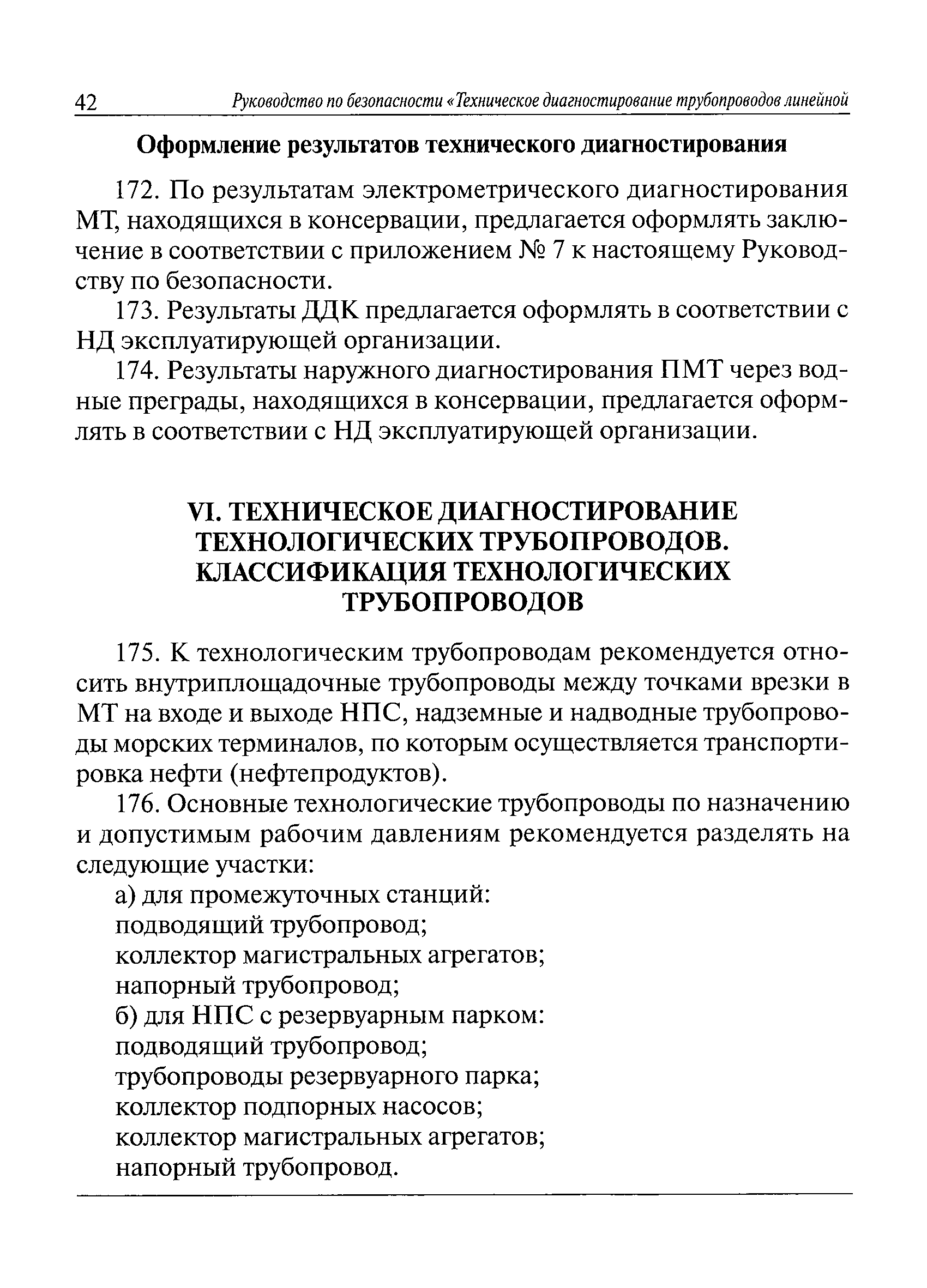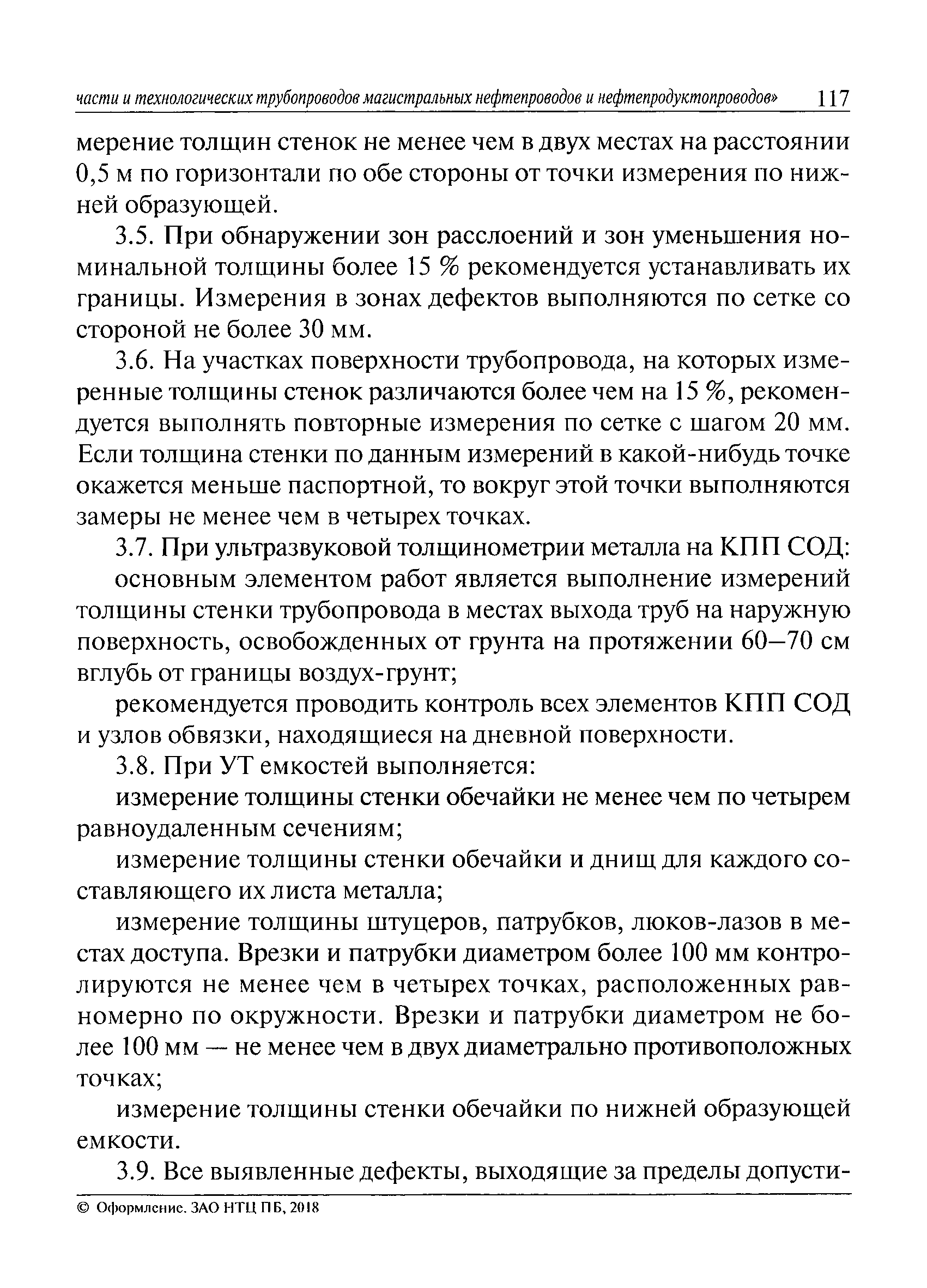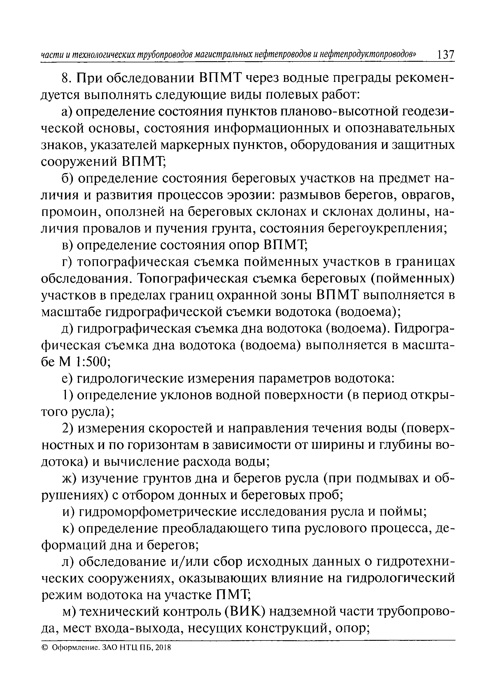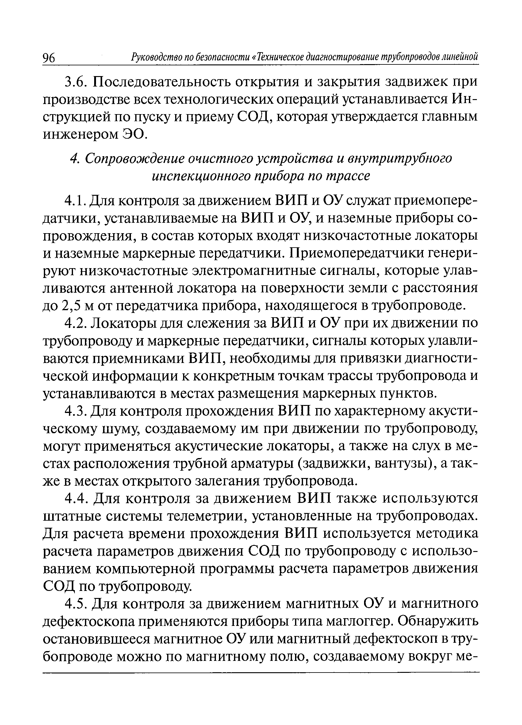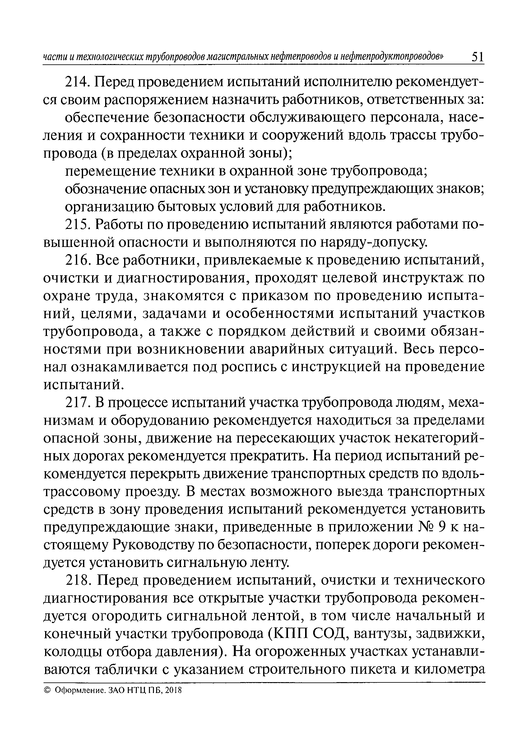 | Оглавление: | I Общие положения II Виды технического диагностирования III Техническое диагностирование линейной части магистральных трубопроводов, законченных строительством. Виды технического диагностирования, выполняемые на трубопроводах, законченных строительством IV Техническое диагностирование линейной части магистральных трубопроводов, находящихся в эксплуатации. Виды технического диагностирования, выполняемые на магистральных трубопроводах, находящихся в эксплуатации V Техническое диагностирование трубопроводов, находящихся в консервации. Виды технического диагностирования, применяемые на трубопроводах, находящихся в консервации, и сроки их проведения VI Техническое диагностирование технологических трубопроводов. Классификация технологических трубопроводов VII Мероприятия по безопасности при испытаниях, очистке и диагностировании трубопровод Приложение 1. Перечень сокращений и их расшифровка Приложение 2. Термины и их определения Приложение 3. Рисунки и таблицы Приложение 4. Рекомендации по методике проведения внутритрубного диагностирования Приложение 5. Рекомендации по видам и срокам проведения технического диагностирования магистральных трубопроводов, находящихся в эксплуатации Приложение 6. Рекомендации по методике выполнения неразрушающего контроля магистральных трубопроводов Приложение 7. Рекомендации по методике проведения работ по электрометрии Приложение 8. Виды работ, проводимые при наружном диагностировании переходов магистральных трубопроводов через водные преграды Приложение 9. Формы предупреждающих знаков Приложение 10. Форма акта на обозначение оборудования и открытых участков трубопровода перед проведением испытаний Приложение 11. Основные рекомендации к выполнению шурфов Приложение 12. Рекомендуемые формы актов при проведении технического диагностирования трубопровода |