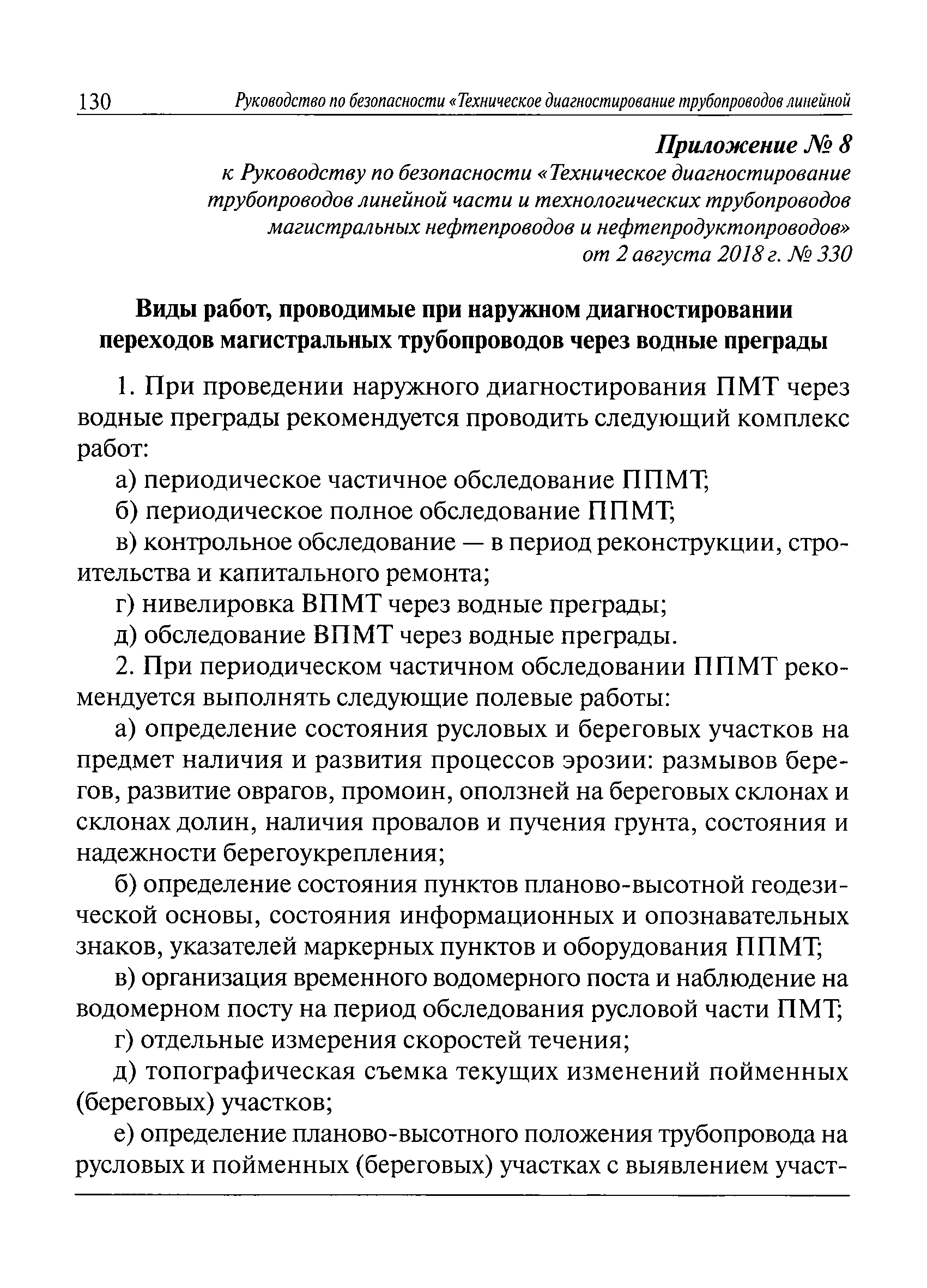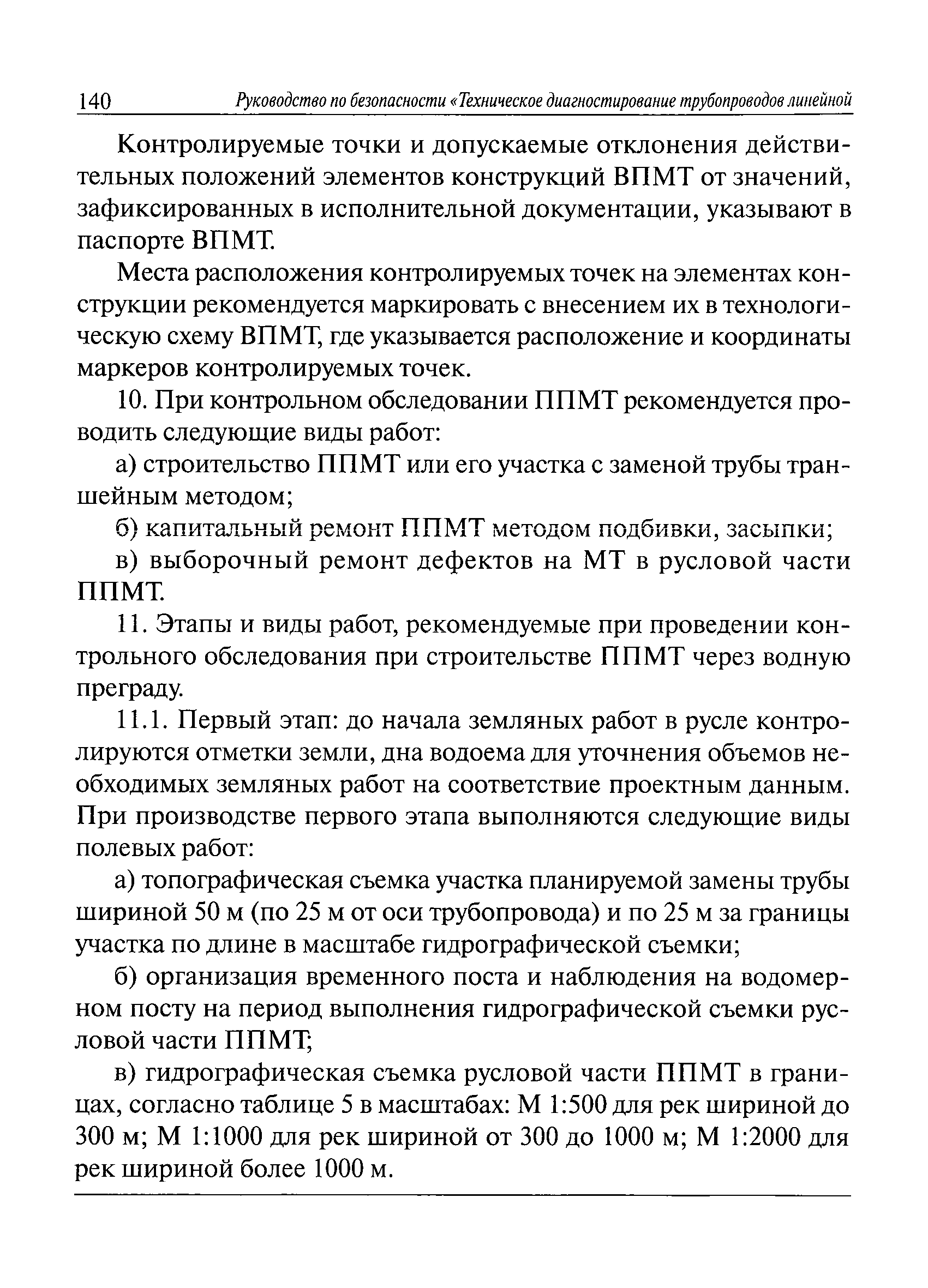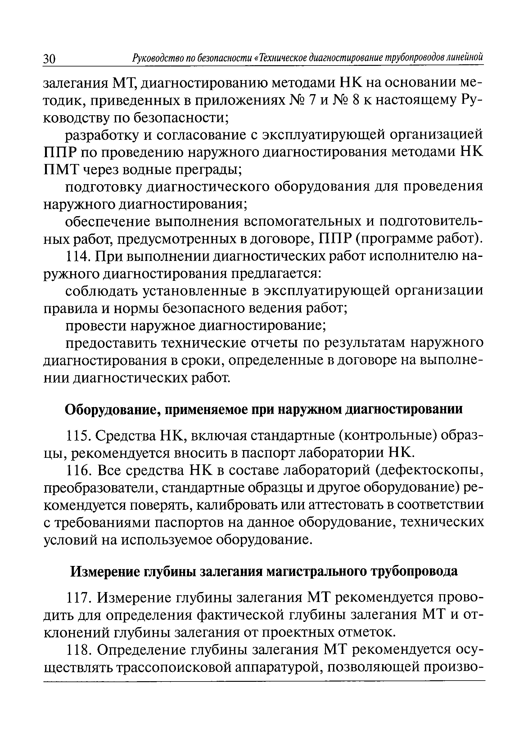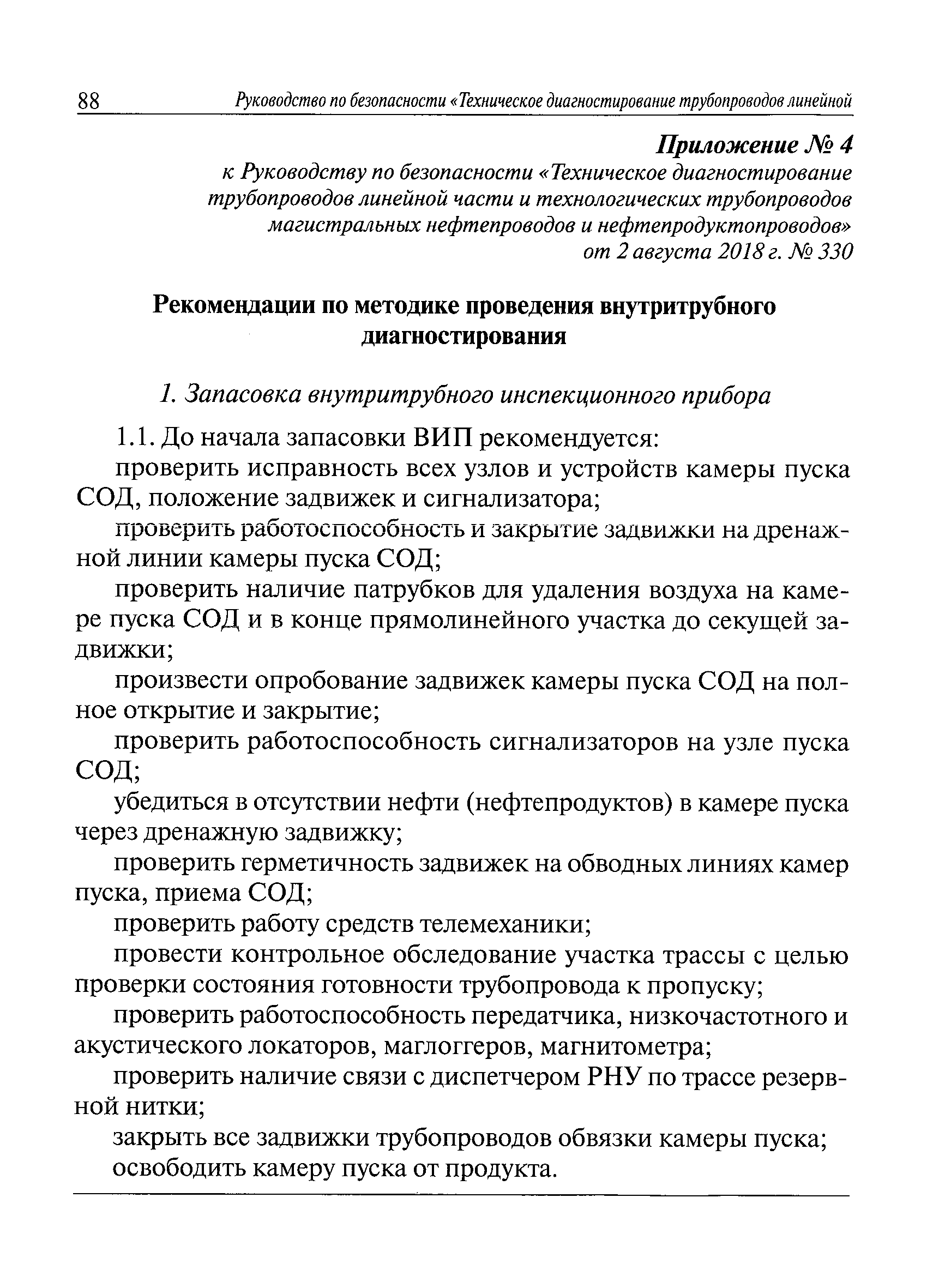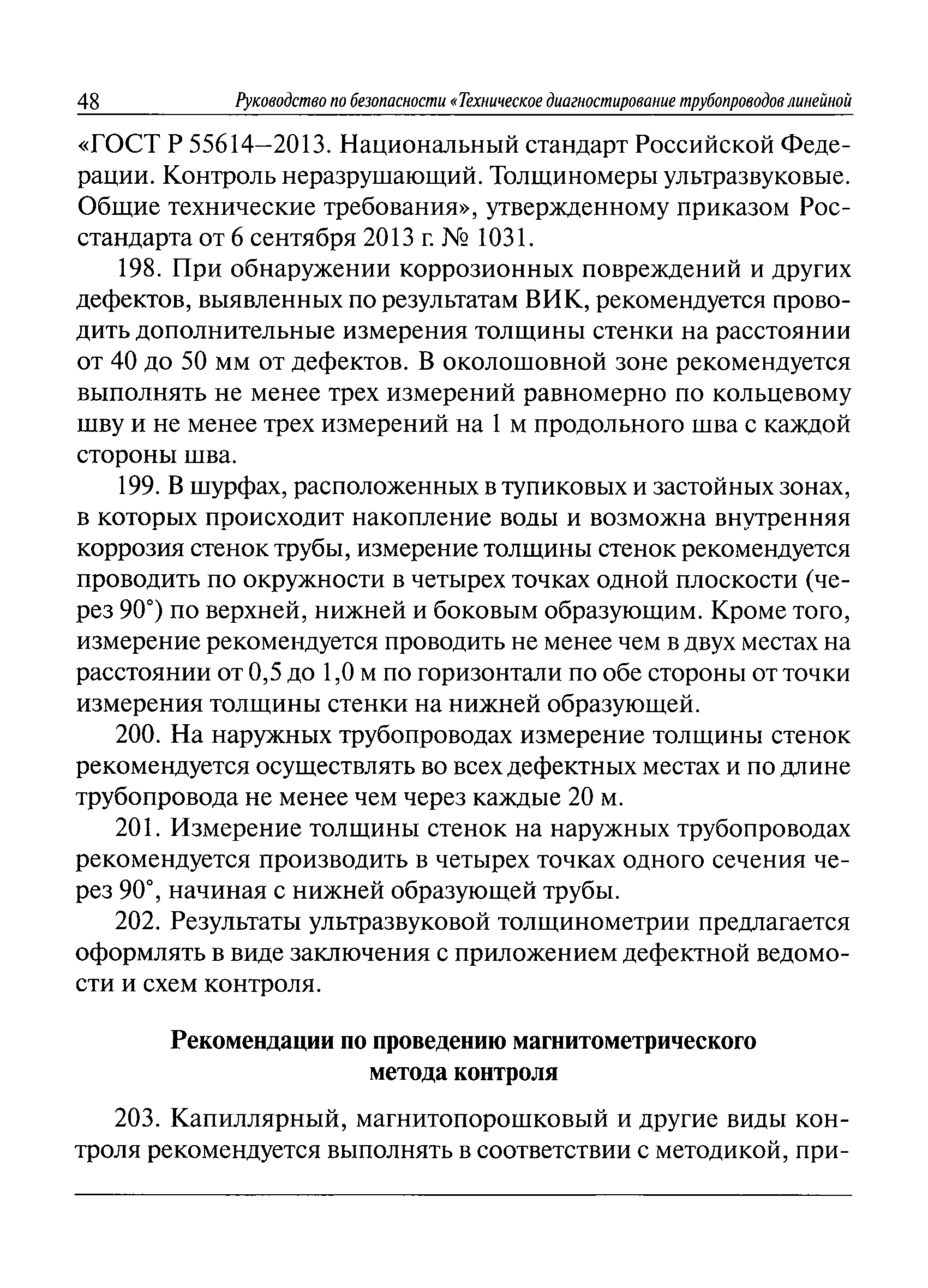 | Оглавление: | I Общие положения II Виды технического диагностирования III Техническое диагностирование линейной части магистральных трубопроводов, законченных строительством. Виды технического диагностирования, выполняемые на трубопроводах, законченных строительством IV Техническое диагностирование линейной части магистральных трубопроводов, находящихся в эксплуатации. Виды технического диагностирования, выполняемые на магистральных трубопроводах, находящихся в эксплуатации V Техническое диагностирование трубопроводов, находящихся в консервации. Виды технического диагностирования, применяемые на трубопроводах, находящихся в консервации, и сроки их проведения VI Техническое диагностирование технологических трубопроводов. Классификация технологических трубопроводов VII Мероприятия по безопасности при испытаниях, очистке и диагностировании трубопровод Приложение 1. Перечень сокращений и их расшифровка Приложение 2. Термины и их определения Приложение 3. Рисунки и таблицы Приложение 4. Рекомендации по методике проведения внутритрубного диагностирования Приложение 5. Рекомендации по видам и срокам проведения технического диагностирования магистральных трубопроводов, находящихся в эксплуатации Приложение 6. Рекомендации по методике выполнения неразрушающего контроля магистральных трубопроводов Приложение 7. Рекомендации по методике проведения работ по электрометрии Приложение 8. Виды работ, проводимые при наружном диагностировании переходов магистральных трубопроводов через водные преграды Приложение 9. Формы предупреждающих знаков Приложение 10. Форма акта на обозначение оборудования и открытых участков трубопровода перед проведением испытаний Приложение 11. Основные рекомендации к выполнению шурфов Приложение 12. Рекомендуемые формы актов при проведении технического диагностирования трубопровода |