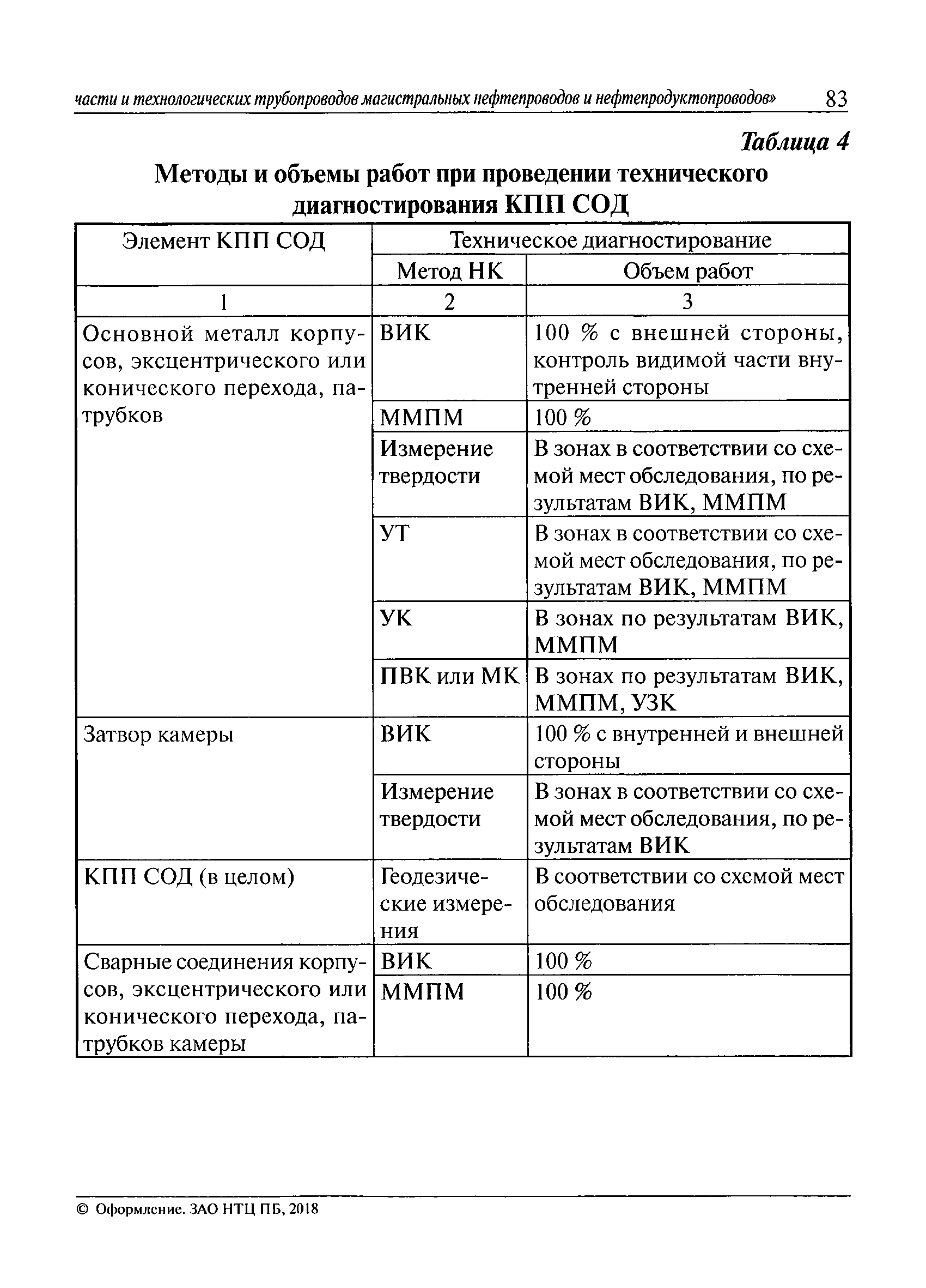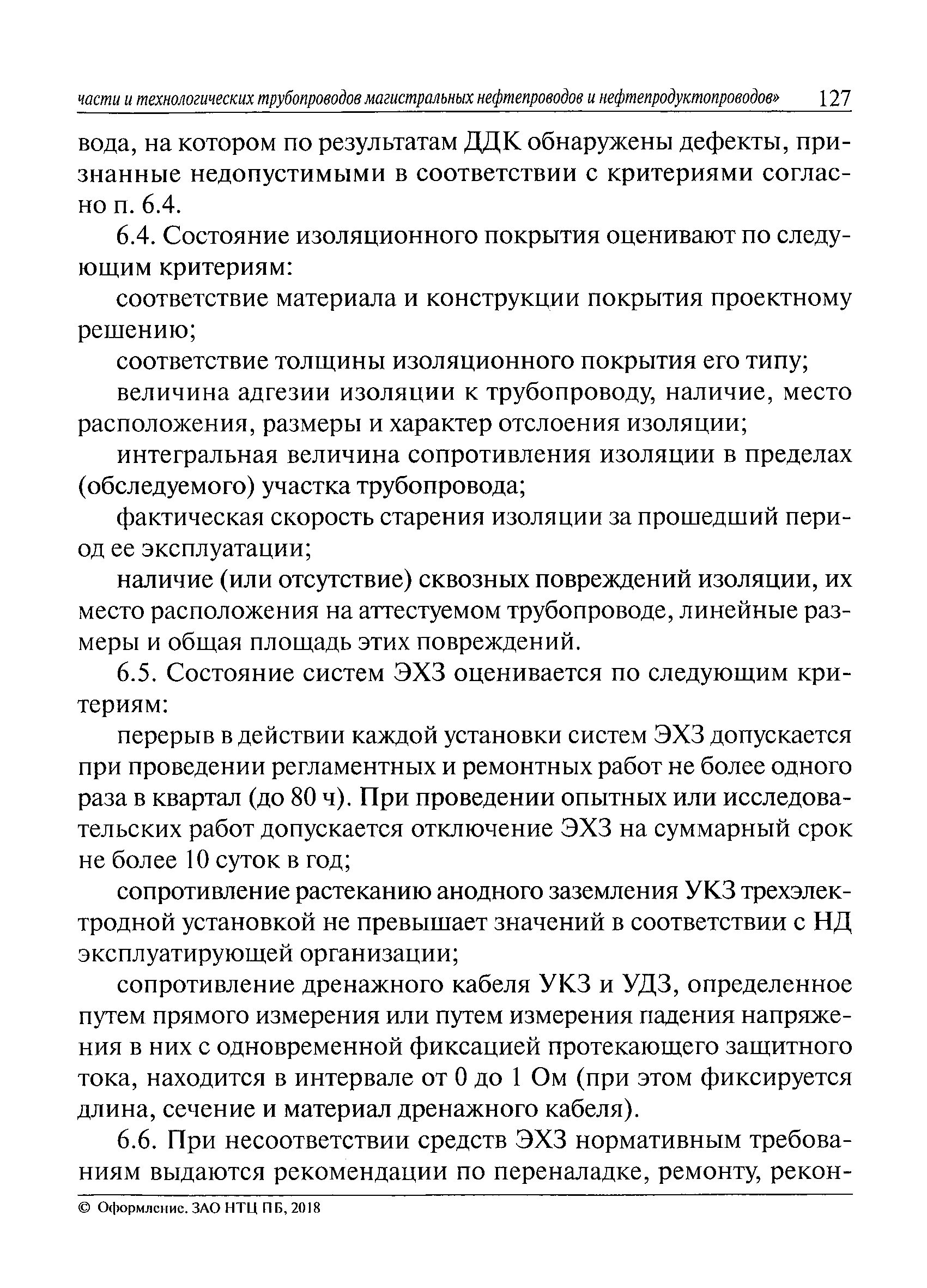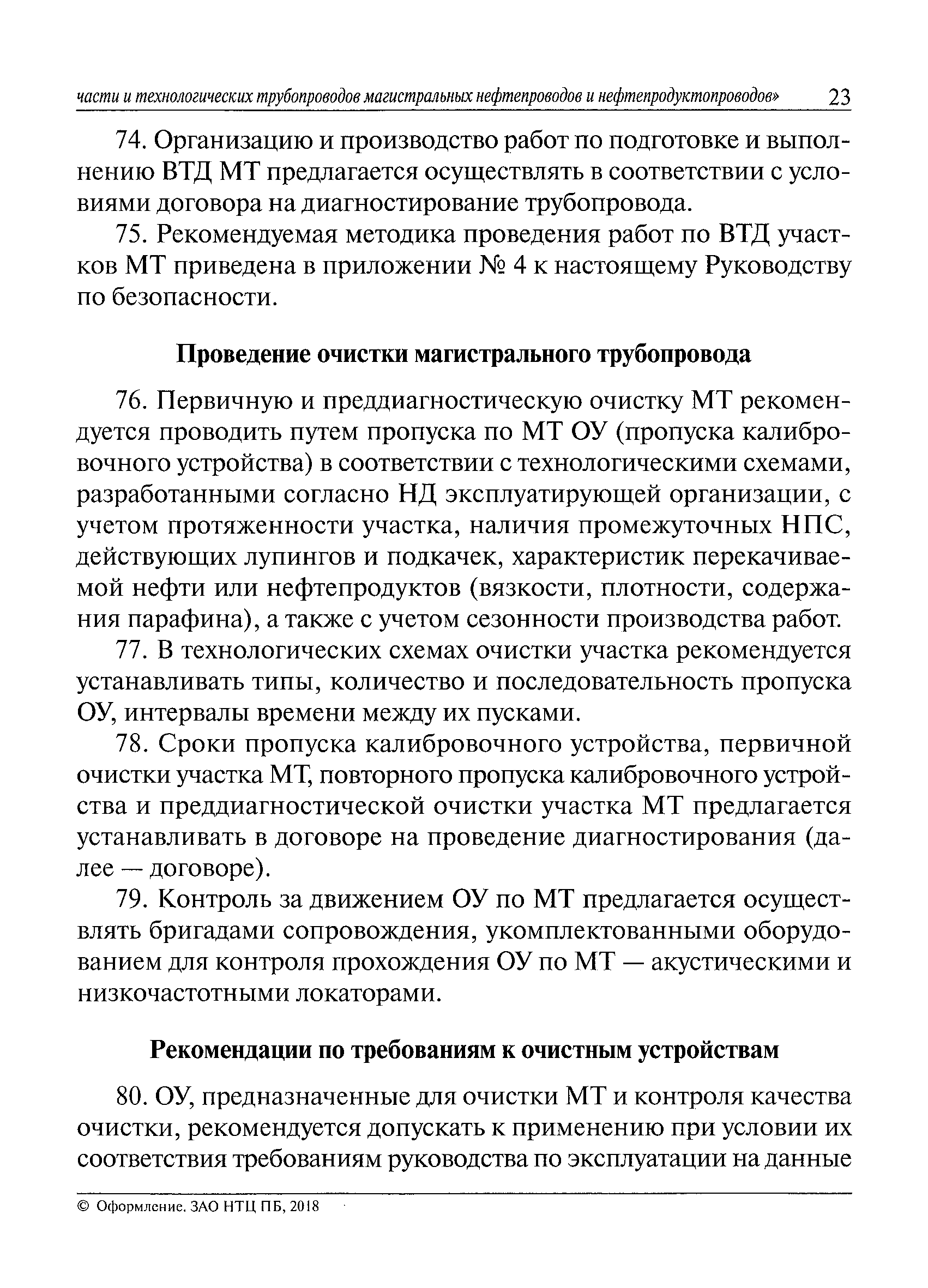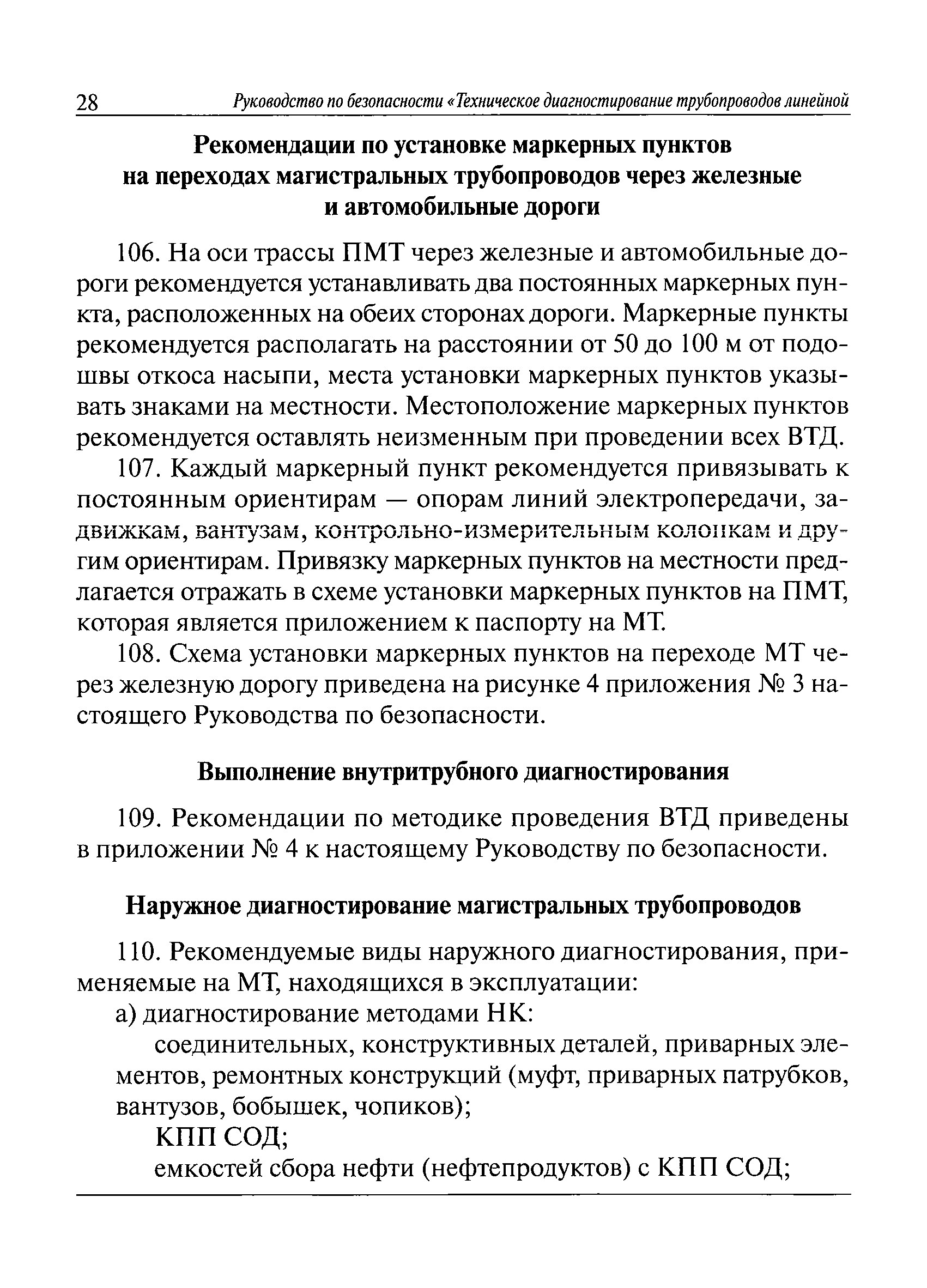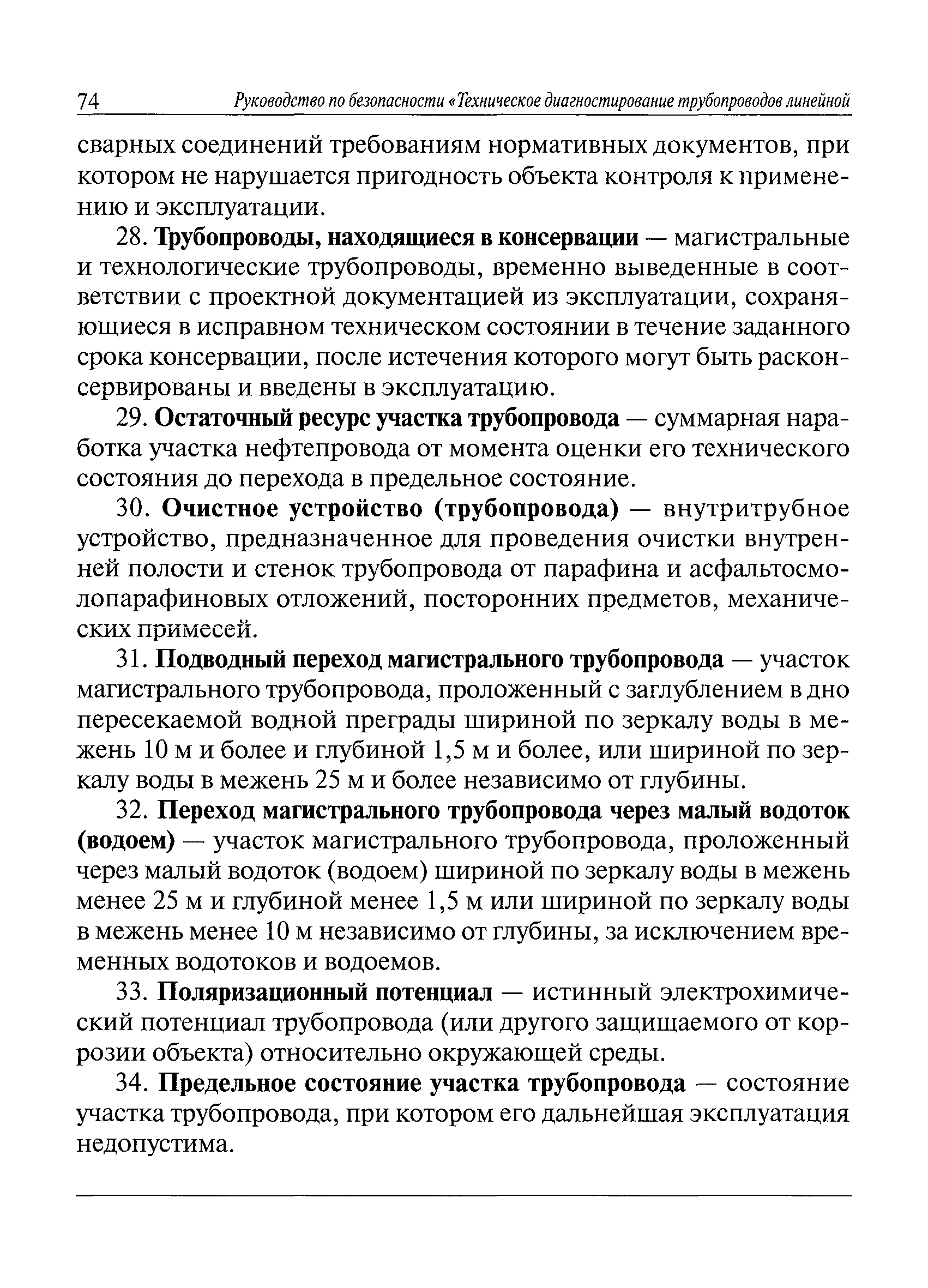 | Оглавление: | I Общие положения II Виды технического диагностирования III Техническое диагностирование линейной части магистральных трубопроводов, законченных строительством. Виды технического диагностирования, выполняемые на трубопроводах, законченных строительством IV Техническое диагностирование линейной части магистральных трубопроводов, находящихся в эксплуатации. Виды технического диагностирования, выполняемые на магистральных трубопроводах, находящихся в эксплуатации V Техническое диагностирование трубопроводов, находящихся в консервации. Виды технического диагностирования, применяемые на трубопроводах, находящихся в консервации, и сроки их проведения VI Техническое диагностирование технологических трубопроводов. Классификация технологических трубопроводов VII Мероприятия по безопасности при испытаниях, очистке и диагностировании трубопровод Приложение 1. Перечень сокращений и их расшифровка Приложение 2. Термины и их определения Приложение 3. Рисунки и таблицы Приложение 4. Рекомендации по методике проведения внутритрубного диагностирования Приложение 5. Рекомендации по видам и срокам проведения технического диагностирования магистральных трубопроводов, находящихся в эксплуатации Приложение 6. Рекомендации по методике выполнения неразрушающего контроля магистральных трубопроводов Приложение 7. Рекомендации по методике проведения работ по электрометрии Приложение 8. Виды работ, проводимые при наружном диагностировании переходов магистральных трубопроводов через водные преграды Приложение 9. Формы предупреждающих знаков Приложение 10. Форма акта на обозначение оборудования и открытых участков трубопровода перед проведением испытаний Приложение 11. Основные рекомендации к выполнению шурфов Приложение 12. Рекомендуемые формы актов при проведении технического диагностирования трубопровода |