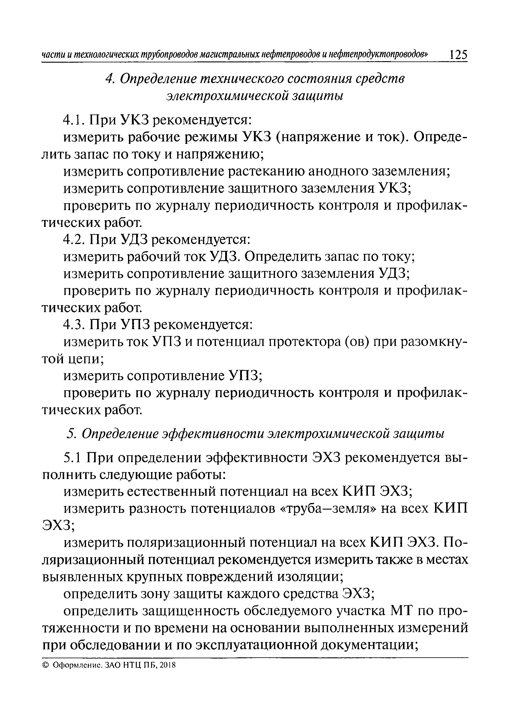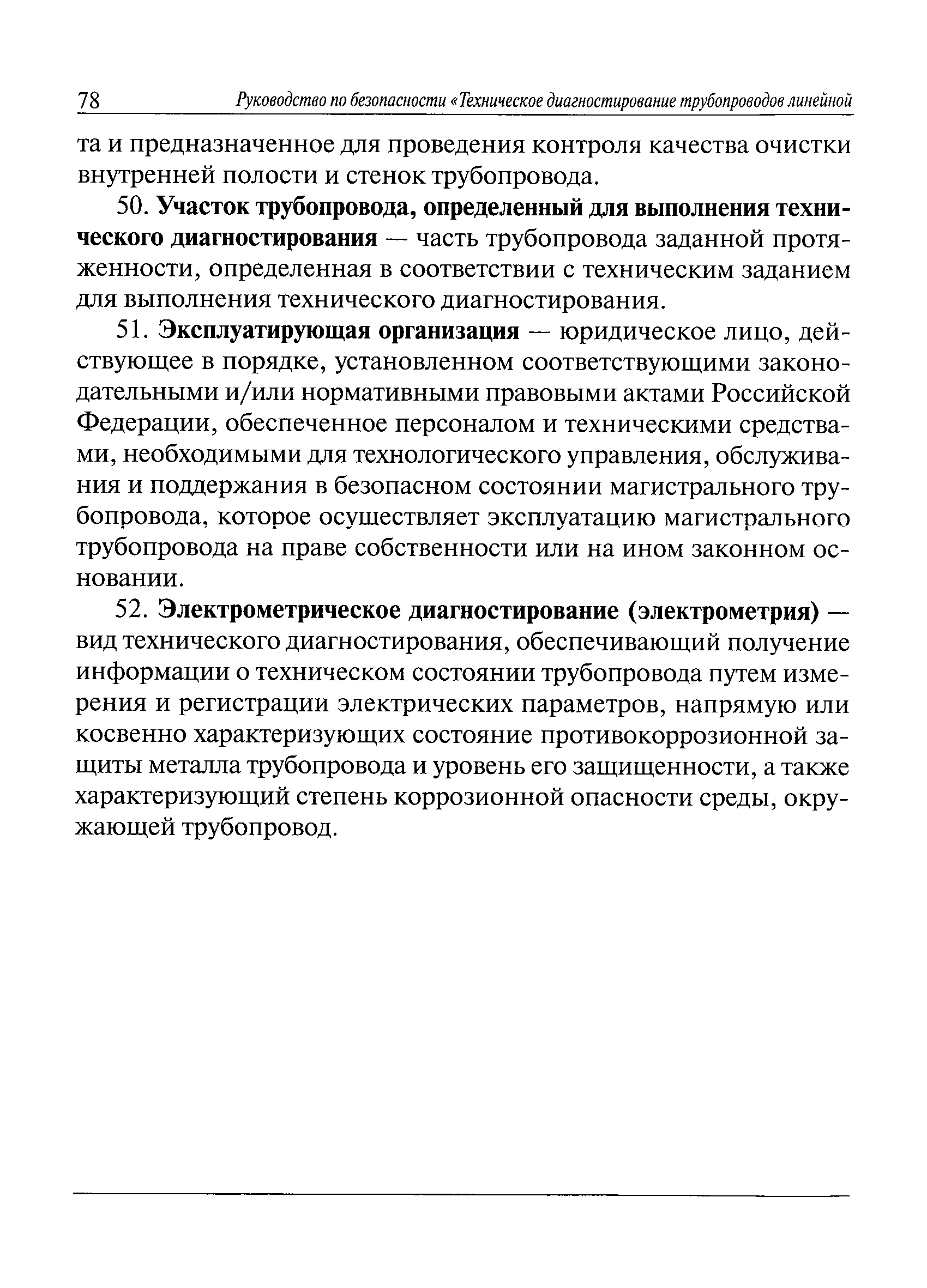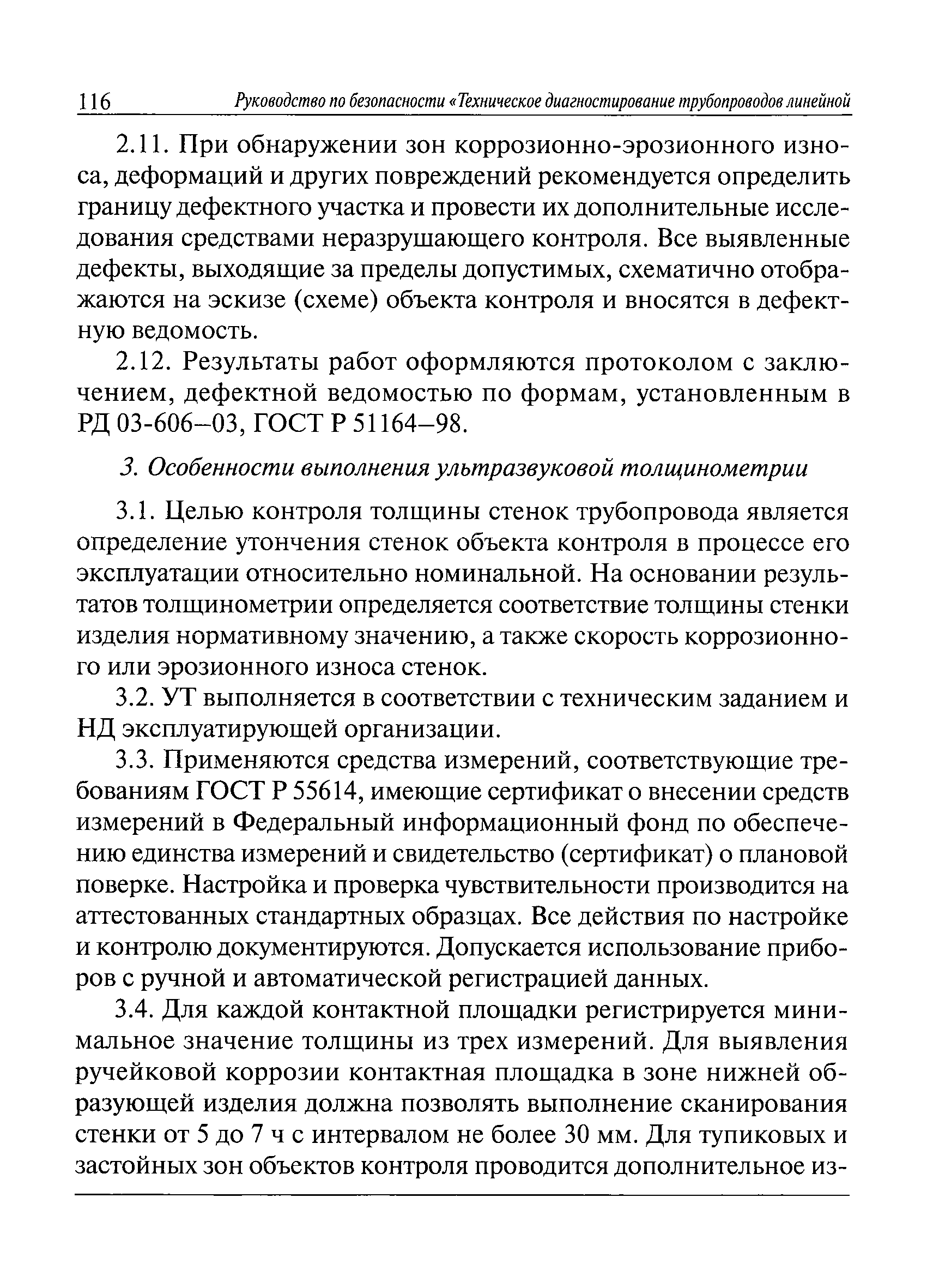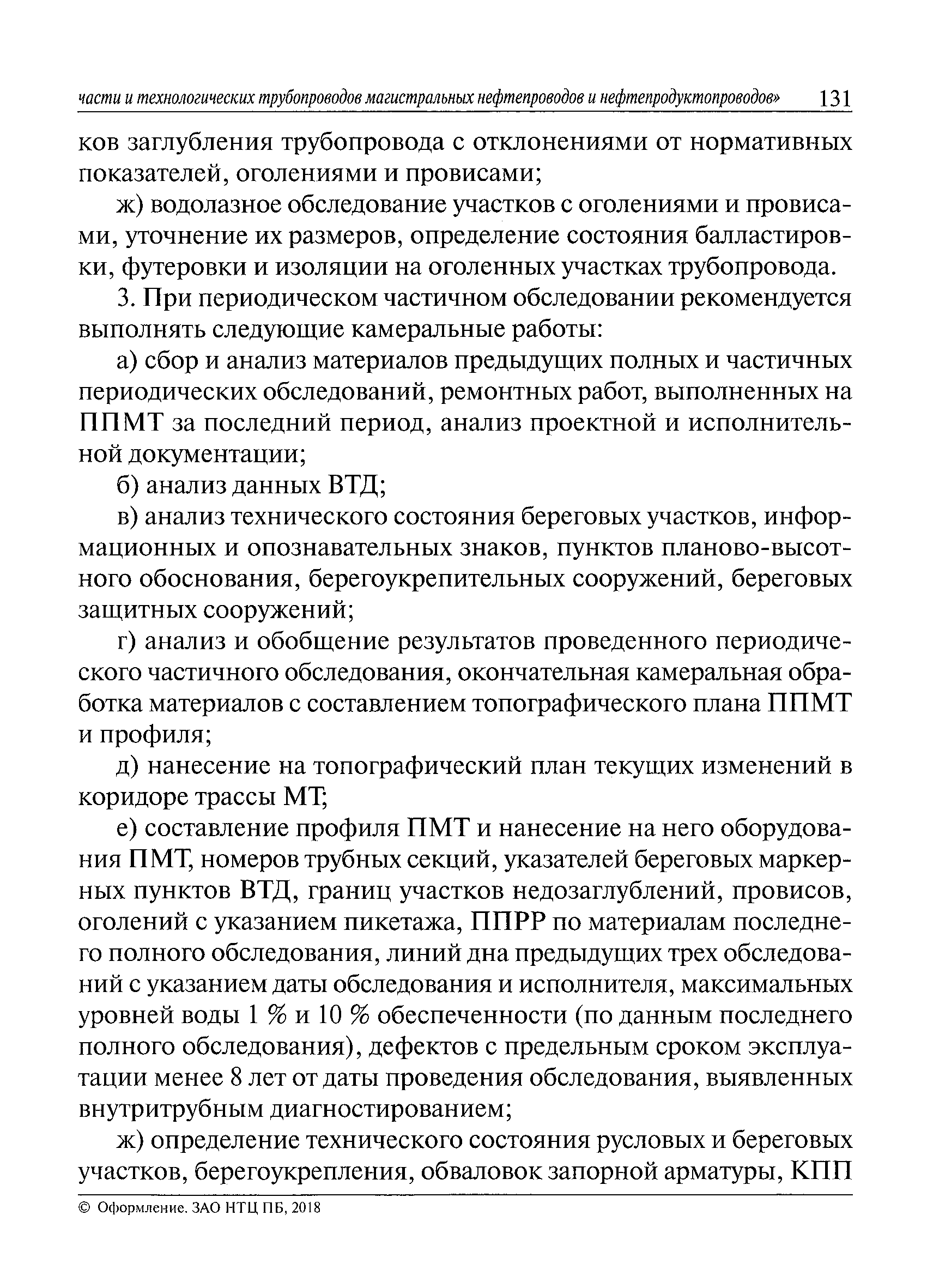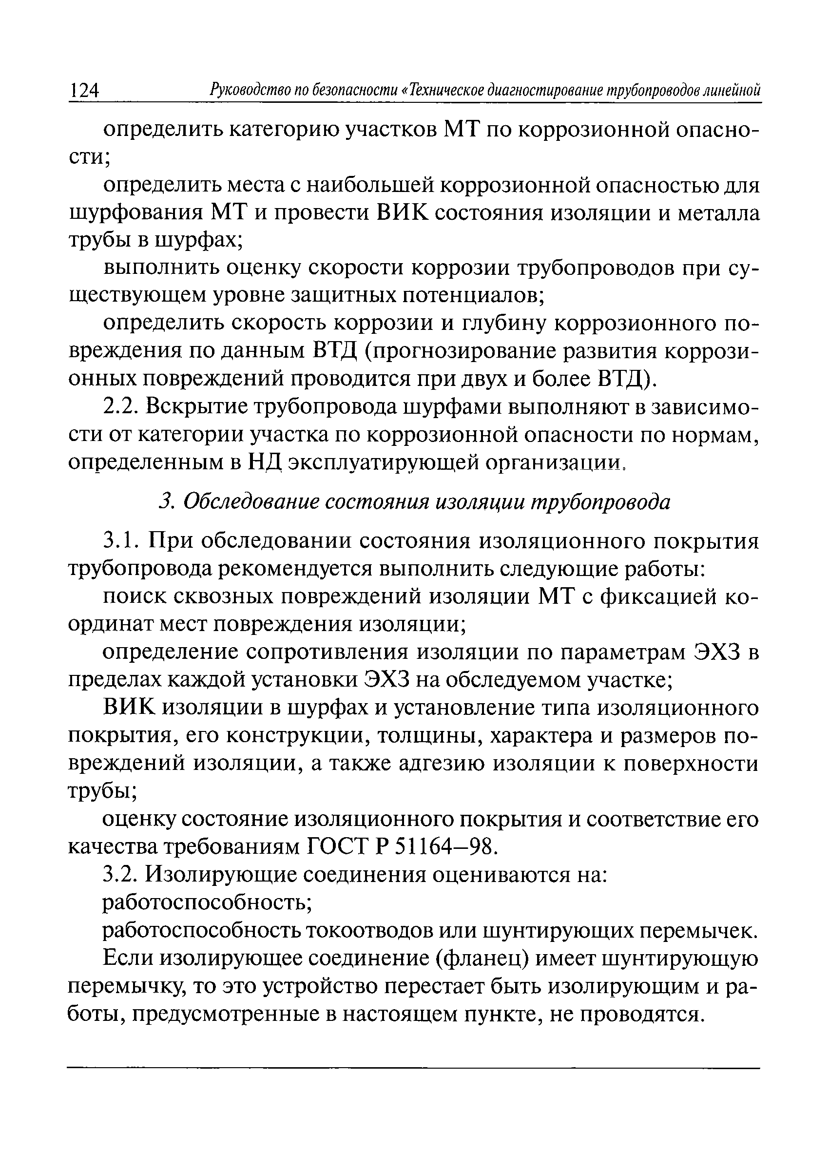 | Оглавление: | I Общие положения II Виды технического диагностирования III Техническое диагностирование линейной части магистральных трубопроводов, законченных строительством. Виды технического диагностирования, выполняемые на трубопроводах, законченных строительством IV Техническое диагностирование линейной части магистральных трубопроводов, находящихся в эксплуатации. Виды технического диагностирования, выполняемые на магистральных трубопроводах, находящихся в эксплуатации V Техническое диагностирование трубопроводов, находящихся в консервации. Виды технического диагностирования, применяемые на трубопроводах, находящихся в консервации, и сроки их проведения VI Техническое диагностирование технологических трубопроводов. Классификация технологических трубопроводов VII Мероприятия по безопасности при испытаниях, очистке и диагностировании трубопровод Приложение 1. Перечень сокращений и их расшифровка Приложение 2. Термины и их определения Приложение 3. Рисунки и таблицы Приложение 4. Рекомендации по методике проведения внутритрубного диагностирования Приложение 5. Рекомендации по видам и срокам проведения технического диагностирования магистральных трубопроводов, находящихся в эксплуатации Приложение 6. Рекомендации по методике выполнения неразрушающего контроля магистральных трубопроводов Приложение 7. Рекомендации по методике проведения работ по электрометрии Приложение 8. Виды работ, проводимые при наружном диагностировании переходов магистральных трубопроводов через водные преграды Приложение 9. Формы предупреждающих знаков Приложение 10. Форма акта на обозначение оборудования и открытых участков трубопровода перед проведением испытаний Приложение 11. Основные рекомендации к выполнению шурфов Приложение 12. Рекомендуемые формы актов при проведении технического диагностирования трубопровода |