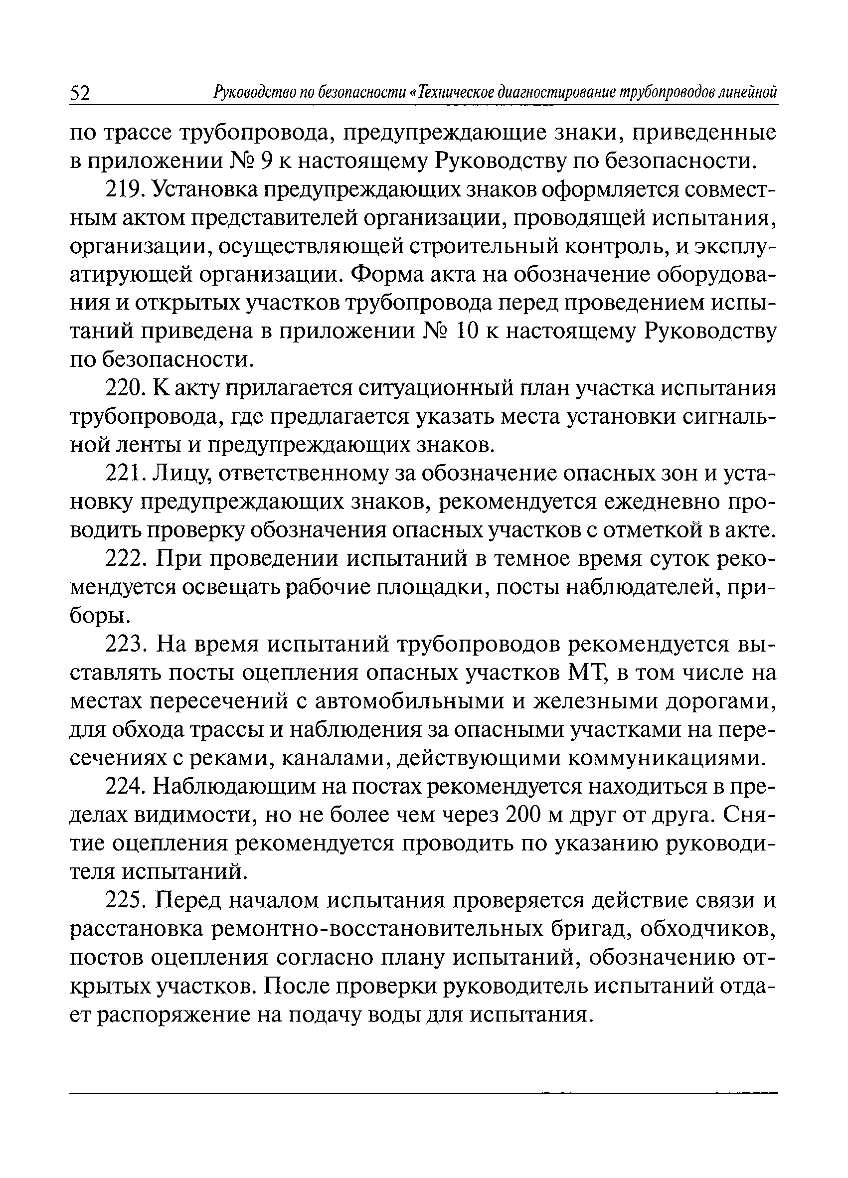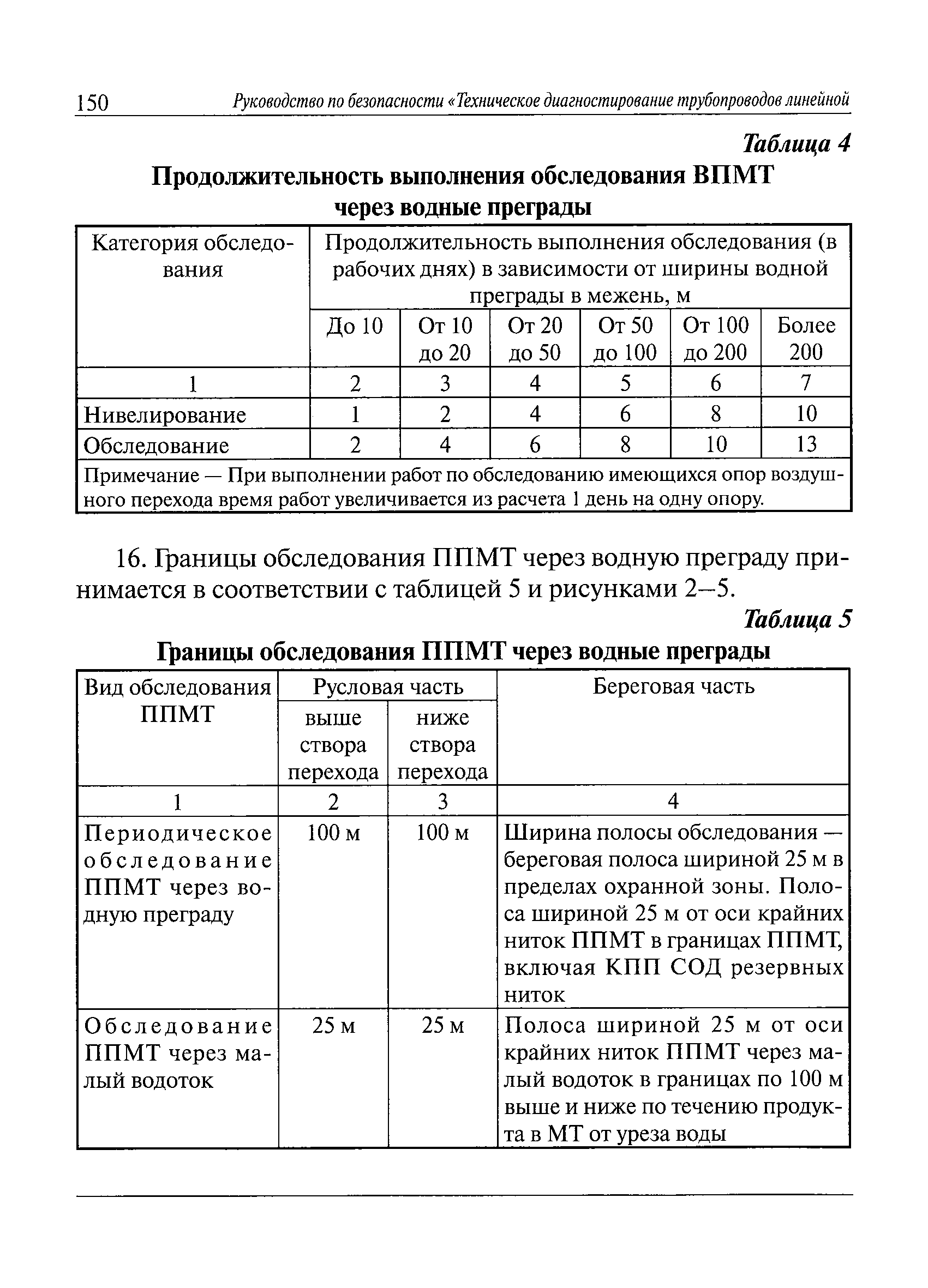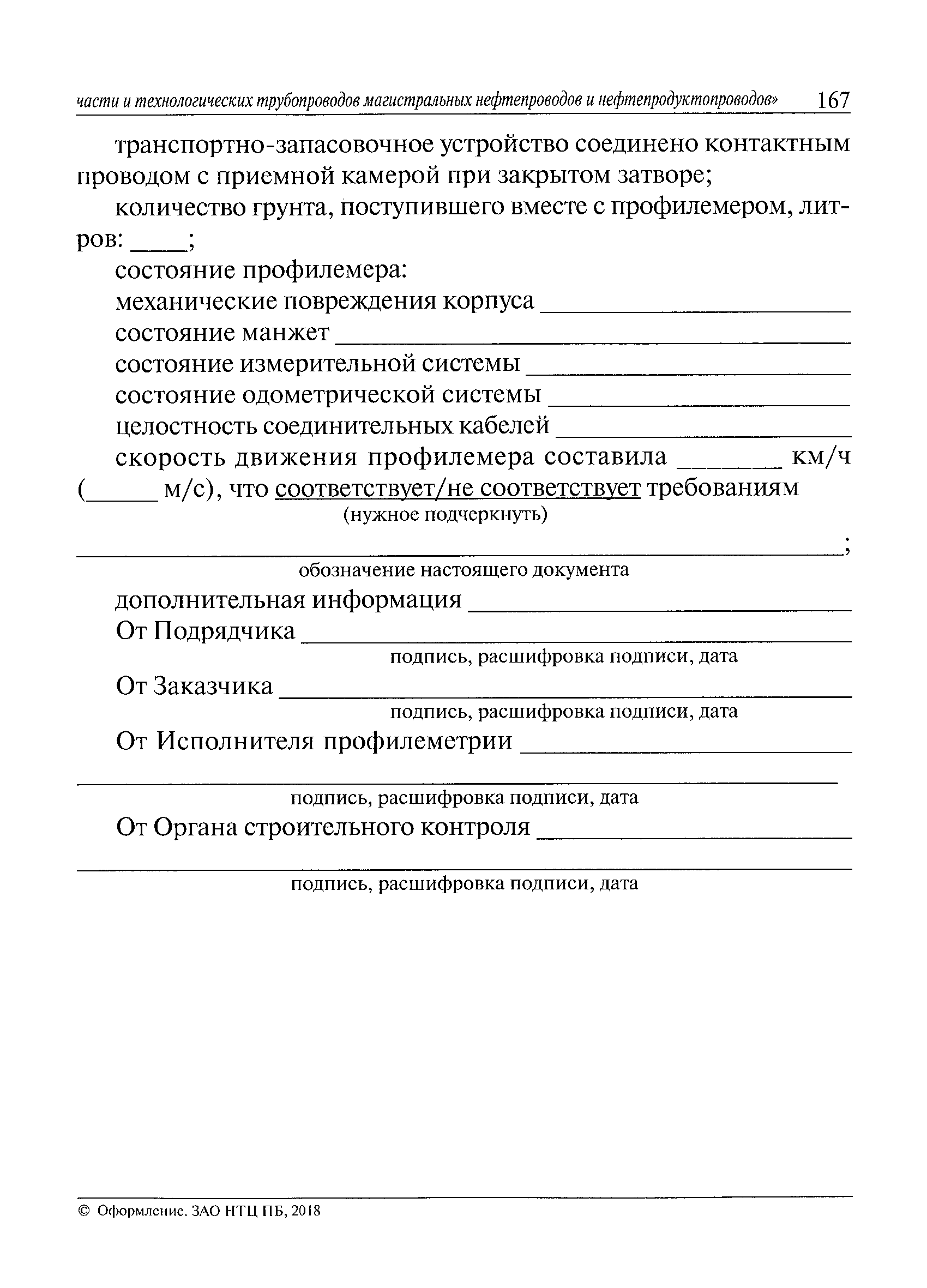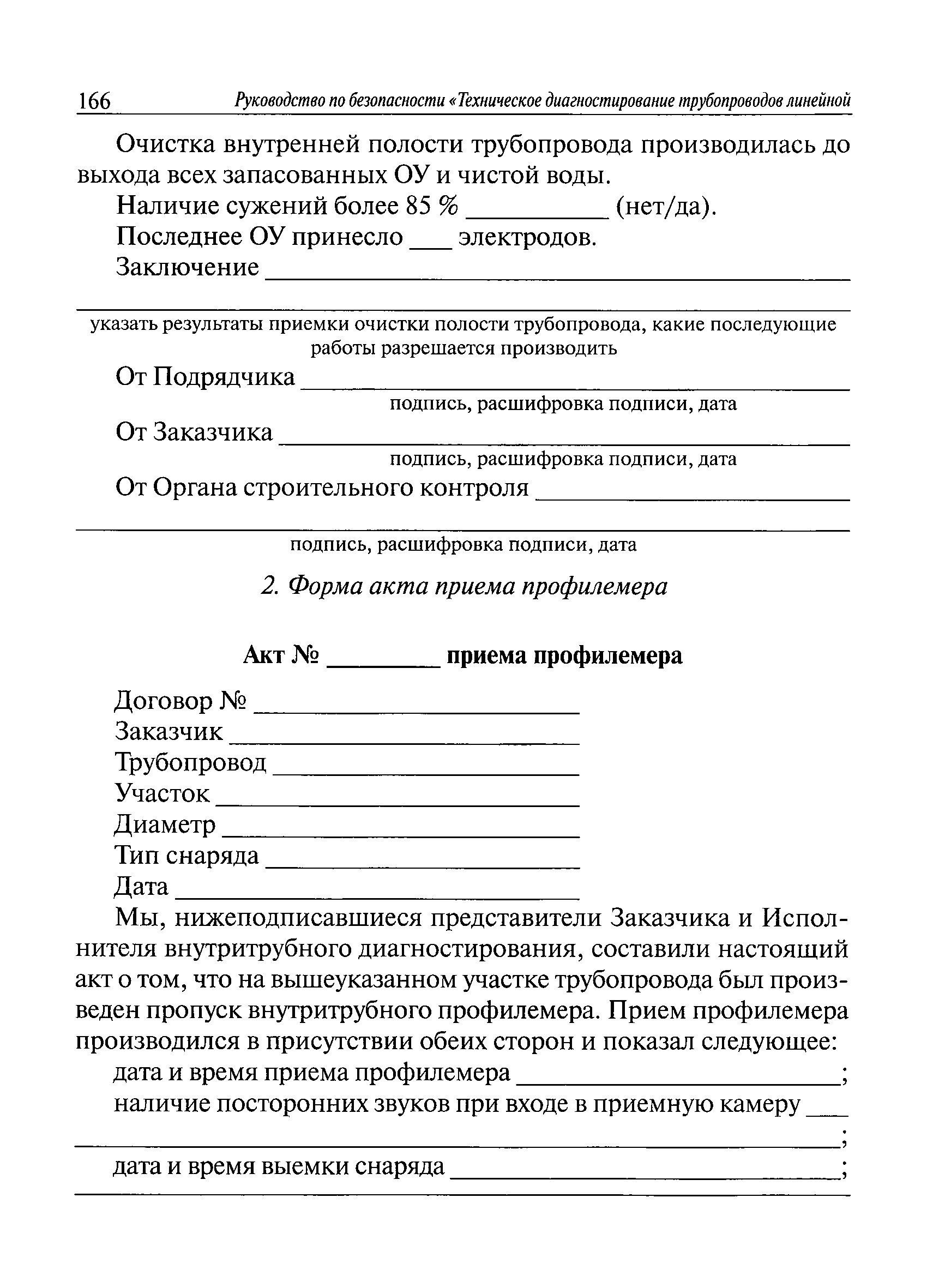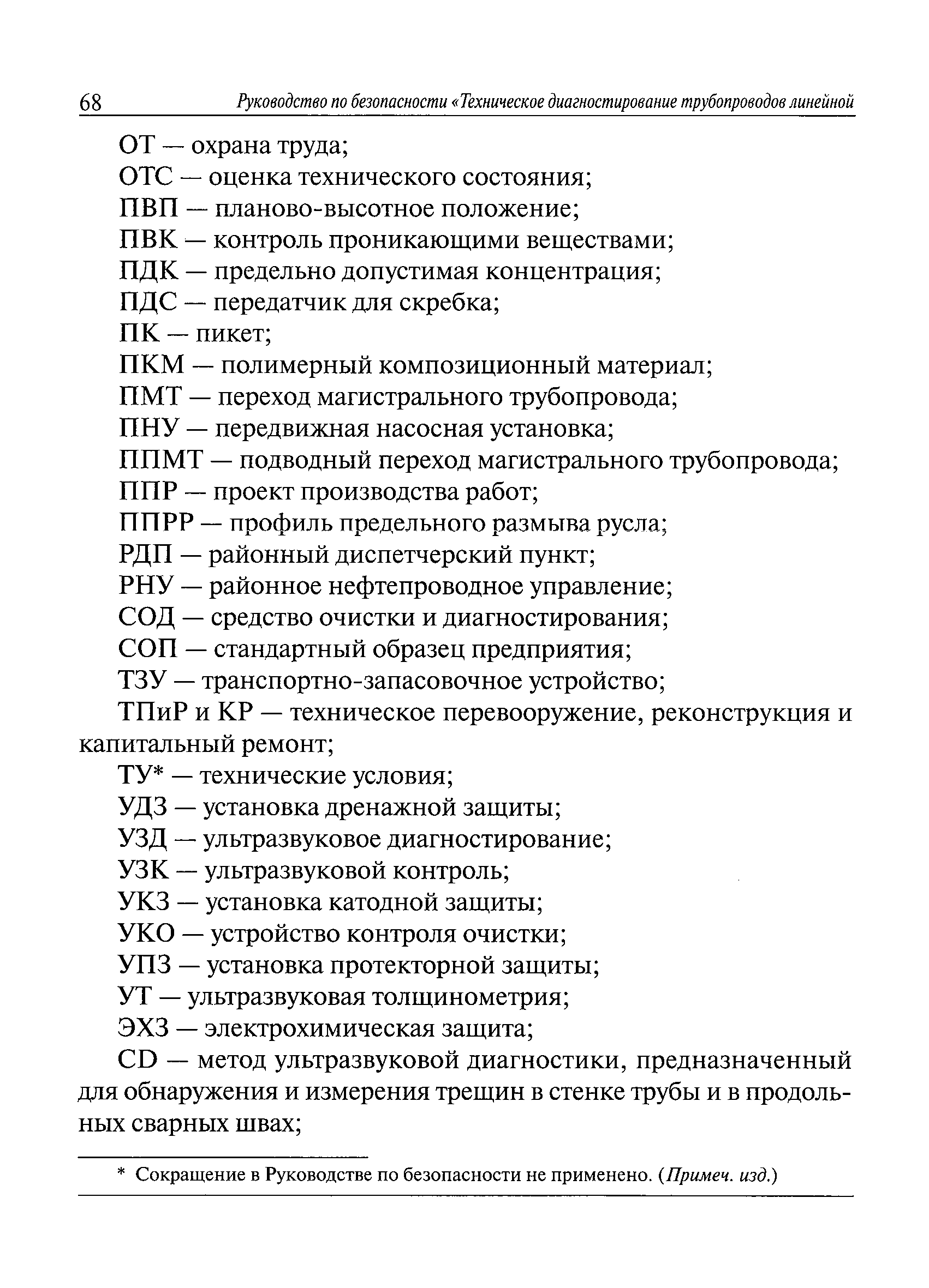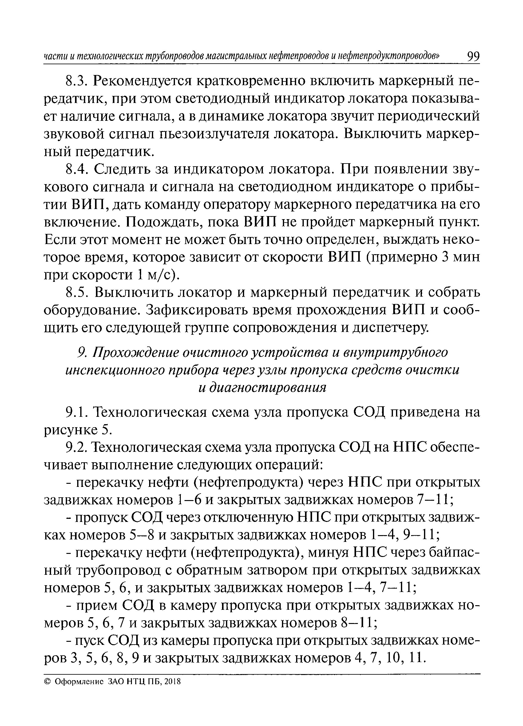 | Оглавление: | I Общие положения II Виды технического диагностирования III Техническое диагностирование линейной части магистральных трубопроводов, законченных строительством. Виды технического диагностирования, выполняемые на трубопроводах, законченных строительством IV Техническое диагностирование линейной части магистральных трубопроводов, находящихся в эксплуатации. Виды технического диагностирования, выполняемые на магистральных трубопроводах, находящихся в эксплуатации V Техническое диагностирование трубопроводов, находящихся в консервации. Виды технического диагностирования, применяемые на трубопроводах, находящихся в консервации, и сроки их проведения VI Техническое диагностирование технологических трубопроводов. Классификация технологических трубопроводов VII Мероприятия по безопасности при испытаниях, очистке и диагностировании трубопровод Приложение 1. Перечень сокращений и их расшифровка Приложение 2. Термины и их определения Приложение 3. Рисунки и таблицы Приложение 4. Рекомендации по методике проведения внутритрубного диагностирования Приложение 5. Рекомендации по видам и срокам проведения технического диагностирования магистральных трубопроводов, находящихся в эксплуатации Приложение 6. Рекомендации по методике выполнения неразрушающего контроля магистральных трубопроводов Приложение 7. Рекомендации по методике проведения работ по электрометрии Приложение 8. Виды работ, проводимые при наружном диагностировании переходов магистральных трубопроводов через водные преграды Приложение 9. Формы предупреждающих знаков Приложение 10. Форма акта на обозначение оборудования и открытых участков трубопровода перед проведением испытаний Приложение 11. Основные рекомендации к выполнению шурфов Приложение 12. Рекомендуемые формы актов при проведении технического диагностирования трубопровода |