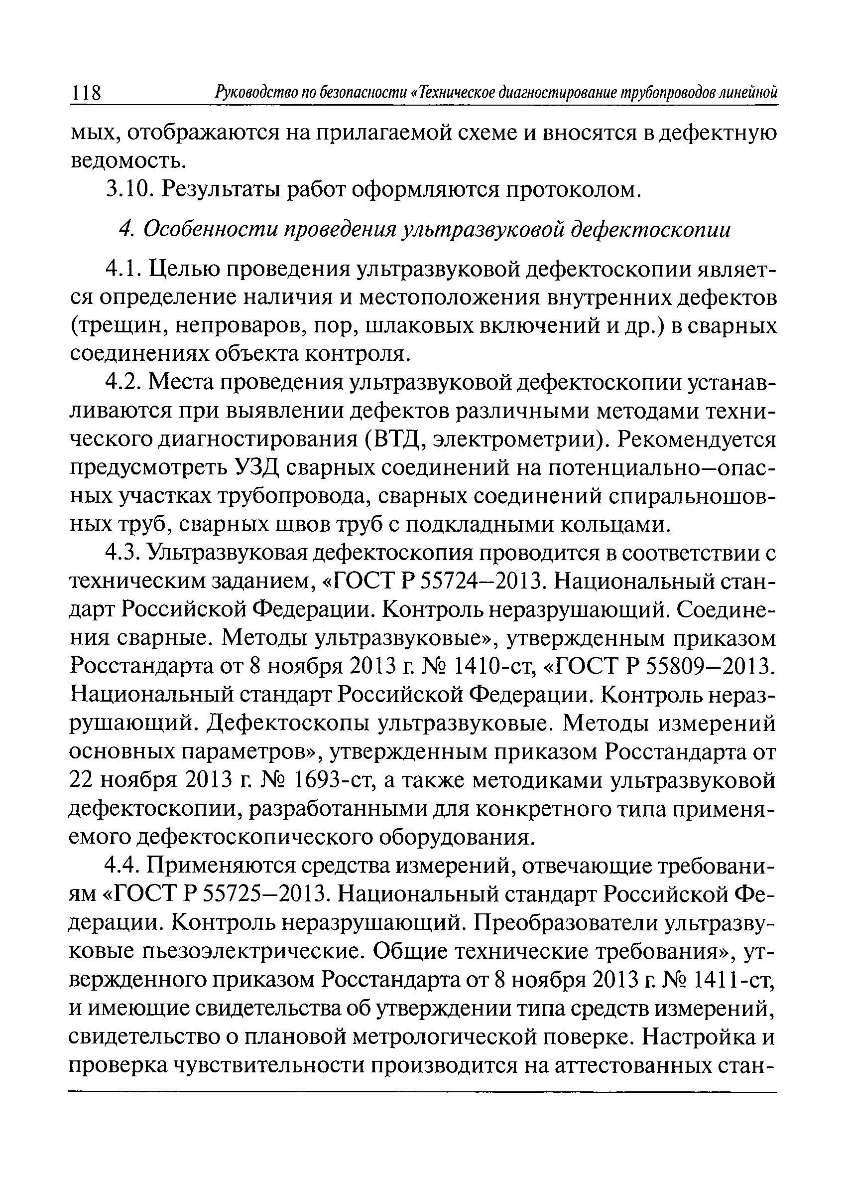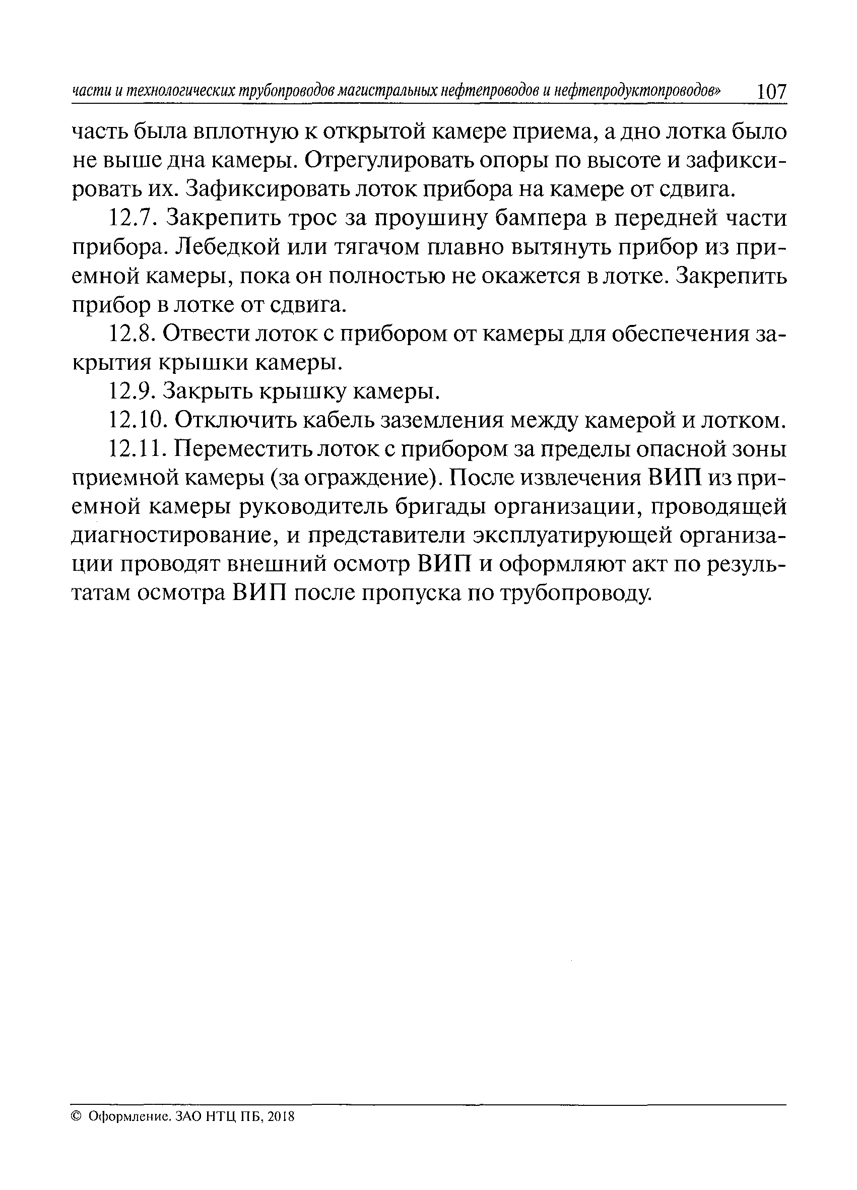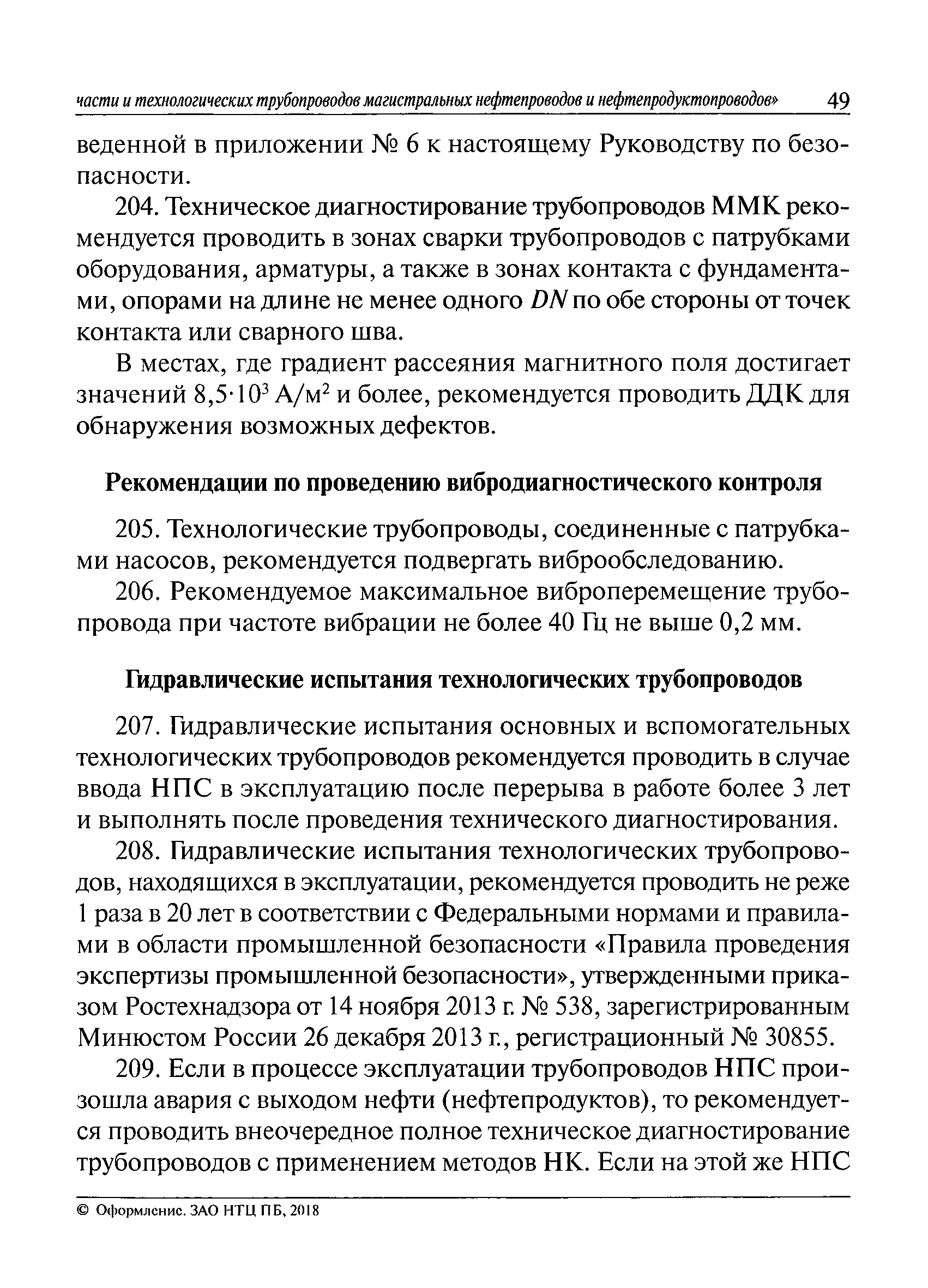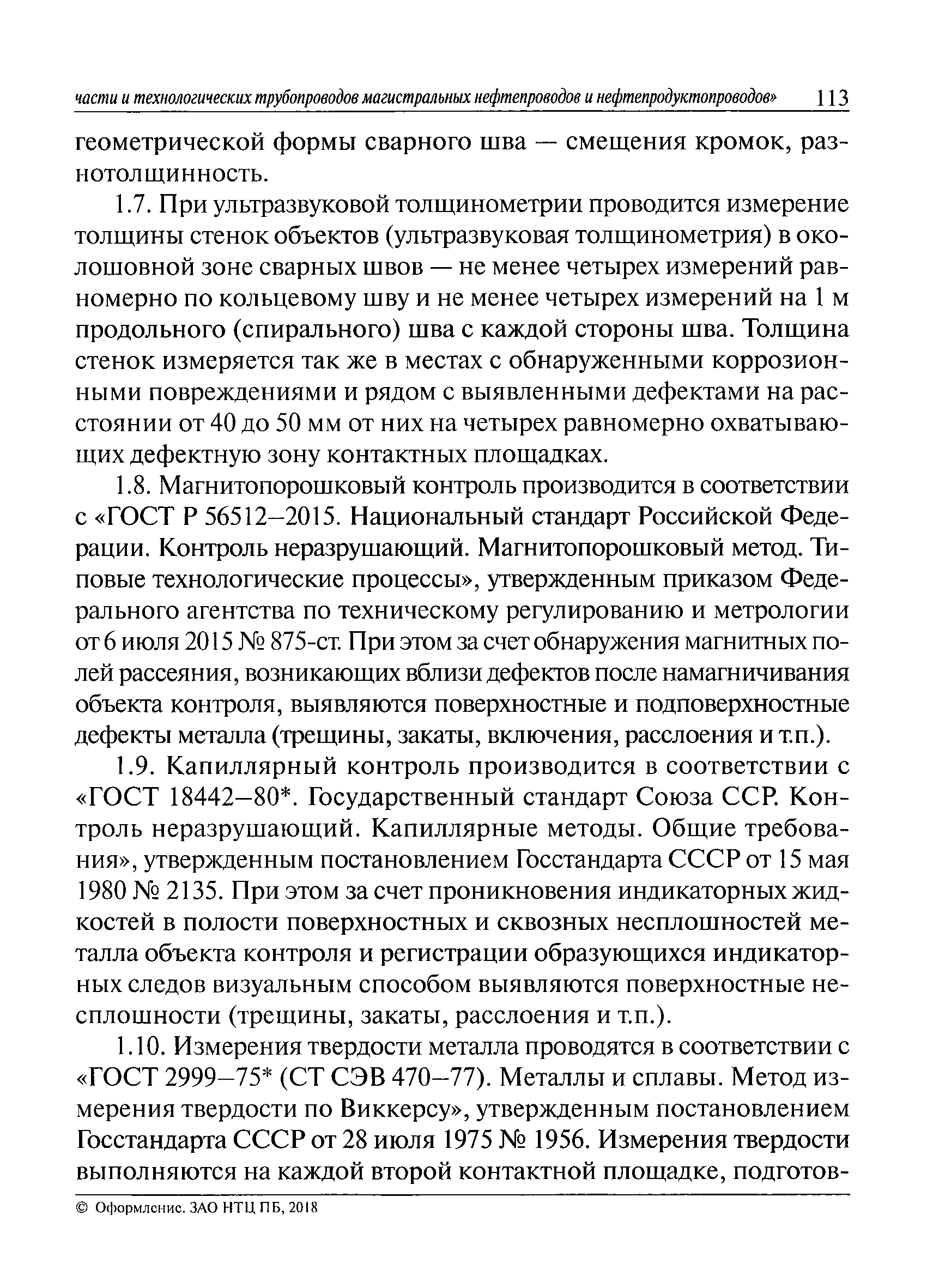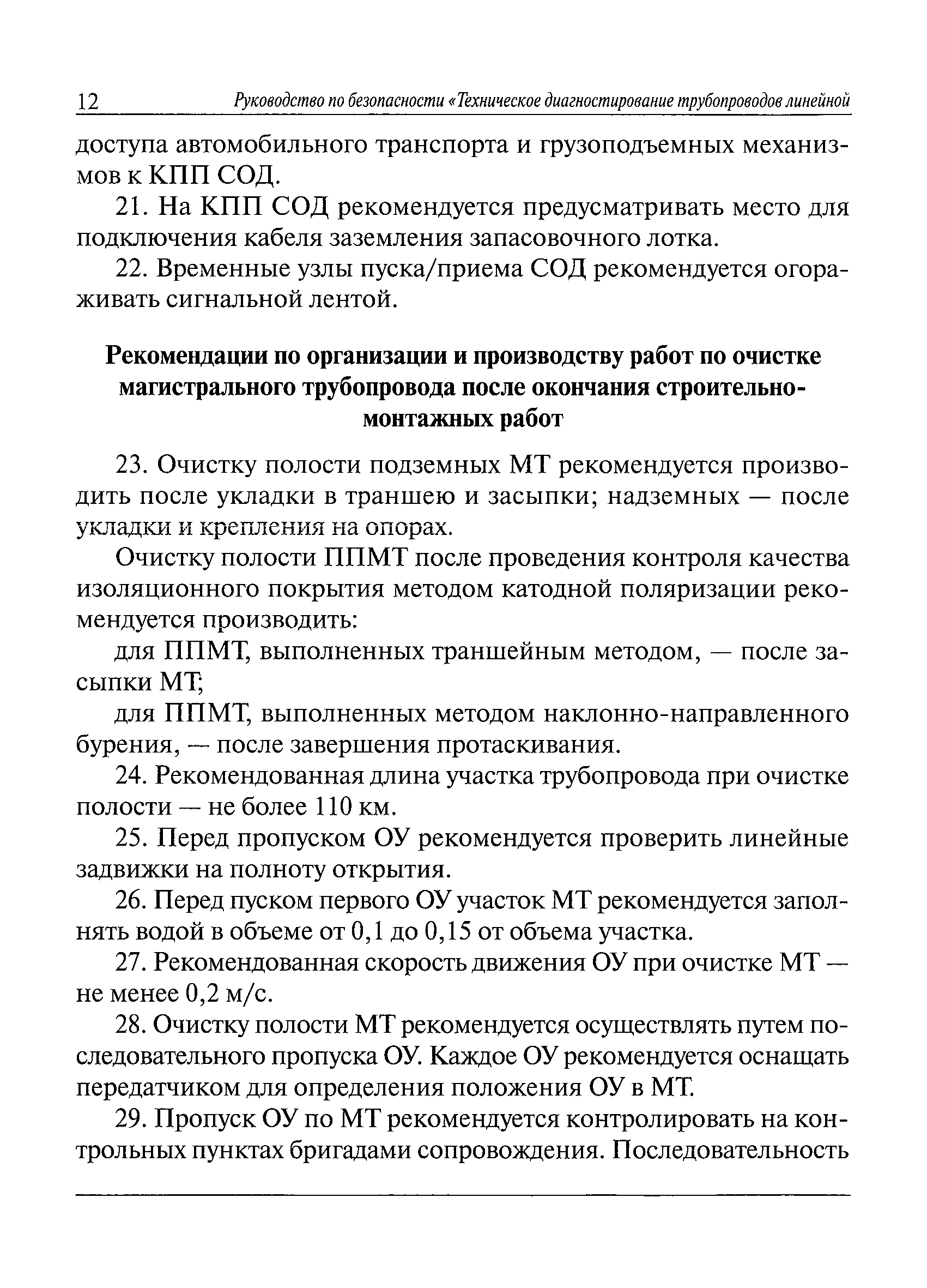 | Оглавление: | I Общие положения II Виды технического диагностирования III Техническое диагностирование линейной части магистральных трубопроводов, законченных строительством. Виды технического диагностирования, выполняемые на трубопроводах, законченных строительством IV Техническое диагностирование линейной части магистральных трубопроводов, находящихся в эксплуатации. Виды технического диагностирования, выполняемые на магистральных трубопроводах, находящихся в эксплуатации V Техническое диагностирование трубопроводов, находящихся в консервации. Виды технического диагностирования, применяемые на трубопроводах, находящихся в консервации, и сроки их проведения VI Техническое диагностирование технологических трубопроводов. Классификация технологических трубопроводов VII Мероприятия по безопасности при испытаниях, очистке и диагностировании трубопровод Приложение 1. Перечень сокращений и их расшифровка Приложение 2. Термины и их определения Приложение 3. Рисунки и таблицы Приложение 4. Рекомендации по методике проведения внутритрубного диагностирования Приложение 5. Рекомендации по видам и срокам проведения технического диагностирования магистральных трубопроводов, находящихся в эксплуатации Приложение 6. Рекомендации по методике выполнения неразрушающего контроля магистральных трубопроводов Приложение 7. Рекомендации по методике проведения работ по электрометрии Приложение 8. Виды работ, проводимые при наружном диагностировании переходов магистральных трубопроводов через водные преграды Приложение 9. Формы предупреждающих знаков Приложение 10. Форма акта на обозначение оборудования и открытых участков трубопровода перед проведением испытаний Приложение 11. Основные рекомендации к выполнению шурфов Приложение 12. Рекомендуемые формы актов при проведении технического диагностирования трубопровода |
