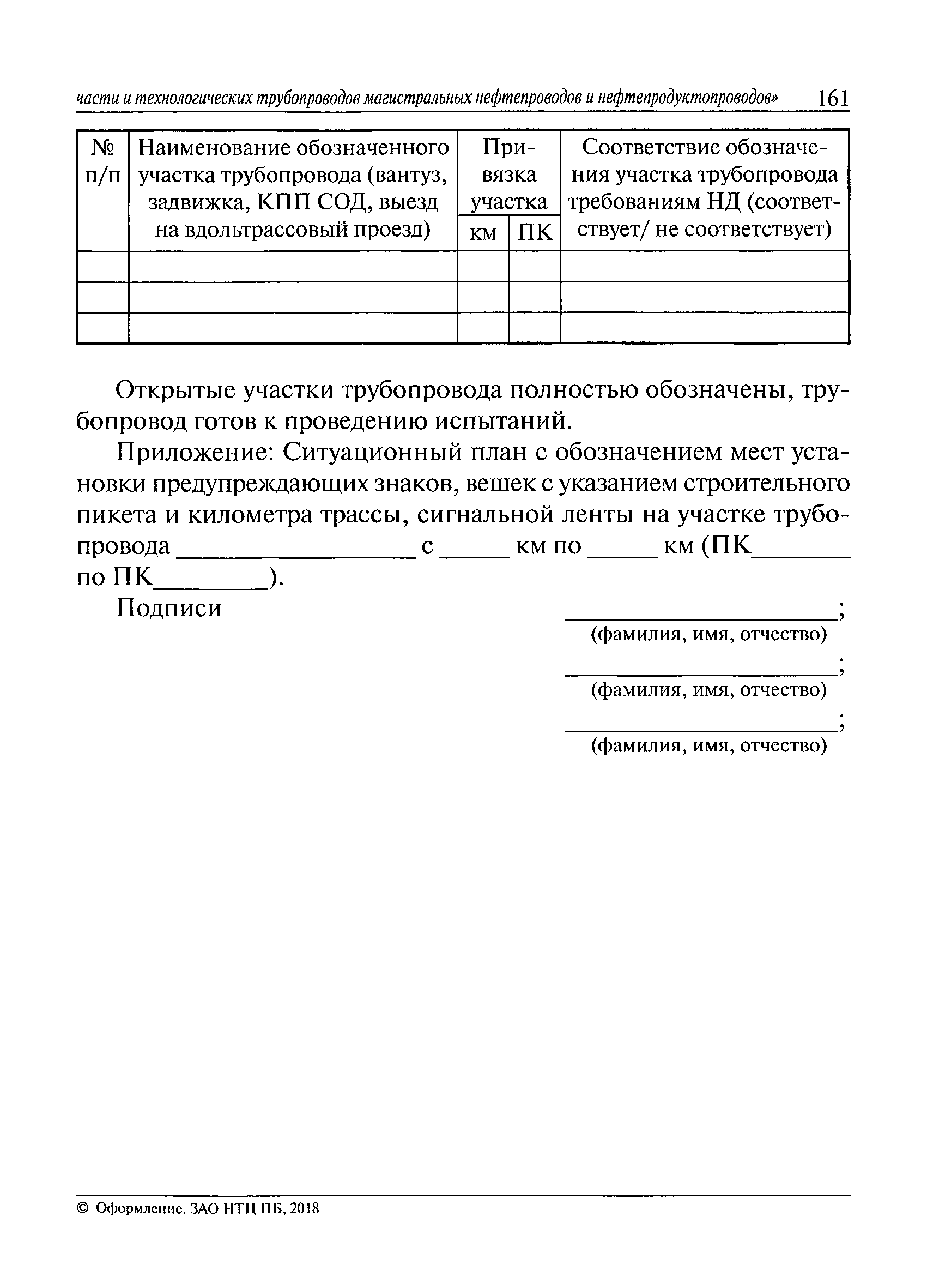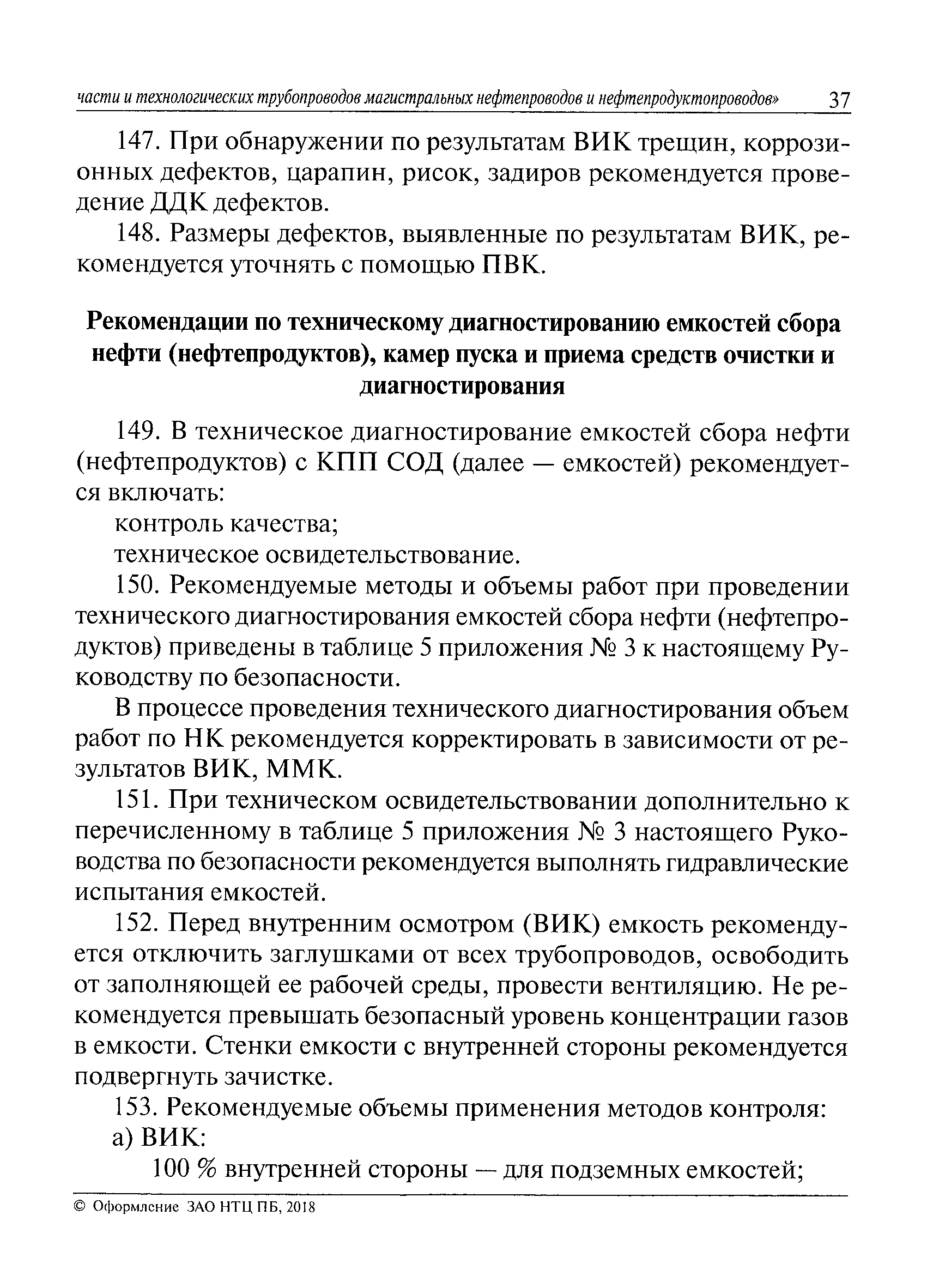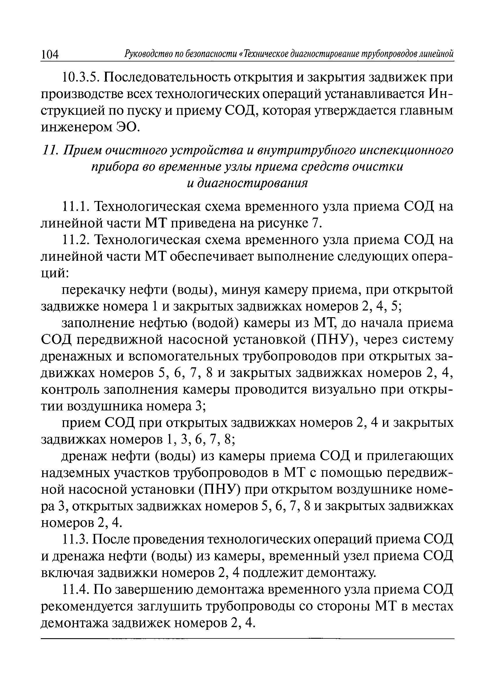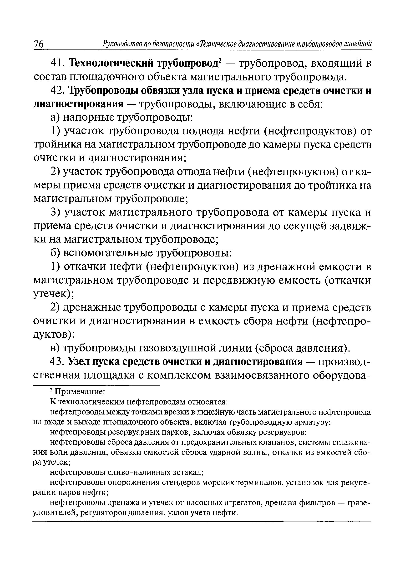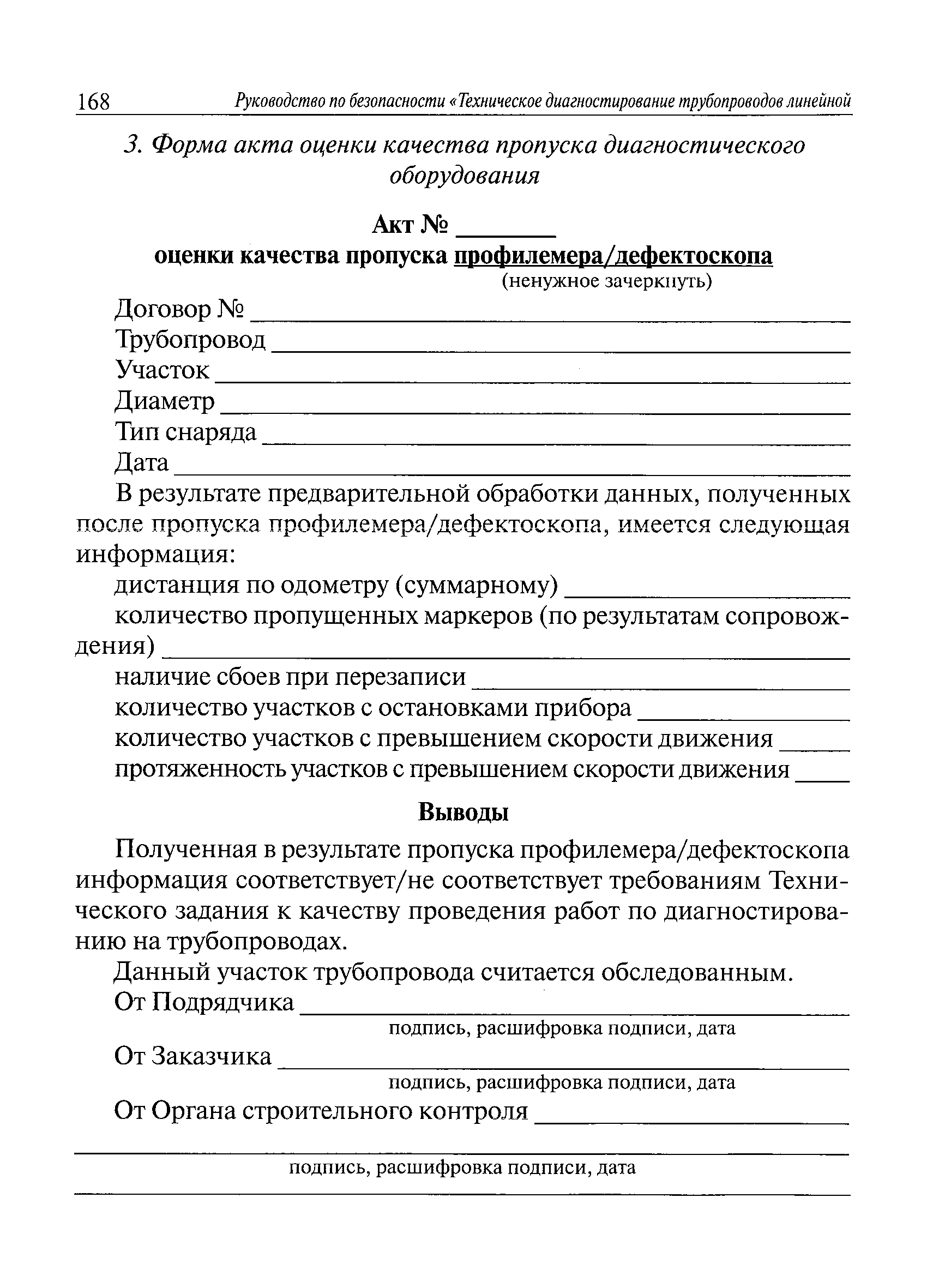 | Оглавление: | I Общие положения II Виды технического диагностирования III Техническое диагностирование линейной части магистральных трубопроводов, законченных строительством. Виды технического диагностирования, выполняемые на трубопроводах, законченных строительством IV Техническое диагностирование линейной части магистральных трубопроводов, находящихся в эксплуатации. Виды технического диагностирования, выполняемые на магистральных трубопроводах, находящихся в эксплуатации V Техническое диагностирование трубопроводов, находящихся в консервации. Виды технического диагностирования, применяемые на трубопроводах, находящихся в консервации, и сроки их проведения VI Техническое диагностирование технологических трубопроводов. Классификация технологических трубопроводов VII Мероприятия по безопасности при испытаниях, очистке и диагностировании трубопровод Приложение 1. Перечень сокращений и их расшифровка Приложение 2. Термины и их определения Приложение 3. Рисунки и таблицы Приложение 4. Рекомендации по методике проведения внутритрубного диагностирования Приложение 5. Рекомендации по видам и срокам проведения технического диагностирования магистральных трубопроводов, находящихся в эксплуатации Приложение 6. Рекомендации по методике выполнения неразрушающего контроля магистральных трубопроводов Приложение 7. Рекомендации по методике проведения работ по электрометрии Приложение 8. Виды работ, проводимые при наружном диагностировании переходов магистральных трубопроводов через водные преграды Приложение 9. Формы предупреждающих знаков Приложение 10. Форма акта на обозначение оборудования и открытых участков трубопровода перед проведением испытаний Приложение 11. Основные рекомендации к выполнению шурфов Приложение 12. Рекомендуемые формы актов при проведении технического диагностирования трубопровода |