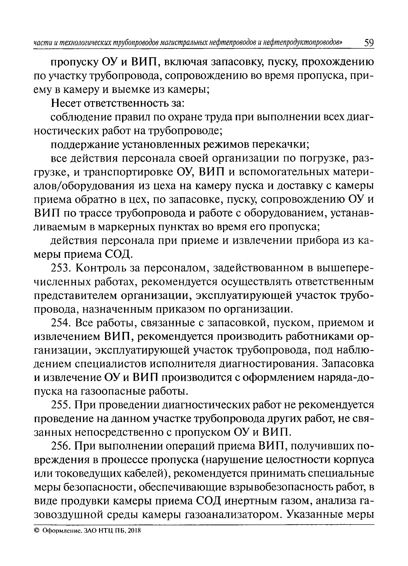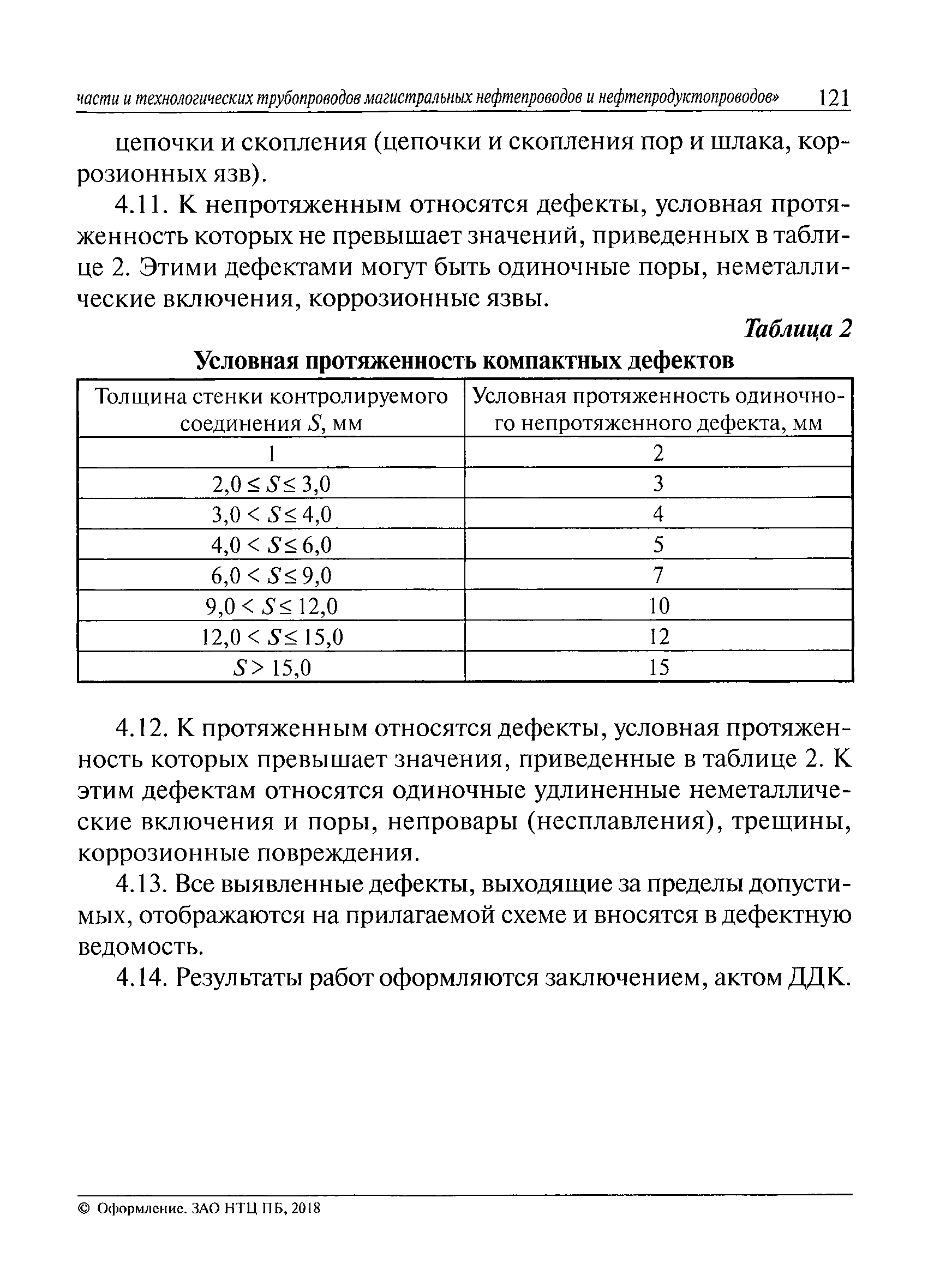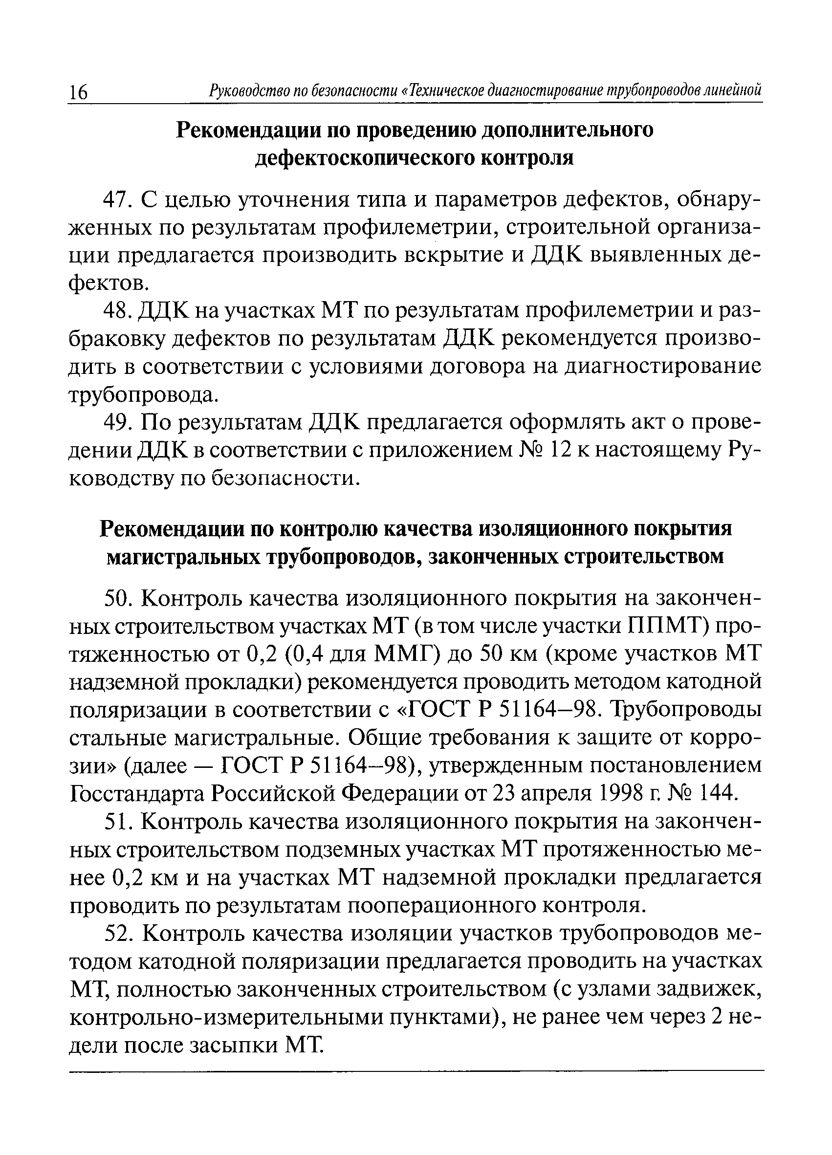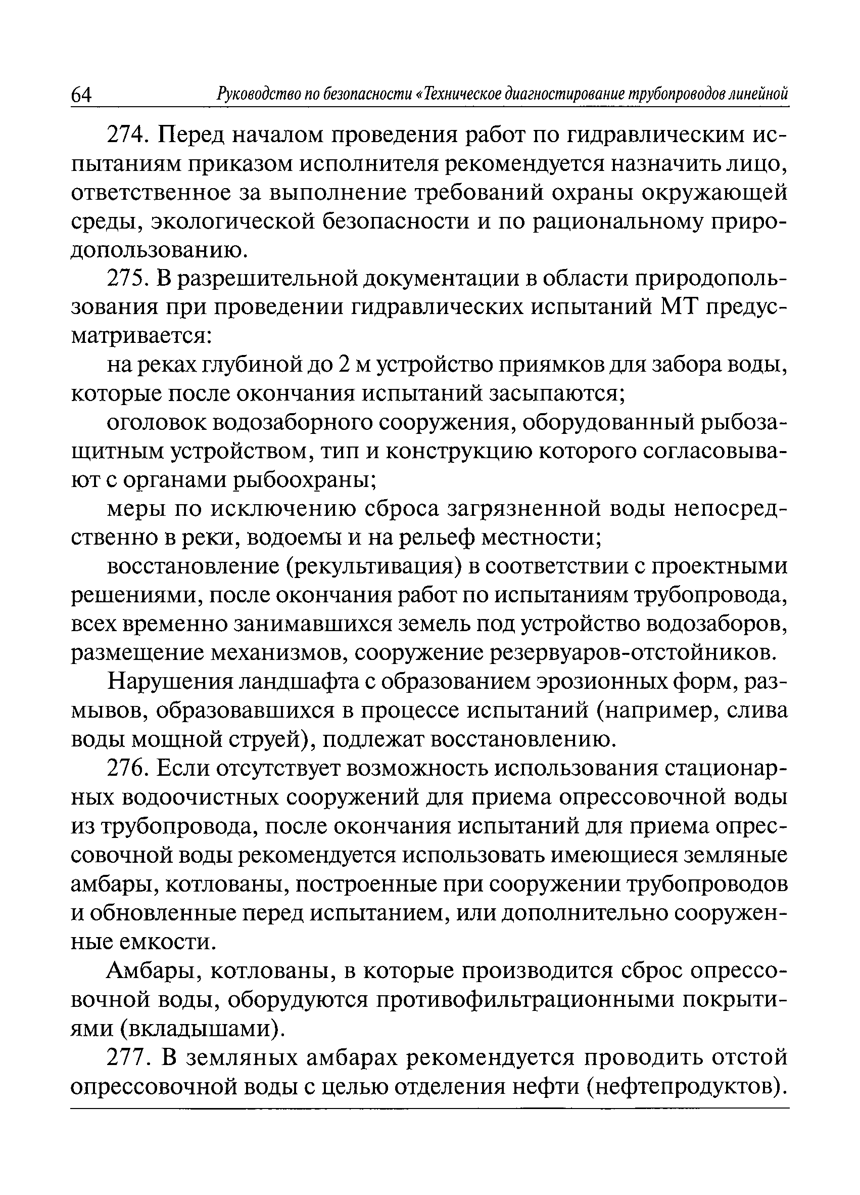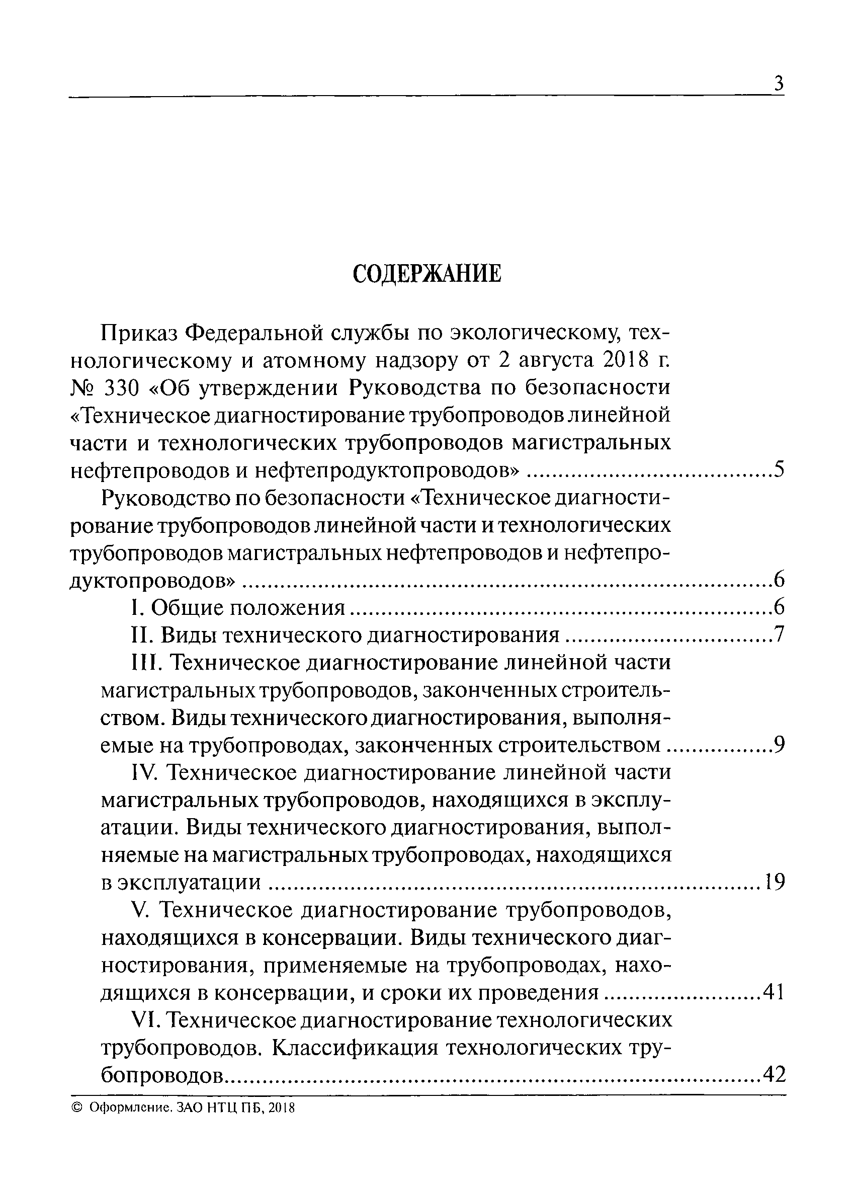 | Оглавление: | I Общие положения II Виды технического диагностирования III Техническое диагностирование линейной части магистральных трубопроводов, законченных строительством. Виды технического диагностирования, выполняемые на трубопроводах, законченных строительством IV Техническое диагностирование линейной части магистральных трубопроводов, находящихся в эксплуатации. Виды технического диагностирования, выполняемые на магистральных трубопроводах, находящихся в эксплуатации V Техническое диагностирование трубопроводов, находящихся в консервации. Виды технического диагностирования, применяемые на трубопроводах, находящихся в консервации, и сроки их проведения VI Техническое диагностирование технологических трубопроводов. Классификация технологических трубопроводов VII Мероприятия по безопасности при испытаниях, очистке и диагностировании трубопровод Приложение 1. Перечень сокращений и их расшифровка Приложение 2. Термины и их определения Приложение 3. Рисунки и таблицы Приложение 4. Рекомендации по методике проведения внутритрубного диагностирования Приложение 5. Рекомендации по видам и срокам проведения технического диагностирования магистральных трубопроводов, находящихся в эксплуатации Приложение 6. Рекомендации по методике выполнения неразрушающего контроля магистральных трубопроводов Приложение 7. Рекомендации по методике проведения работ по электрометрии Приложение 8. Виды работ, проводимые при наружном диагностировании переходов магистральных трубопроводов через водные преграды Приложение 9. Формы предупреждающих знаков Приложение 10. Форма акта на обозначение оборудования и открытых участков трубопровода перед проведением испытаний Приложение 11. Основные рекомендации к выполнению шурфов Приложение 12. Рекомендуемые формы актов при проведении технического диагностирования трубопровода |
