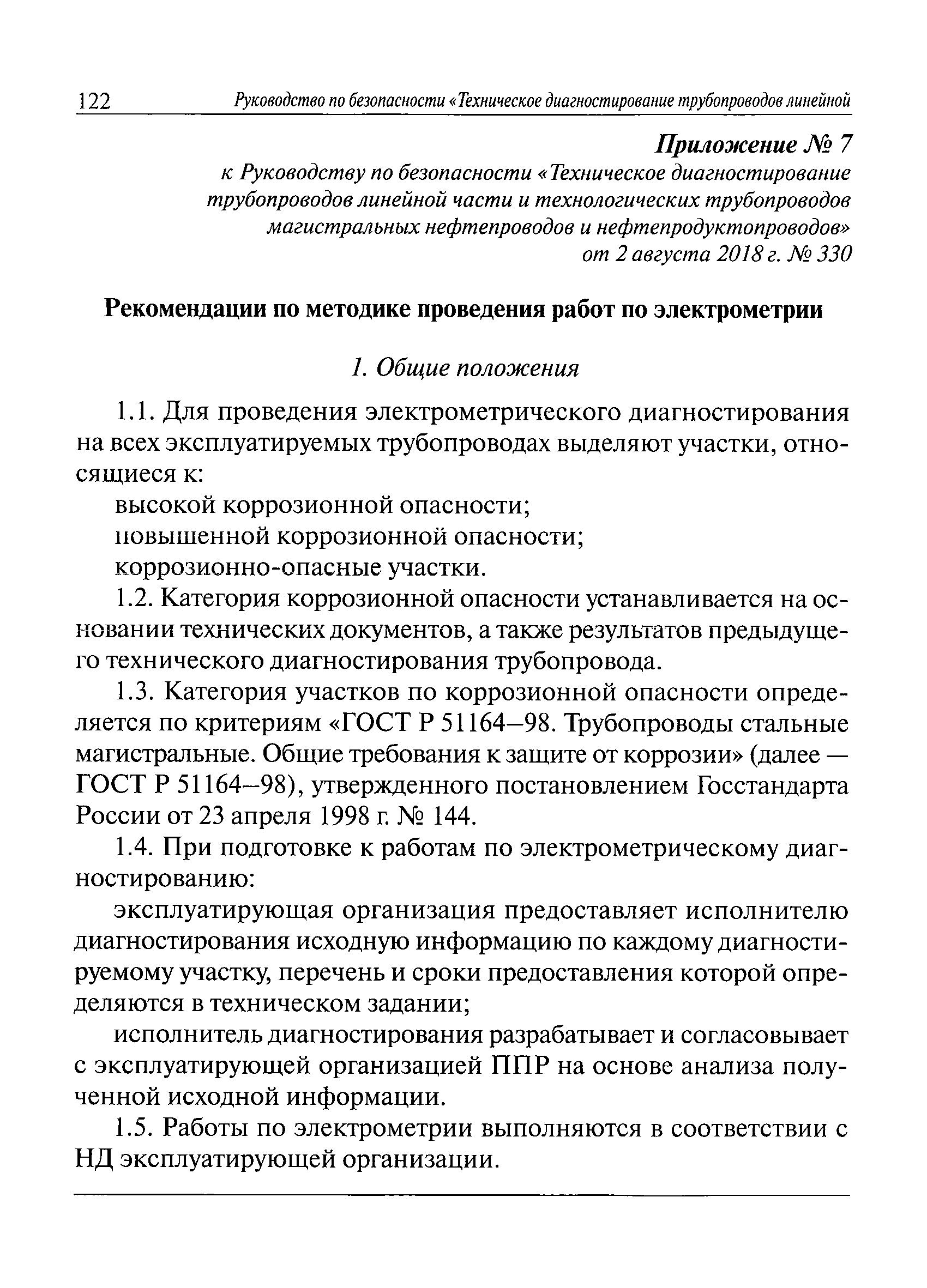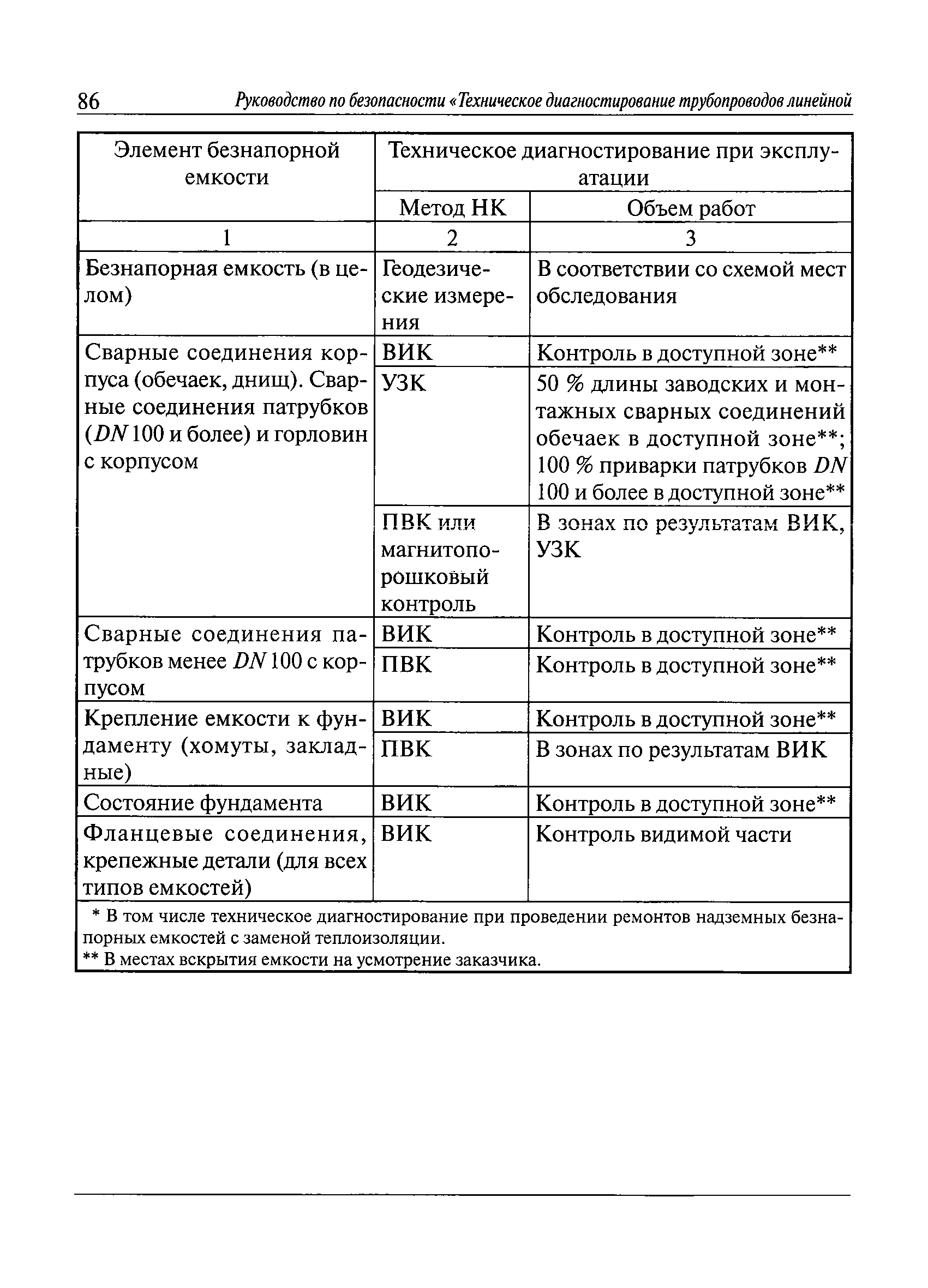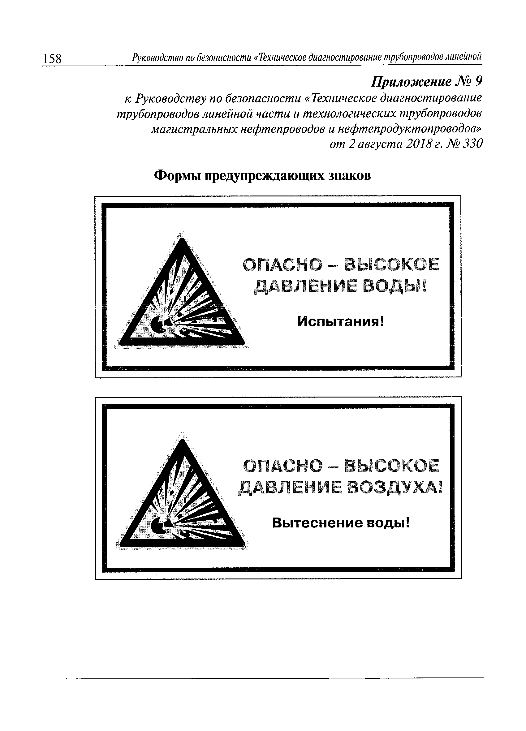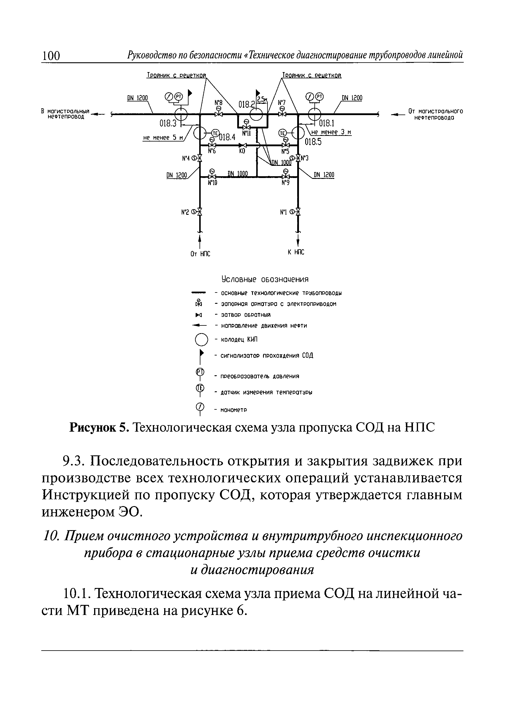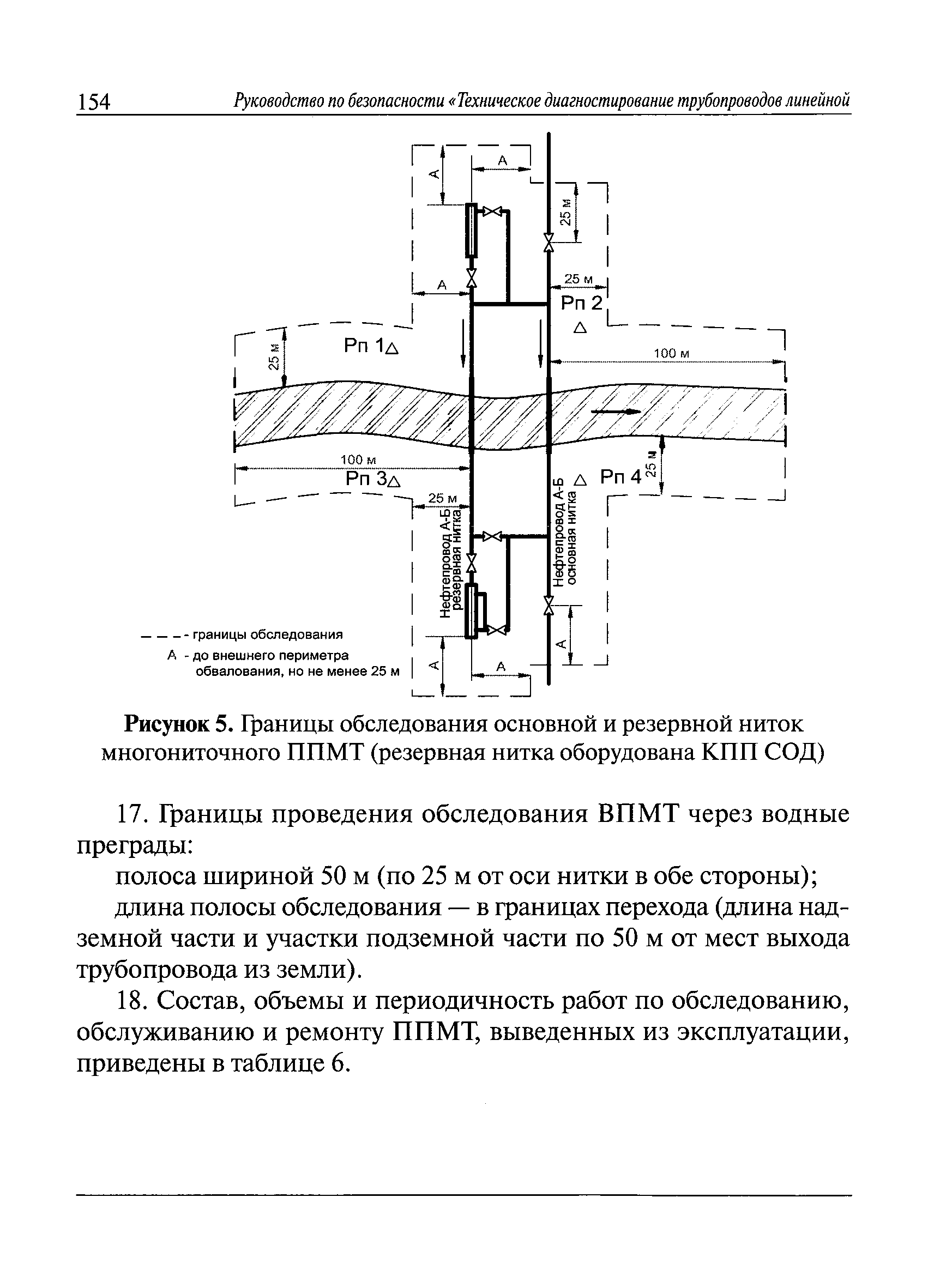 | Оглавление: | I Общие положения II Виды технического диагностирования III Техническое диагностирование линейной части магистральных трубопроводов, законченных строительством. Виды технического диагностирования, выполняемые на трубопроводах, законченных строительством IV Техническое диагностирование линейной части магистральных трубопроводов, находящихся в эксплуатации. Виды технического диагностирования, выполняемые на магистральных трубопроводах, находящихся в эксплуатации V Техническое диагностирование трубопроводов, находящихся в консервации. Виды технического диагностирования, применяемые на трубопроводах, находящихся в консервации, и сроки их проведения VI Техническое диагностирование технологических трубопроводов. Классификация технологических трубопроводов VII Мероприятия по безопасности при испытаниях, очистке и диагностировании трубопровод Приложение 1. Перечень сокращений и их расшифровка Приложение 2. Термины и их определения Приложение 3. Рисунки и таблицы Приложение 4. Рекомендации по методике проведения внутритрубного диагностирования Приложение 5. Рекомендации по видам и срокам проведения технического диагностирования магистральных трубопроводов, находящихся в эксплуатации Приложение 6. Рекомендации по методике выполнения неразрушающего контроля магистральных трубопроводов Приложение 7. Рекомендации по методике проведения работ по электрометрии Приложение 8. Виды работ, проводимые при наружном диагностировании переходов магистральных трубопроводов через водные преграды Приложение 9. Формы предупреждающих знаков Приложение 10. Форма акта на обозначение оборудования и открытых участков трубопровода перед проведением испытаний Приложение 11. Основные рекомендации к выполнению шурфов Приложение 12. Рекомендуемые формы актов при проведении технического диагностирования трубопровода |