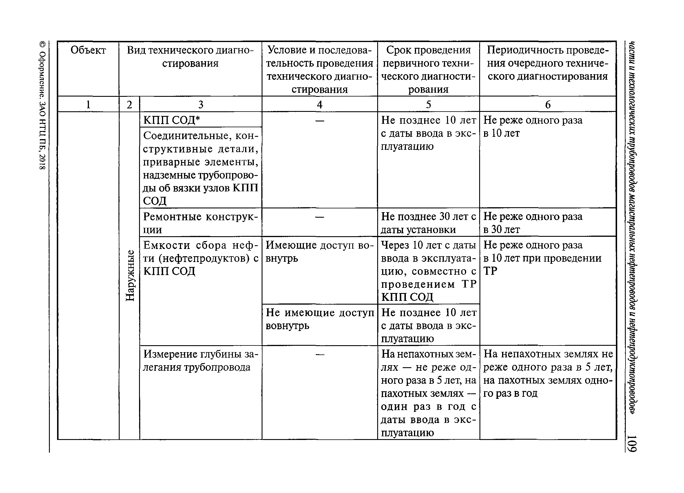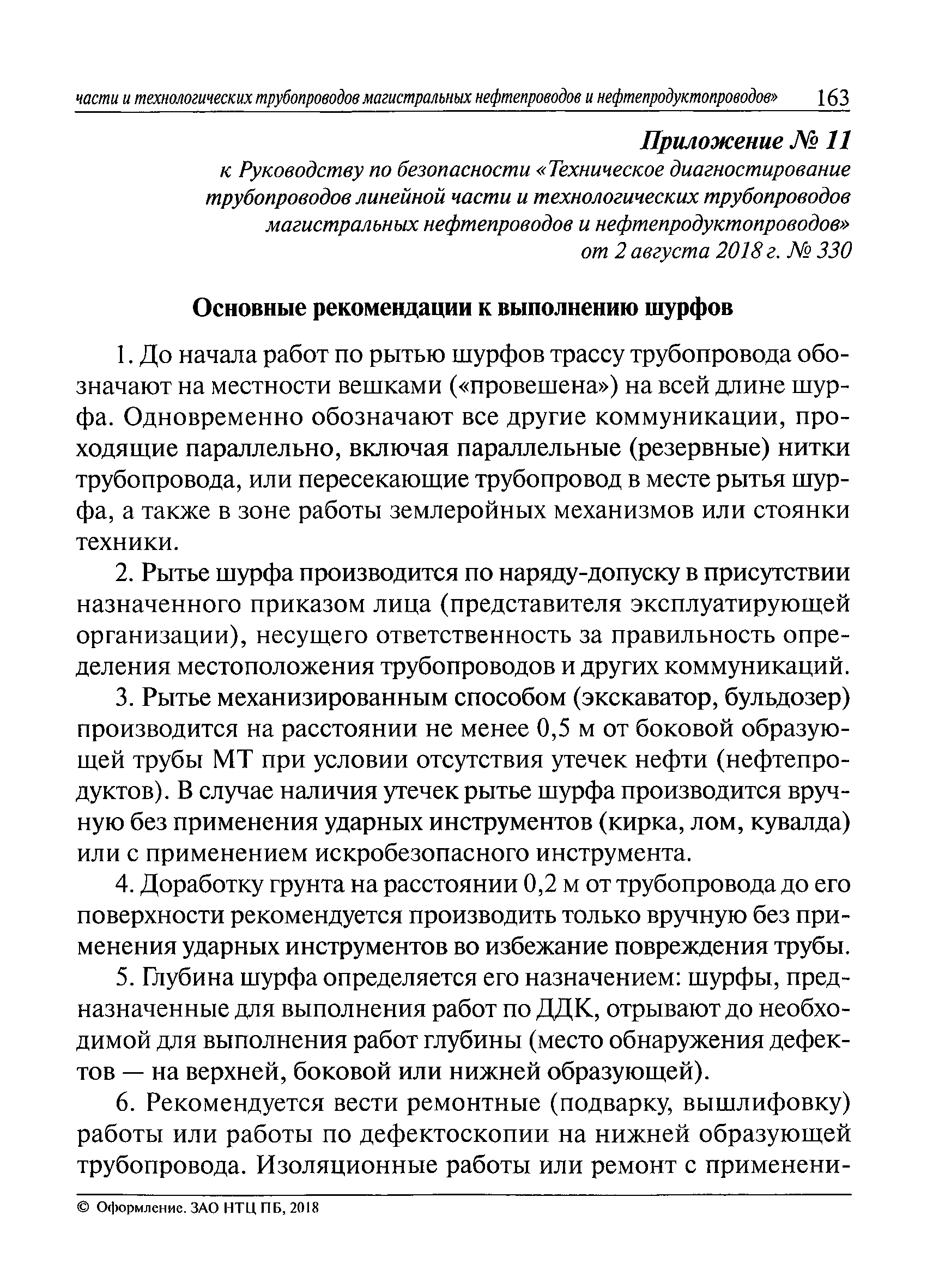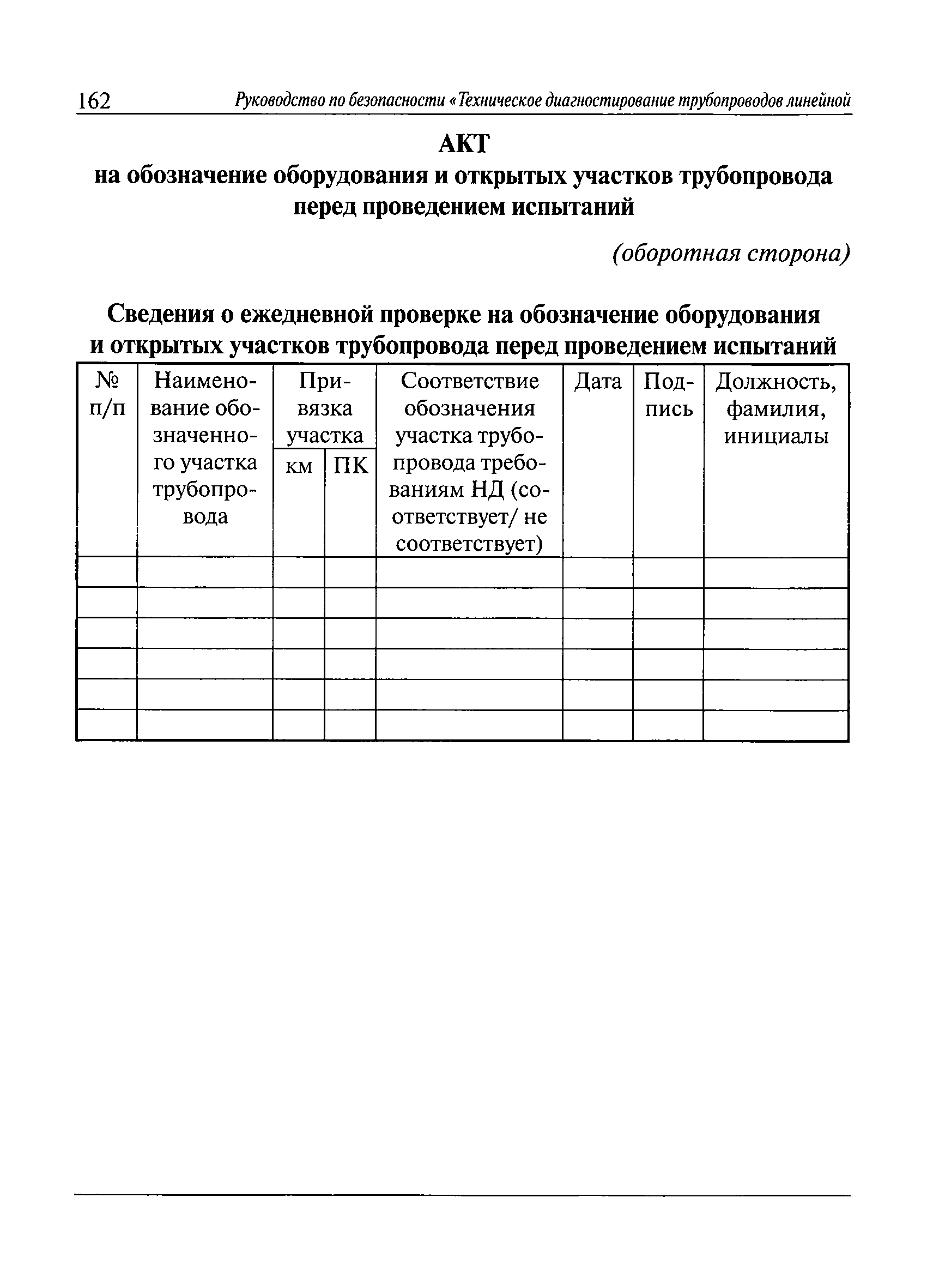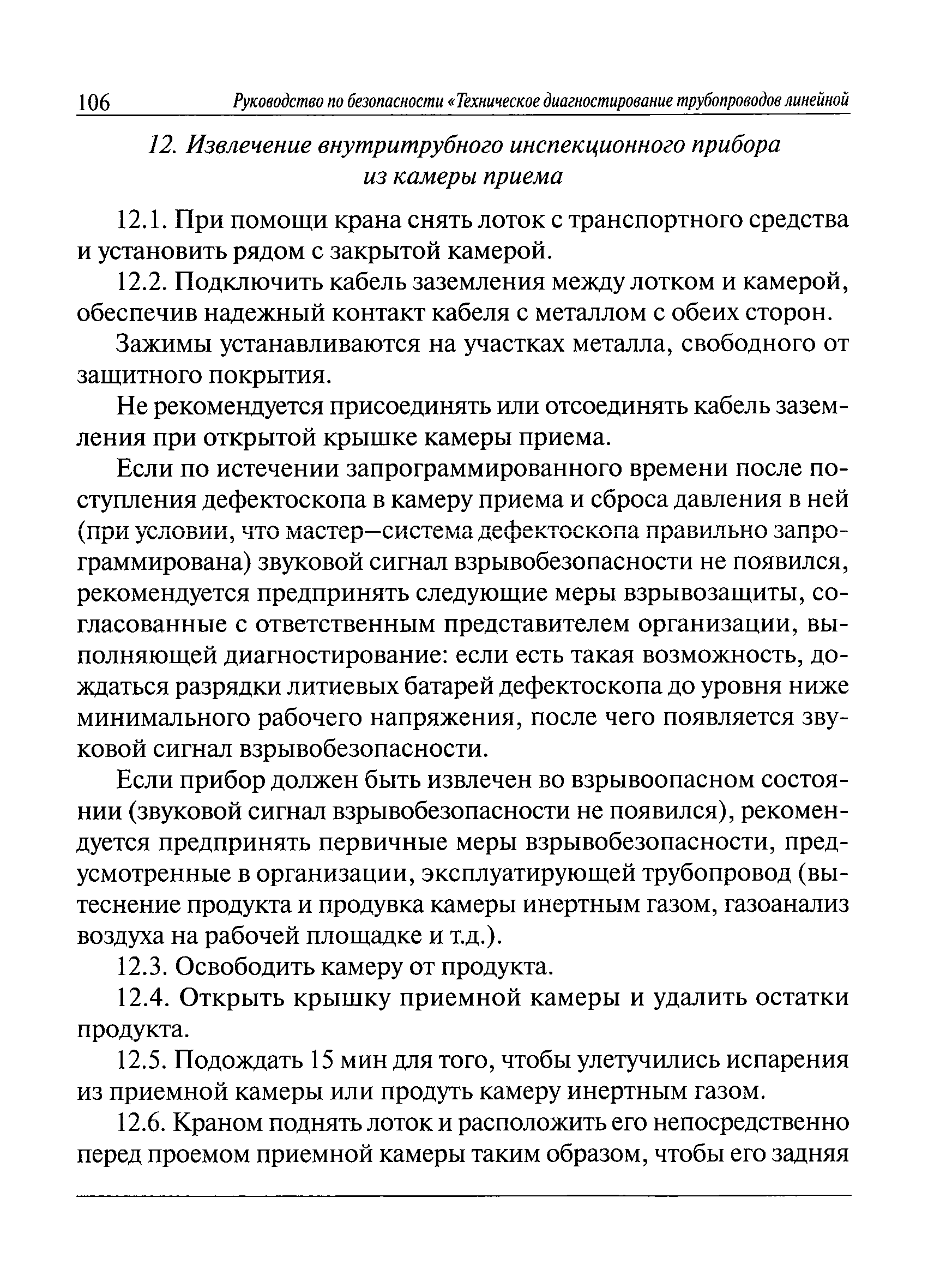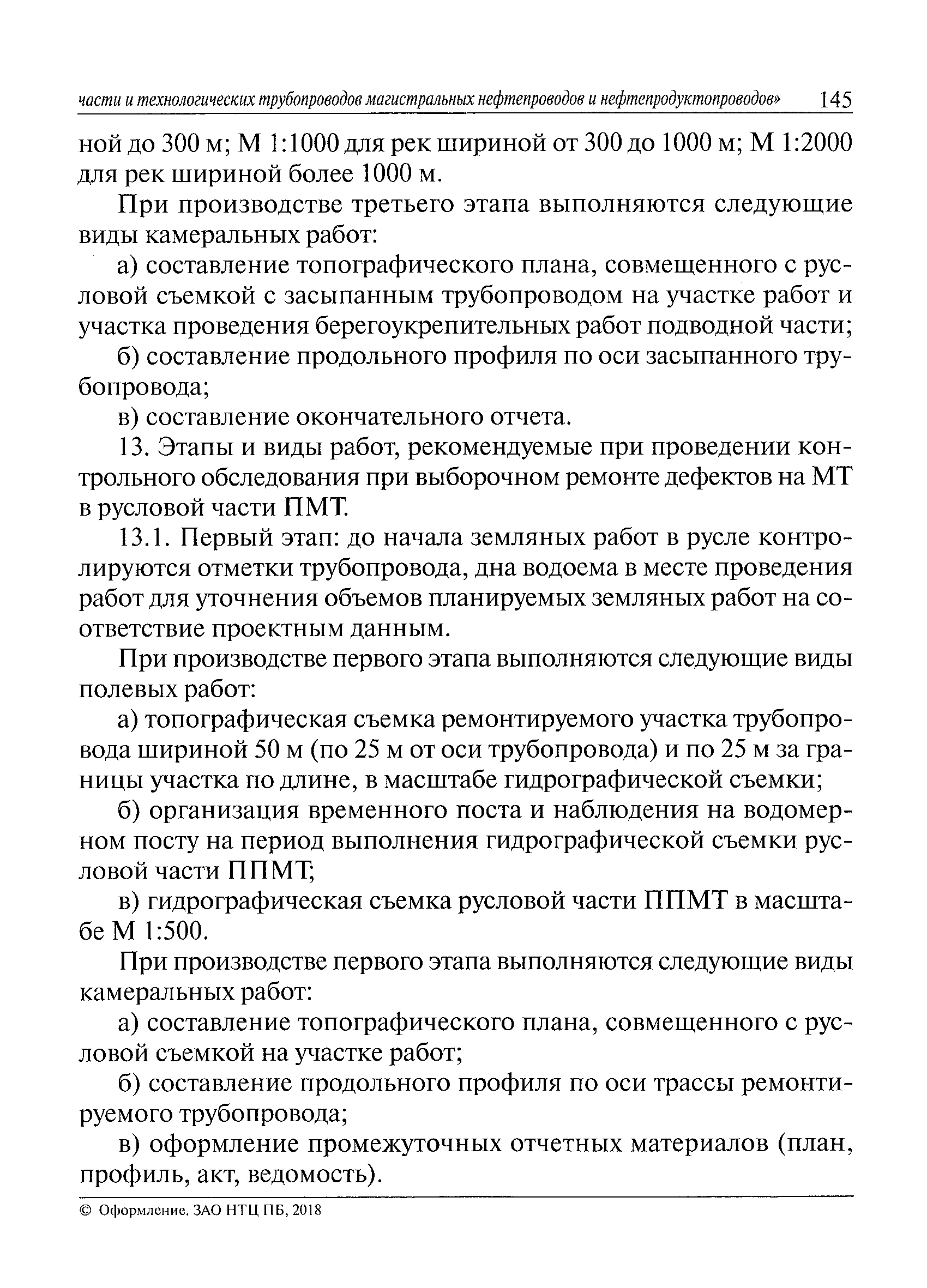 | Оглавление: | I Общие положения II Виды технического диагностирования III Техническое диагностирование линейной части магистральных трубопроводов, законченных строительством. Виды технического диагностирования, выполняемые на трубопроводах, законченных строительством IV Техническое диагностирование линейной части магистральных трубопроводов, находящихся в эксплуатации. Виды технического диагностирования, выполняемые на магистральных трубопроводах, находящихся в эксплуатации V Техническое диагностирование трубопроводов, находящихся в консервации. Виды технического диагностирования, применяемые на трубопроводах, находящихся в консервации, и сроки их проведения VI Техническое диагностирование технологических трубопроводов. Классификация технологических трубопроводов VII Мероприятия по безопасности при испытаниях, очистке и диагностировании трубопровод Приложение 1. Перечень сокращений и их расшифровка Приложение 2. Термины и их определения Приложение 3. Рисунки и таблицы Приложение 4. Рекомендации по методике проведения внутритрубного диагностирования Приложение 5. Рекомендации по видам и срокам проведения технического диагностирования магистральных трубопроводов, находящихся в эксплуатации Приложение 6. Рекомендации по методике выполнения неразрушающего контроля магистральных трубопроводов Приложение 7. Рекомендации по методике проведения работ по электрометрии Приложение 8. Виды работ, проводимые при наружном диагностировании переходов магистральных трубопроводов через водные преграды Приложение 9. Формы предупреждающих знаков Приложение 10. Форма акта на обозначение оборудования и открытых участков трубопровода перед проведением испытаний Приложение 11. Основные рекомендации к выполнению шурфов Приложение 12. Рекомендуемые формы актов при проведении технического диагностирования трубопровода |