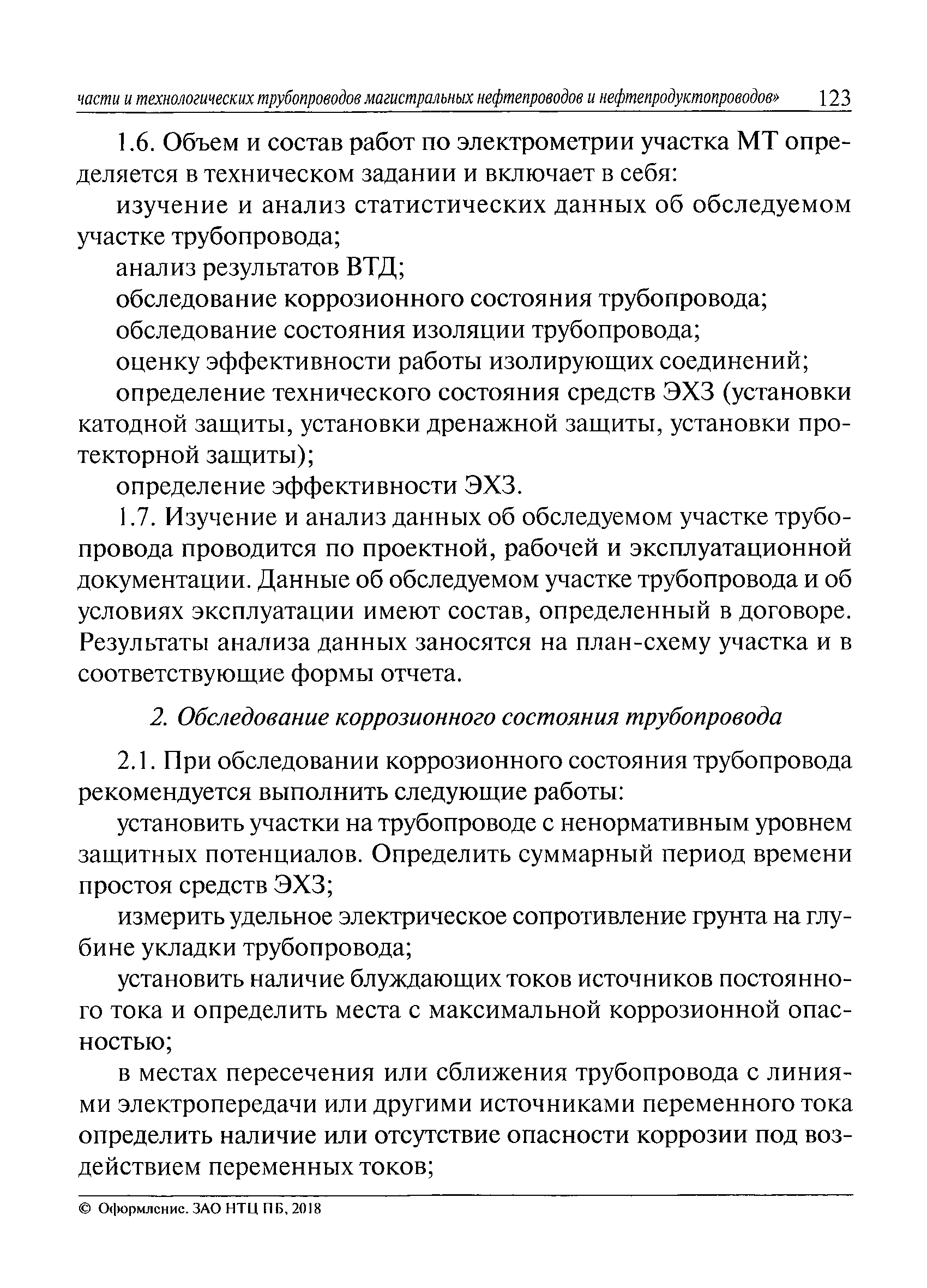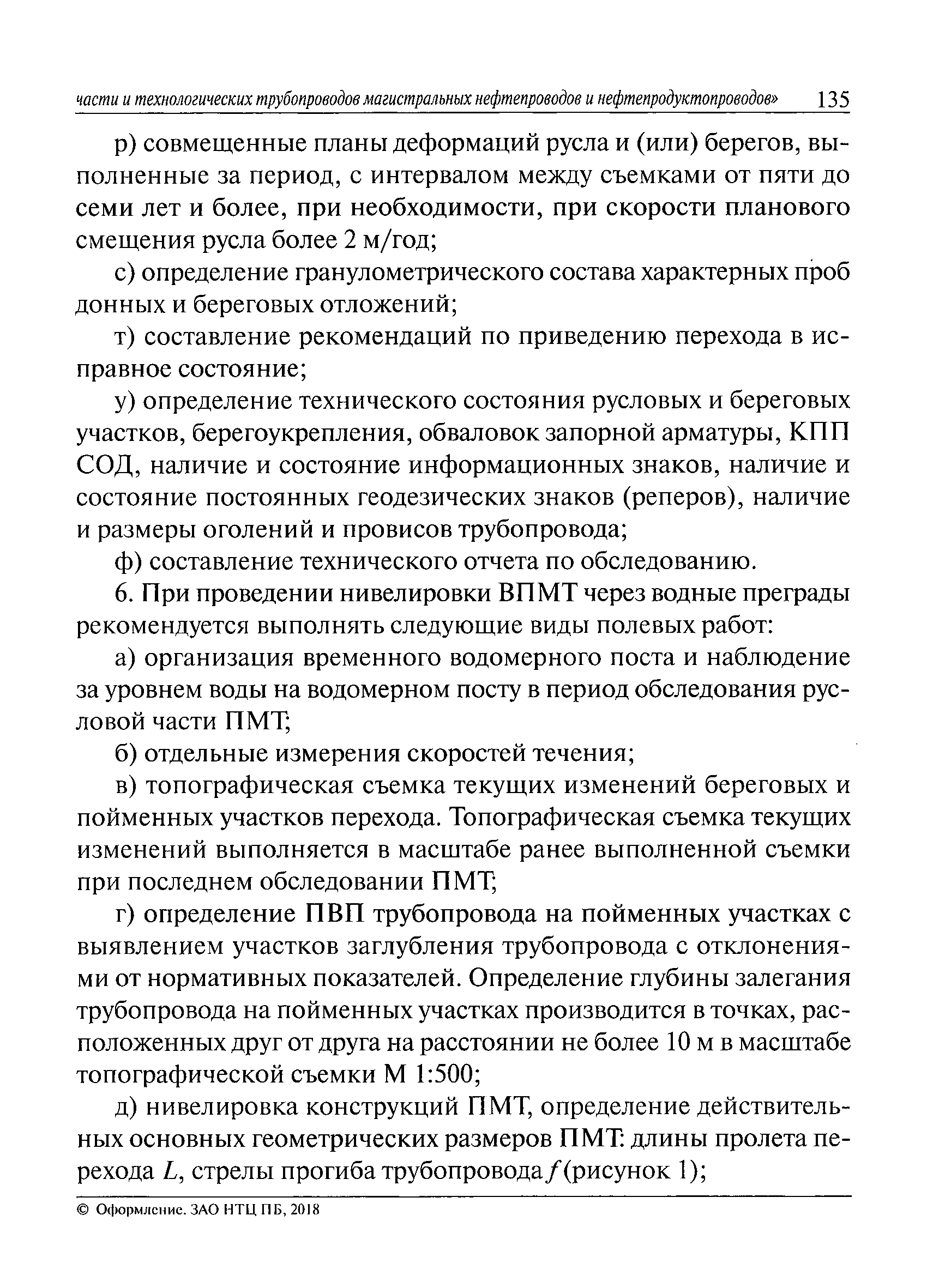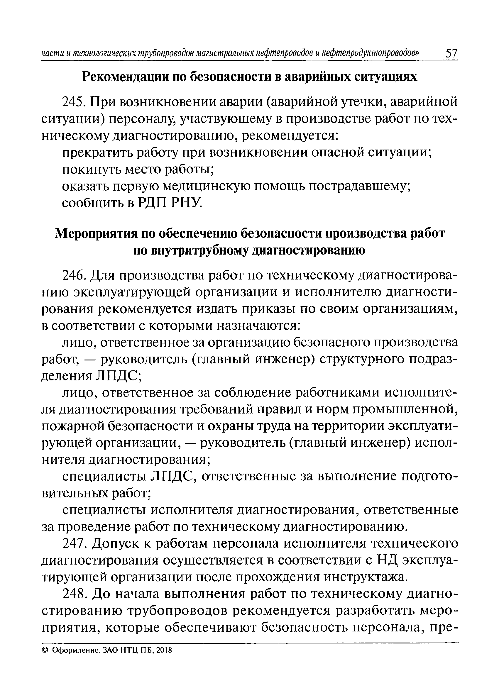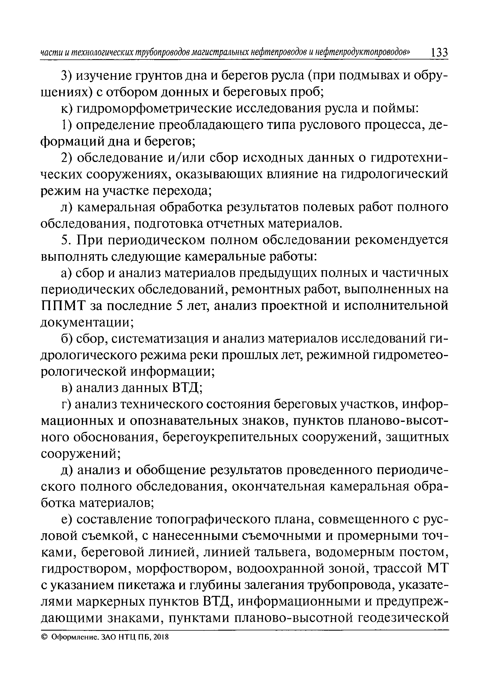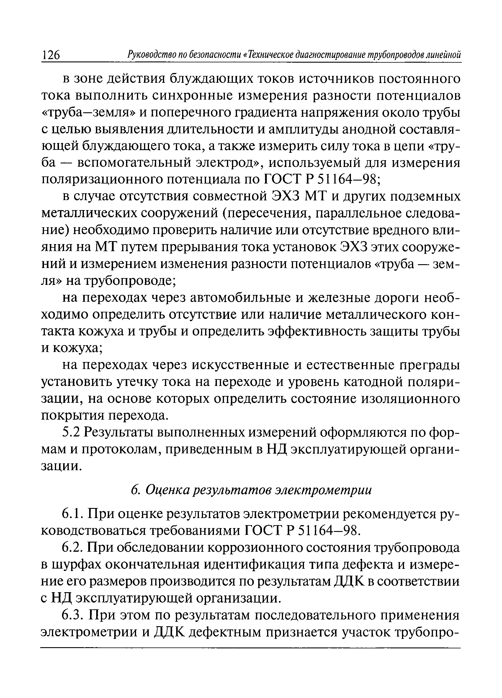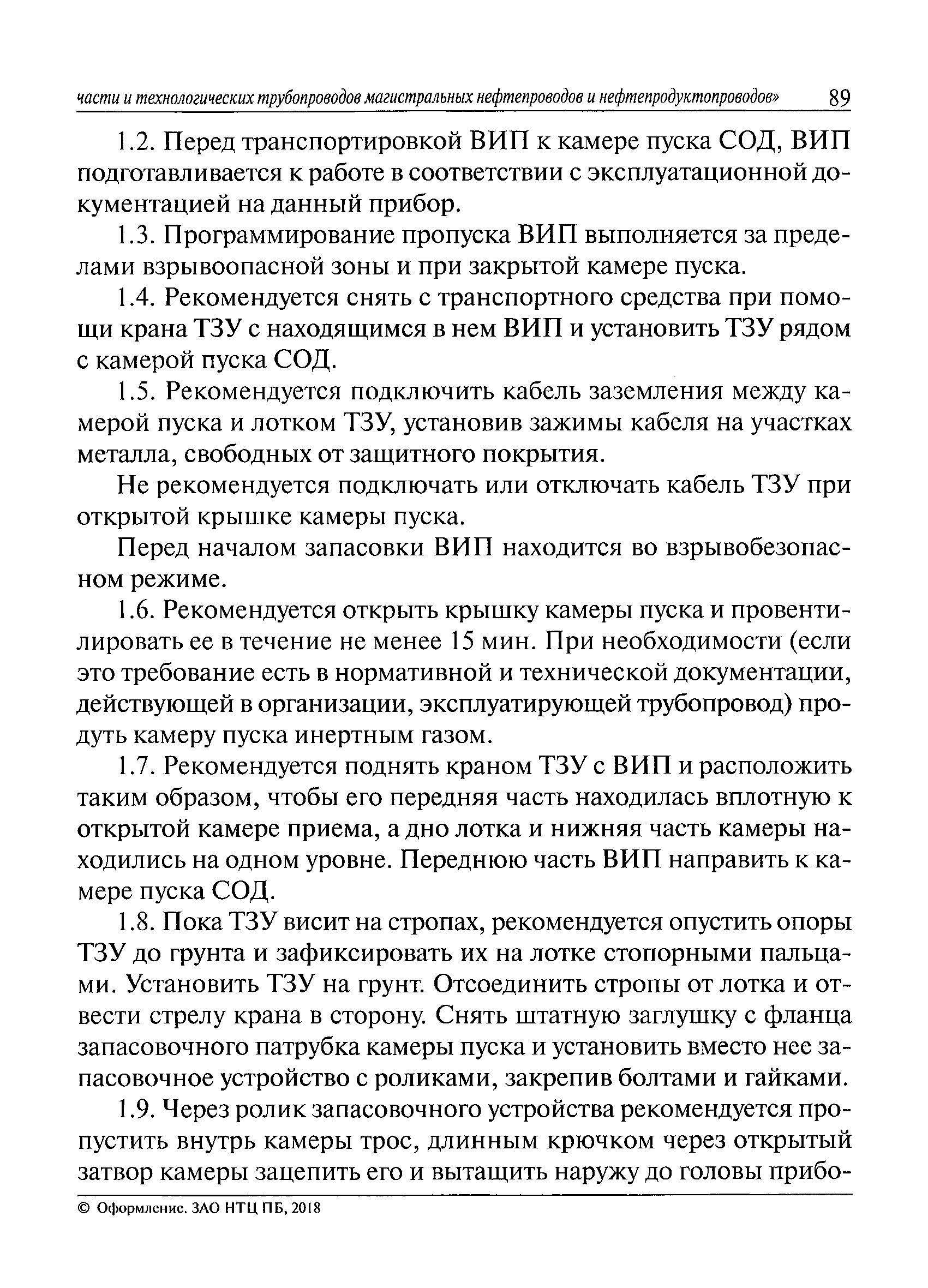 | Оглавление: | I Общие положения II Виды технического диагностирования III Техническое диагностирование линейной части магистральных трубопроводов, законченных строительством. Виды технического диагностирования, выполняемые на трубопроводах, законченных строительством IV Техническое диагностирование линейной части магистральных трубопроводов, находящихся в эксплуатации. Виды технического диагностирования, выполняемые на магистральных трубопроводах, находящихся в эксплуатации V Техническое диагностирование трубопроводов, находящихся в консервации. Виды технического диагностирования, применяемые на трубопроводах, находящихся в консервации, и сроки их проведения VI Техническое диагностирование технологических трубопроводов. Классификация технологических трубопроводов VII Мероприятия по безопасности при испытаниях, очистке и диагностировании трубопровод Приложение 1. Перечень сокращений и их расшифровка Приложение 2. Термины и их определения Приложение 3. Рисунки и таблицы Приложение 4. Рекомендации по методике проведения внутритрубного диагностирования Приложение 5. Рекомендации по видам и срокам проведения технического диагностирования магистральных трубопроводов, находящихся в эксплуатации Приложение 6. Рекомендации по методике выполнения неразрушающего контроля магистральных трубопроводов Приложение 7. Рекомендации по методике проведения работ по электрометрии Приложение 8. Виды работ, проводимые при наружном диагностировании переходов магистральных трубопроводов через водные преграды Приложение 9. Формы предупреждающих знаков Приложение 10. Форма акта на обозначение оборудования и открытых участков трубопровода перед проведением испытаний Приложение 11. Основные рекомендации к выполнению шурфов Приложение 12. Рекомендуемые формы актов при проведении технического диагностирования трубопровода |