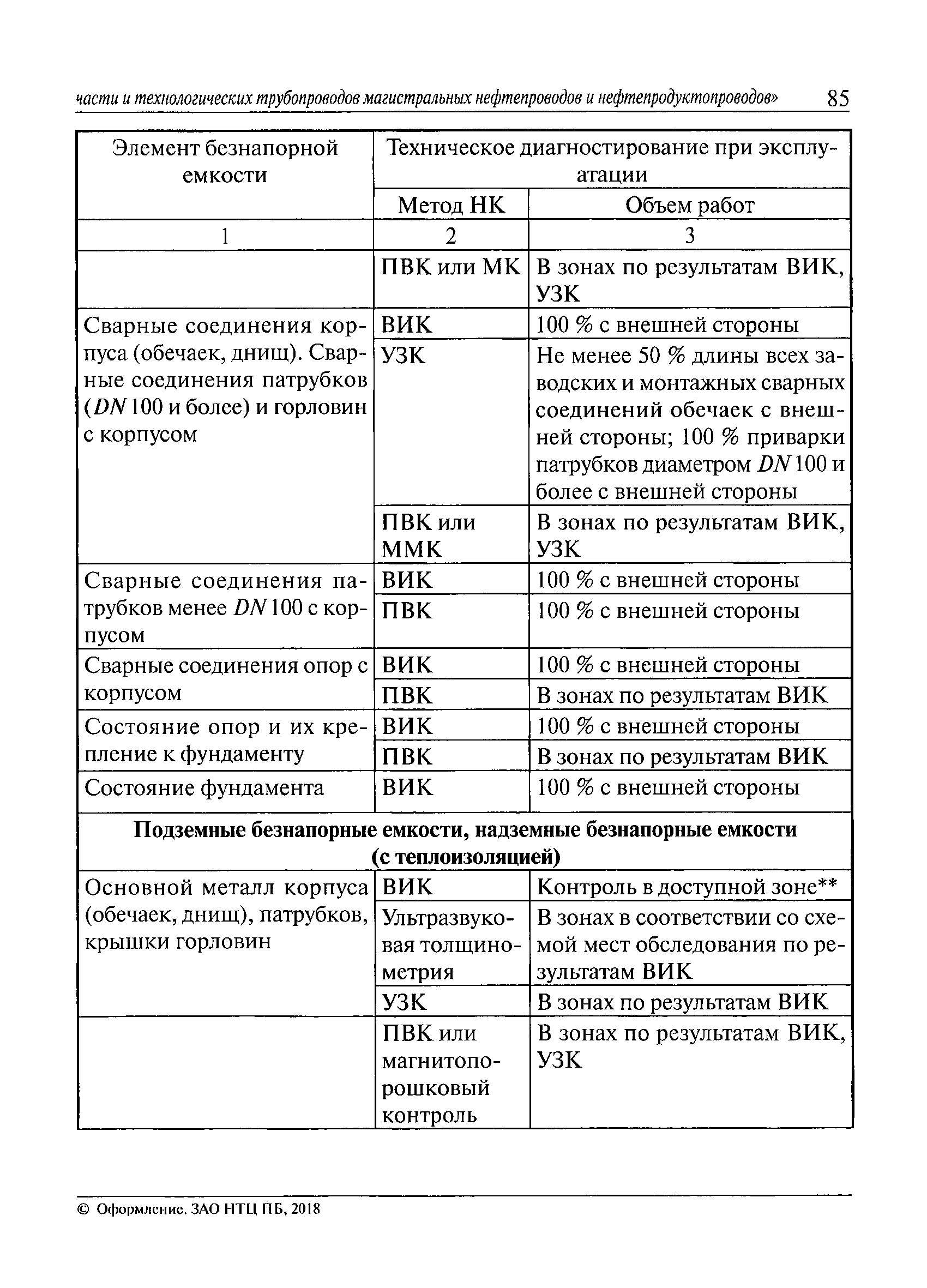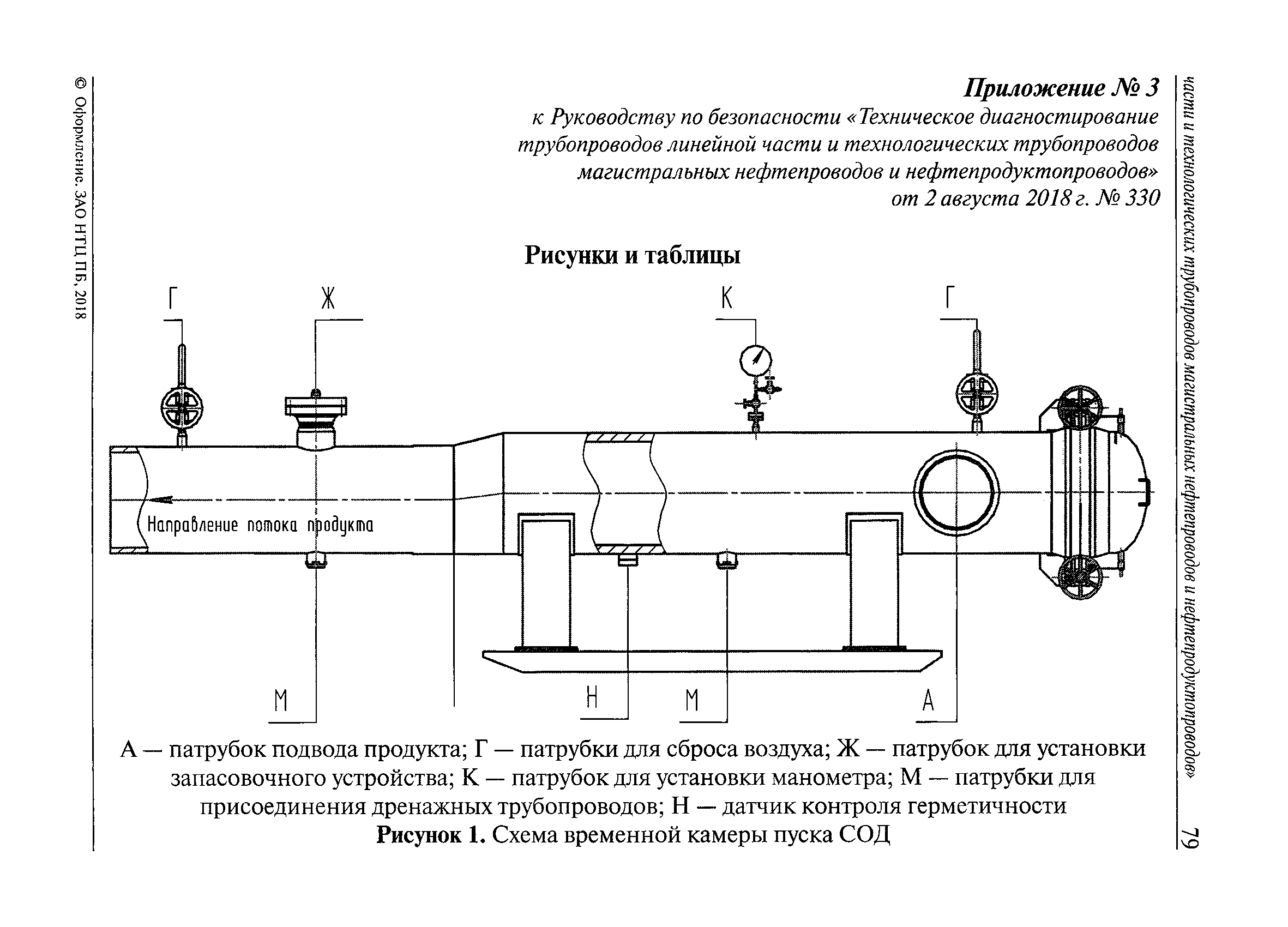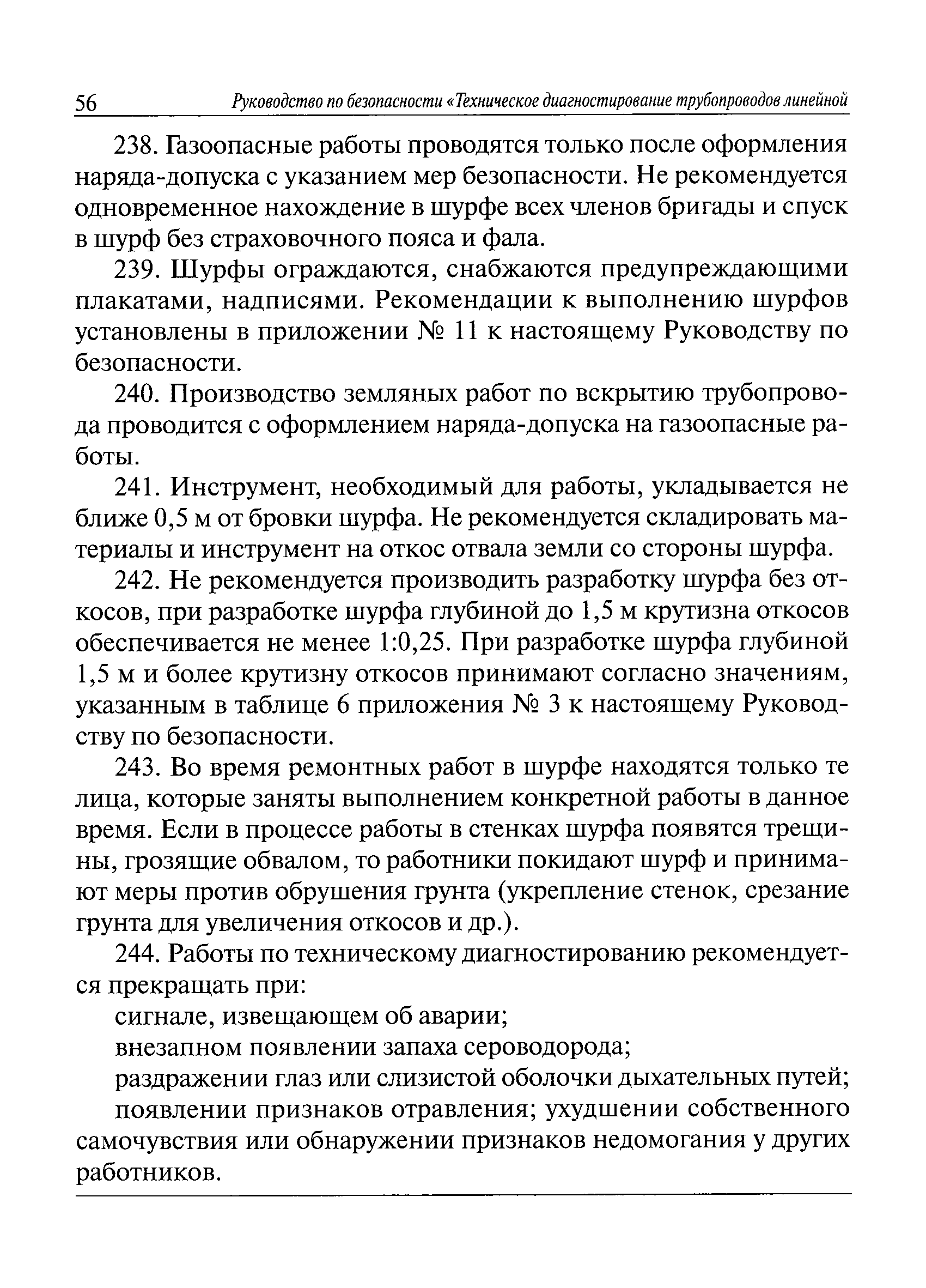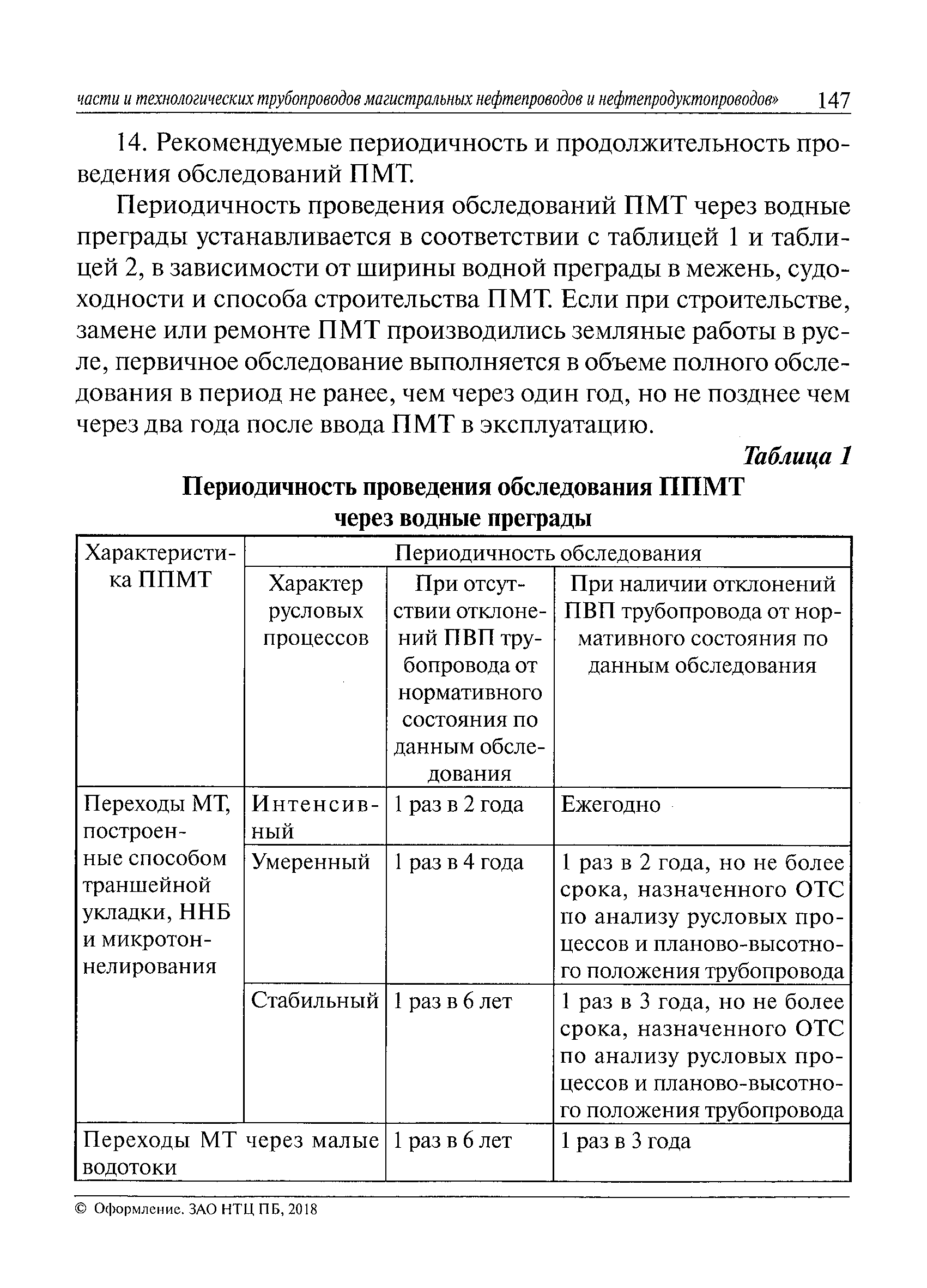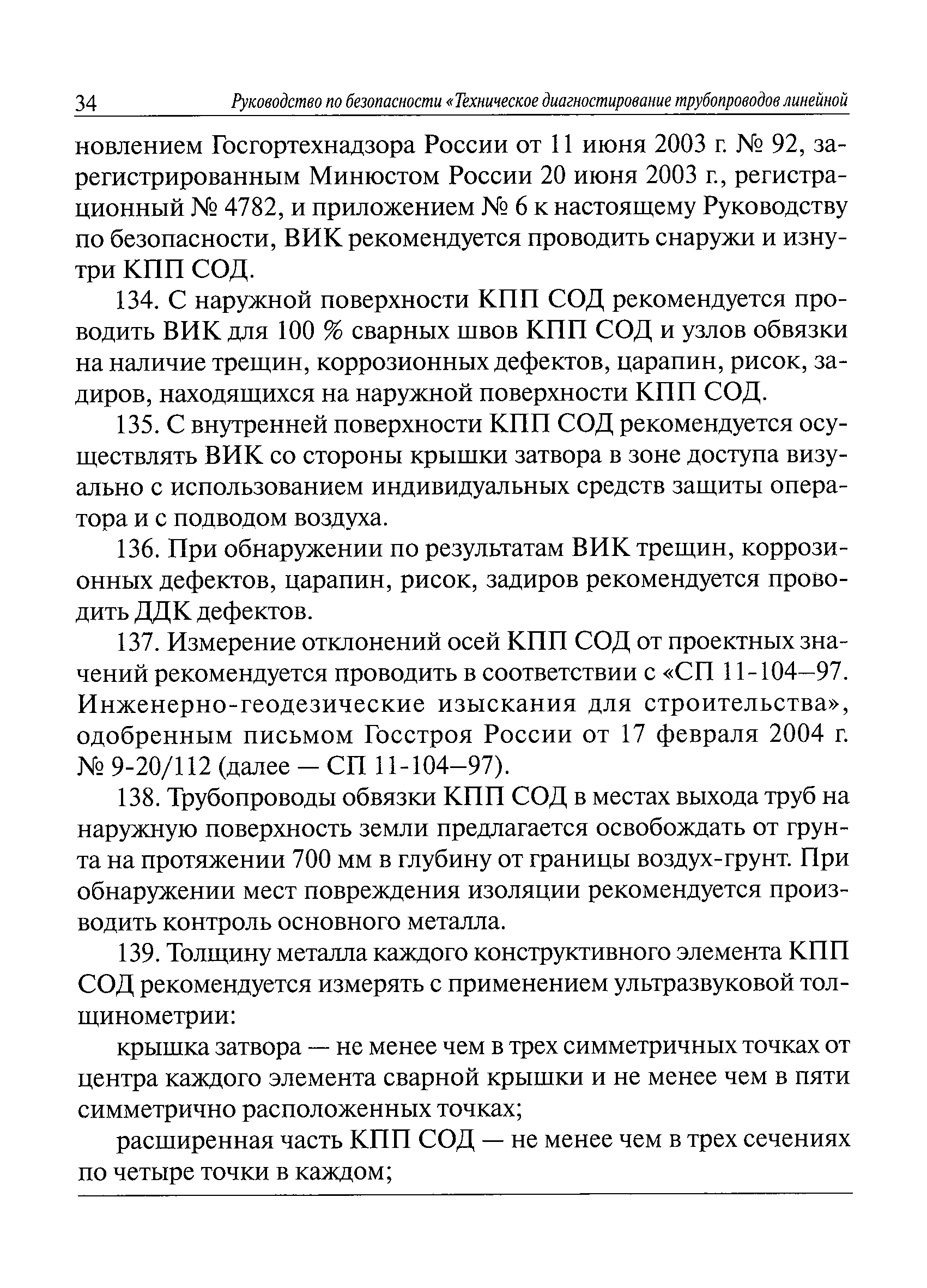 | Оглавление: | I Общие положения II Виды технического диагностирования III Техническое диагностирование линейной части магистральных трубопроводов, законченных строительством. Виды технического диагностирования, выполняемые на трубопроводах, законченных строительством IV Техническое диагностирование линейной части магистральных трубопроводов, находящихся в эксплуатации. Виды технического диагностирования, выполняемые на магистральных трубопроводах, находящихся в эксплуатации V Техническое диагностирование трубопроводов, находящихся в консервации. Виды технического диагностирования, применяемые на трубопроводах, находящихся в консервации, и сроки их проведения VI Техническое диагностирование технологических трубопроводов. Классификация технологических трубопроводов VII Мероприятия по безопасности при испытаниях, очистке и диагностировании трубопровод Приложение 1. Перечень сокращений и их расшифровка Приложение 2. Термины и их определения Приложение 3. Рисунки и таблицы Приложение 4. Рекомендации по методике проведения внутритрубного диагностирования Приложение 5. Рекомендации по видам и срокам проведения технического диагностирования магистральных трубопроводов, находящихся в эксплуатации Приложение 6. Рекомендации по методике выполнения неразрушающего контроля магистральных трубопроводов Приложение 7. Рекомендации по методике проведения работ по электрометрии Приложение 8. Виды работ, проводимые при наружном диагностировании переходов магистральных трубопроводов через водные преграды Приложение 9. Формы предупреждающих знаков Приложение 10. Форма акта на обозначение оборудования и открытых участков трубопровода перед проведением испытаний Приложение 11. Основные рекомендации к выполнению шурфов Приложение 12. Рекомендуемые формы актов при проведении технического диагностирования трубопровода |