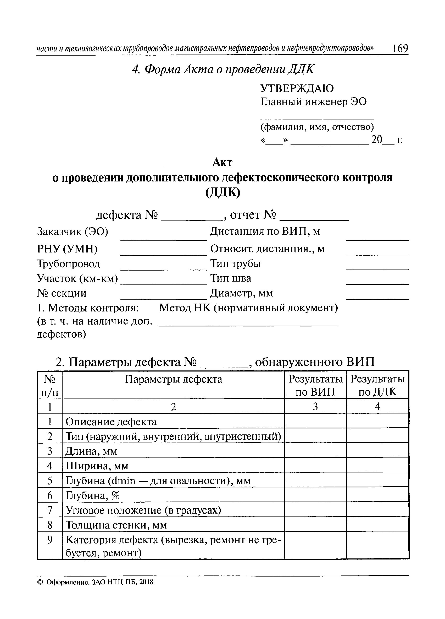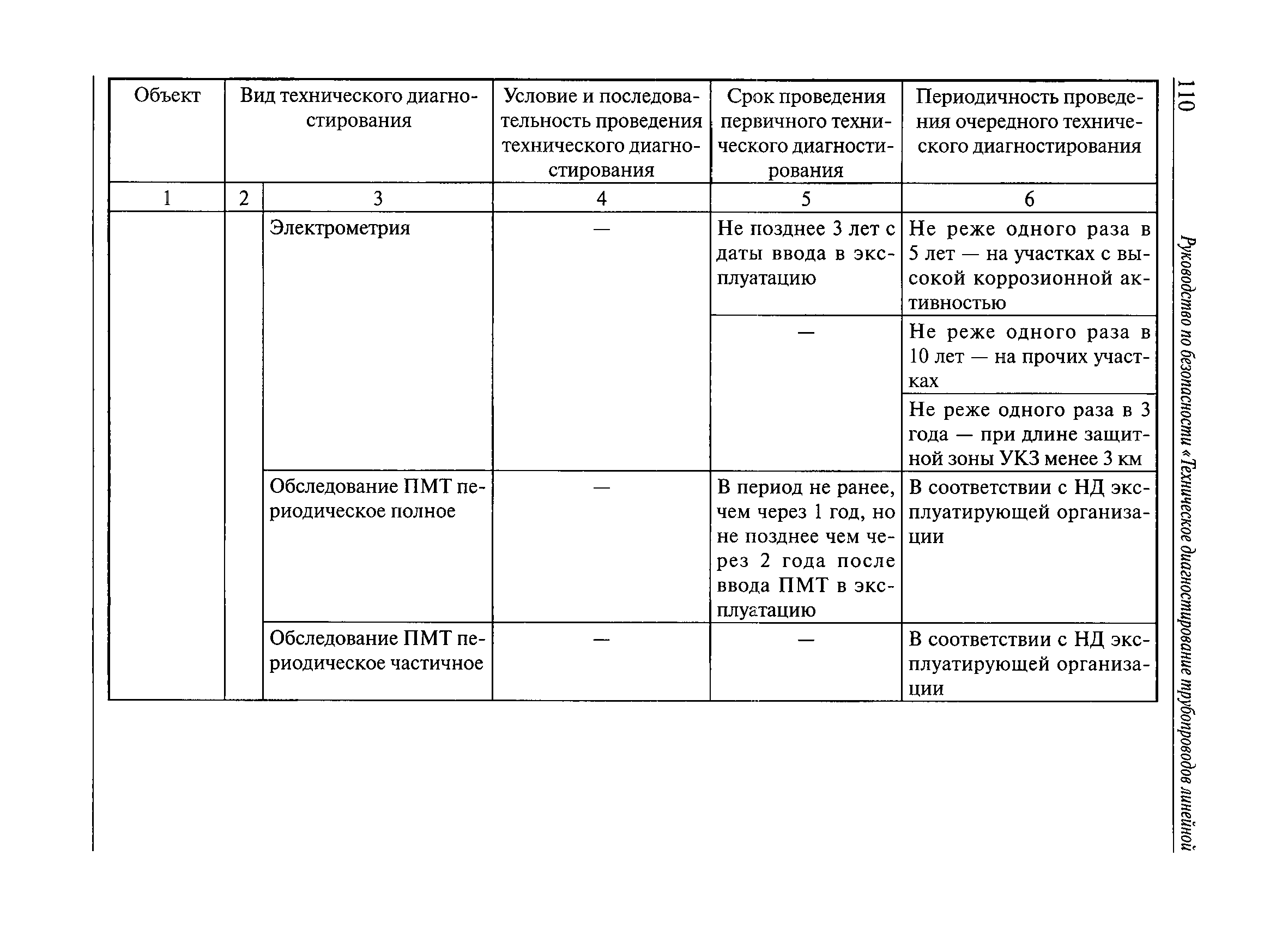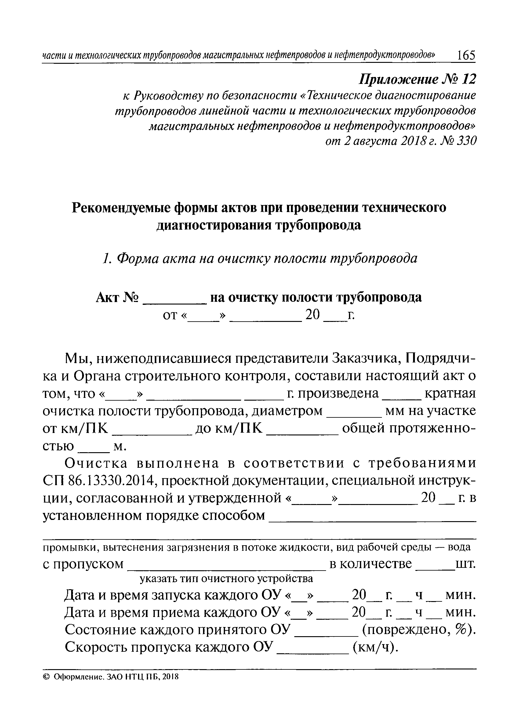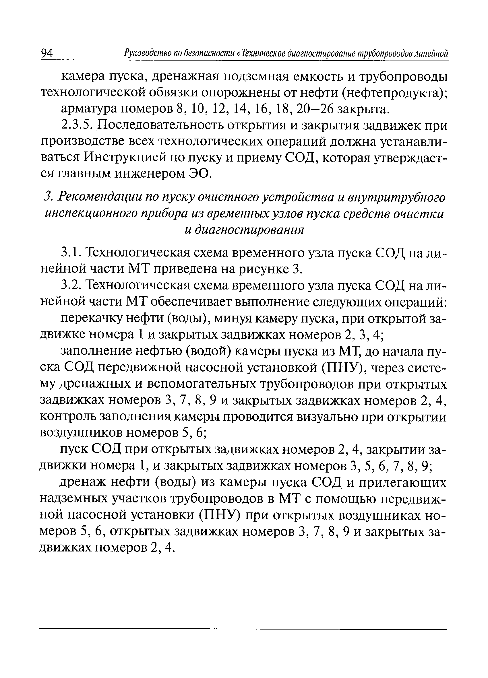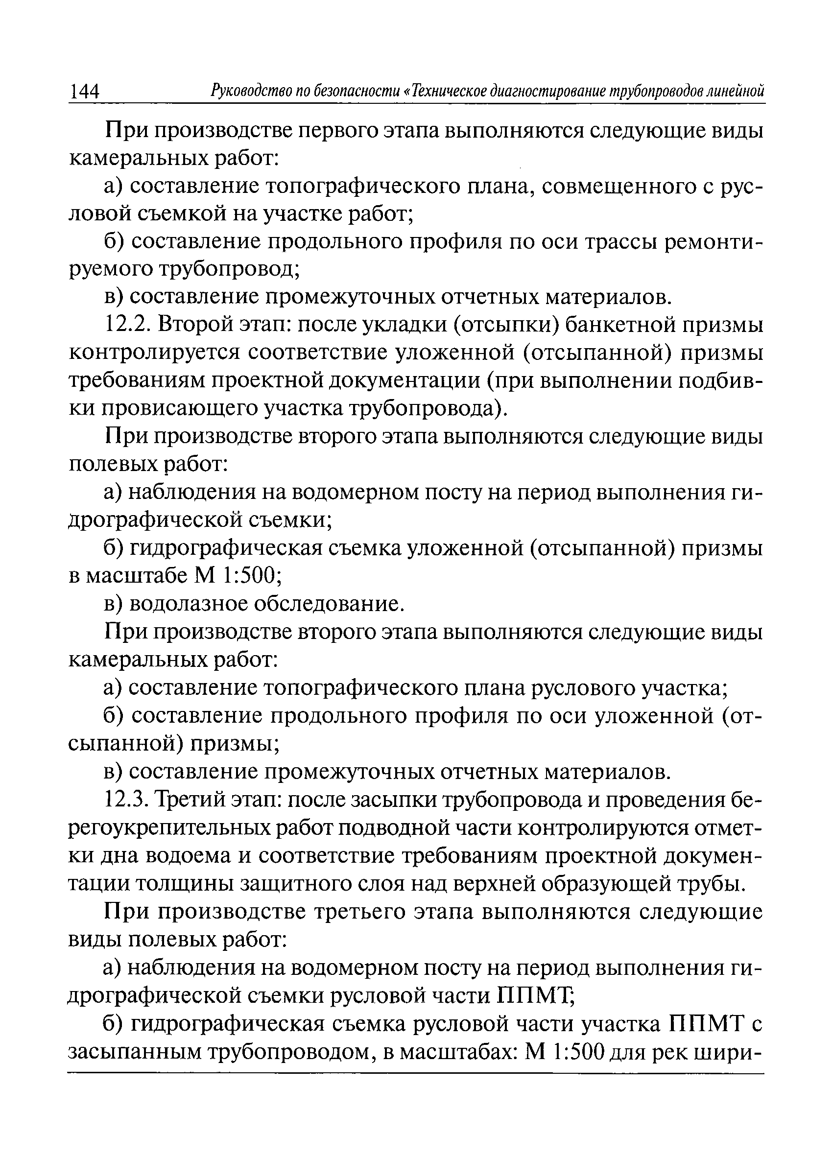 | Оглавление: | I Общие положения II Виды технического диагностирования III Техническое диагностирование линейной части магистральных трубопроводов, законченных строительством. Виды технического диагностирования, выполняемые на трубопроводах, законченных строительством IV Техническое диагностирование линейной части магистральных трубопроводов, находящихся в эксплуатации. Виды технического диагностирования, выполняемые на магистральных трубопроводах, находящихся в эксплуатации V Техническое диагностирование трубопроводов, находящихся в консервации. Виды технического диагностирования, применяемые на трубопроводах, находящихся в консервации, и сроки их проведения VI Техническое диагностирование технологических трубопроводов. Классификация технологических трубопроводов VII Мероприятия по безопасности при испытаниях, очистке и диагностировании трубопровод Приложение 1. Перечень сокращений и их расшифровка Приложение 2. Термины и их определения Приложение 3. Рисунки и таблицы Приложение 4. Рекомендации по методике проведения внутритрубного диагностирования Приложение 5. Рекомендации по видам и срокам проведения технического диагностирования магистральных трубопроводов, находящихся в эксплуатации Приложение 6. Рекомендации по методике выполнения неразрушающего контроля магистральных трубопроводов Приложение 7. Рекомендации по методике проведения работ по электрометрии Приложение 8. Виды работ, проводимые при наружном диагностировании переходов магистральных трубопроводов через водные преграды Приложение 9. Формы предупреждающих знаков Приложение 10. Форма акта на обозначение оборудования и открытых участков трубопровода перед проведением испытаний Приложение 11. Основные рекомендации к выполнению шурфов Приложение 12. Рекомендуемые формы актов при проведении технического диагностирования трубопровода |