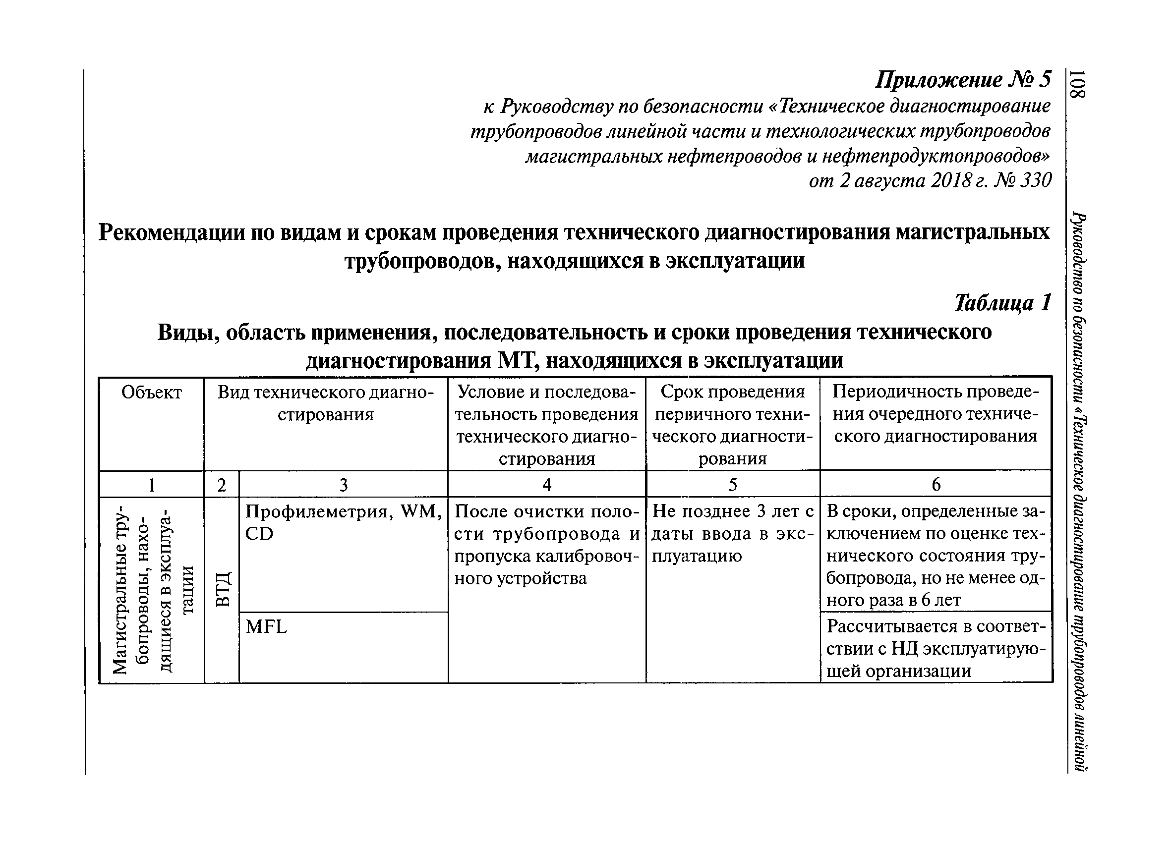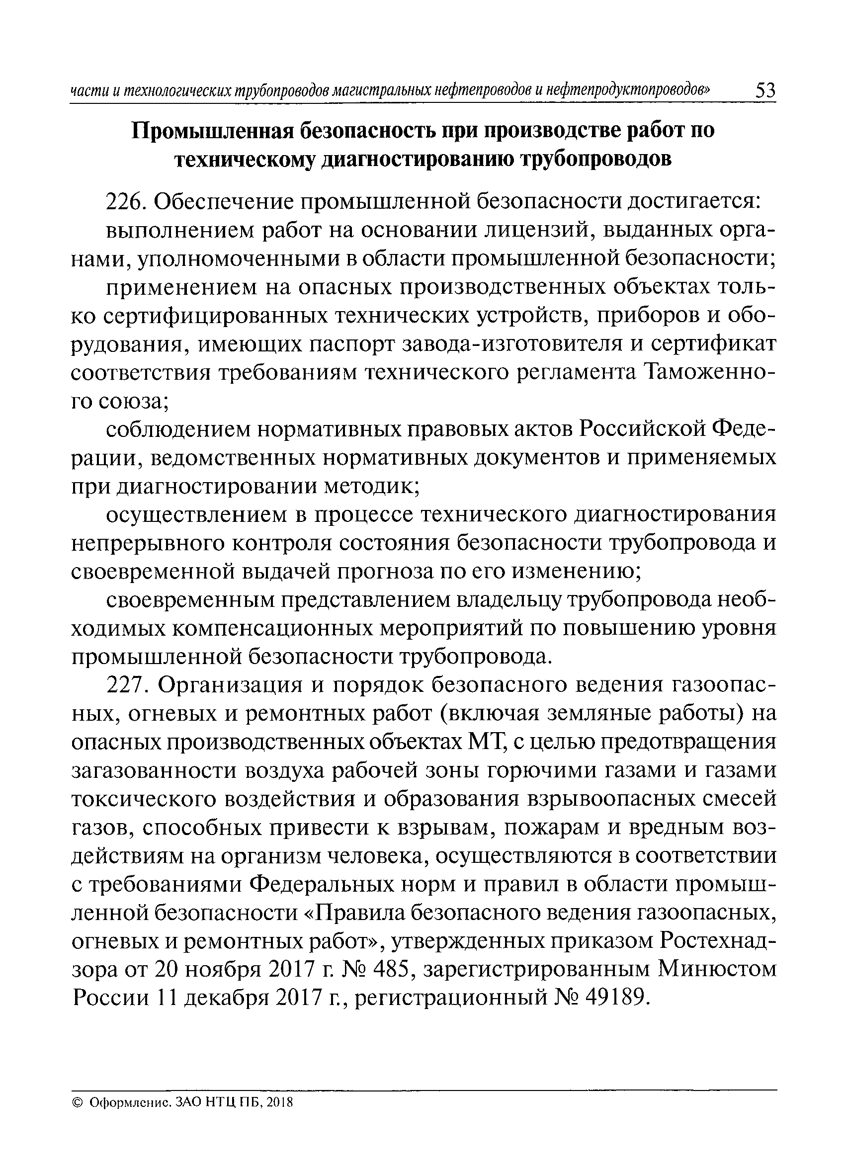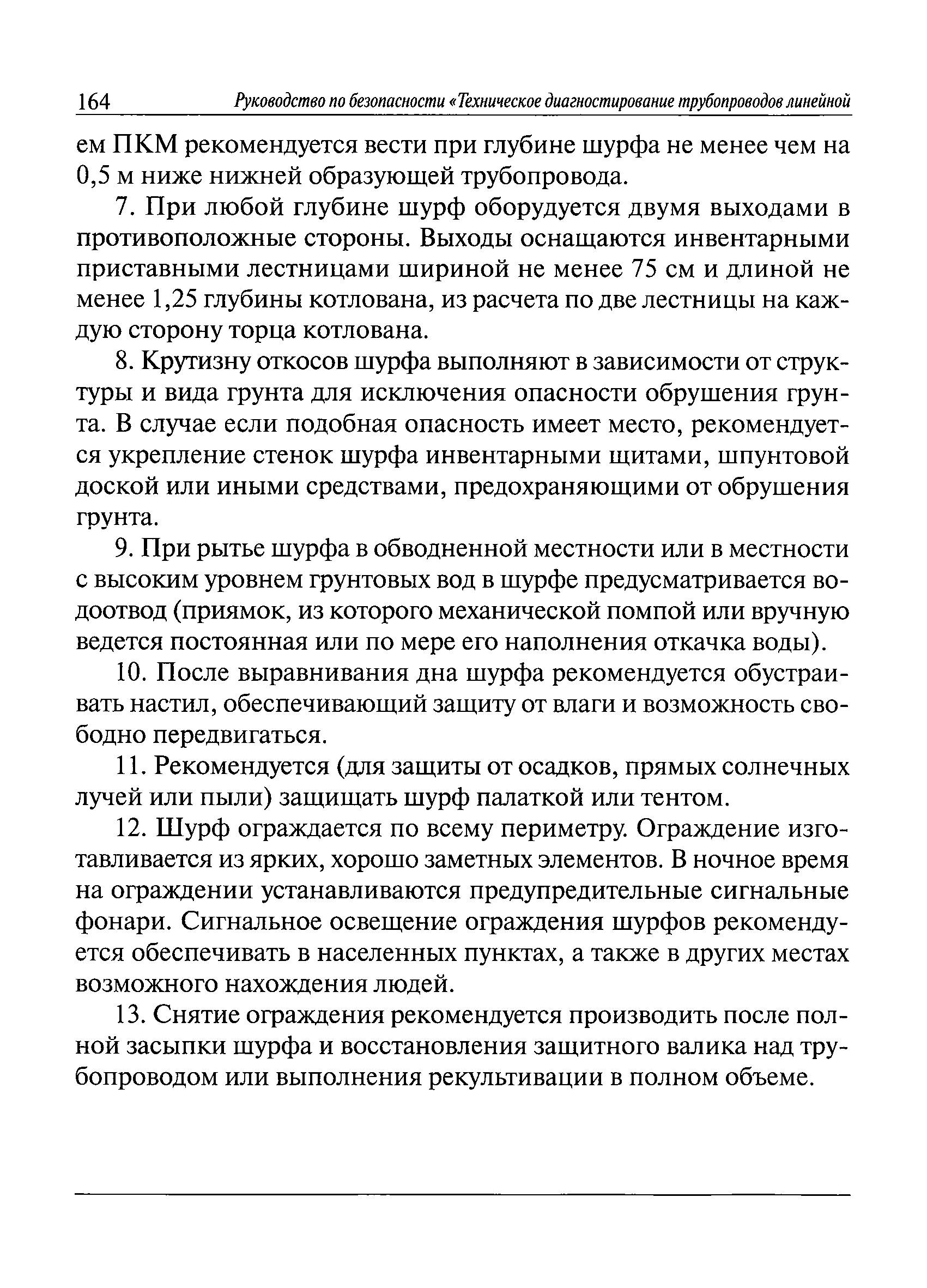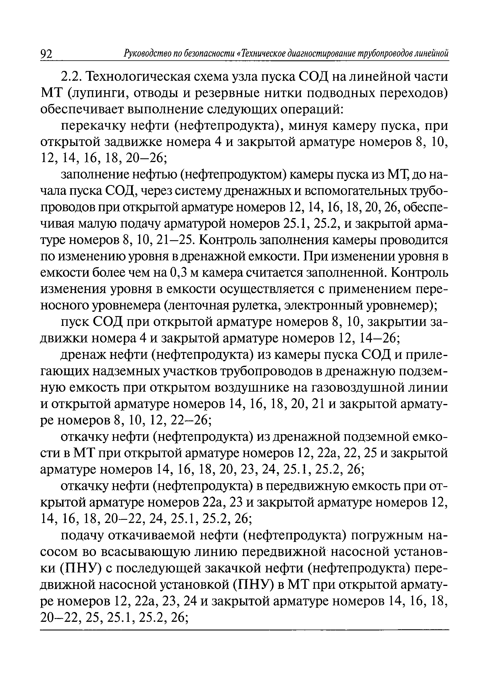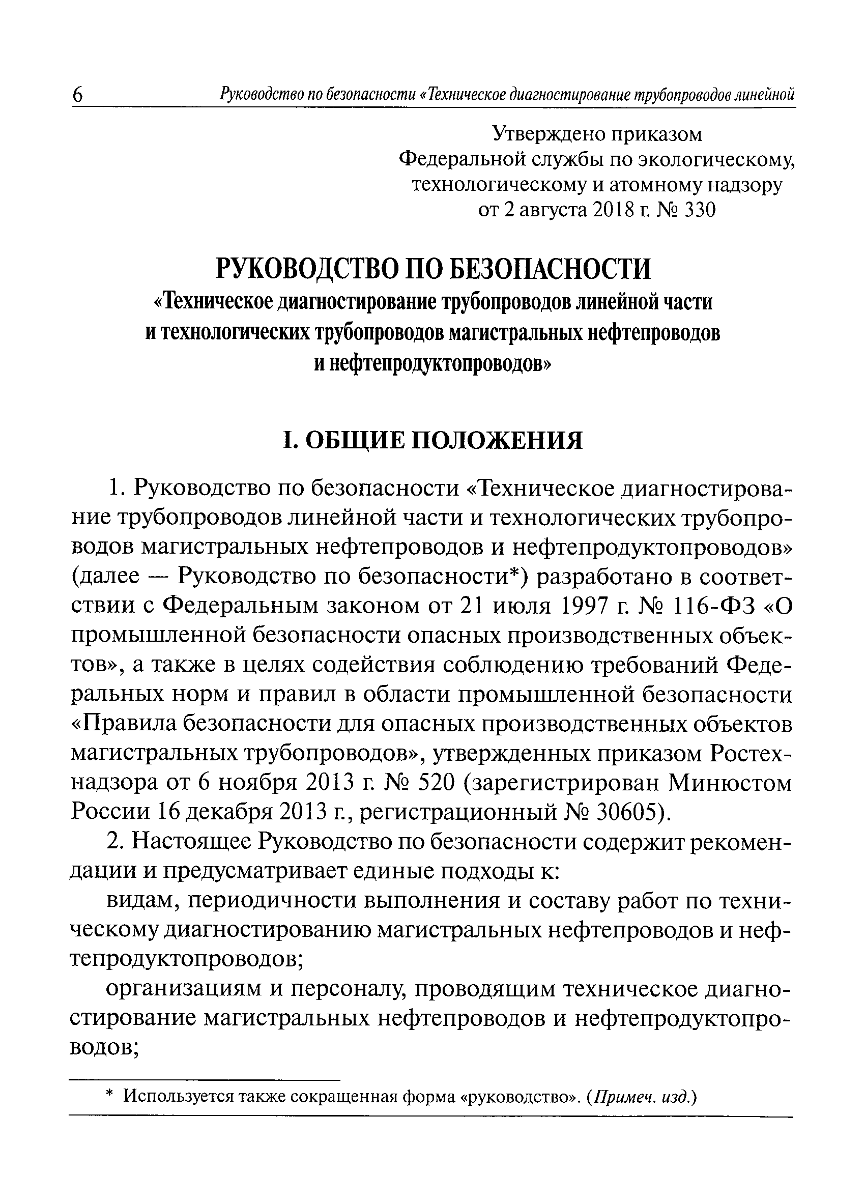 | Оглавление: | I Общие положения II Виды технического диагностирования III Техническое диагностирование линейной части магистральных трубопроводов, законченных строительством. Виды технического диагностирования, выполняемые на трубопроводах, законченных строительством IV Техническое диагностирование линейной части магистральных трубопроводов, находящихся в эксплуатации. Виды технического диагностирования, выполняемые на магистральных трубопроводах, находящихся в эксплуатации V Техническое диагностирование трубопроводов, находящихся в консервации. Виды технического диагностирования, применяемые на трубопроводах, находящихся в консервации, и сроки их проведения VI Техническое диагностирование технологических трубопроводов. Классификация технологических трубопроводов VII Мероприятия по безопасности при испытаниях, очистке и диагностировании трубопровод Приложение 1. Перечень сокращений и их расшифровка Приложение 2. Термины и их определения Приложение 3. Рисунки и таблицы Приложение 4. Рекомендации по методике проведения внутритрубного диагностирования Приложение 5. Рекомендации по видам и срокам проведения технического диагностирования магистральных трубопроводов, находящихся в эксплуатации Приложение 6. Рекомендации по методике выполнения неразрушающего контроля магистральных трубопроводов Приложение 7. Рекомендации по методике проведения работ по электрометрии Приложение 8. Виды работ, проводимые при наружном диагностировании переходов магистральных трубопроводов через водные преграды Приложение 9. Формы предупреждающих знаков Приложение 10. Форма акта на обозначение оборудования и открытых участков трубопровода перед проведением испытаний Приложение 11. Основные рекомендации к выполнению шурфов Приложение 12. Рекомендуемые формы актов при проведении технического диагностирования трубопровода |