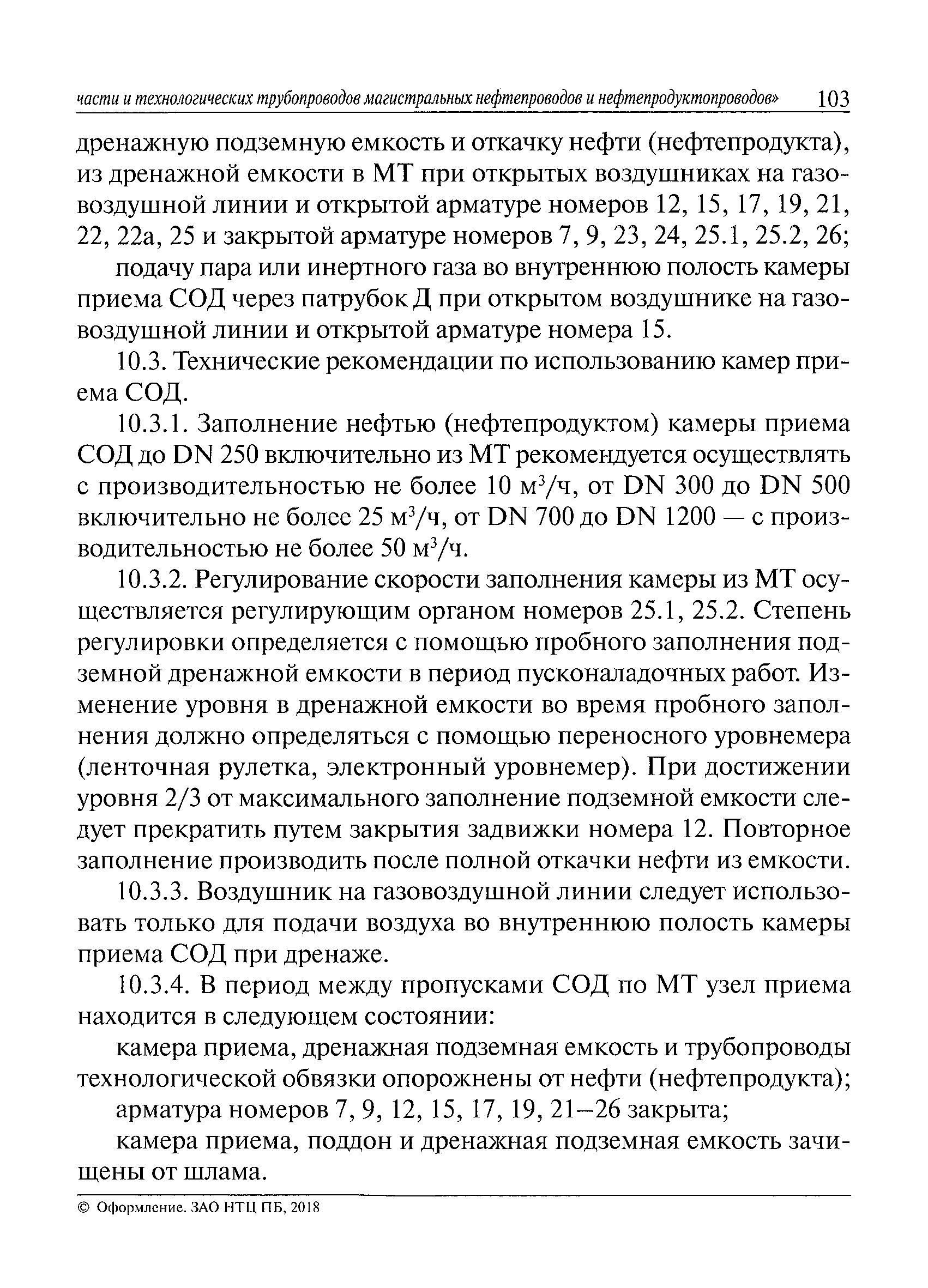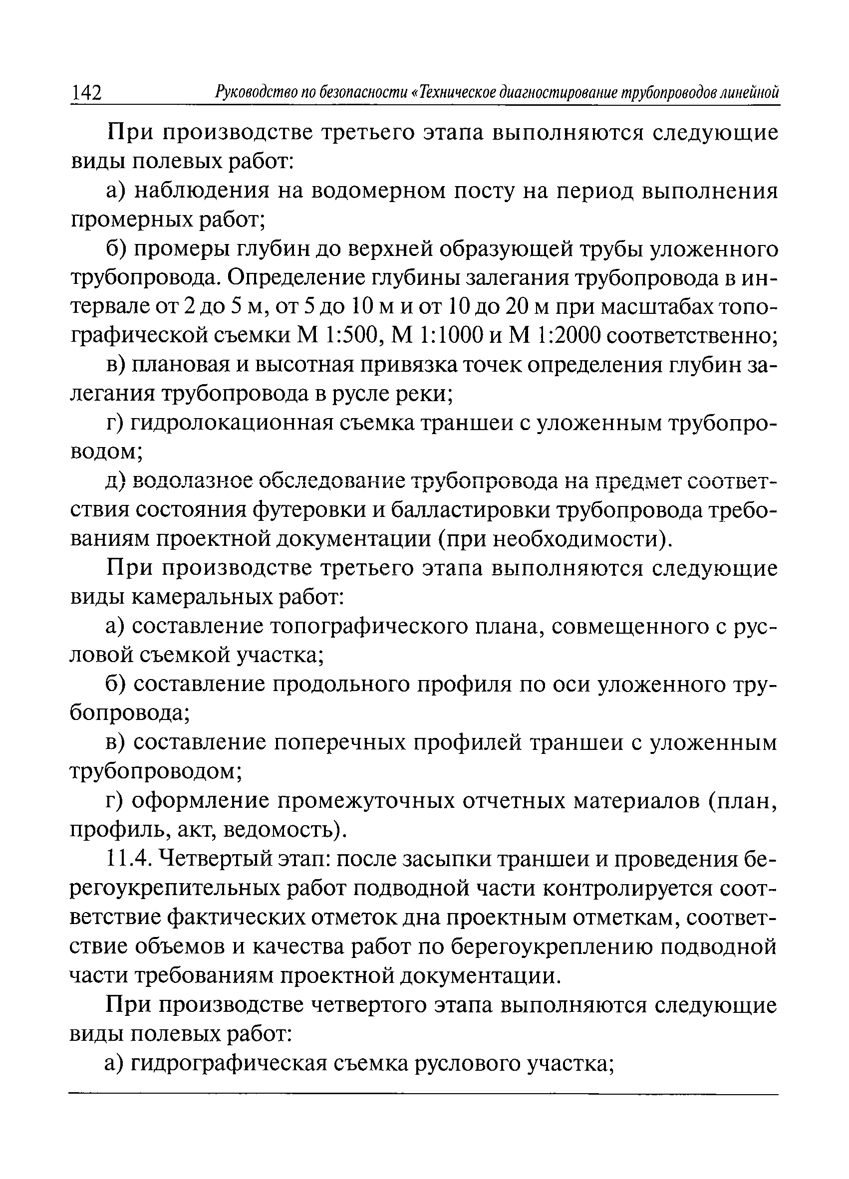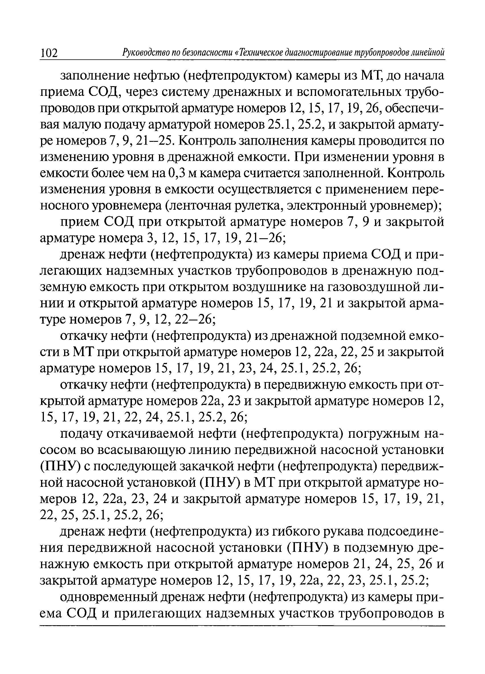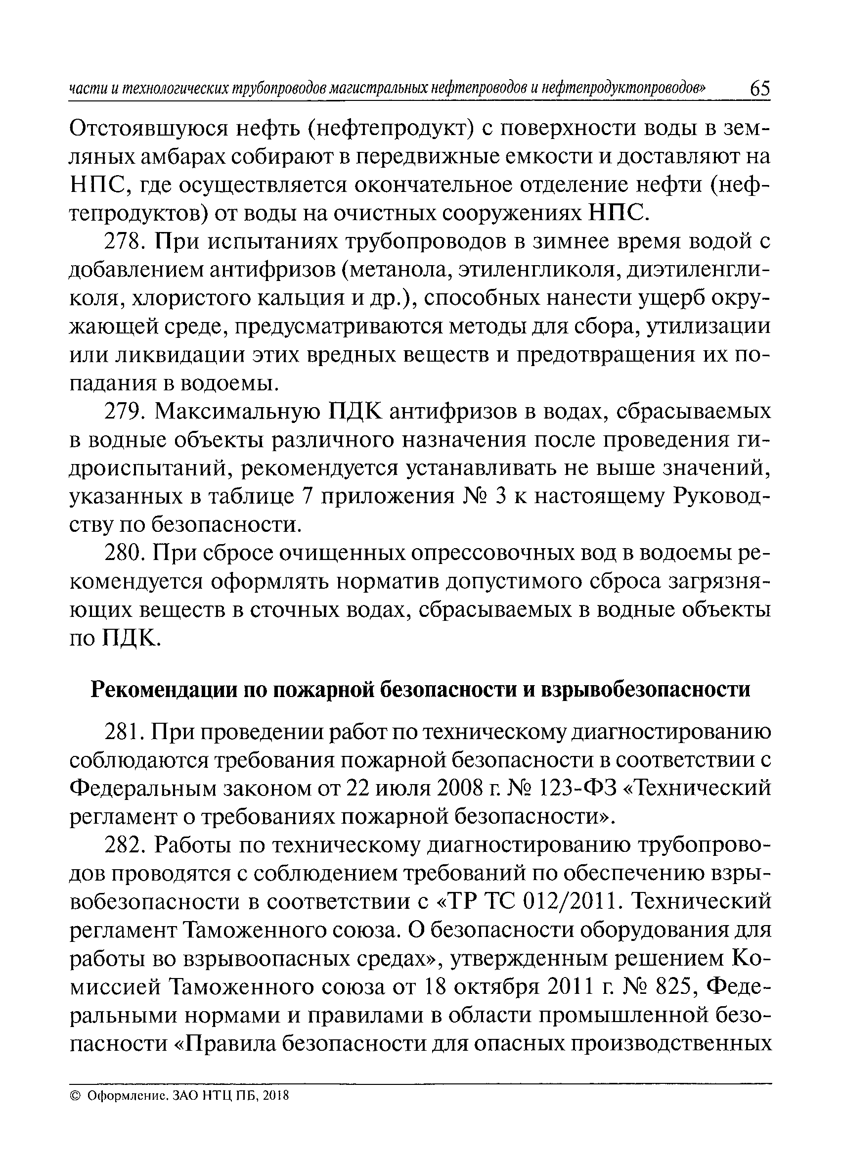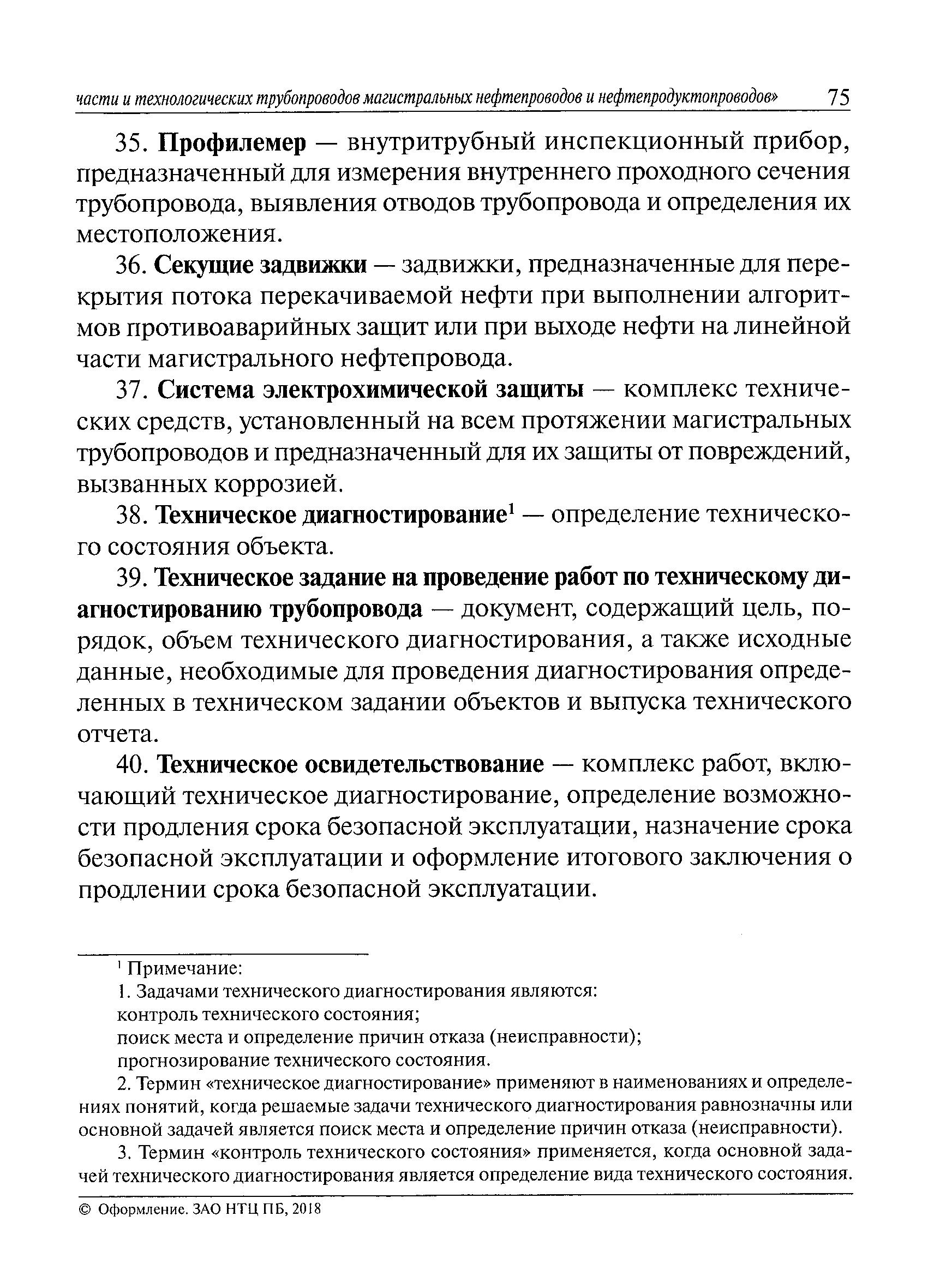 | Оглавление: | I Общие положения II Виды технического диагностирования III Техническое диагностирование линейной части магистральных трубопроводов, законченных строительством. Виды технического диагностирования, выполняемые на трубопроводах, законченных строительством IV Техническое диагностирование линейной части магистральных трубопроводов, находящихся в эксплуатации. Виды технического диагностирования, выполняемые на магистральных трубопроводах, находящихся в эксплуатации V Техническое диагностирование трубопроводов, находящихся в консервации. Виды технического диагностирования, применяемые на трубопроводах, находящихся в консервации, и сроки их проведения VI Техническое диагностирование технологических трубопроводов. Классификация технологических трубопроводов VII Мероприятия по безопасности при испытаниях, очистке и диагностировании трубопровод Приложение 1. Перечень сокращений и их расшифровка Приложение 2. Термины и их определения Приложение 3. Рисунки и таблицы Приложение 4. Рекомендации по методике проведения внутритрубного диагностирования Приложение 5. Рекомендации по видам и срокам проведения технического диагностирования магистральных трубопроводов, находящихся в эксплуатации Приложение 6. Рекомендации по методике выполнения неразрушающего контроля магистральных трубопроводов Приложение 7. Рекомендации по методике проведения работ по электрометрии Приложение 8. Виды работ, проводимые при наружном диагностировании переходов магистральных трубопроводов через водные преграды Приложение 9. Формы предупреждающих знаков Приложение 10. Форма акта на обозначение оборудования и открытых участков трубопровода перед проведением испытаний Приложение 11. Основные рекомендации к выполнению шурфов Приложение 12. Рекомендуемые формы актов при проведении технического диагностирования трубопровода |