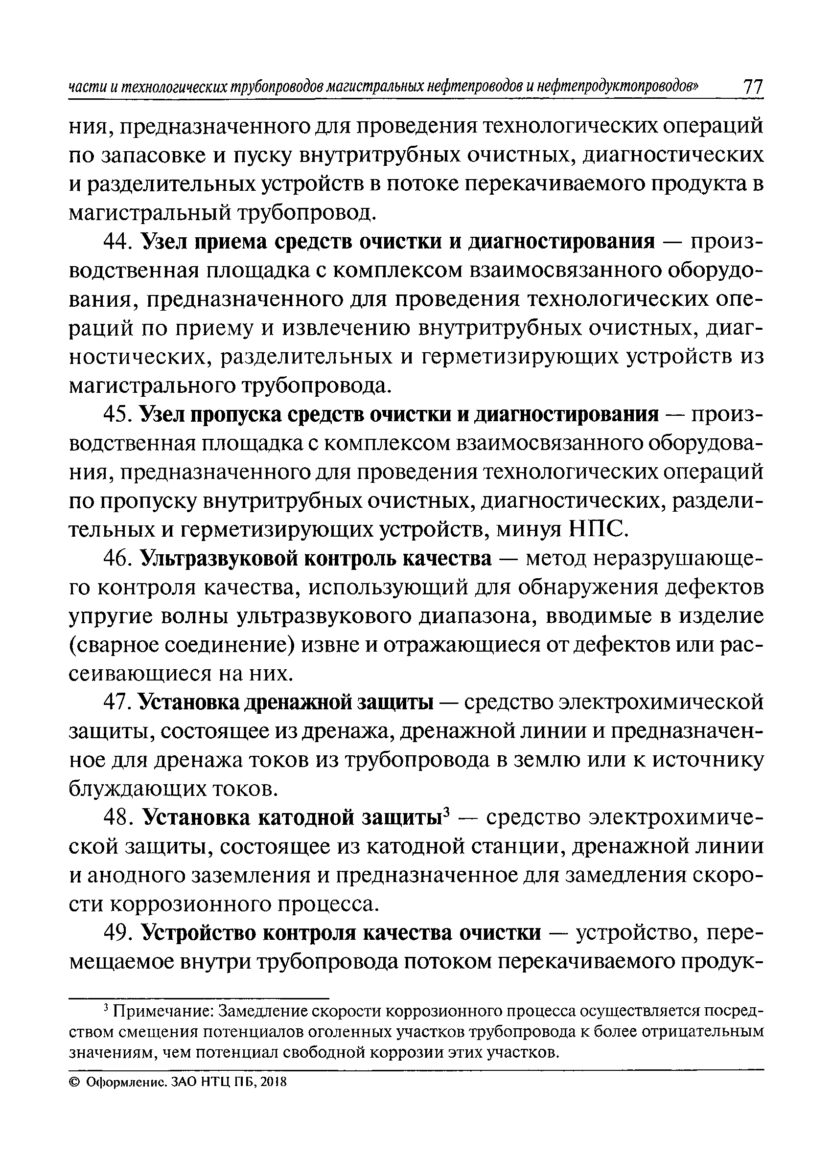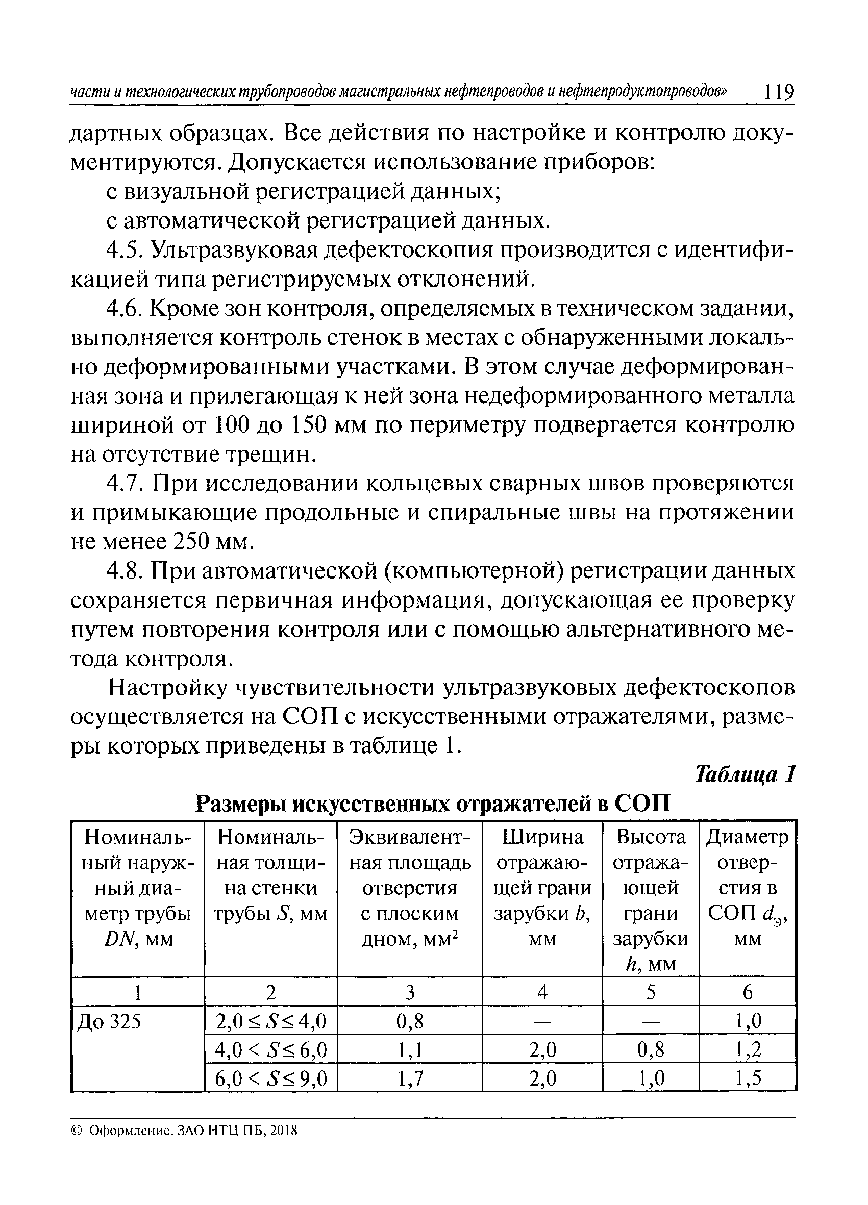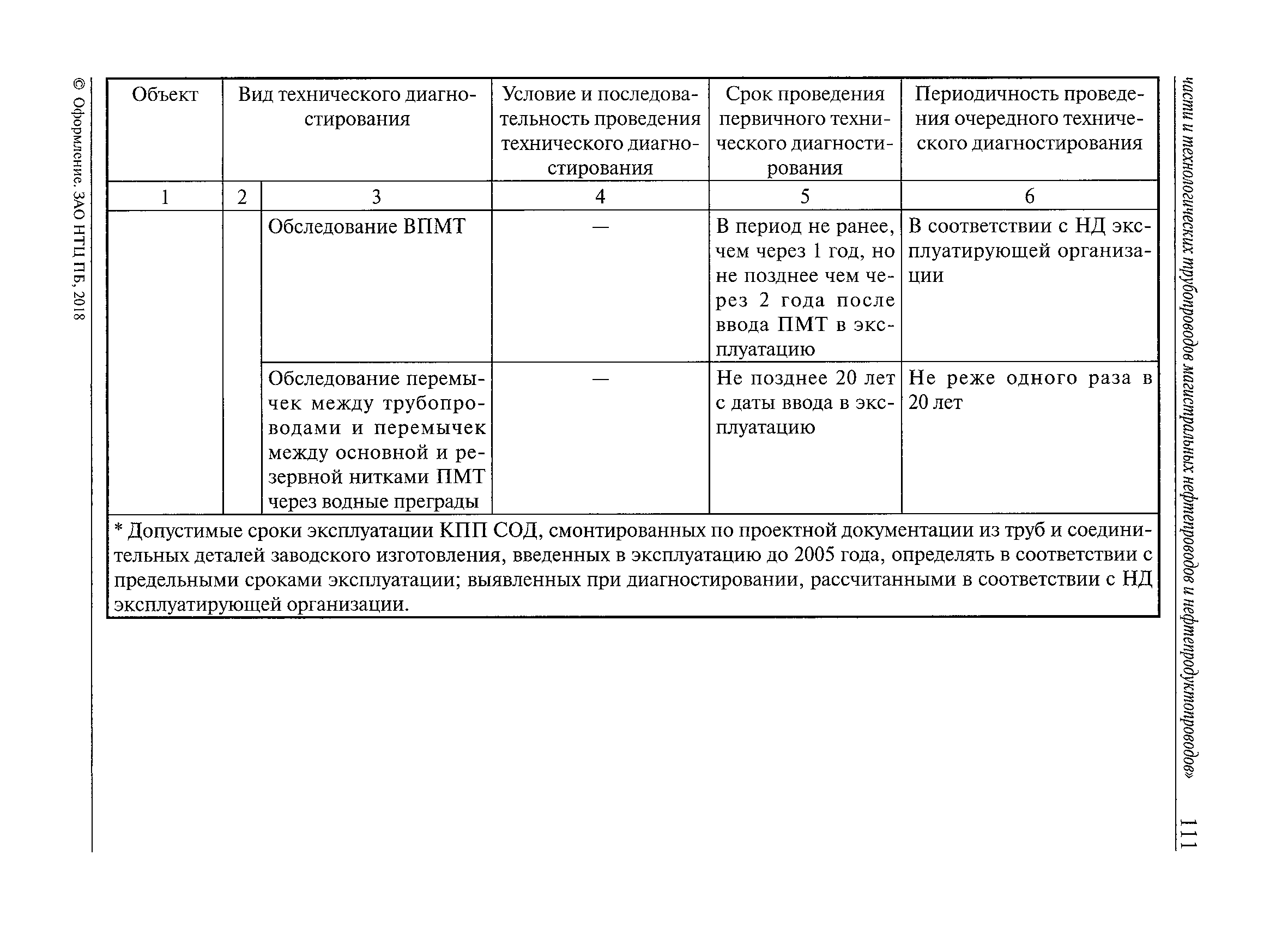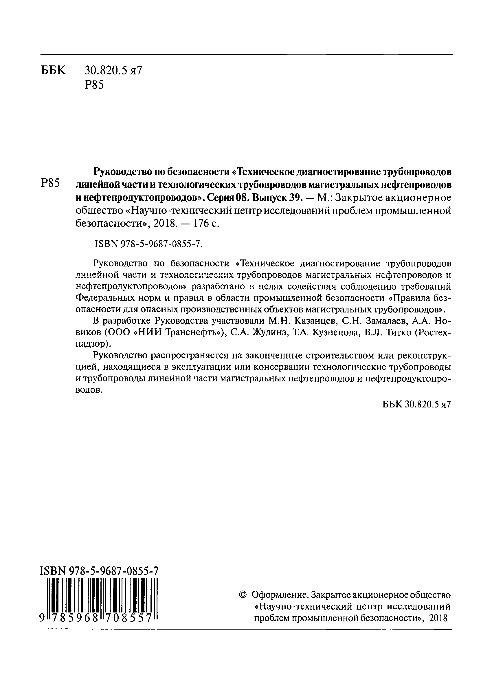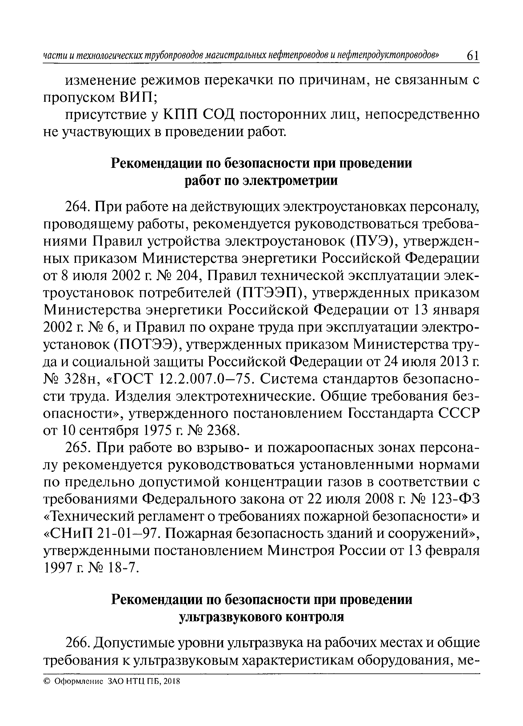 | Оглавление: | I Общие положения II Виды технического диагностирования III Техническое диагностирование линейной части магистральных трубопроводов, законченных строительством. Виды технического диагностирования, выполняемые на трубопроводах, законченных строительством IV Техническое диагностирование линейной части магистральных трубопроводов, находящихся в эксплуатации. Виды технического диагностирования, выполняемые на магистральных трубопроводах, находящихся в эксплуатации V Техническое диагностирование трубопроводов, находящихся в консервации. Виды технического диагностирования, применяемые на трубопроводах, находящихся в консервации, и сроки их проведения VI Техническое диагностирование технологических трубопроводов. Классификация технологических трубопроводов VII Мероприятия по безопасности при испытаниях, очистке и диагностировании трубопровод Приложение 1. Перечень сокращений и их расшифровка Приложение 2. Термины и их определения Приложение 3. Рисунки и таблицы Приложение 4. Рекомендации по методике проведения внутритрубного диагностирования Приложение 5. Рекомендации по видам и срокам проведения технического диагностирования магистральных трубопроводов, находящихся в эксплуатации Приложение 6. Рекомендации по методике выполнения неразрушающего контроля магистральных трубопроводов Приложение 7. Рекомендации по методике проведения работ по электрометрии Приложение 8. Виды работ, проводимые при наружном диагностировании переходов магистральных трубопроводов через водные преграды Приложение 9. Формы предупреждающих знаков Приложение 10. Форма акта на обозначение оборудования и открытых участков трубопровода перед проведением испытаний Приложение 11. Основные рекомендации к выполнению шурфов Приложение 12. Рекомендуемые формы актов при проведении технического диагностирования трубопровода |