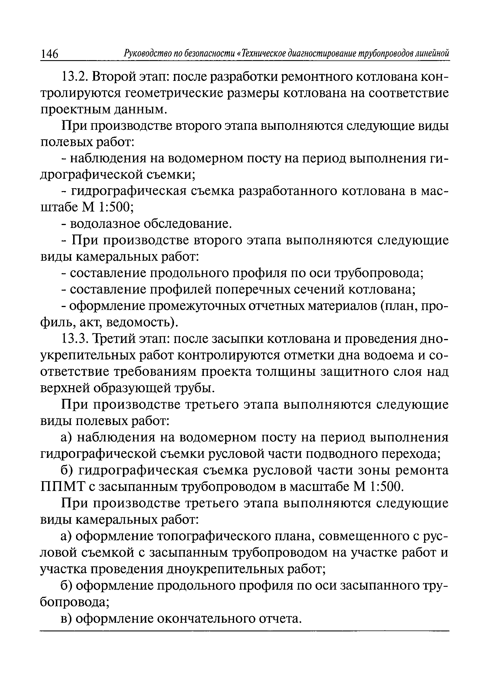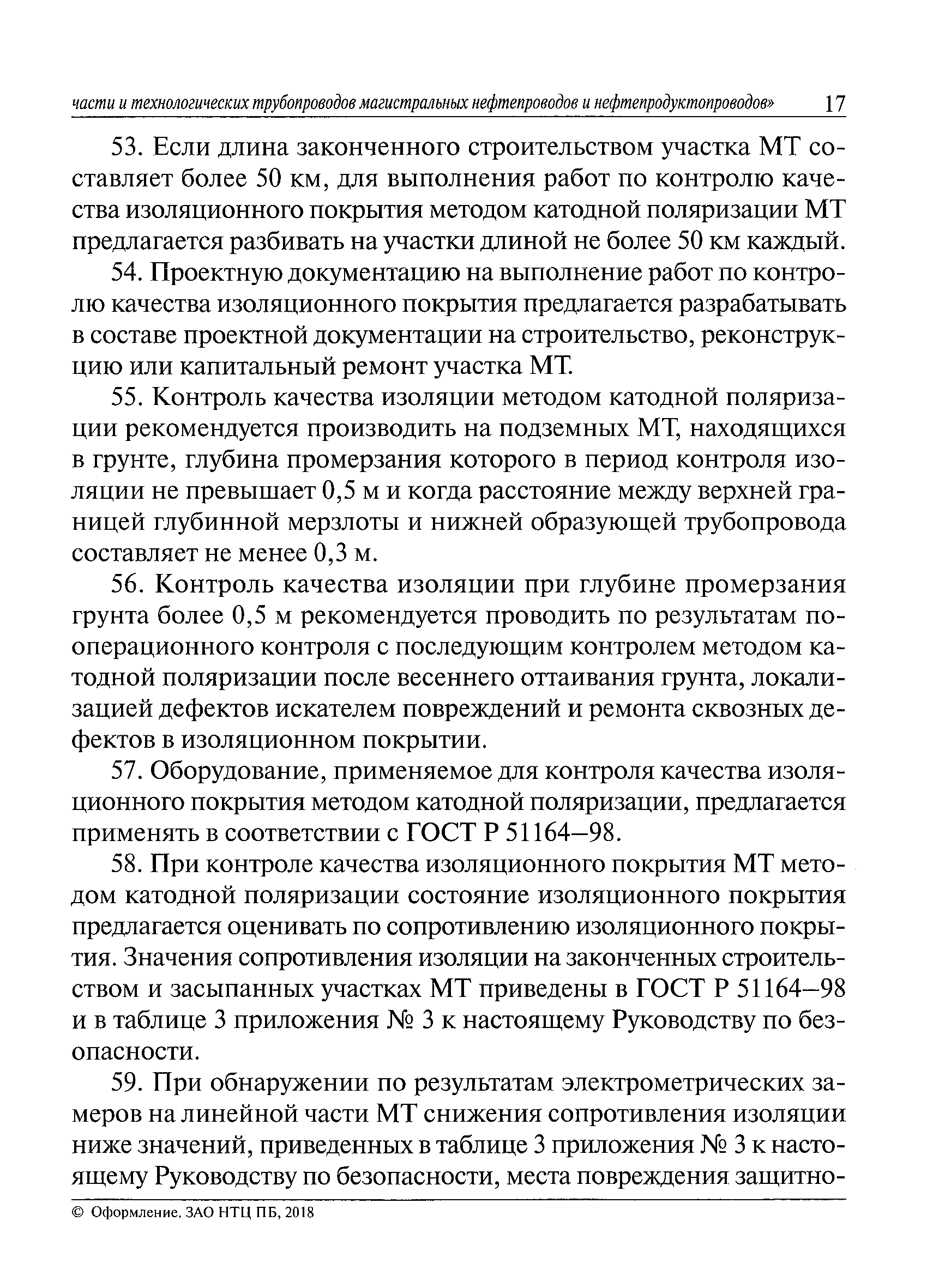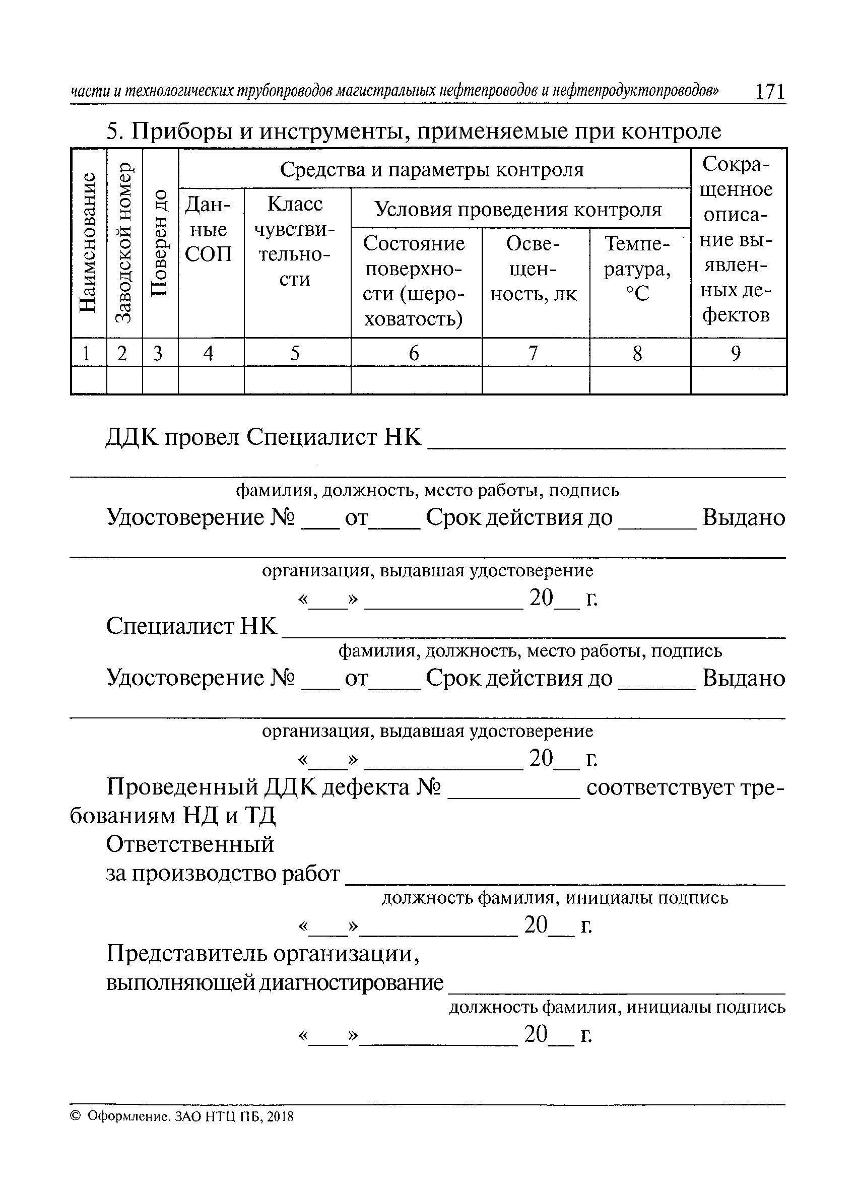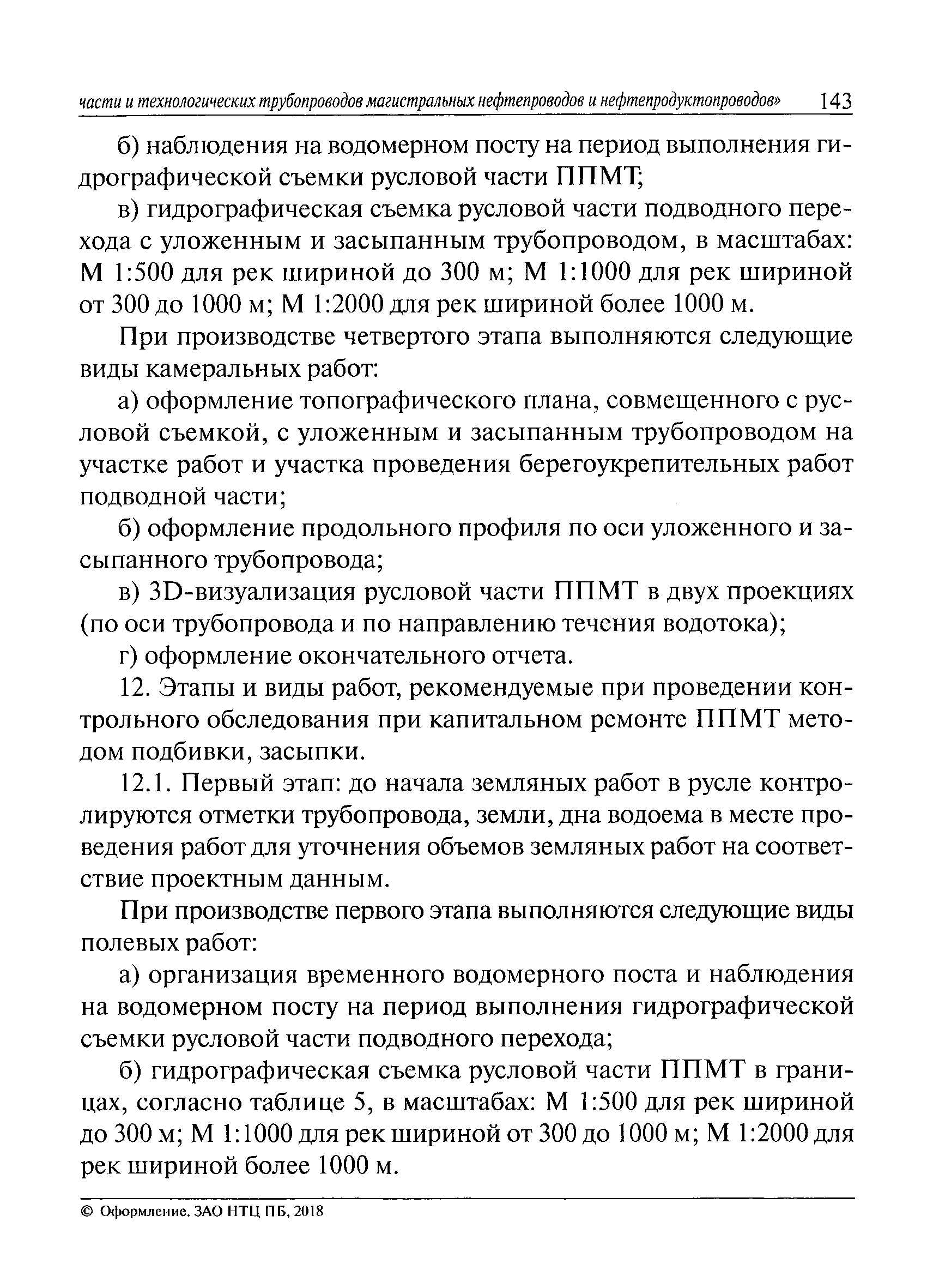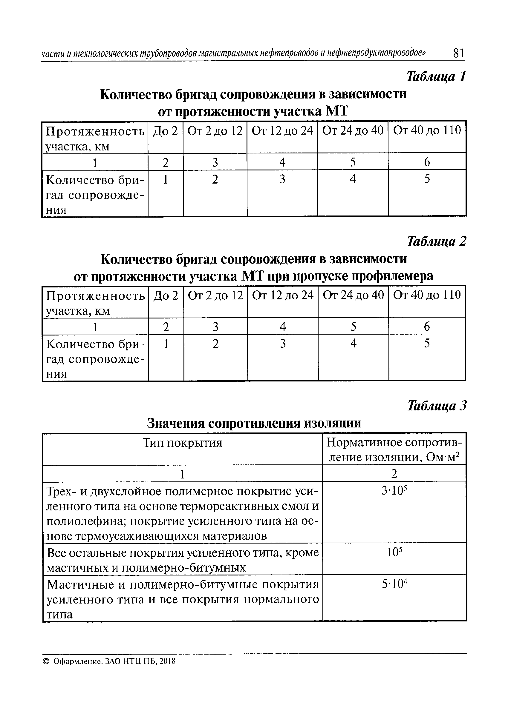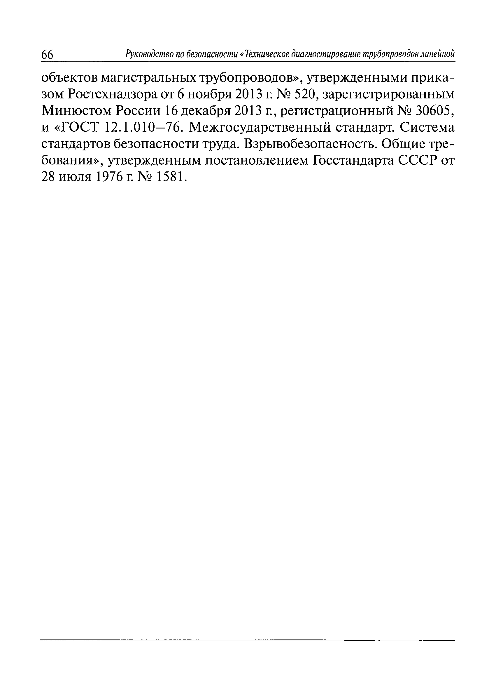 | Оглавление: | I Общие положения II Виды технического диагностирования III Техническое диагностирование линейной части магистральных трубопроводов, законченных строительством. Виды технического диагностирования, выполняемые на трубопроводах, законченных строительством IV Техническое диагностирование линейной части магистральных трубопроводов, находящихся в эксплуатации. Виды технического диагностирования, выполняемые на магистральных трубопроводах, находящихся в эксплуатации V Техническое диагностирование трубопроводов, находящихся в консервации. Виды технического диагностирования, применяемые на трубопроводах, находящихся в консервации, и сроки их проведения VI Техническое диагностирование технологических трубопроводов. Классификация технологических трубопроводов VII Мероприятия по безопасности при испытаниях, очистке и диагностировании трубопровод Приложение 1. Перечень сокращений и их расшифровка Приложение 2. Термины и их определения Приложение 3. Рисунки и таблицы Приложение 4. Рекомендации по методике проведения внутритрубного диагностирования Приложение 5. Рекомендации по видам и срокам проведения технического диагностирования магистральных трубопроводов, находящихся в эксплуатации Приложение 6. Рекомендации по методике выполнения неразрушающего контроля магистральных трубопроводов Приложение 7. Рекомендации по методике проведения работ по электрометрии Приложение 8. Виды работ, проводимые при наружном диагностировании переходов магистральных трубопроводов через водные преграды Приложение 9. Формы предупреждающих знаков Приложение 10. Форма акта на обозначение оборудования и открытых участков трубопровода перед проведением испытаний Приложение 11. Основные рекомендации к выполнению шурфов Приложение 12. Рекомендуемые формы актов при проведении технического диагностирования трубопровода |
