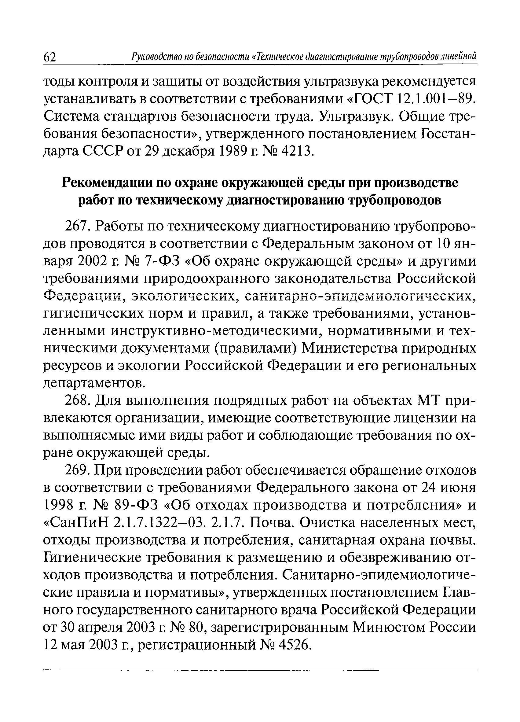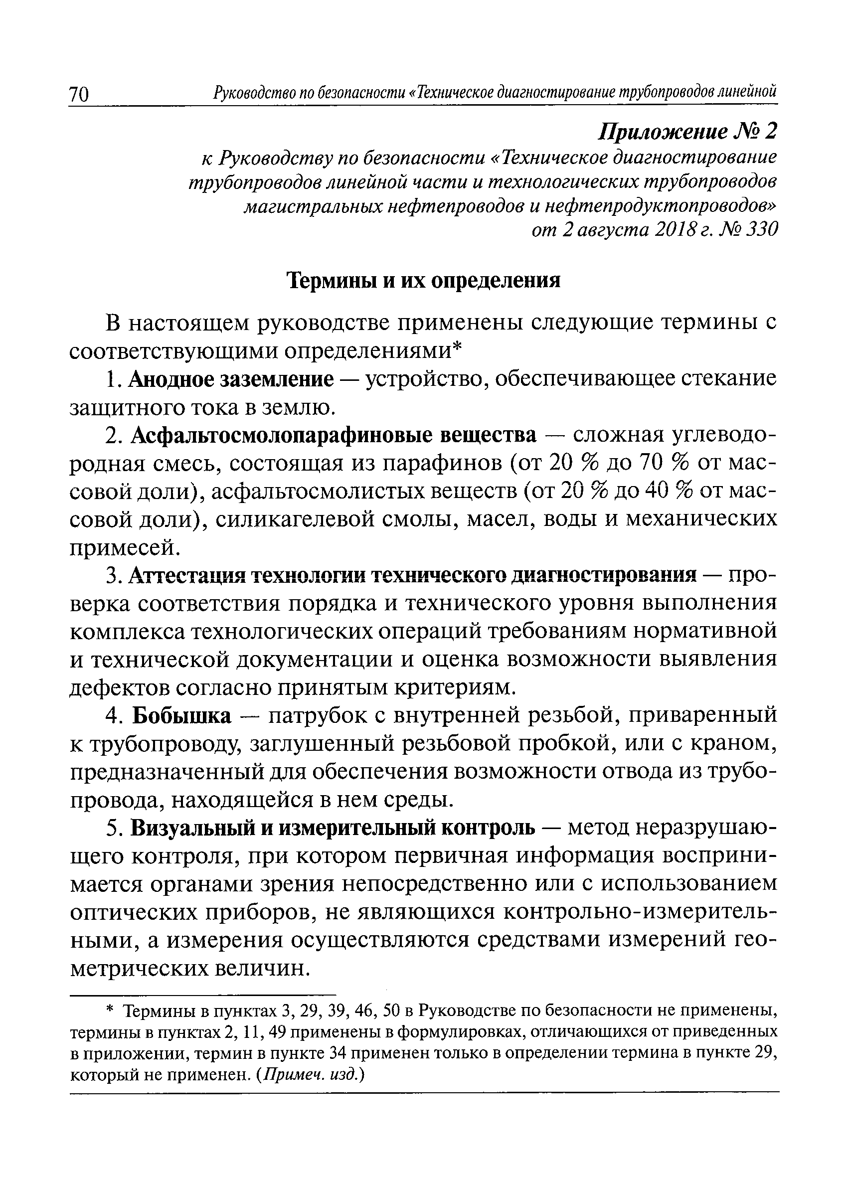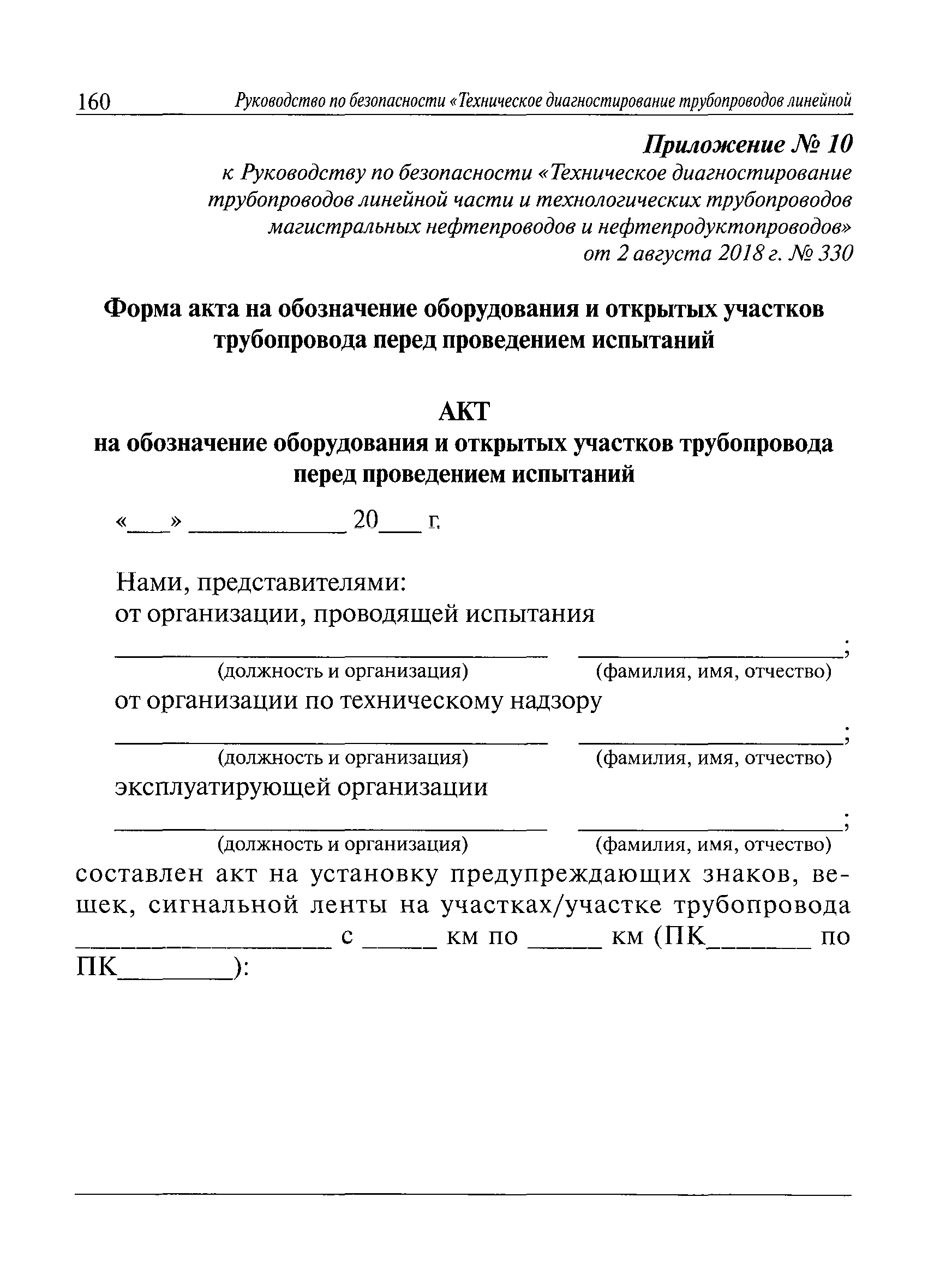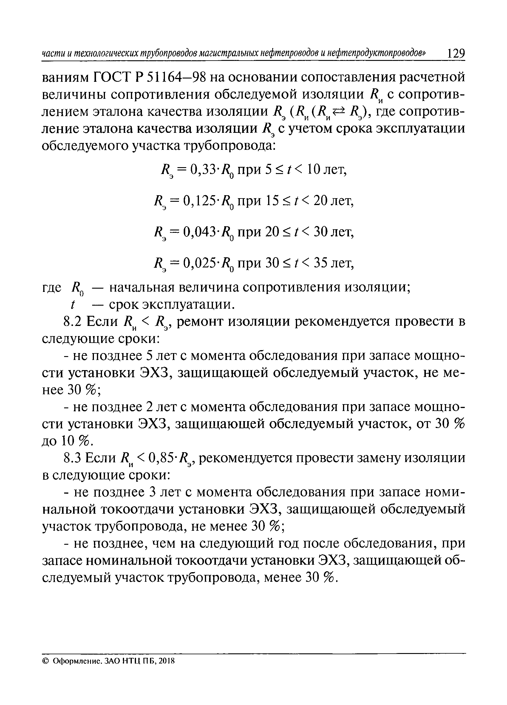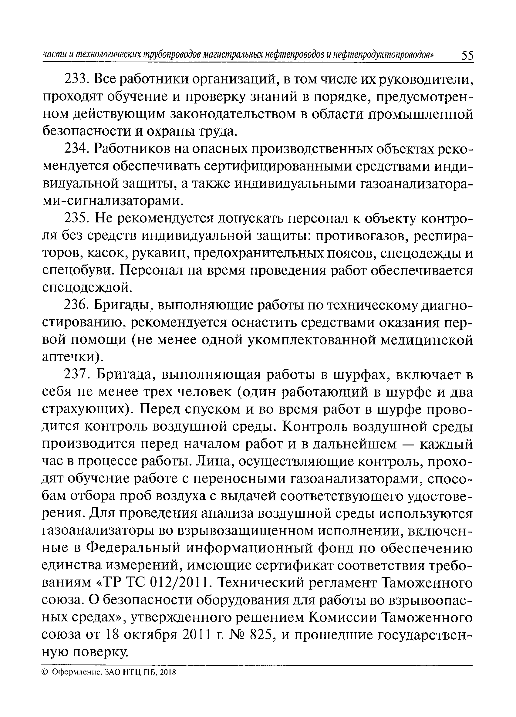 | Оглавление: | I Общие положения II Виды технического диагностирования III Техническое диагностирование линейной части магистральных трубопроводов, законченных строительством. Виды технического диагностирования, выполняемые на трубопроводах, законченных строительством IV Техническое диагностирование линейной части магистральных трубопроводов, находящихся в эксплуатации. Виды технического диагностирования, выполняемые на магистральных трубопроводах, находящихся в эксплуатации V Техническое диагностирование трубопроводов, находящихся в консервации. Виды технического диагностирования, применяемые на трубопроводах, находящихся в консервации, и сроки их проведения VI Техническое диагностирование технологических трубопроводов. Классификация технологических трубопроводов VII Мероприятия по безопасности при испытаниях, очистке и диагностировании трубопровод Приложение 1. Перечень сокращений и их расшифровка Приложение 2. Термины и их определения Приложение 3. Рисунки и таблицы Приложение 4. Рекомендации по методике проведения внутритрубного диагностирования Приложение 5. Рекомендации по видам и срокам проведения технического диагностирования магистральных трубопроводов, находящихся в эксплуатации Приложение 6. Рекомендации по методике выполнения неразрушающего контроля магистральных трубопроводов Приложение 7. Рекомендации по методике проведения работ по электрометрии Приложение 8. Виды работ, проводимые при наружном диагностировании переходов магистральных трубопроводов через водные преграды Приложение 9. Формы предупреждающих знаков Приложение 10. Форма акта на обозначение оборудования и открытых участков трубопровода перед проведением испытаний Приложение 11. Основные рекомендации к выполнению шурфов Приложение 12. Рекомендуемые формы актов при проведении технического диагностирования трубопровода |
