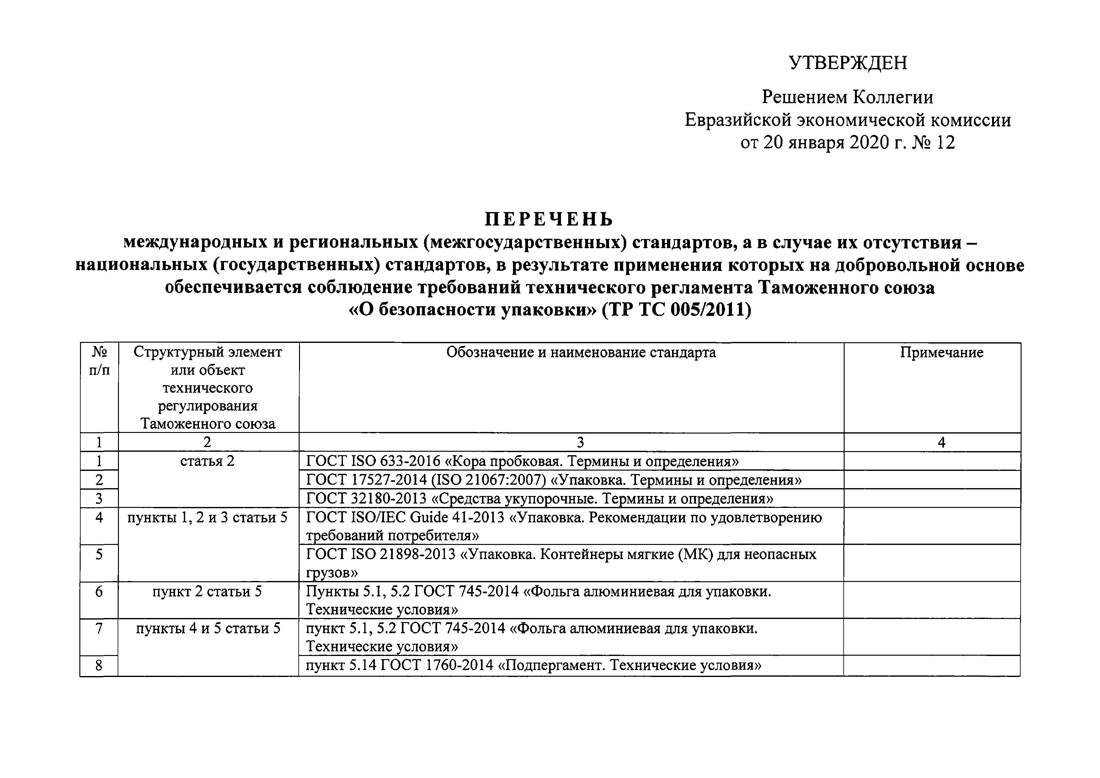 | Название рус.: | Перечень международных и региональных (межгосударственных) стандартов, а в случае их отсутствия - национальных (государственных) стандартов, в результате применения которых на добровольной основе обеспечивается соблюдение требований технического регламента Таможенного союза "О безопасности упаковки" (ТР ТС 005/2011). Редакция 3 |