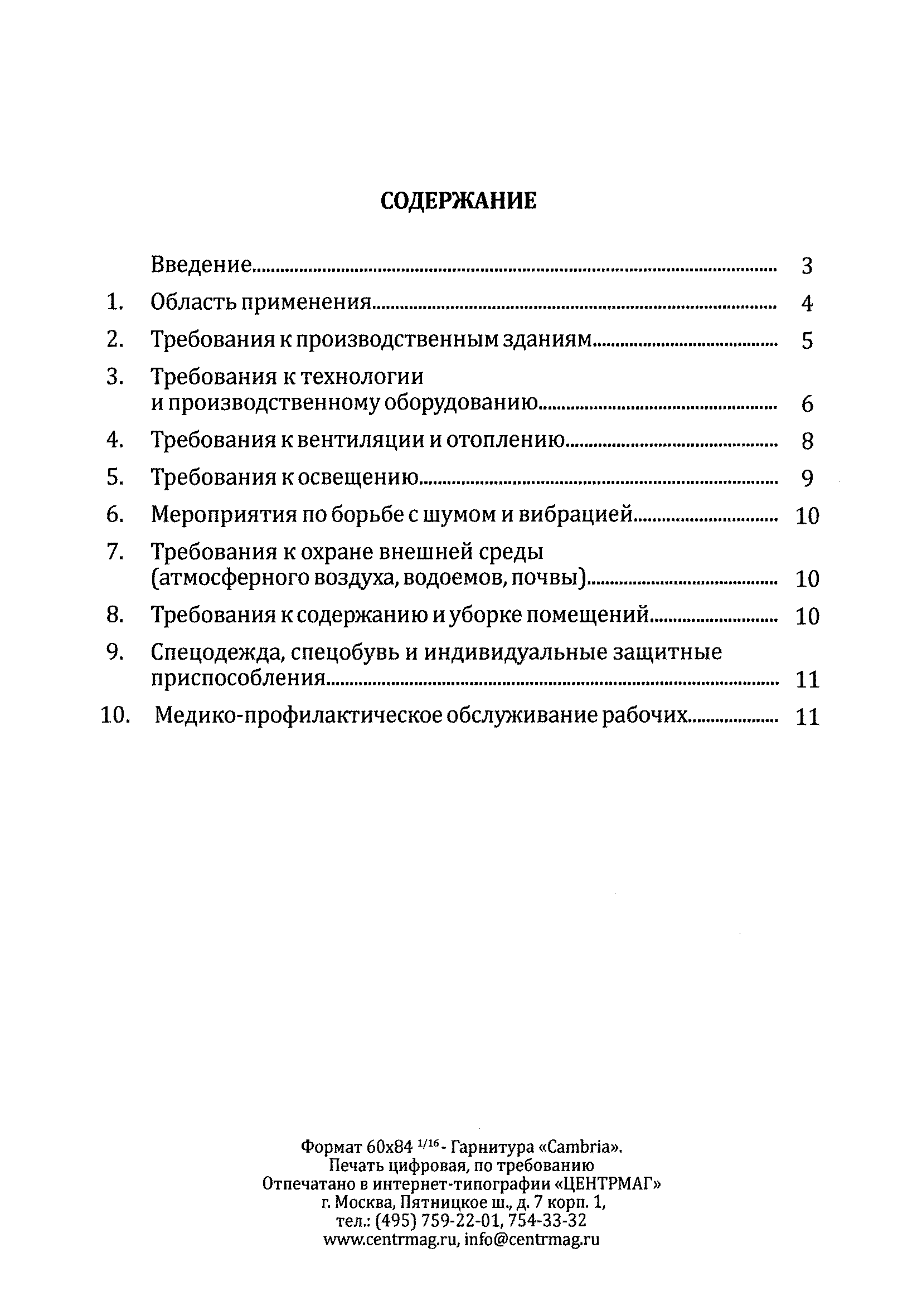 | Оглавление: | Введение 1. Область применения 2. Требования к производственным зданиям 3. Требования к технологии и производственному оборудованию 4. Требования к вентиляции и отоплению 5. Требования к освещению 6. Мероприятия по борьбе с шумом и вибрацией 7. Требования к охране внешней среды (атмосферного воздуха, водоемов, почвы) 8. Требования к содержанию и уборке помещений 9. Спецодежда, спецобувь и индивидуальные защитные приспособления 10. Медико-профилактическое обслуживание рабочих |