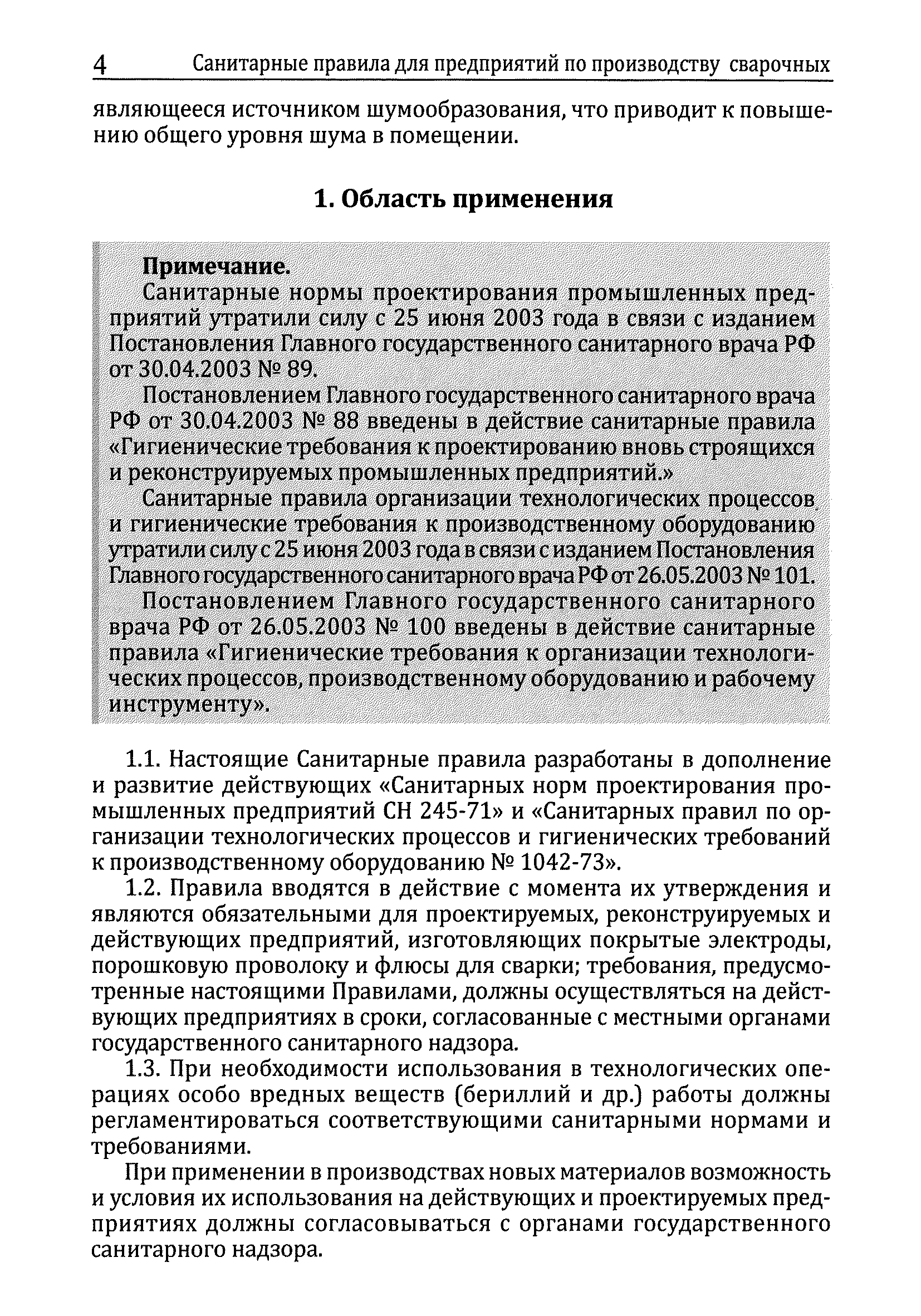 | Область применения: | Правила вводятся в действие с момента их утверждения и являются обязательными для проектируемых, реконструируемых и действующих предприятий, изготовляющих покрытые электроды, порошковую проволоку и флюсы для сварки; требования, предусмотренные настоящими Правилами, должны осуществляться на действующих предприятиях в сроки, согласованные с местными органами государственного санитарного надзора. |