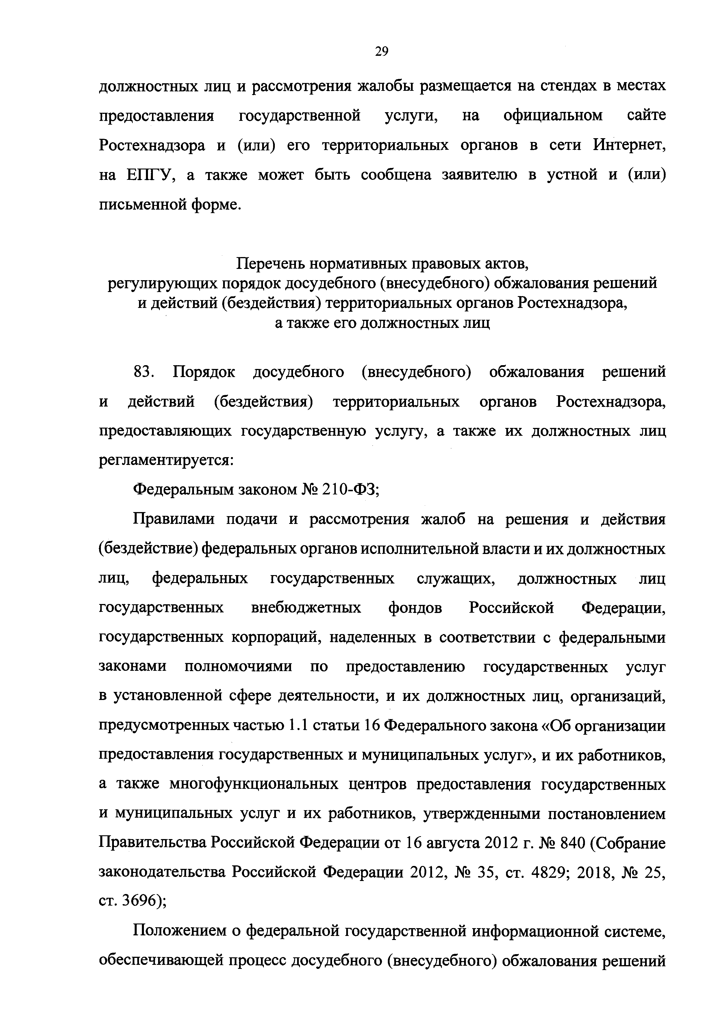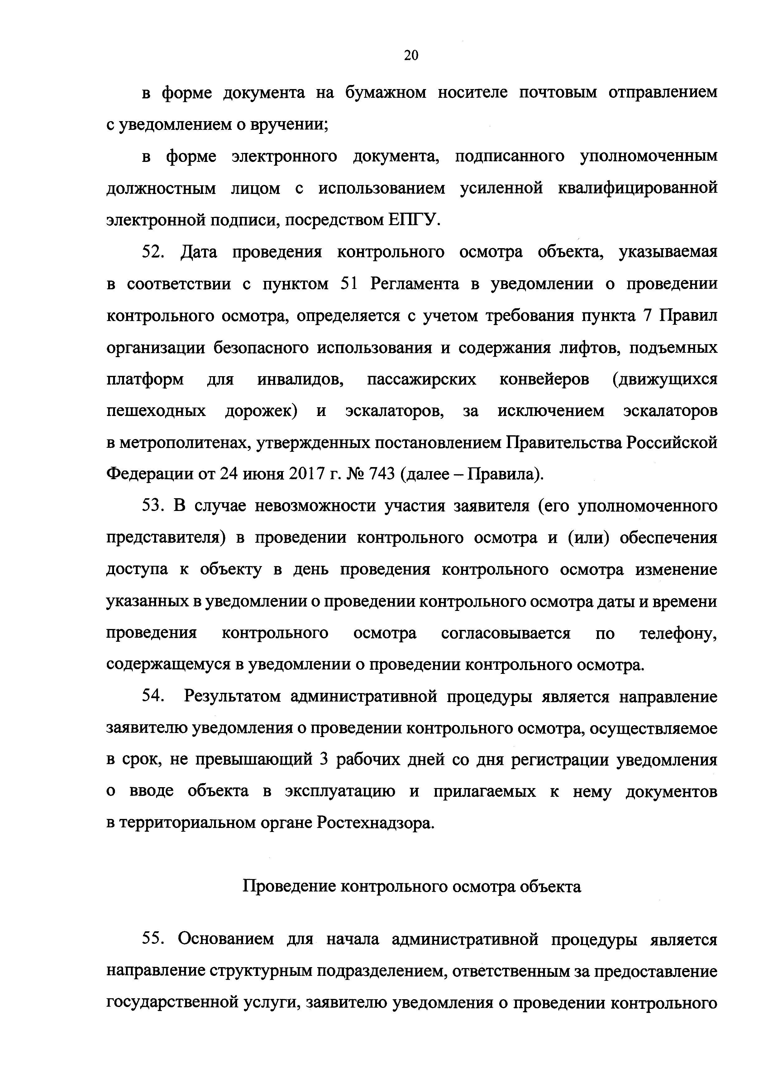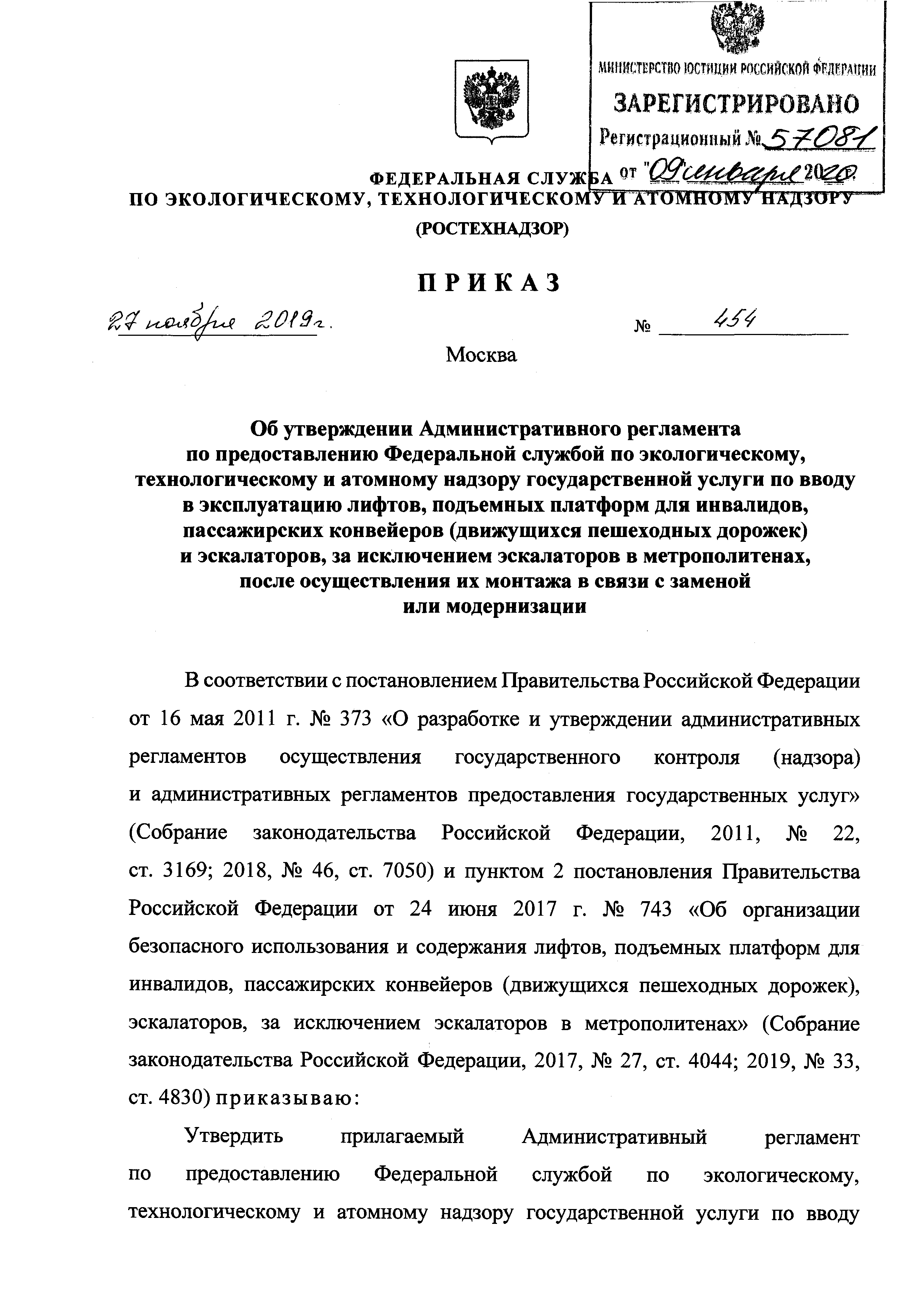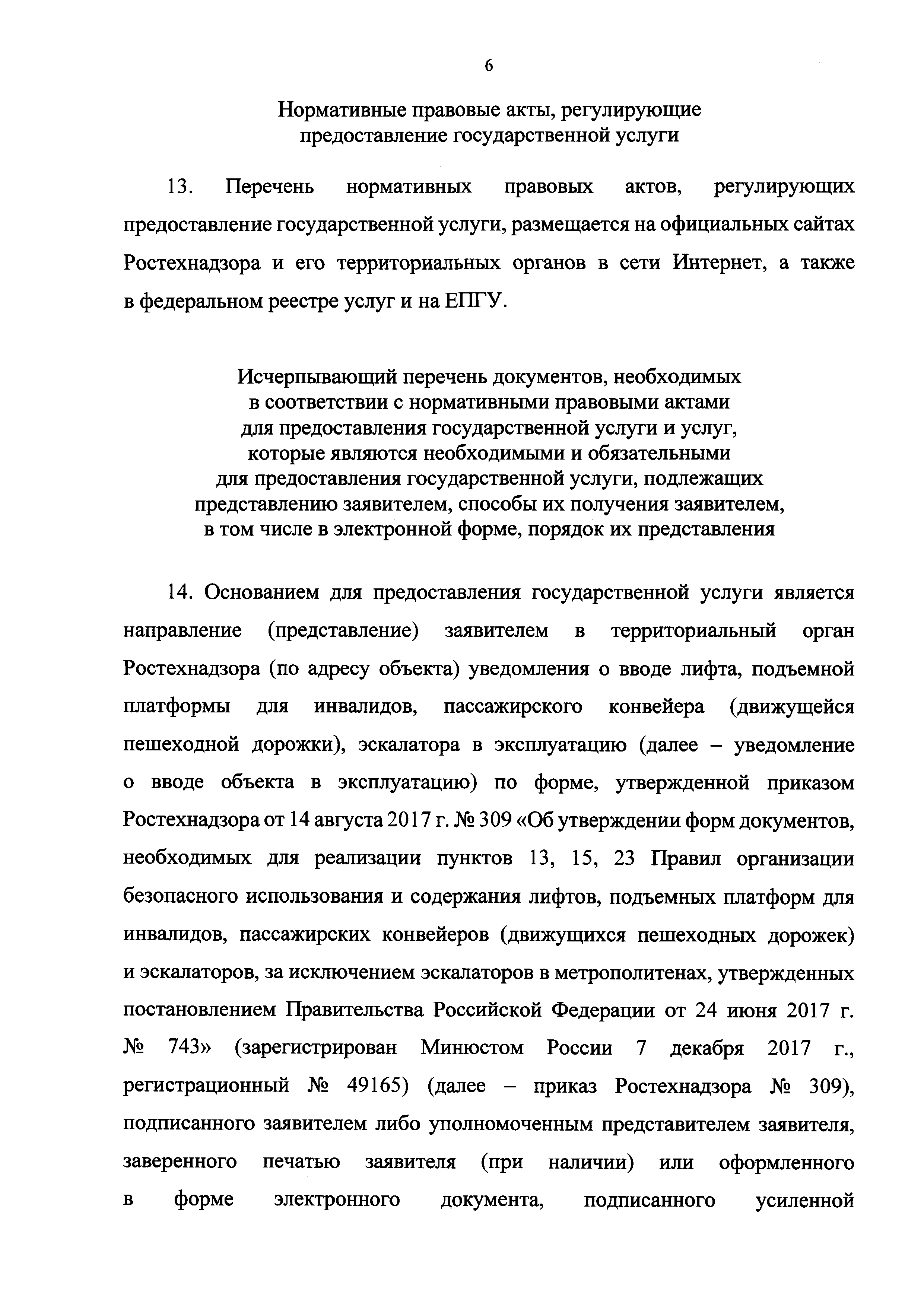 | | Нормативные ссылки: |  Кодекс «Жилищный кодекс Российской Федерации» «Правила содержания общего имущества в многоквартирном доме и Правила изменения размера платы за содержание жилого помещения в случае оказания услуг и выполнения работ по управлению, содержанию и ремонту общего имущества в многоквартирном доме ненадлежащего качества и (или) с перерывами, превышающими установленную продолжительность»  Федеральный закон 59-ФЗ «О порядке рассмотрения обращений граждан Российской Федерации»  Федеральный закон 63-ФЗ «Об электронной подписи»  Решение 824 «О принятии технического регламента Таможенного союза "Безопасность лифтов"» Постановление 373 «О разработке и утверждении административных регламентов осуществления государственного контроля (надзора) и административных регламентов предоставления государственных услуг»  Федеральный закон 210-ФЗ «Об организации предоставления государственных и муниципальных услуг» Постановление 352 «Об утверждении перечня услуг, которые являются необходимыми и обязательными для предоставления федеральными органами исполнительной власти, Государственной корпорацией по атомной энергии "Росатом" государственных услуг и предоставляются организациями, участвующими в предоставлении государственных услуг, и определении размера платы за их оказание»  Постановление 743 «Об организации безопасного использования и содержания лифтов, подъемных платформ для инвалидов, пассажирских конвейеров (движущихся пешеходных дорожек), эскалаторов, за исключением эскалаторов в метрополитенах» «Правила подачи и рассмотрения жалоб на решения и действия (бездействие) федеральных органов исполнительной власти и их должностных лиц, федеральных государственных служащих, должностных лиц государственных внебюджетных фондов Российской Федерации, государственных корпораций, наделенных в соответствии с федеральными законами полномочиями по предоставлению государственных услуг в установленной сфере деятельности, и их должностных лиц, организаций, предусмотренных частью 1.1 статьи 16 Федерального закона "Об организации предоставления государственных и муниципальных услуг", и их работников, а также многофункциональных центров предоставления государственных и муниципальных услуг и их работников»  Приказ 309 «Об утверждении форм документов, необходимых для реализации пунктов 13, 15, 23 Правил организации безопасного использования и содержания лифтов, подъемных платформ для инвалидов, пассажирских конвейеров (движущихся пешеходных дорожек) и эскалаторов, за исключением эскалаторов в метрополитенах, утвержденных постановлением Правительства Российской Федерации от 24 июня 2017 г. № 743» «Правила определения видов электронной подписи, использование которых допускается при обращении за получением государственных и муниципальных услуг»  Технический регламент Таможенного союза 011/2011 «Безопасность лифтов»