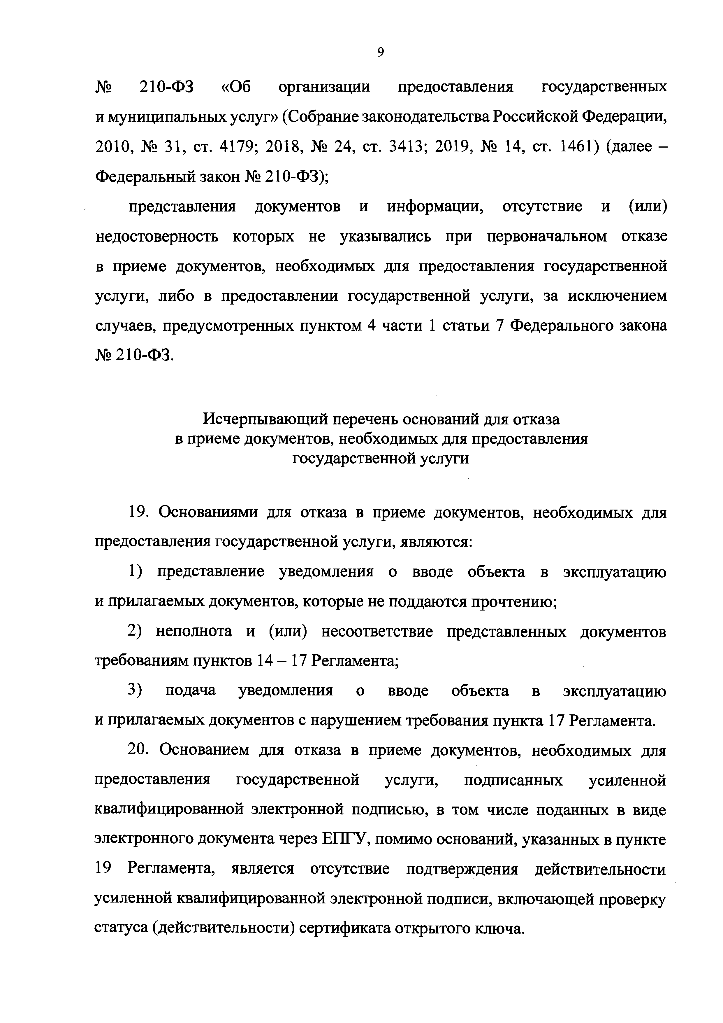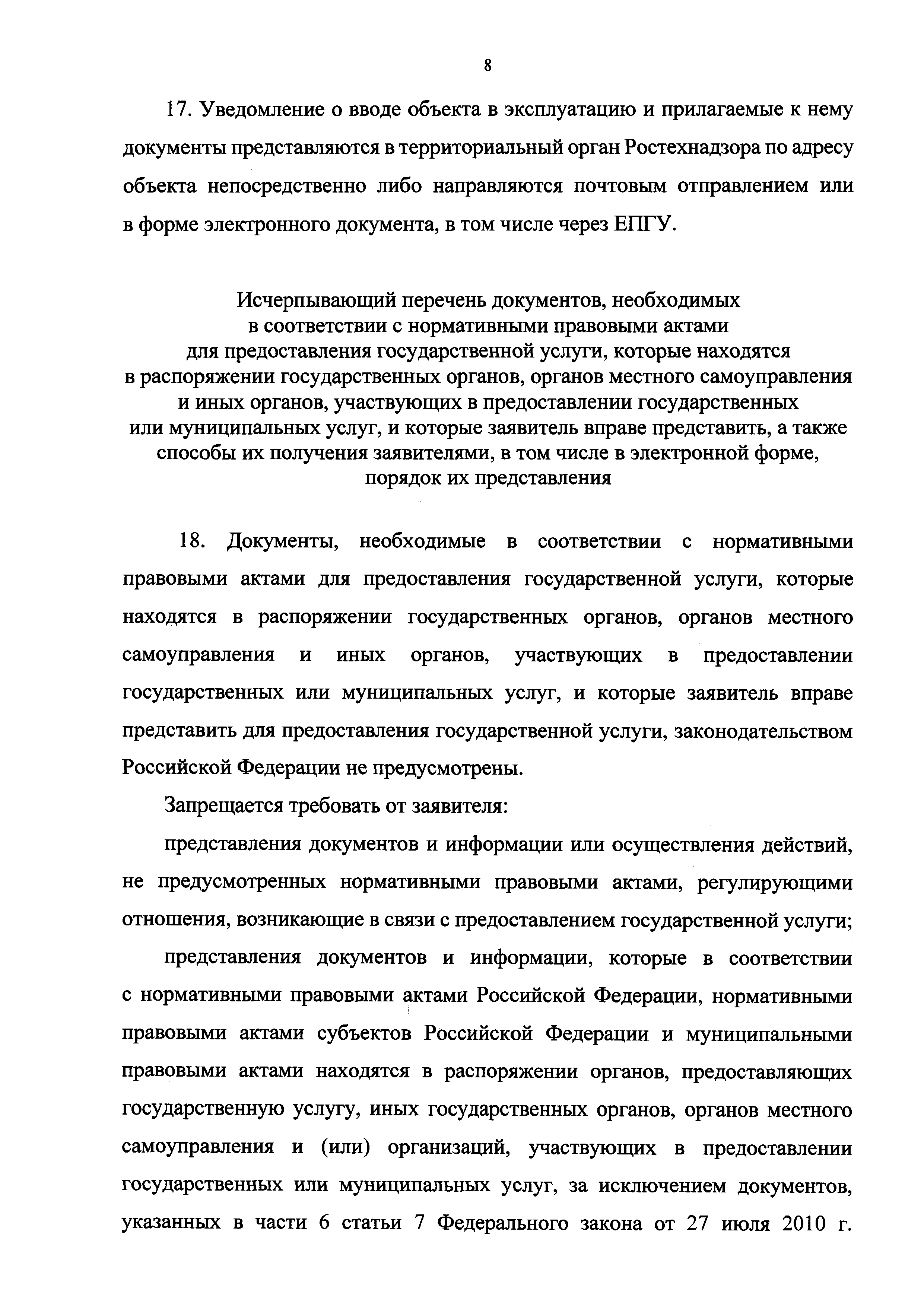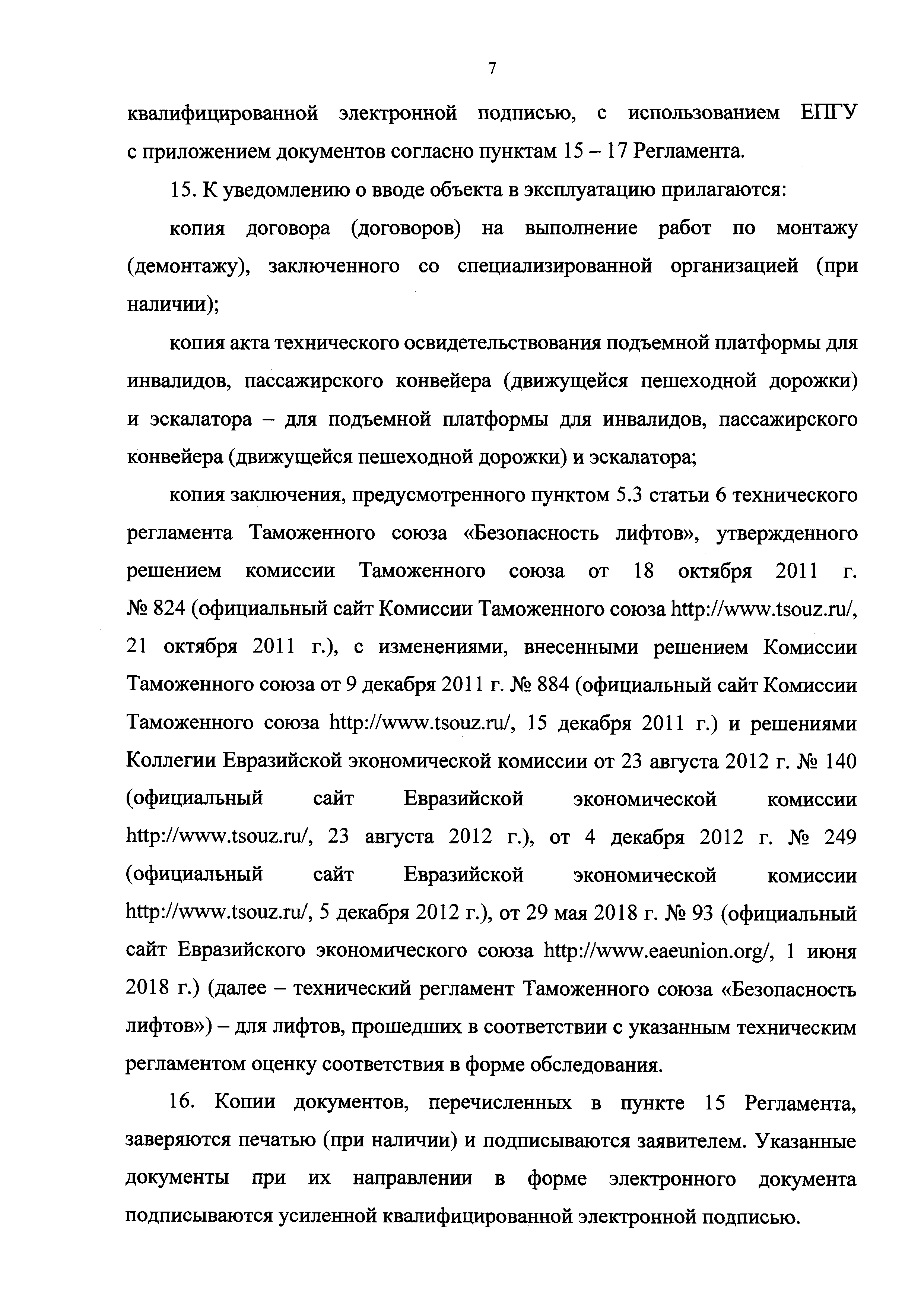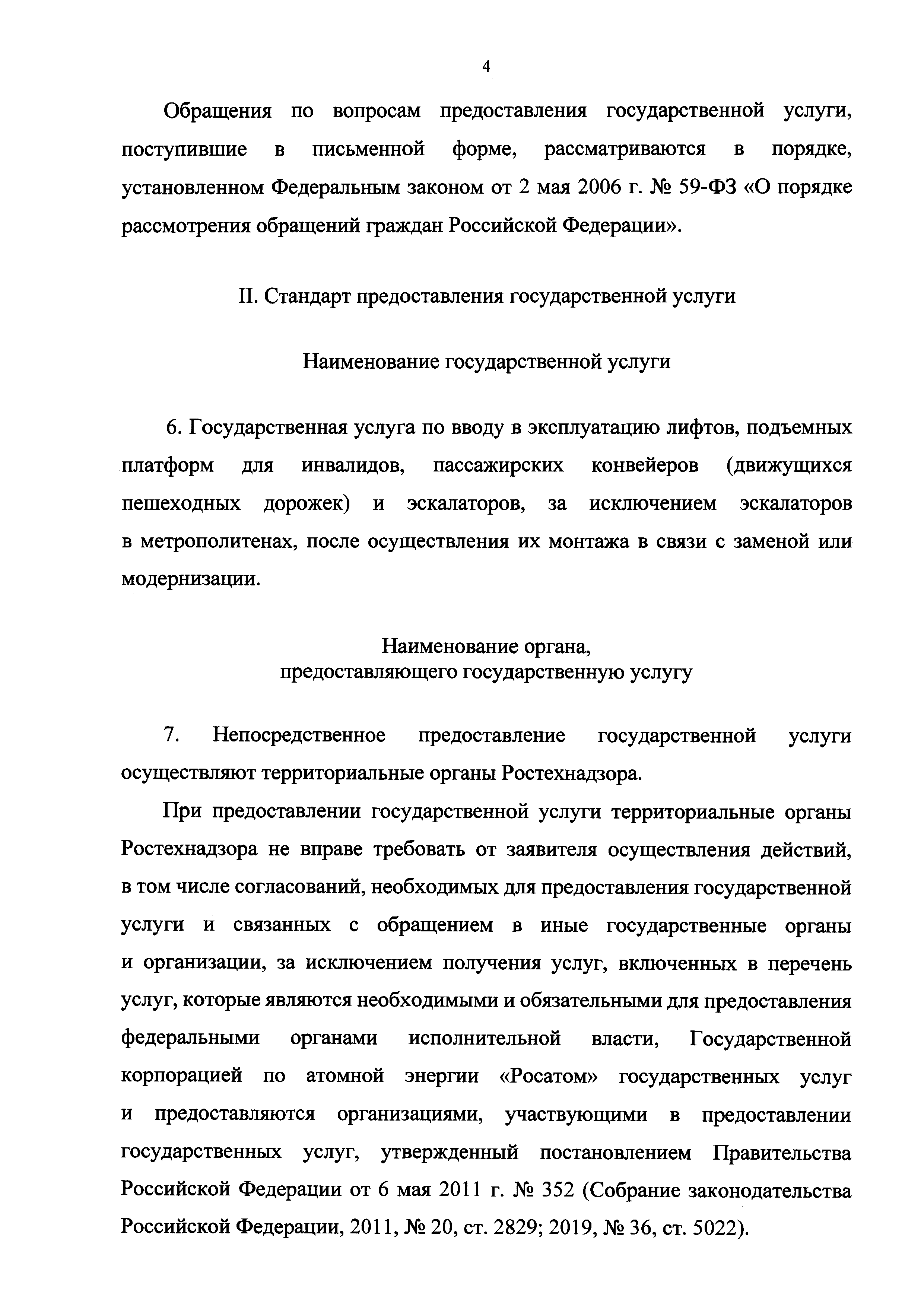 | | Нормативные ссылки: |  Кодекс «Жилищный кодекс Российской Федерации» «Правила содержания общего имущества в многоквартирном доме и Правила изменения размера платы за содержание жилого помещения в случае оказания услуг и выполнения работ по управлению, содержанию и ремонту общего имущества в многоквартирном доме ненадлежащего качества и (или) с перерывами, превышающими установленную продолжительность»  Федеральный закон 59-ФЗ «О порядке рассмотрения обращений граждан Российской Федерации»  Федеральный закон 63-ФЗ «Об электронной подписи»  Решение 824 «О принятии технического регламента Таможенного союза "Безопасность лифтов"» Постановление 373 «О разработке и утверждении административных регламентов осуществления государственного контроля (надзора) и административных регламентов предоставления государственных услуг»  Федеральный закон 210-ФЗ «Об организации предоставления государственных и муниципальных услуг» Постановление 352 «Об утверждении перечня услуг, которые являются необходимыми и обязательными для предоставления федеральными органами исполнительной власти, Государственной корпорацией по атомной энергии "Росатом" государственных услуг и предоставляются организациями, участвующими в предоставлении государственных услуг, и определении размера платы за их оказание»  Постановление 743 «Об организации безопасного использования и содержания лифтов, подъемных платформ для инвалидов, пассажирских конвейеров (движущихся пешеходных дорожек), эскалаторов, за исключением эскалаторов в метрополитенах» «Правила подачи и рассмотрения жалоб на решения и действия (бездействие) федеральных органов исполнительной власти и их должностных лиц, федеральных государственных служащих, должностных лиц государственных внебюджетных фондов Российской Федерации, государственных корпораций, наделенных в соответствии с федеральными законами полномочиями по предоставлению государственных услуг в установленной сфере деятельности, и их должностных лиц, организаций, предусмотренных частью 1.1 статьи 16 Федерального закона "Об организации предоставления государственных и муниципальных услуг", и их работников, а также многофункциональных центров предоставления государственных и муниципальных услуг и их работников»  Приказ 309 «Об утверждении форм документов, необходимых для реализации пунктов 13, 15, 23 Правил организации безопасного использования и содержания лифтов, подъемных платформ для инвалидов, пассажирских конвейеров (движущихся пешеходных дорожек) и эскалаторов, за исключением эскалаторов в метрополитенах, утвержденных постановлением Правительства Российской Федерации от 24 июня 2017 г. № 743» «Правила определения видов электронной подписи, использование которых допускается при обращении за получением государственных и муниципальных услуг»  Технический регламент Таможенного союза 011/2011 «Безопасность лифтов»