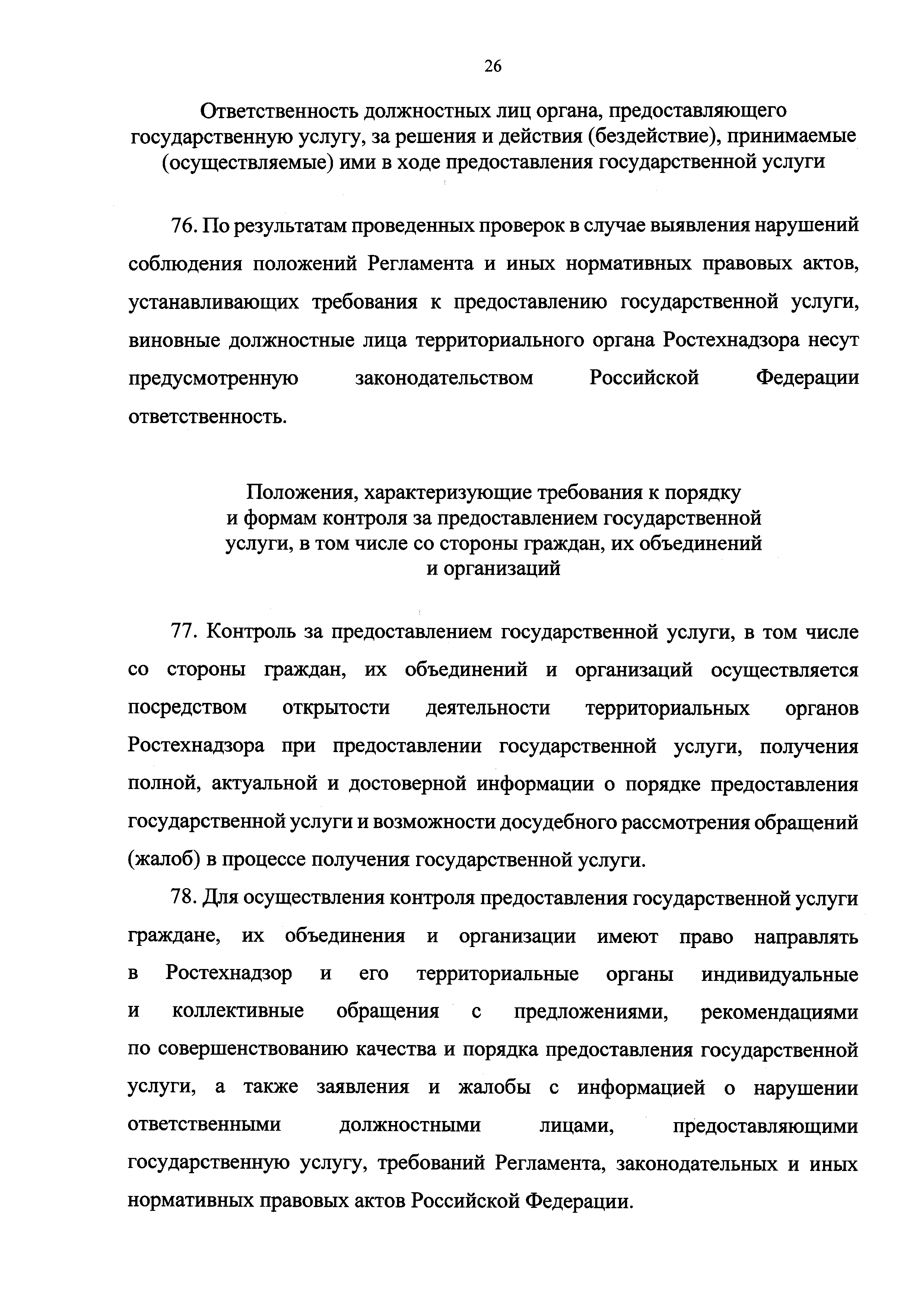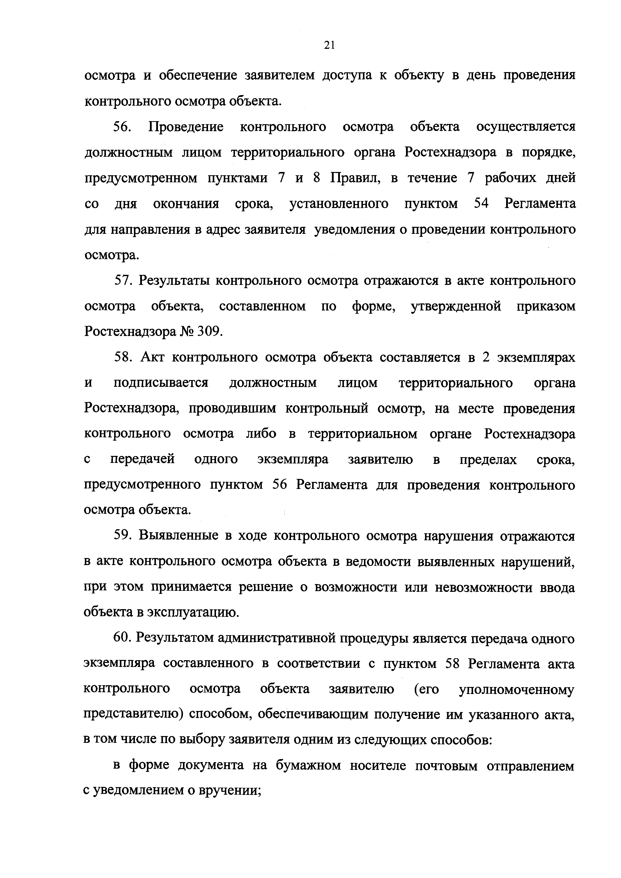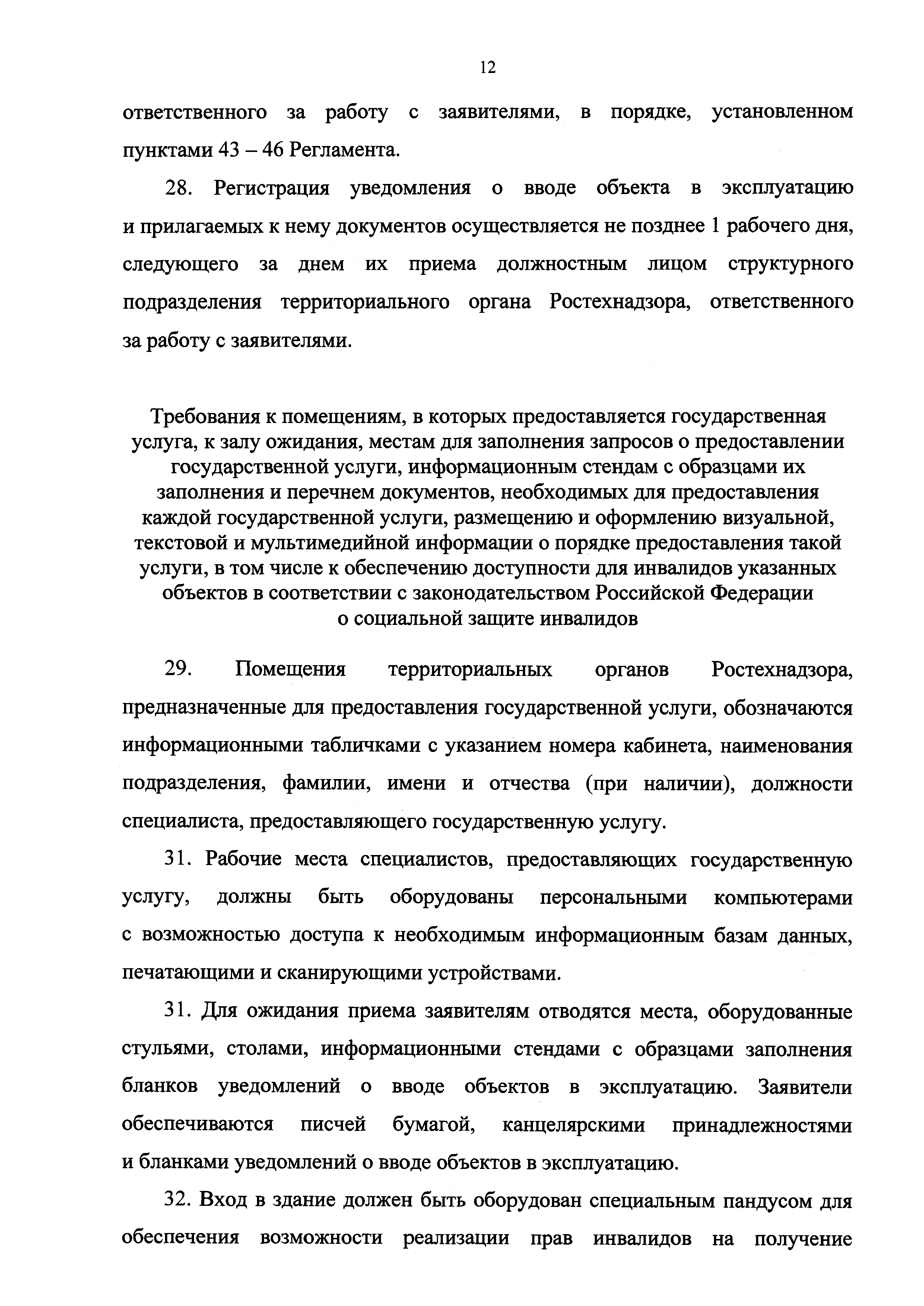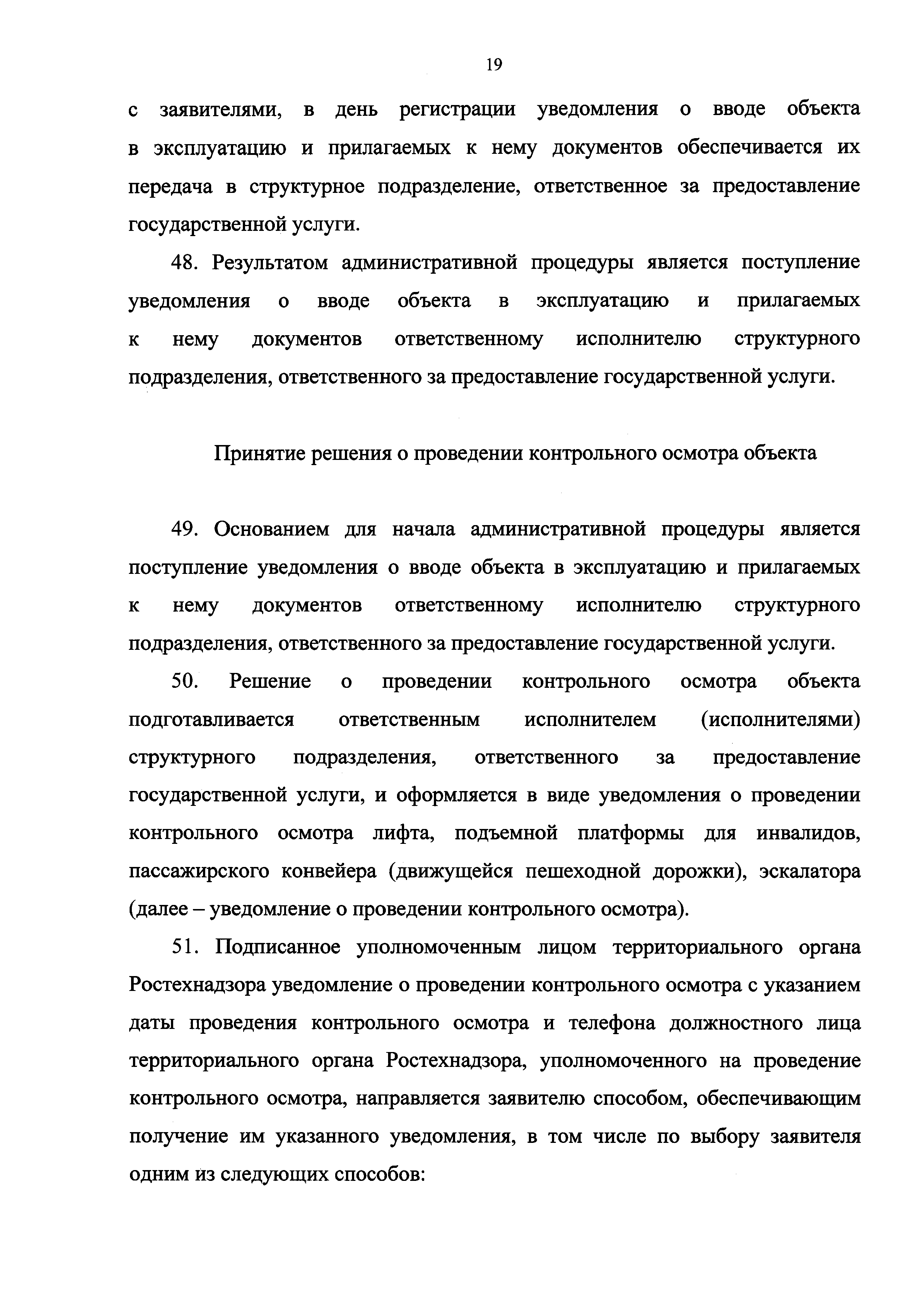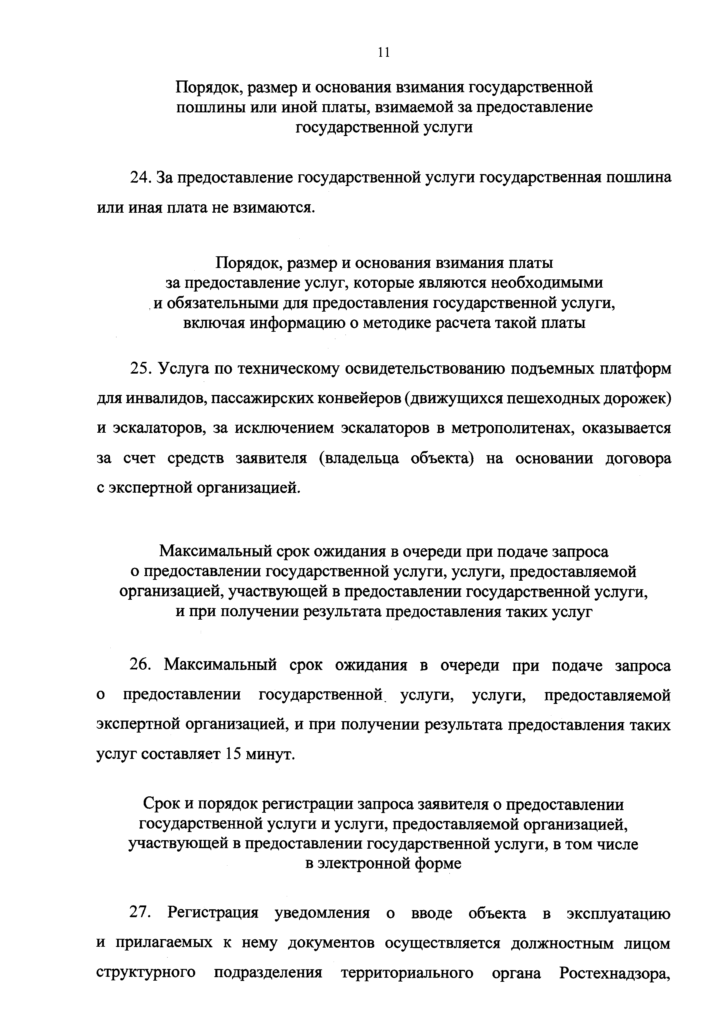 Административный регламент по предоставлению Федеральной службой по экологическому, технологическому и атомному надзору государственной услуги по вводу в эксплуатацию лифтов, подъемных платформ для инвалидов, пассажирских конвейеров (движущихся пешеходных дорожек) и эскалаторов, за исключением эскалаторов в метрополитенах, после осуществления их монтажа в связи с заменой или модернизации| Статус: | действует | | Название рус.: | Административный регламент по предоставлению Федеральной службой по экологическому, технологическому и атомному надзору государственной услуги по вводу в эксплуатацию лифтов, подъемных платформ для инвалидов, пассажирских конвейеров (движущихся пешеходных дорожек) и эскалаторов, за исключением эскалаторов в метрополитенах, после осуществления их монтажа в связи с заменой или модернизации | | Дата добавления в базу: | 01.01.2021 | | Дата актуализации: | 01.01.2021 | | Дата введения: | 20.01.2020 | | Область применения: | Регламент устанавливает сроки и последовательность административных процедур (действий) территориальных органов Ростехнадзора по предоставлению государственной услуги по вводу в эксплуатацию лифтов, подъемных платформ для инвалидов, пассажирских конвейеров (движущихся пешеходных дорожек) и эскалаторов, за исключением эскалаторов в метрополитенах, после осуществления их монтажа в связи с заменой или модернизации, порядок взаимодействия должностных лиц территориальных органов Ростехнадзора с заявителями | | Оглавление: | I. Общие положения II. Стандарт предоставления государственной услуги III. Состав, последовательностью и сроки выполнения административных процедур (действий), требования к порядку их выполнения, в том числе особенности выполнения административных процедур (действий) в электронной форме IV. Формы контроля за предоставлением государственной услуги V. Досудебный (внесудебный) порядок обжалования решений и действий (бездействия) территориальных органов Ростехнадзора, а также его должностных лиц | | Утверждён: | 27.11.2019 Федеральная служба по экологическому, технологическому и атомному надзору (454)